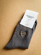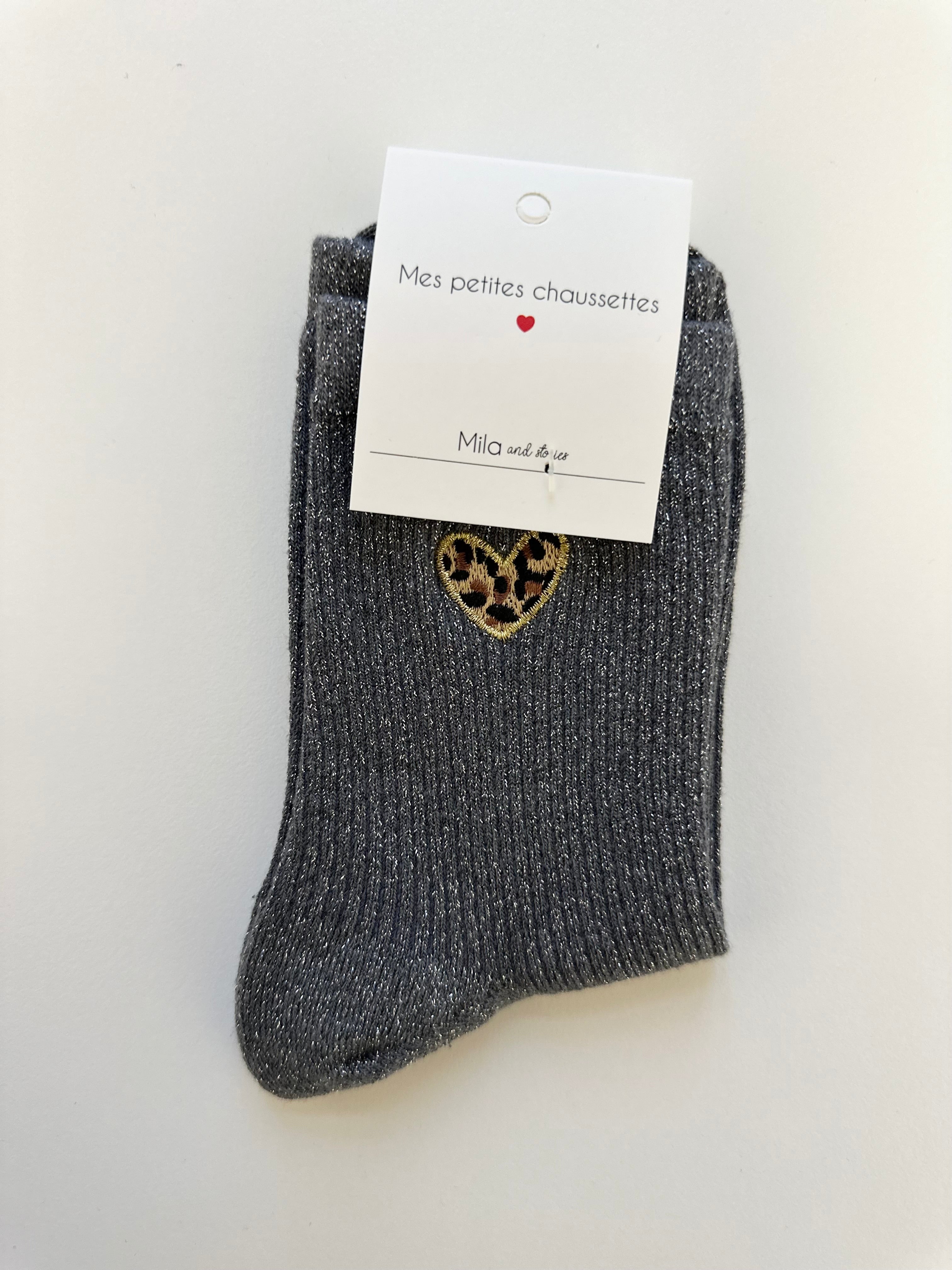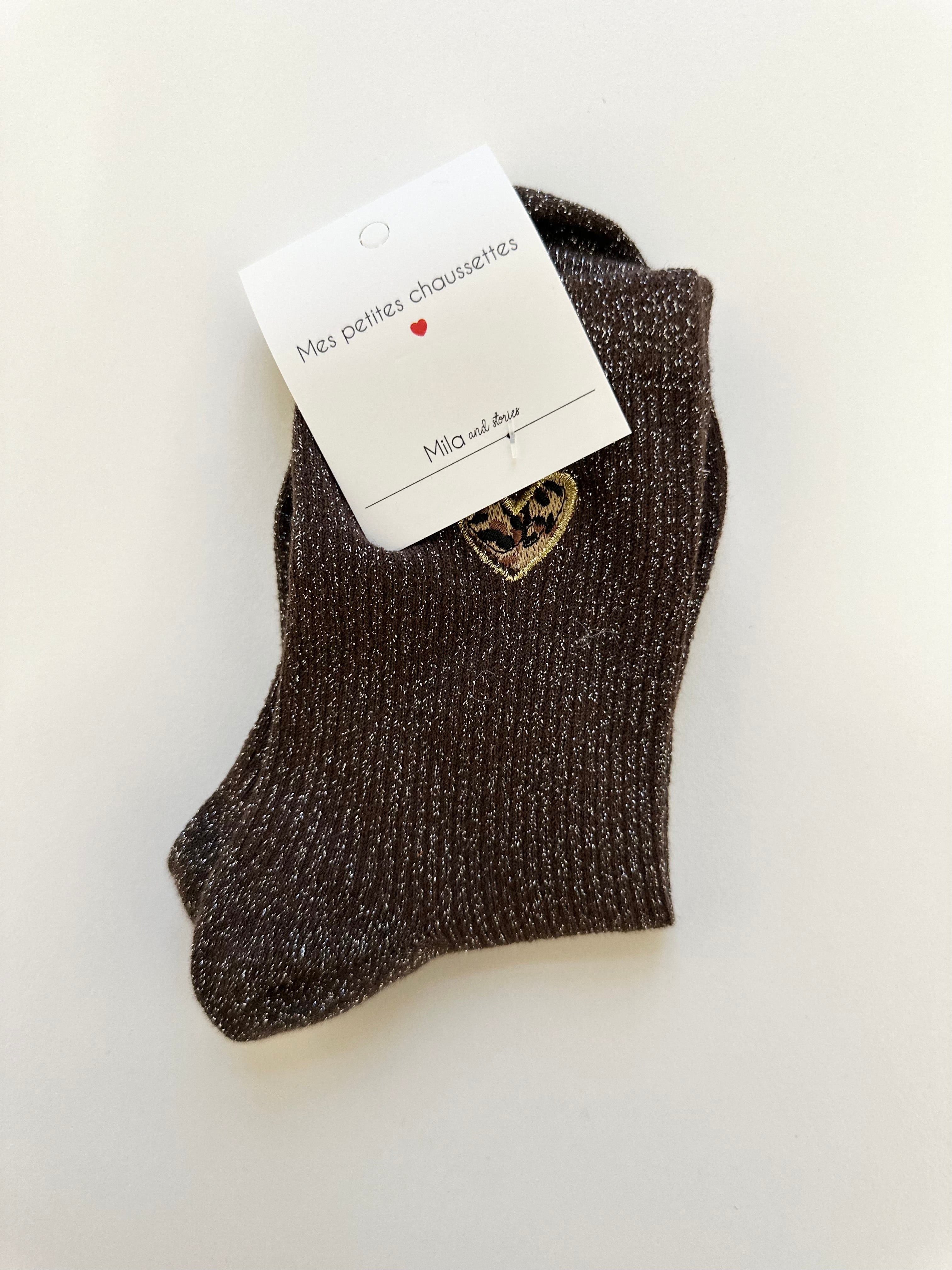 Chaussettes à paillettes disponibles en noir, bordeaux, orange, brun et gris avec un cœur léopard.