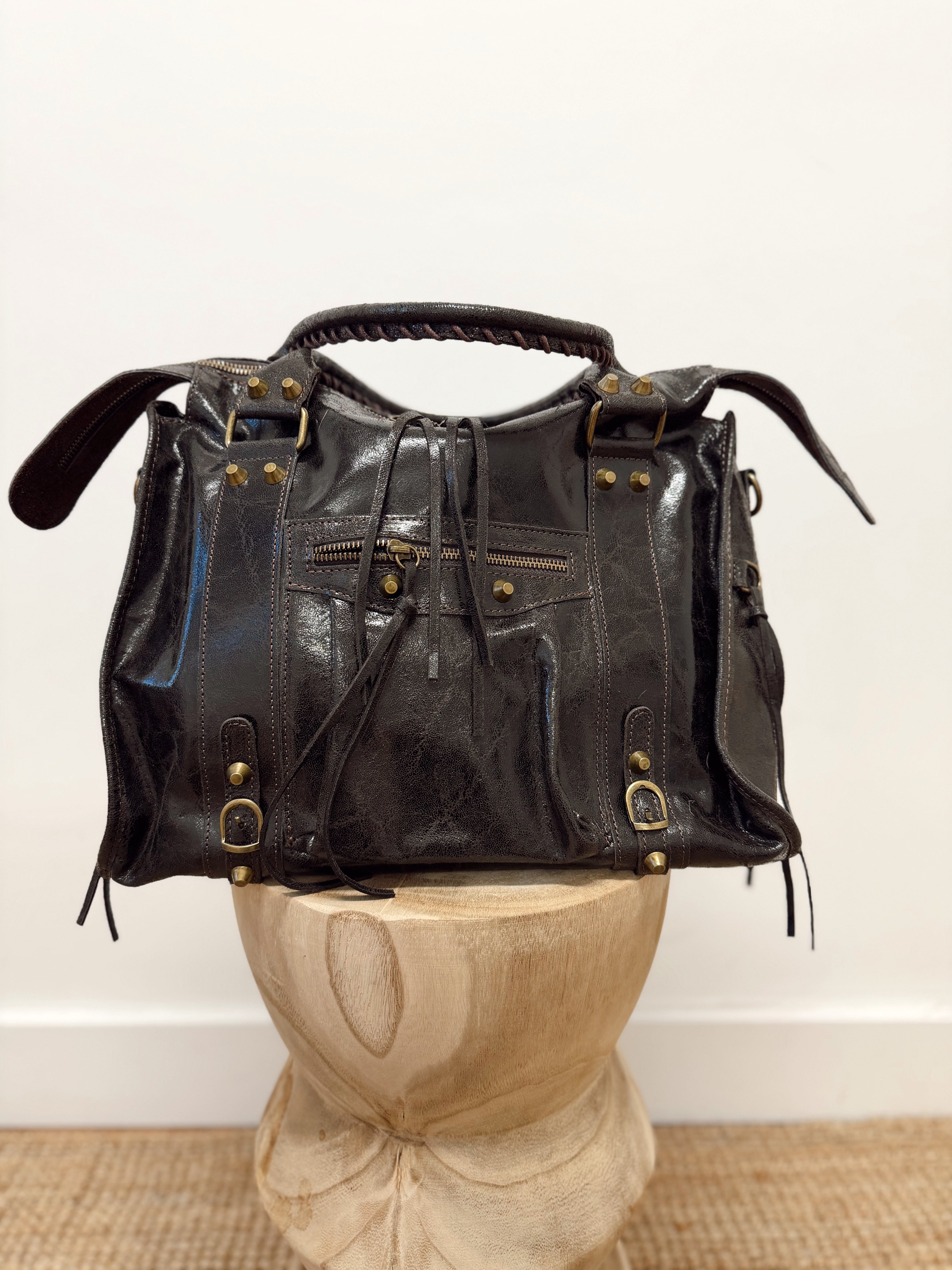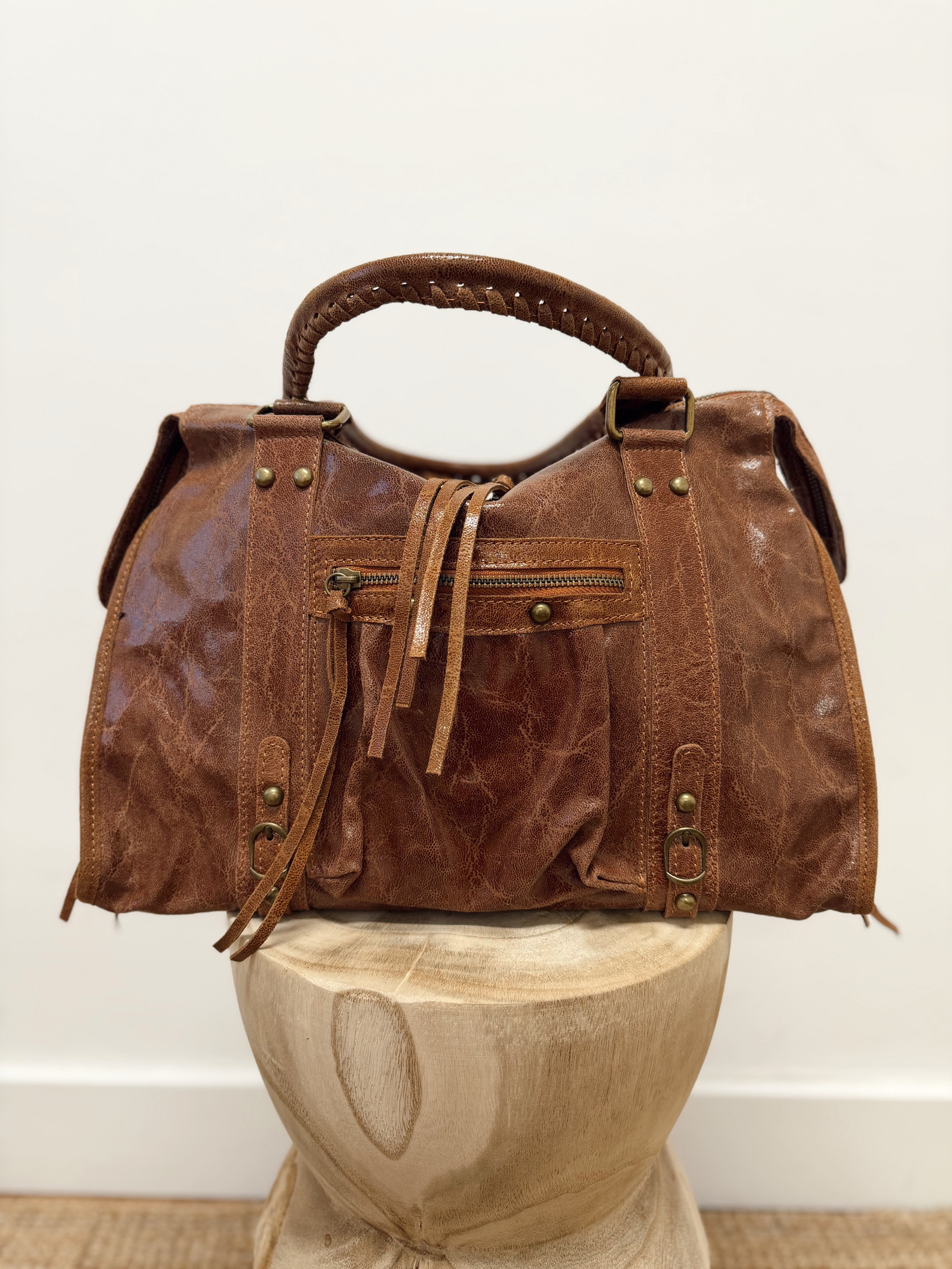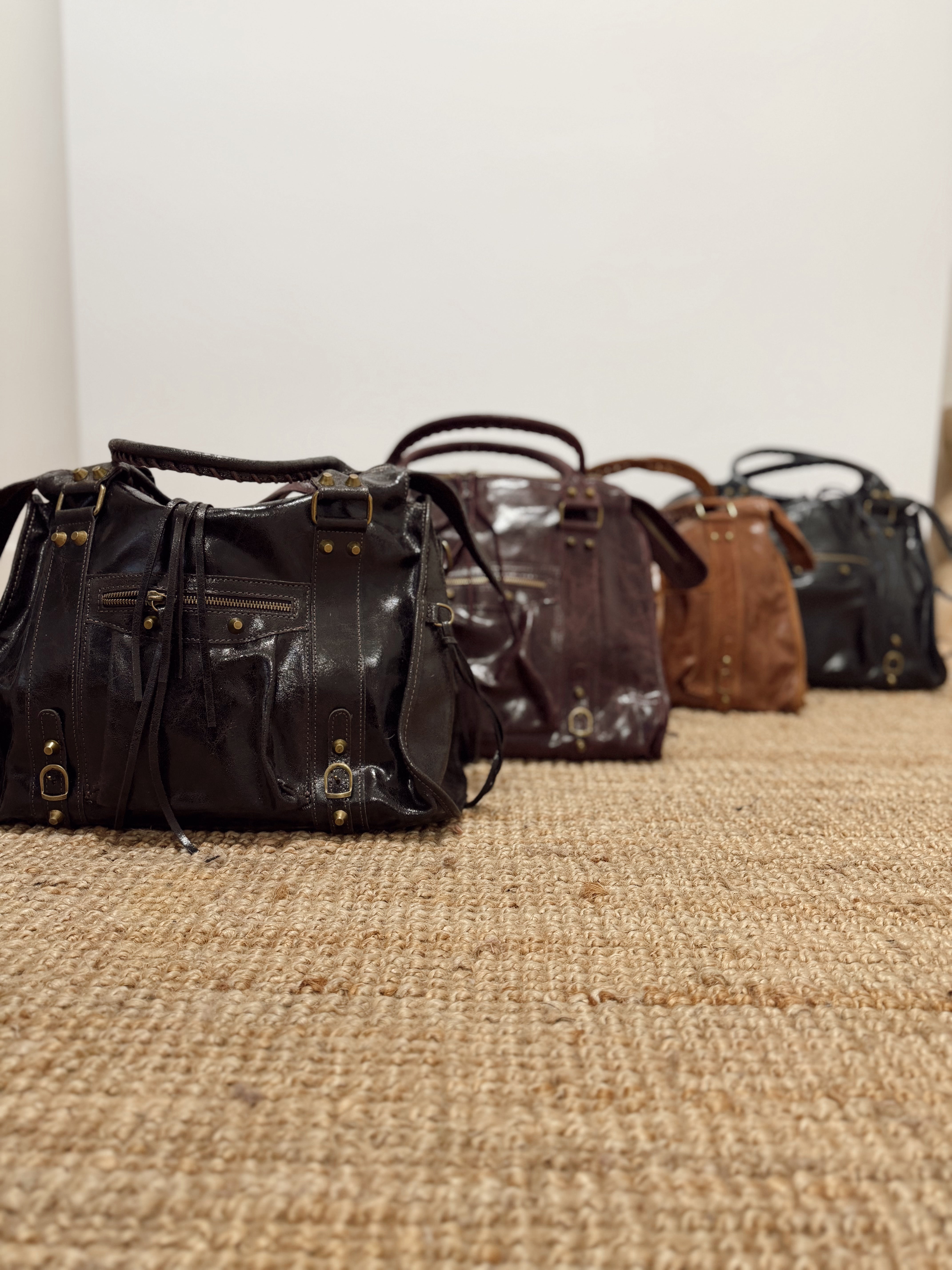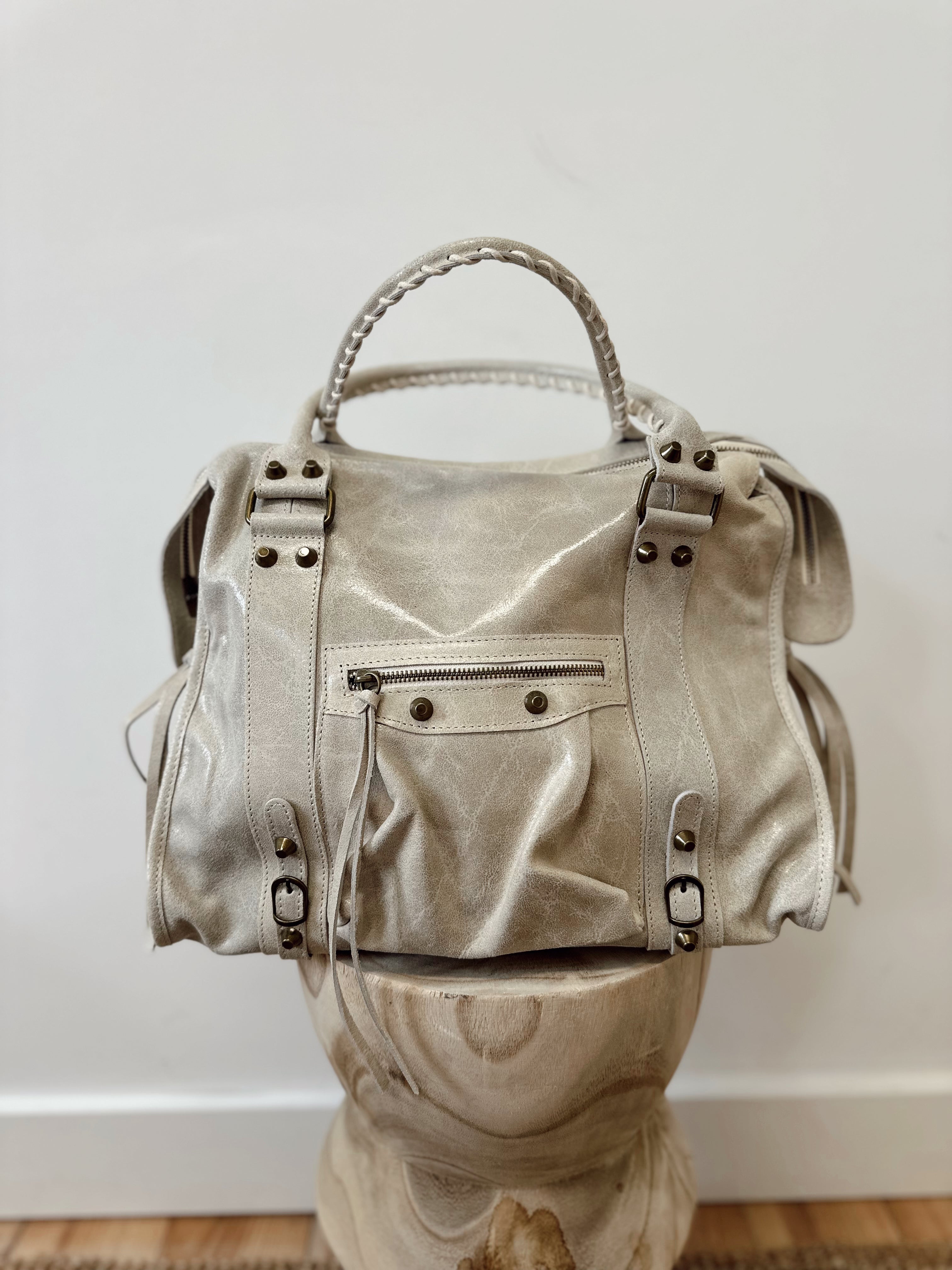 Sac en cuir grand modèle avec détails sur tout le sac. Ils sont disponibles en plusieurs coloris et il y a une grande bandoulière à l'intérieur.