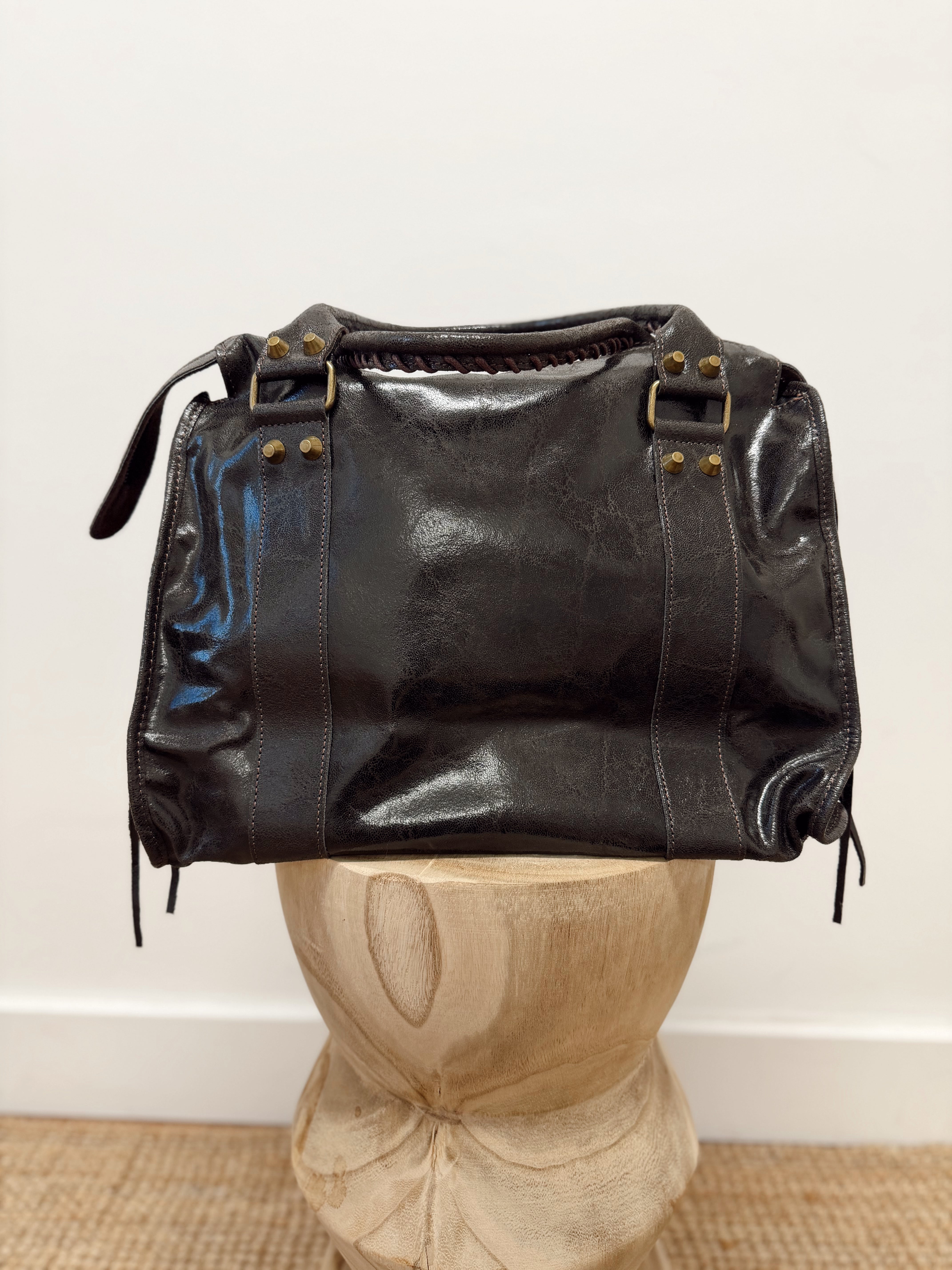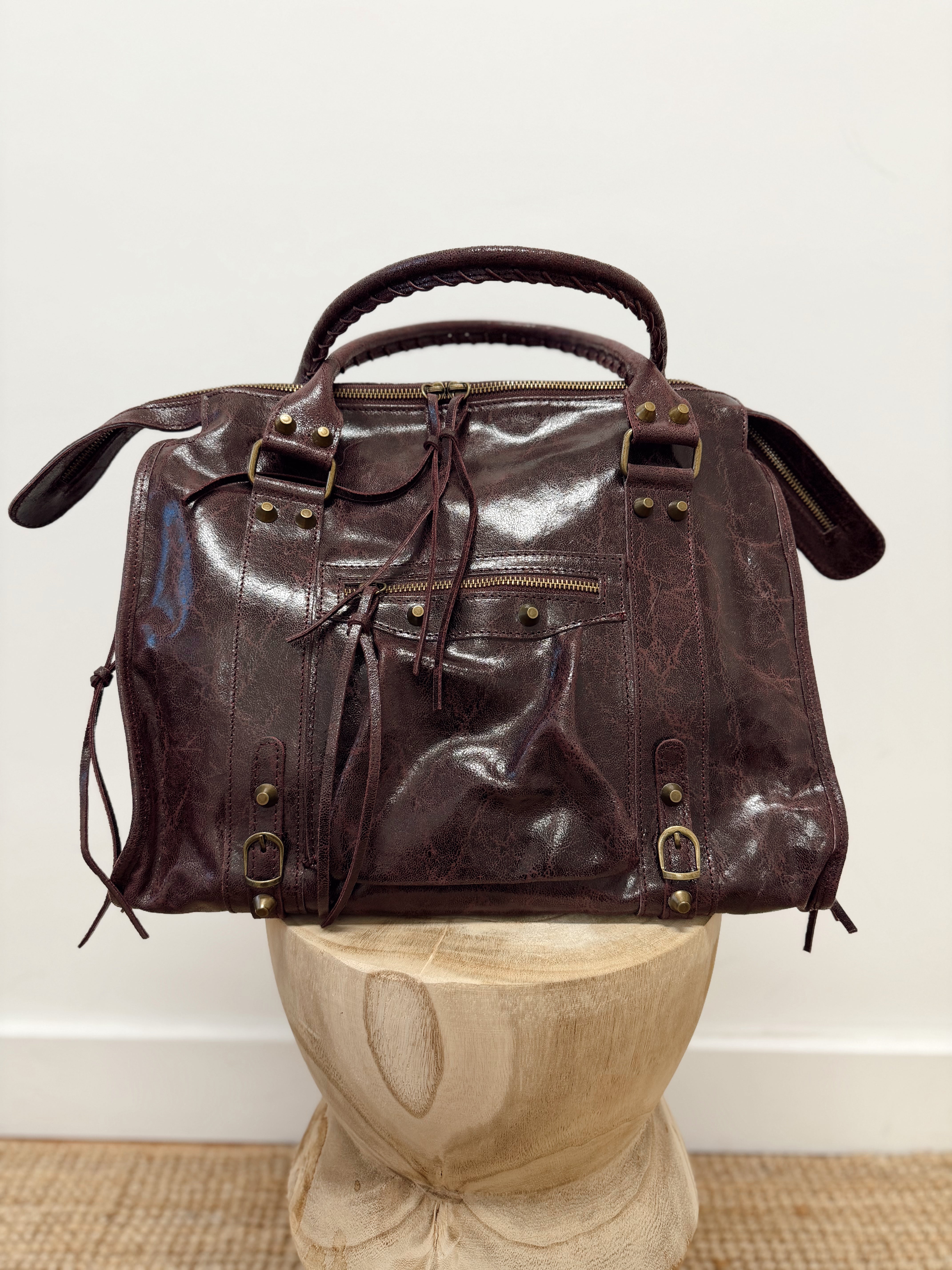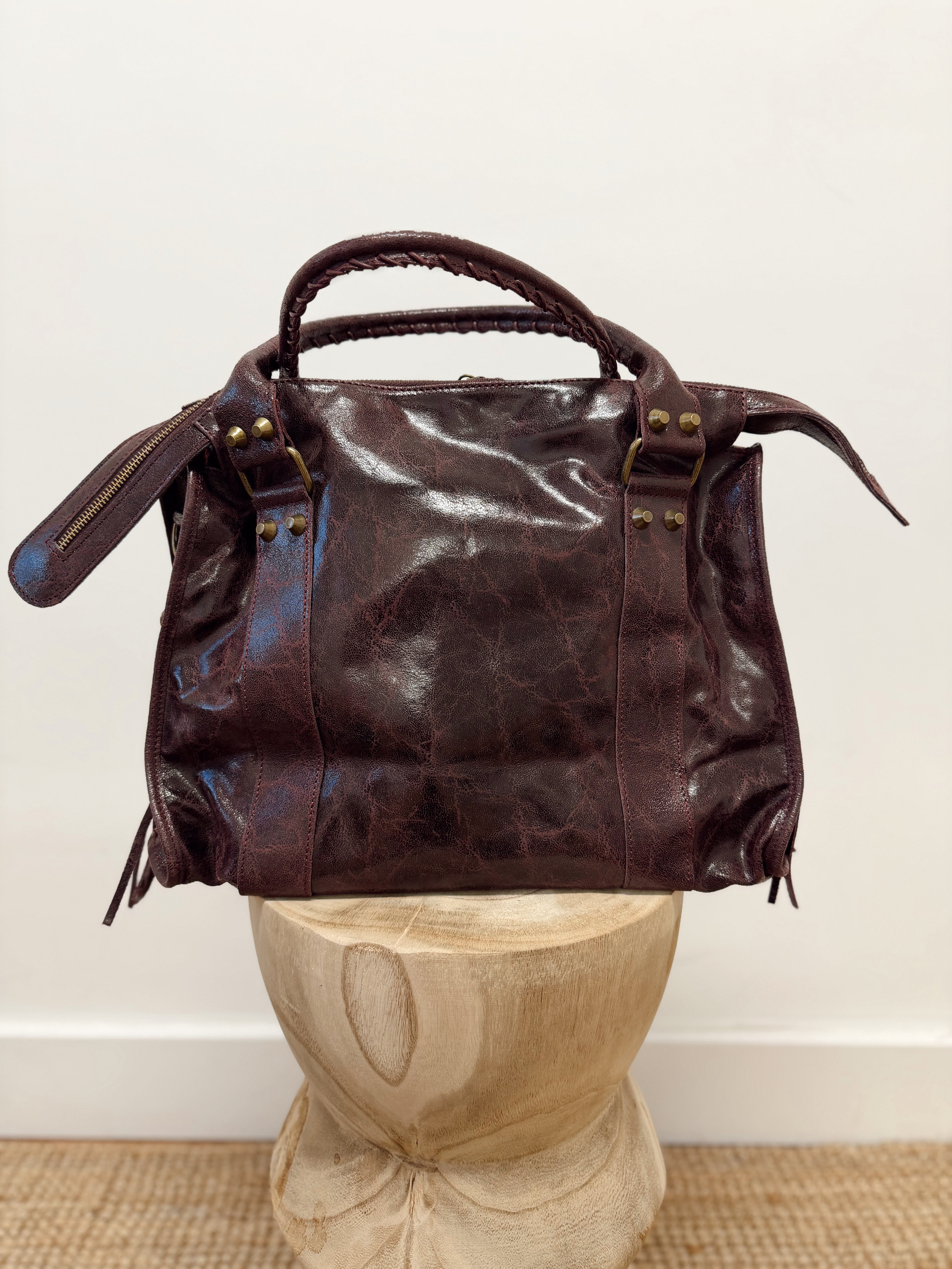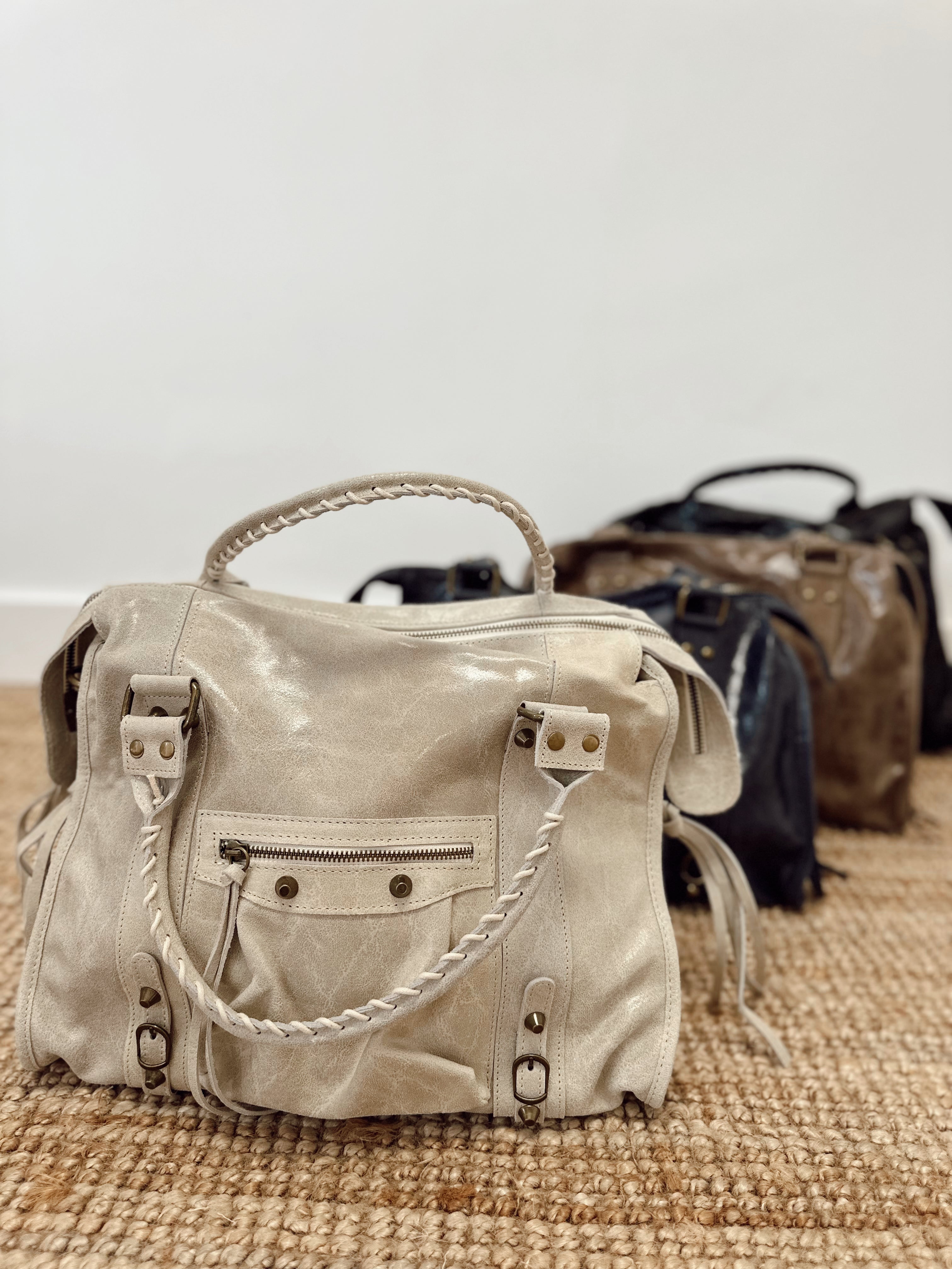 Sac en cuir grand modèle avec détails sur tout le sac. Ils sont disponibles en plusieurs coloris et il y a une grande bandoulière à l'intérieur.