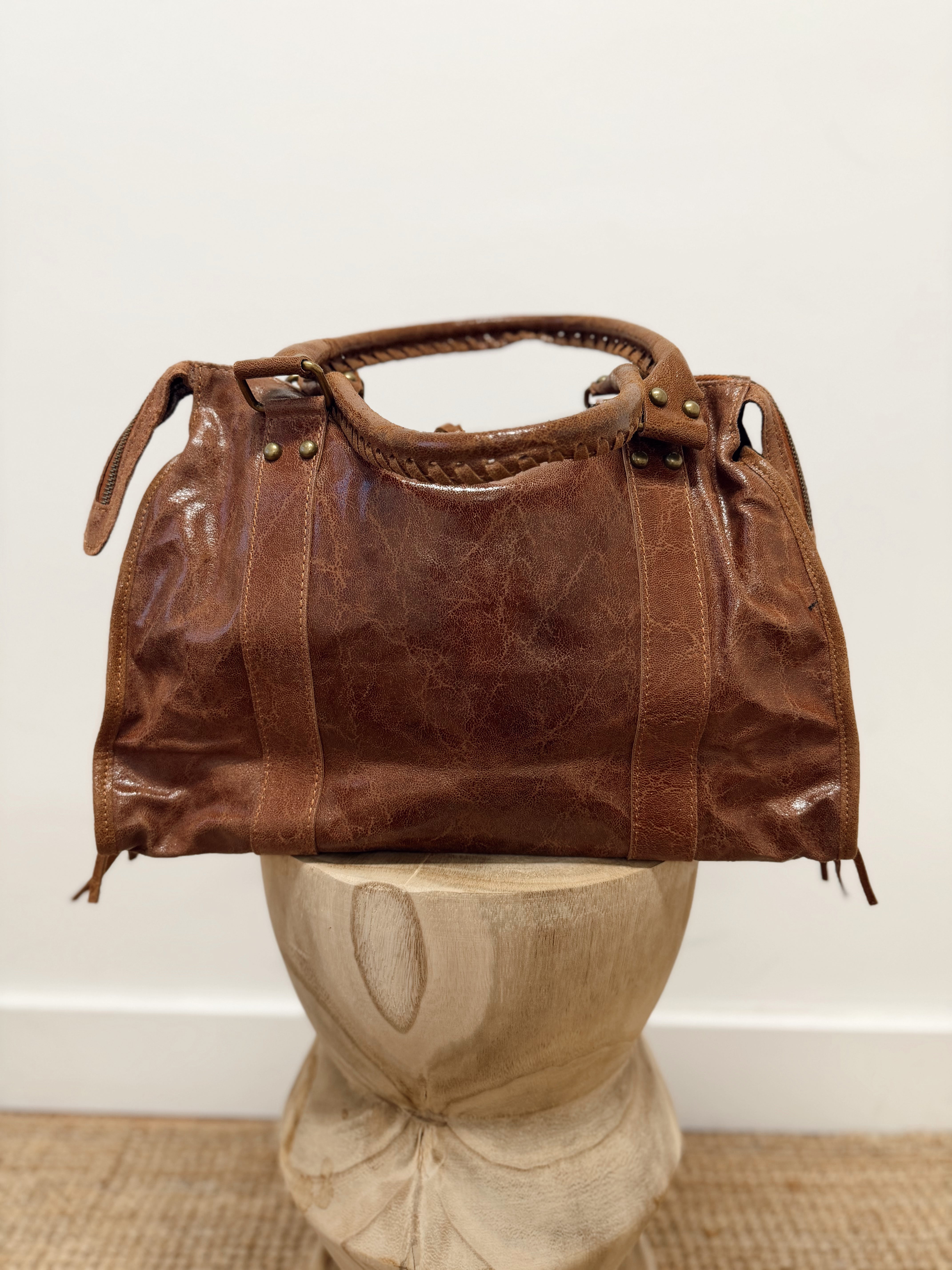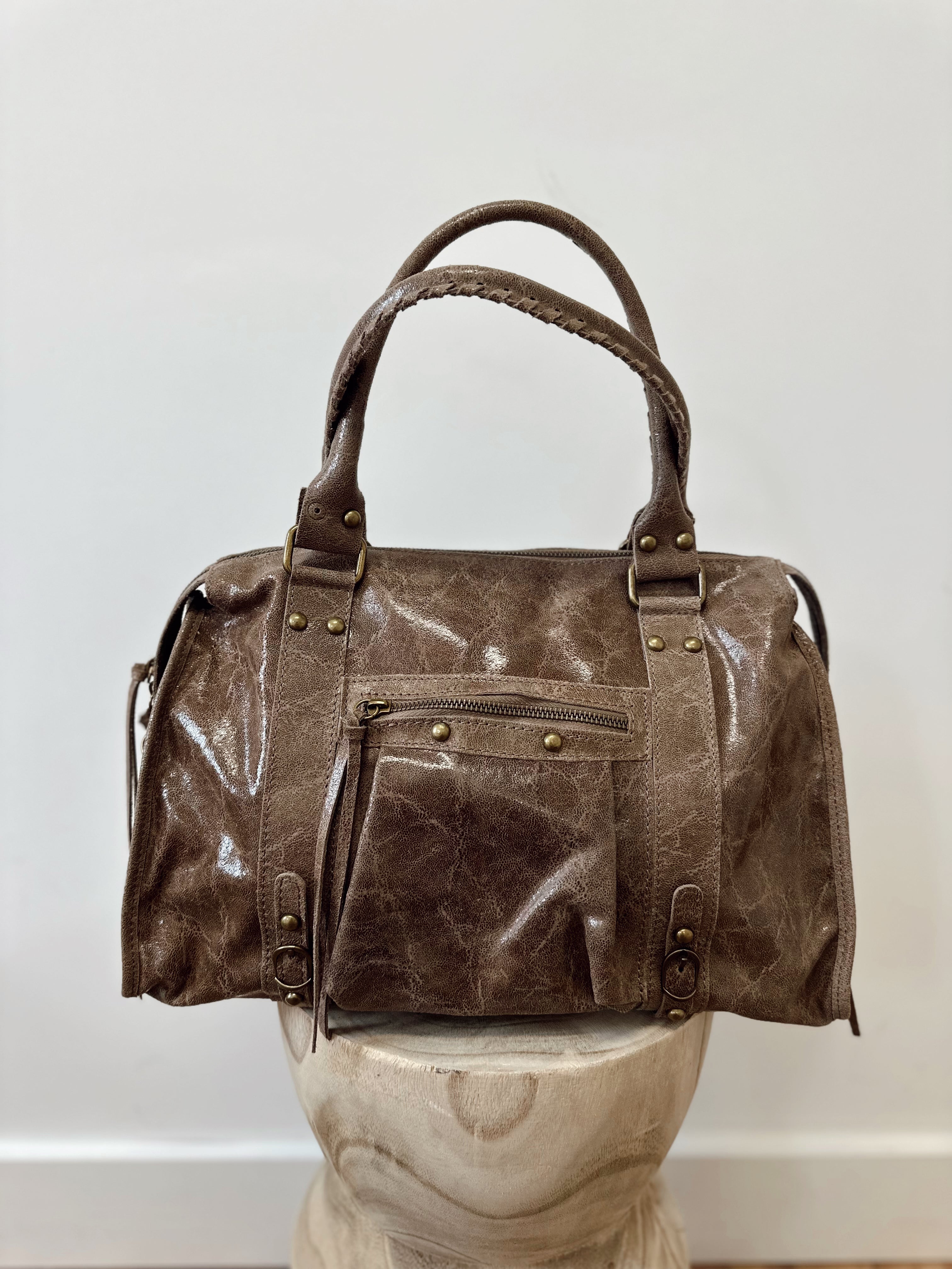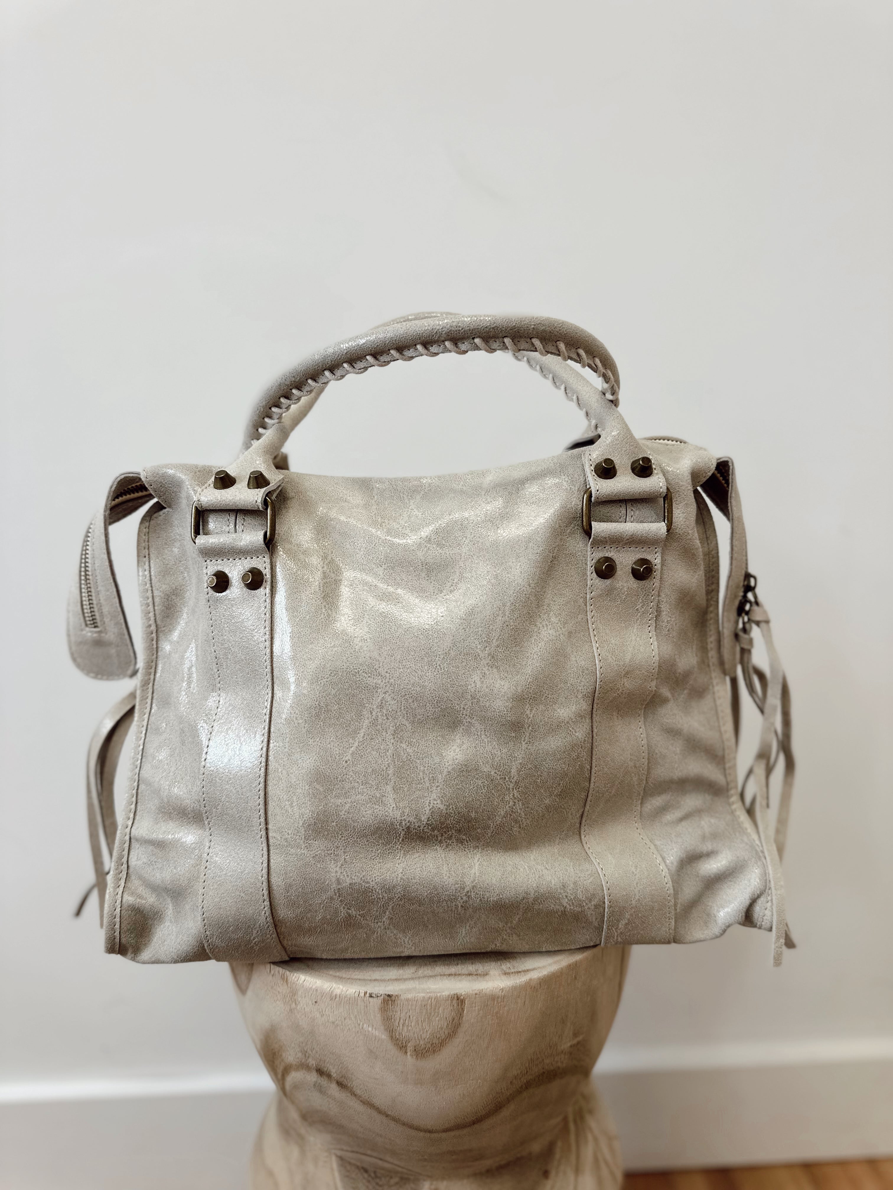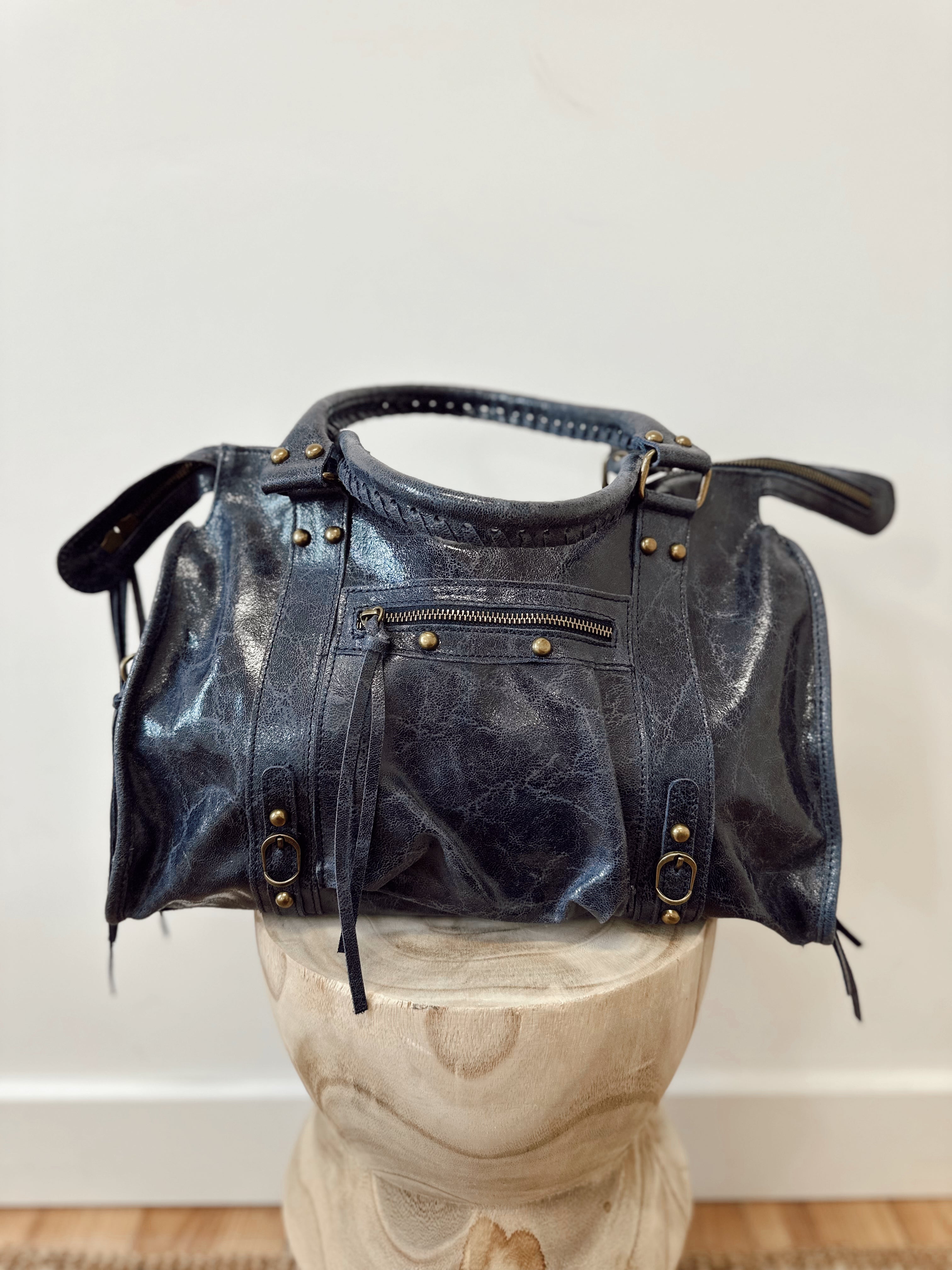 Sac en cuir grand modèle avec détails sur tout le sac. Ils sont disponibles en plusieurs coloris et il y a une grande bandoulière à l'intérieur.