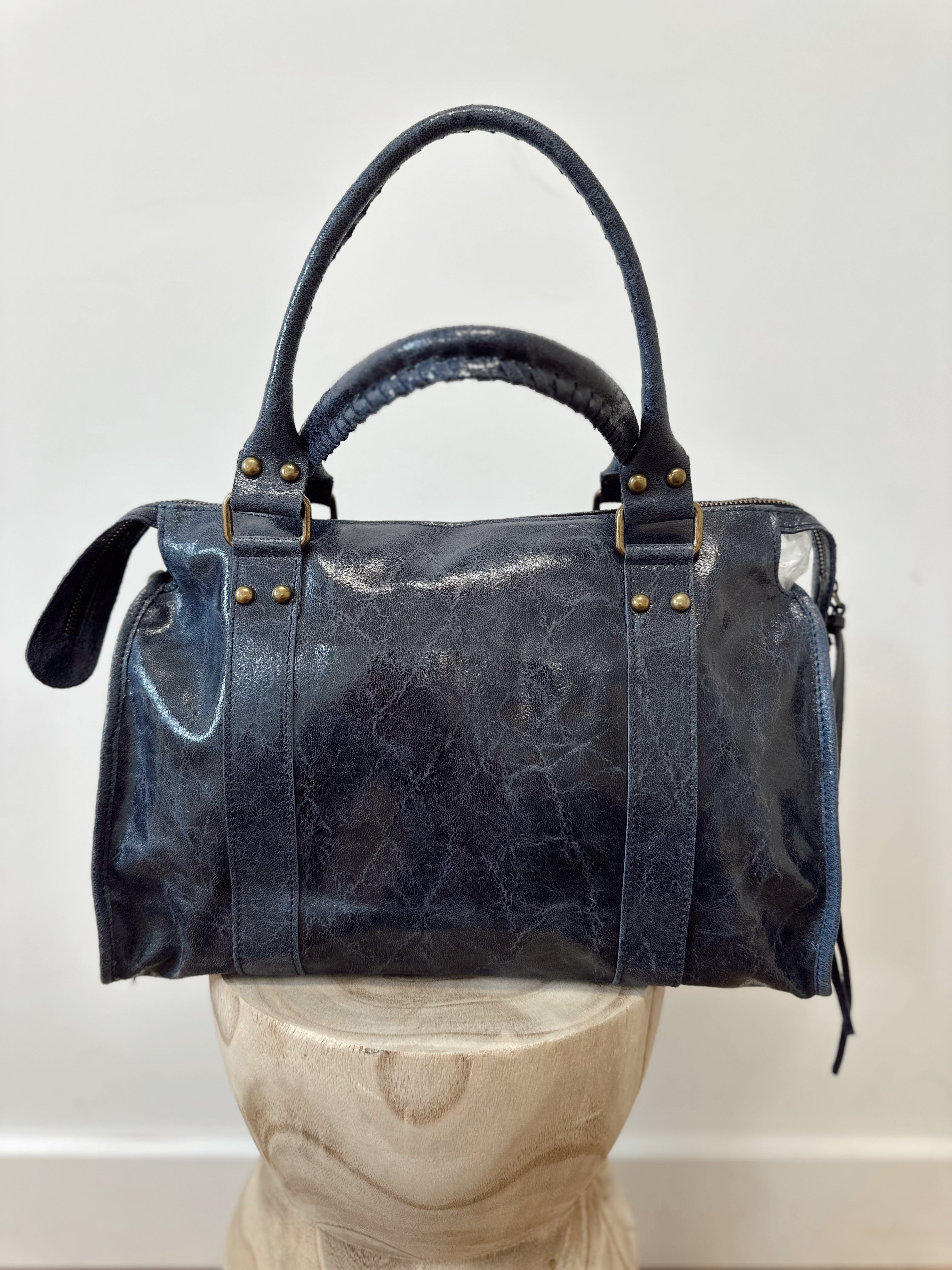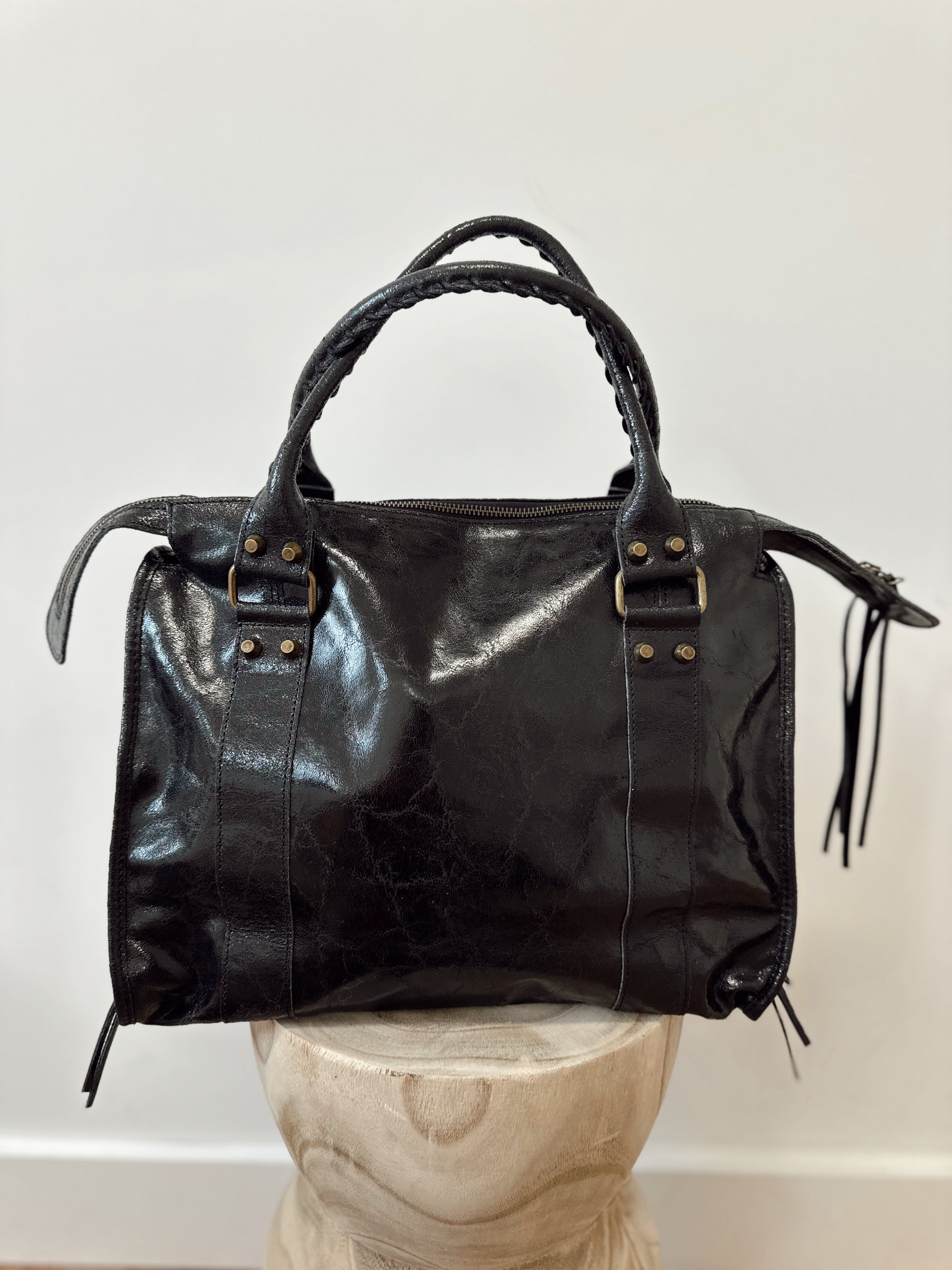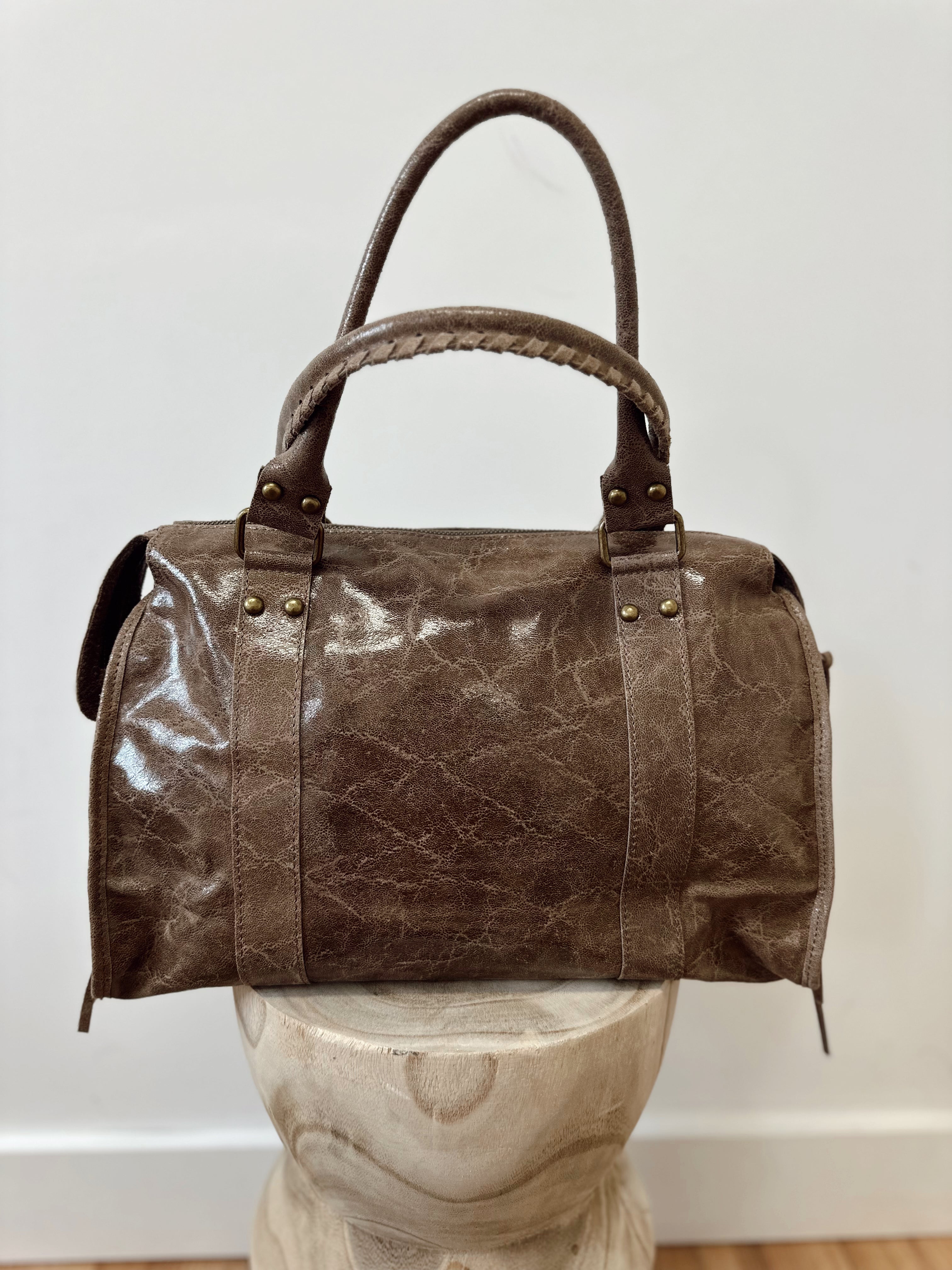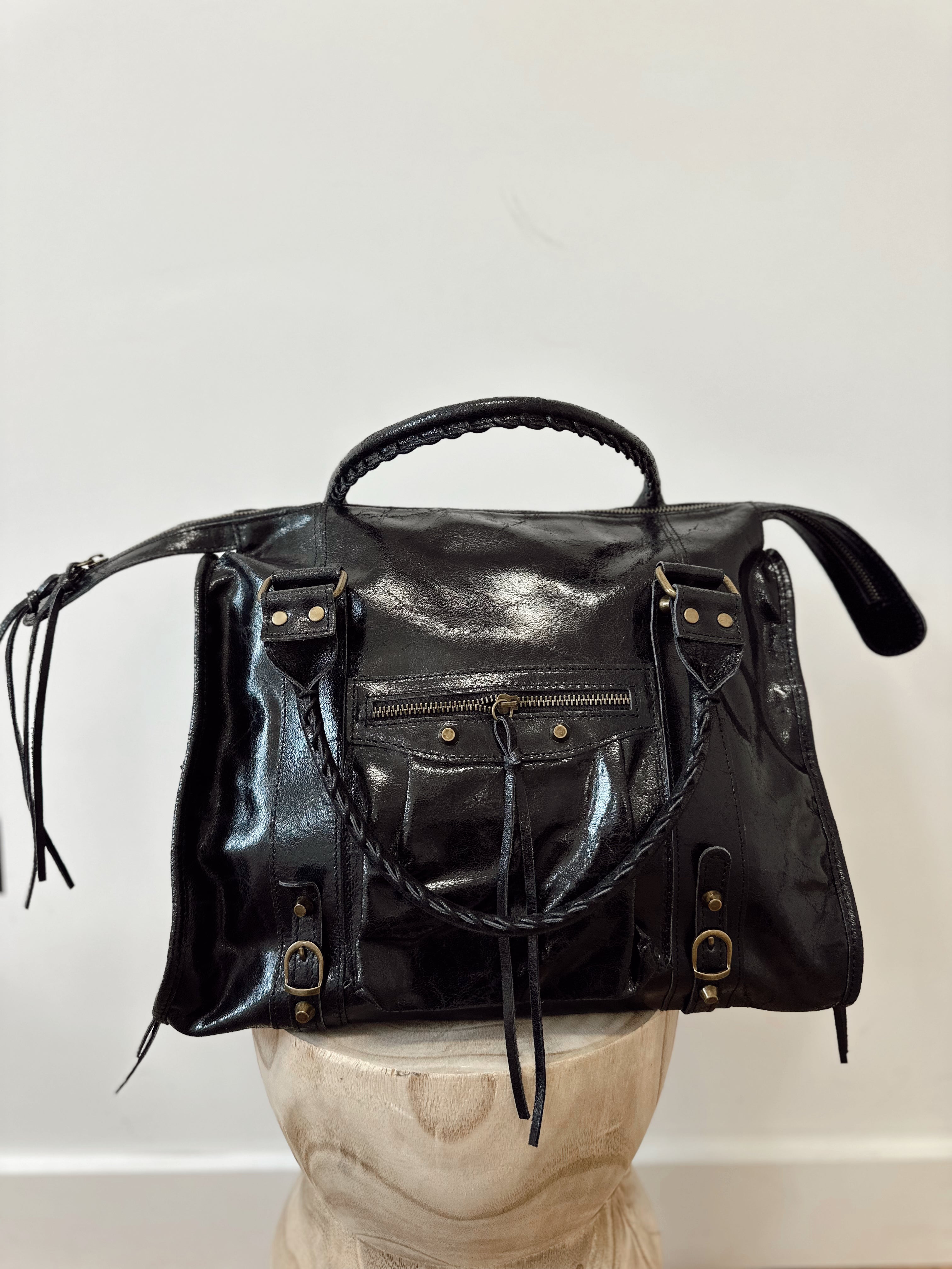 Sac en cuir grand modèle avec détails sur tout le sac. Ils sont disponibles en plusieurs coloris et il y a une grande bandoulière à l'intérieur.