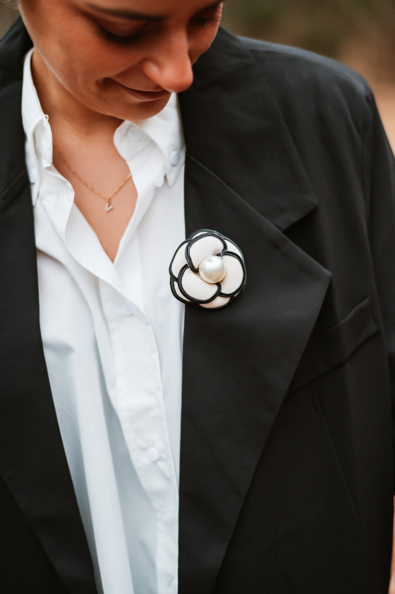 Épinglez cette délicate broche florale aux contours noirs et perle centrale blanche pour une touche d'élégance intemporelle. Un accessoire raffiné qui transforme instantanément votre tenue.