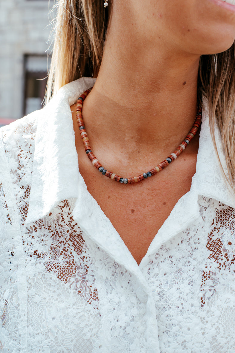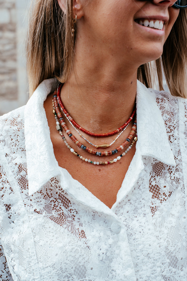 Collier en perles rouilles, dorées et grises. Acier inoxydable.