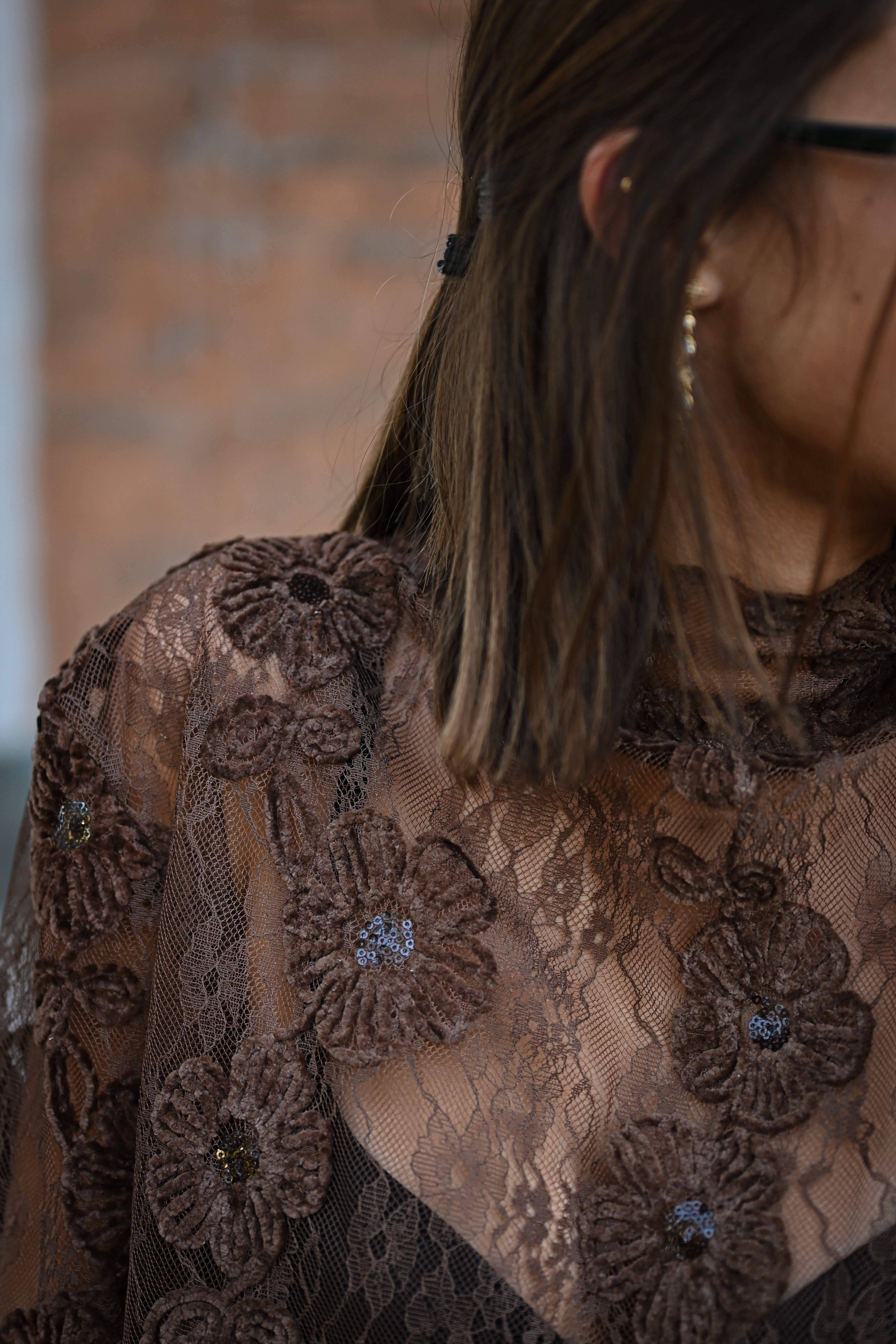 Blouse transparente à col montant et manches longues, ornée de délicates fleurs et de petits strass scintillants. Coupe élégante en taille unique pour un style raffiné et intemporel.