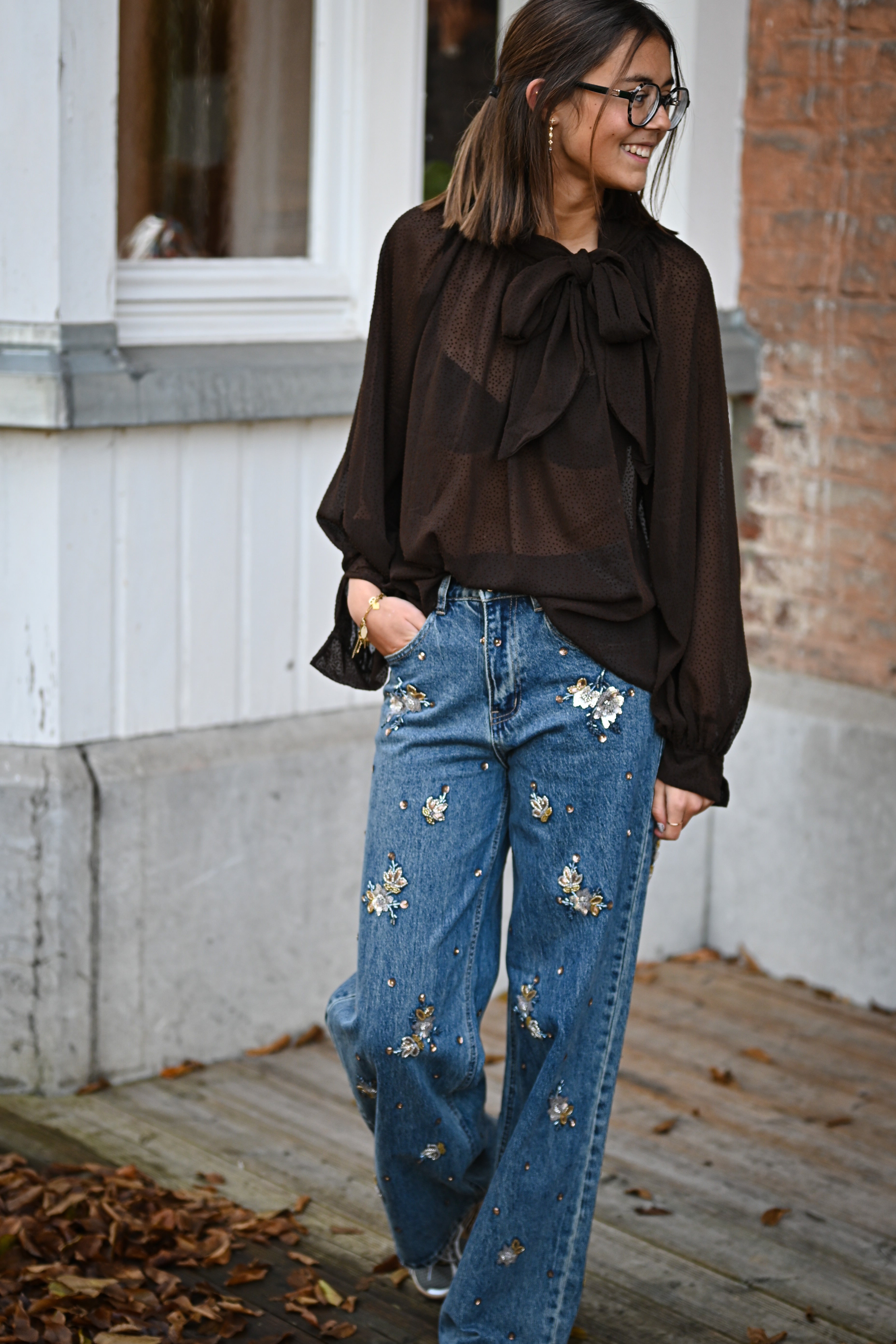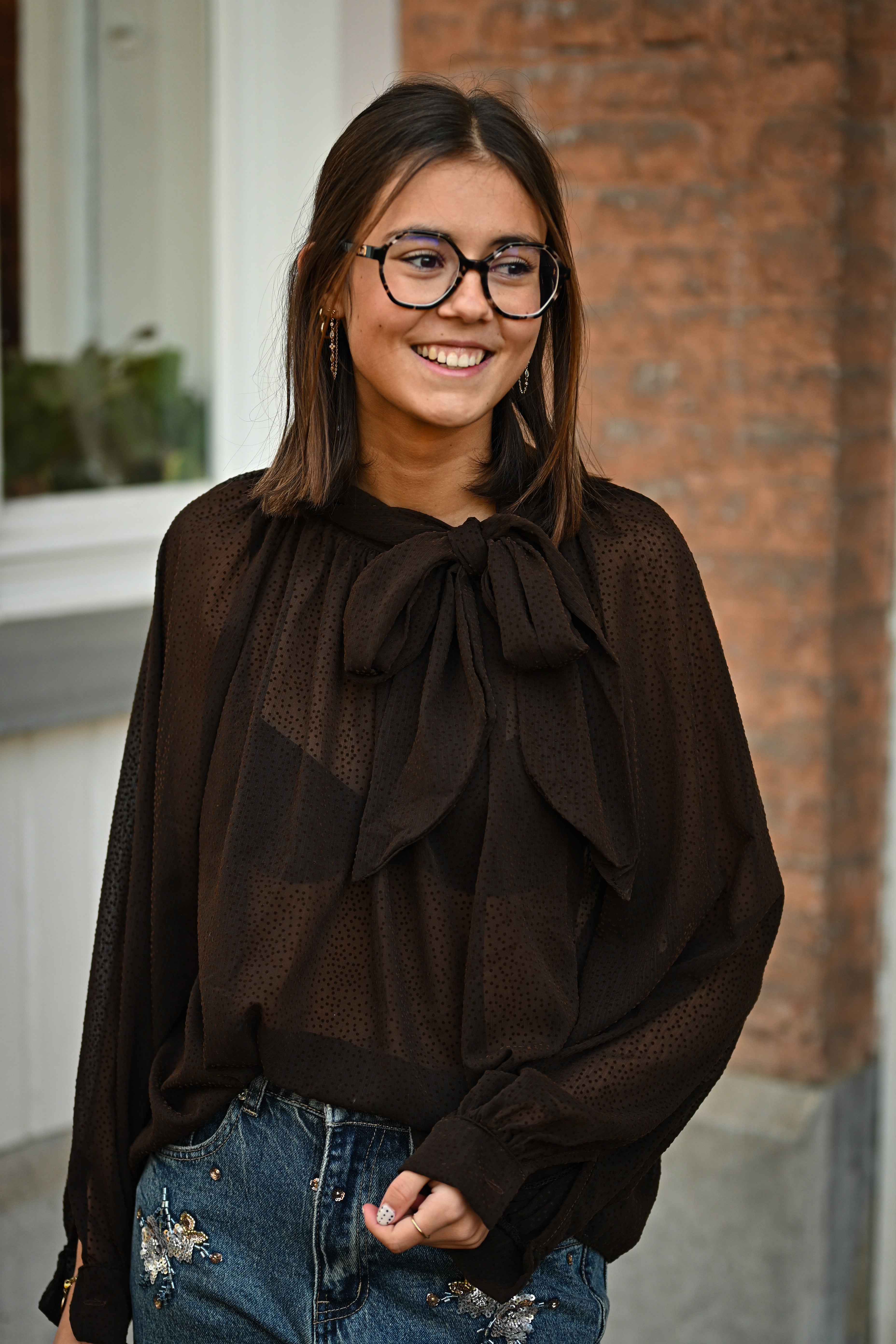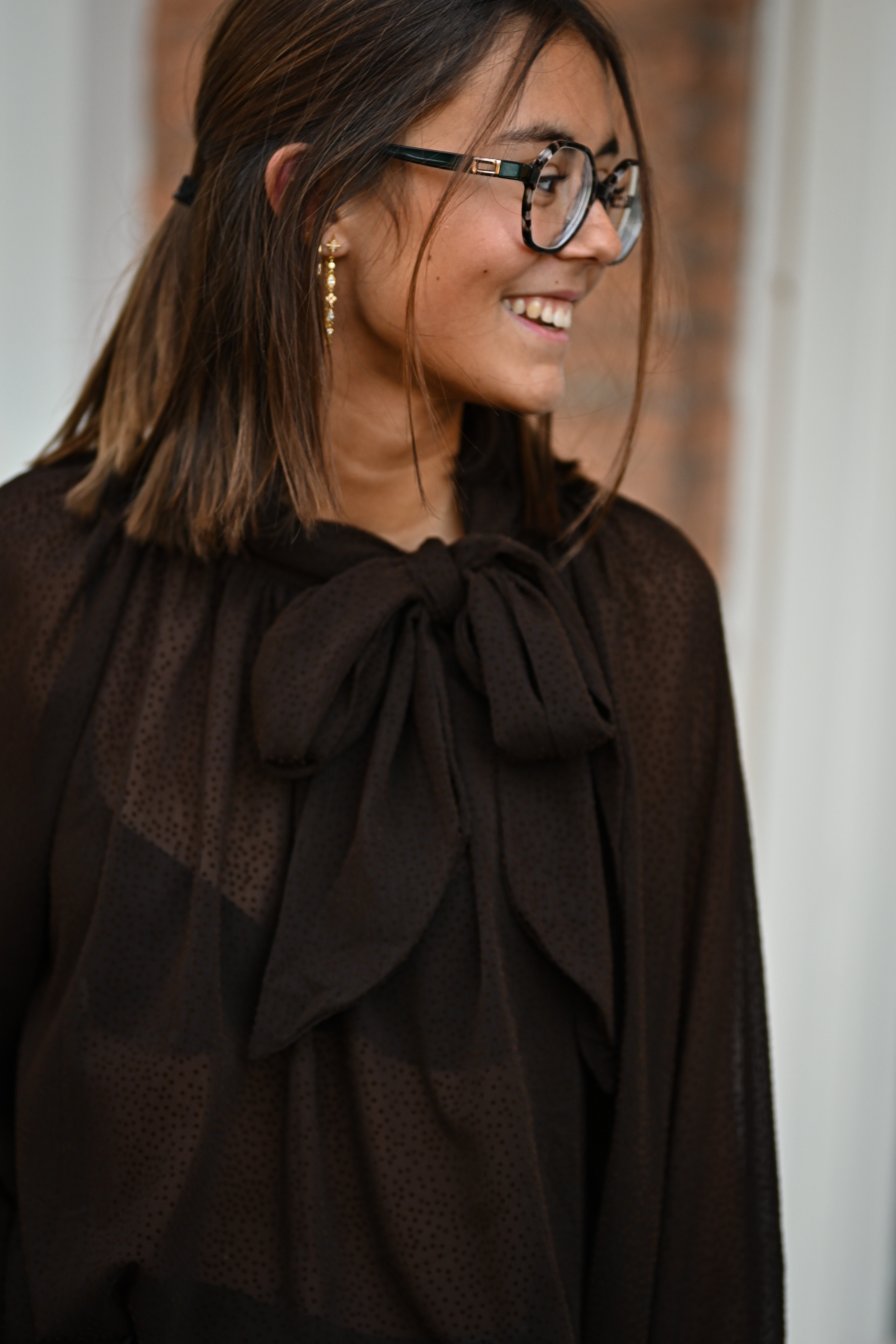Découvrez notre blouse OSCAR, en voile chocolat rehaussée d'un délicat motif à pois. Son nœud au col apporte une touche d'élégance intemporelle à votre garde-robe. Disponible en taille unique, cette blouse allie confort et style pour tous les jours.