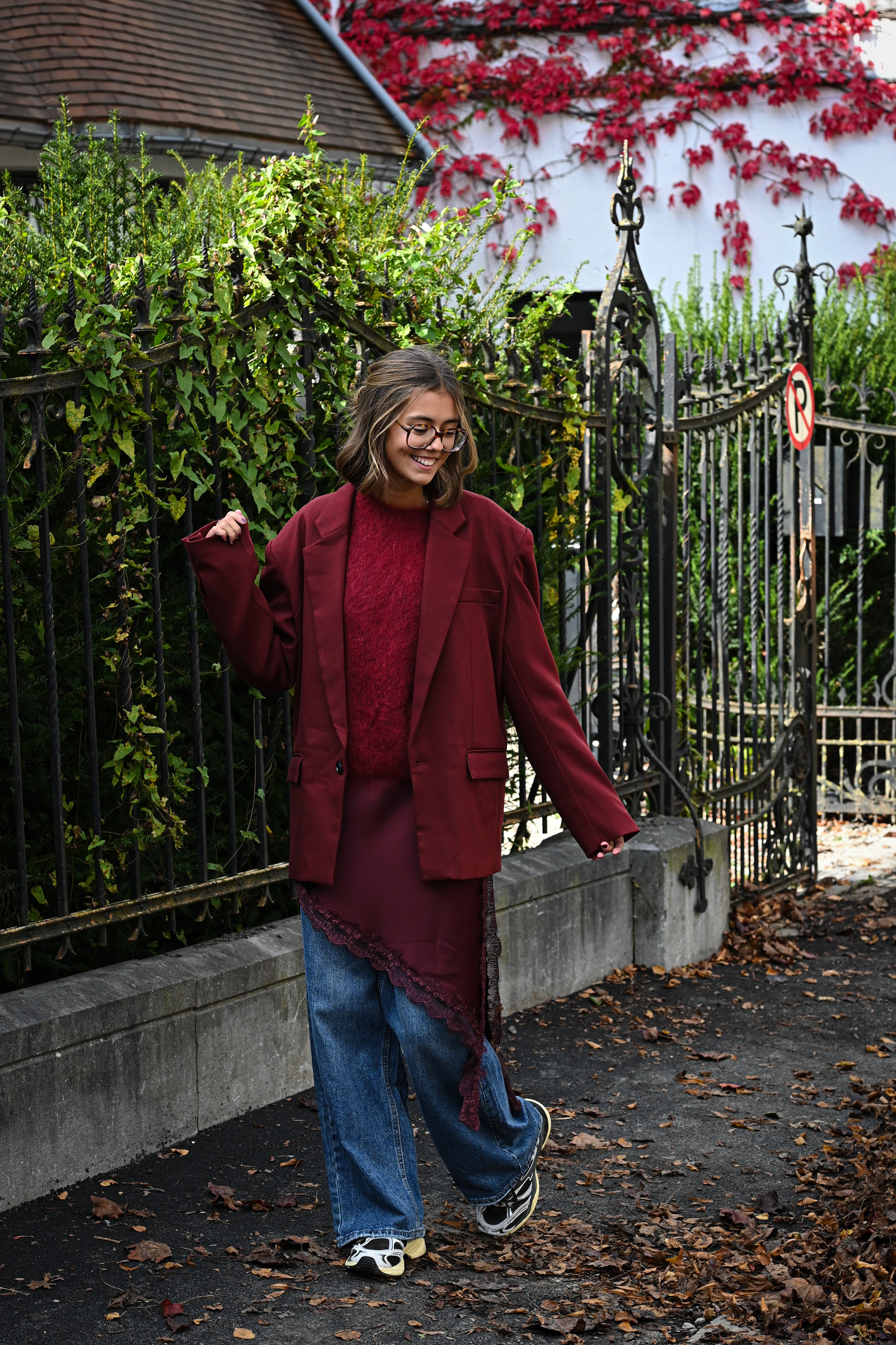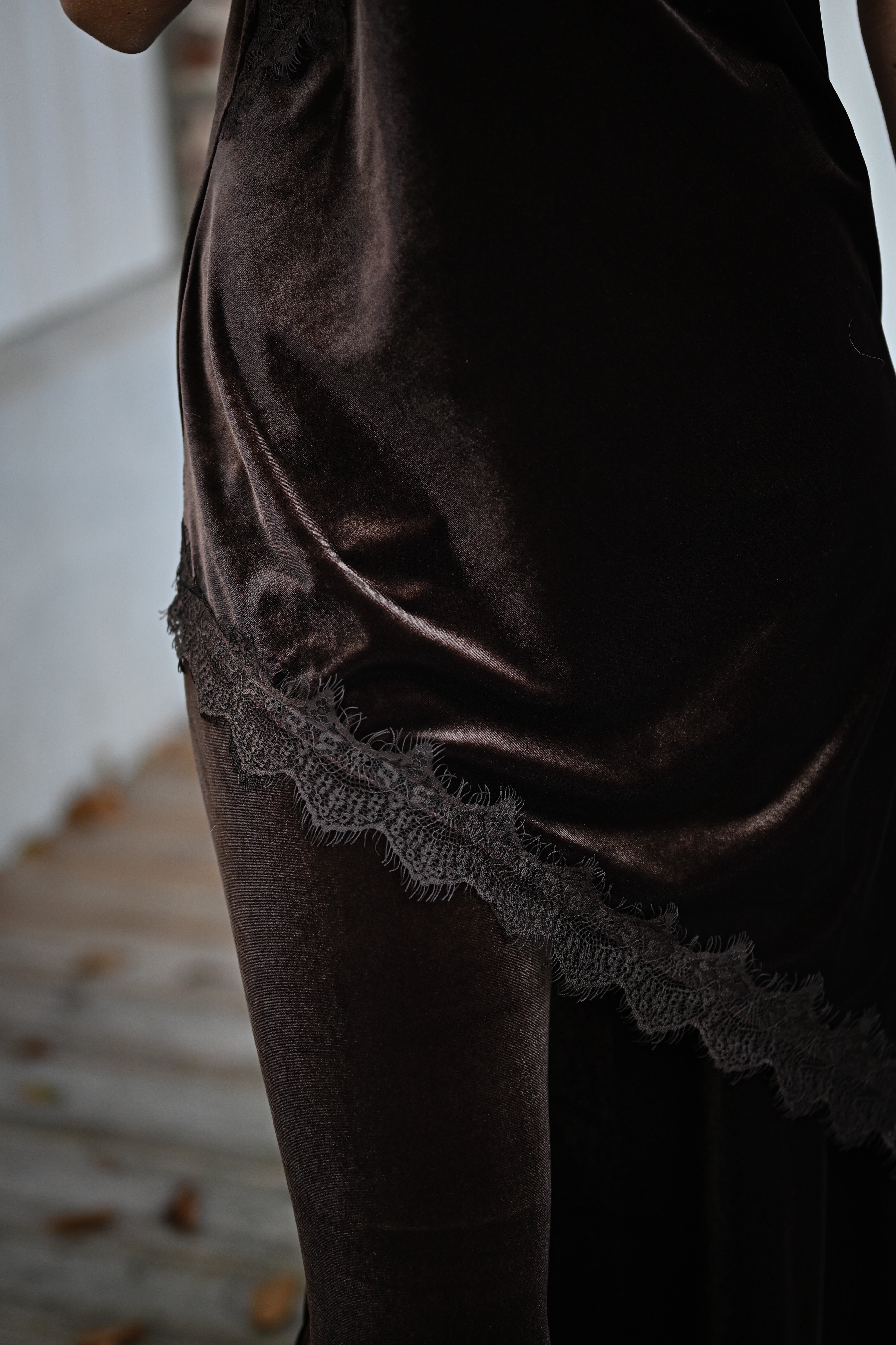Blouse asymétrique en satin ornée de dentelle, proposée en chocolat et bordeaux. Taille unique avec fines bretelles pour une élégance délicate.