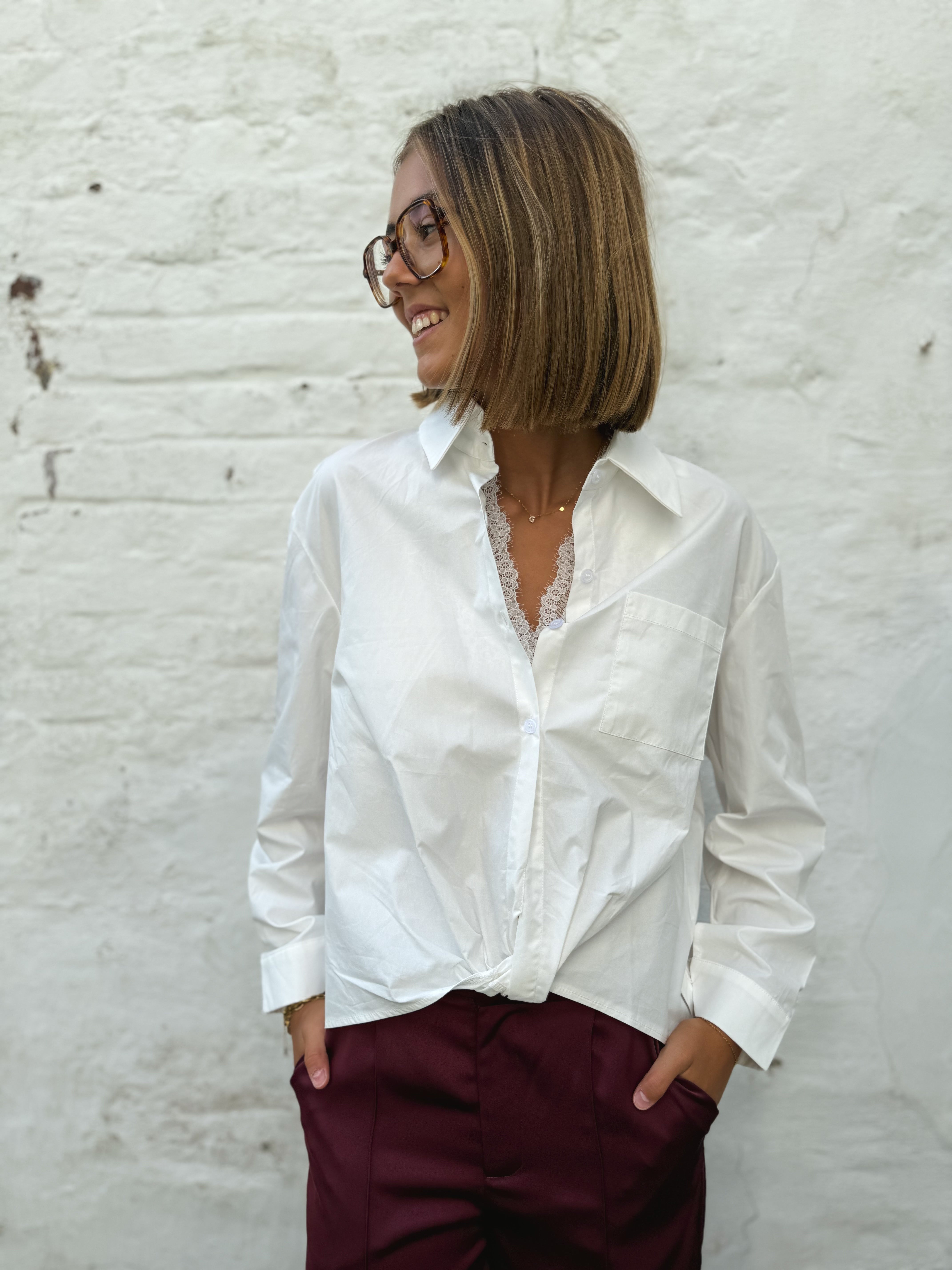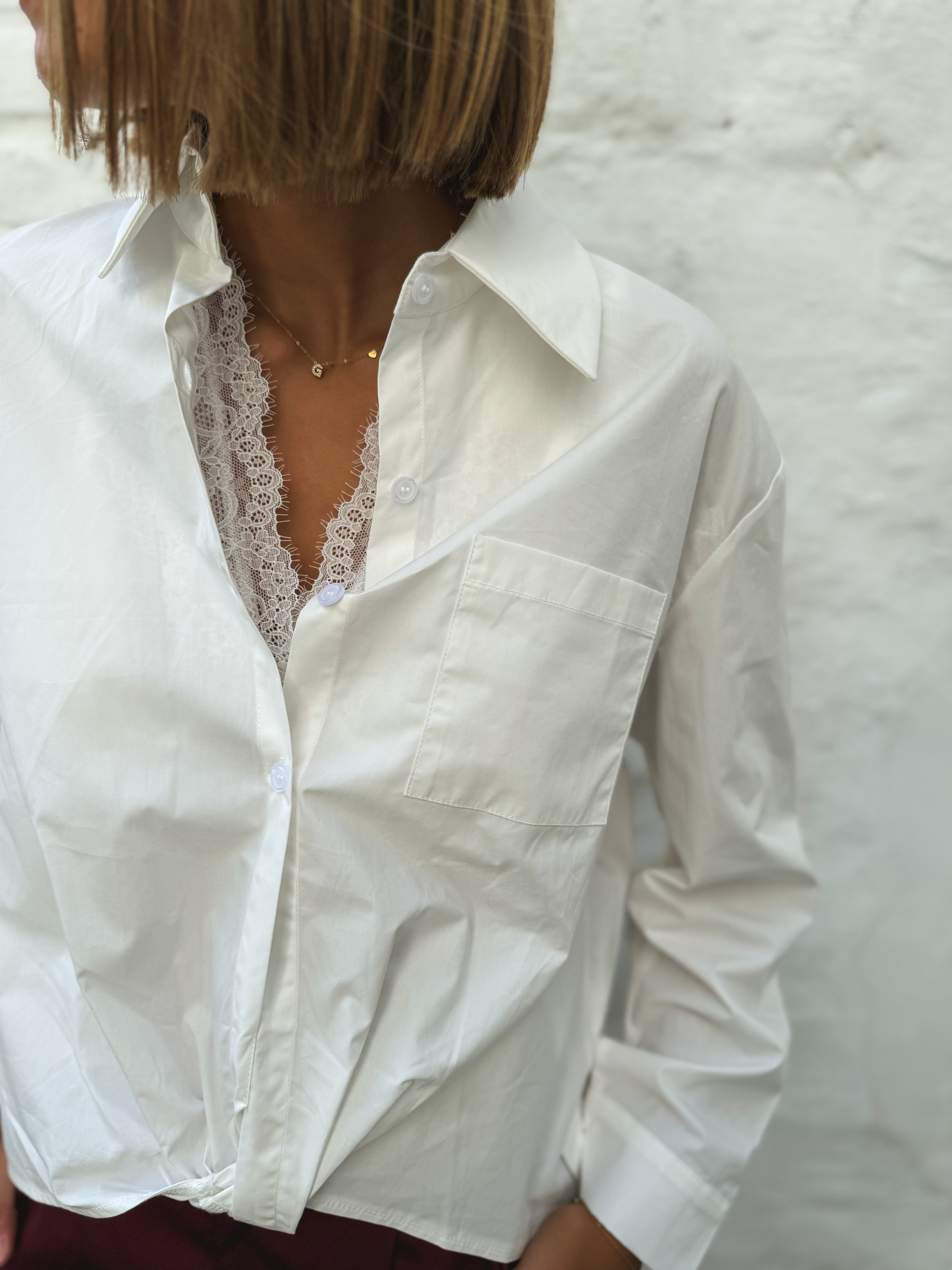 Chemise blanche courte, nouée à l’avant, avec un top en dentelle intégré, disponible en tailles S, M ou L.