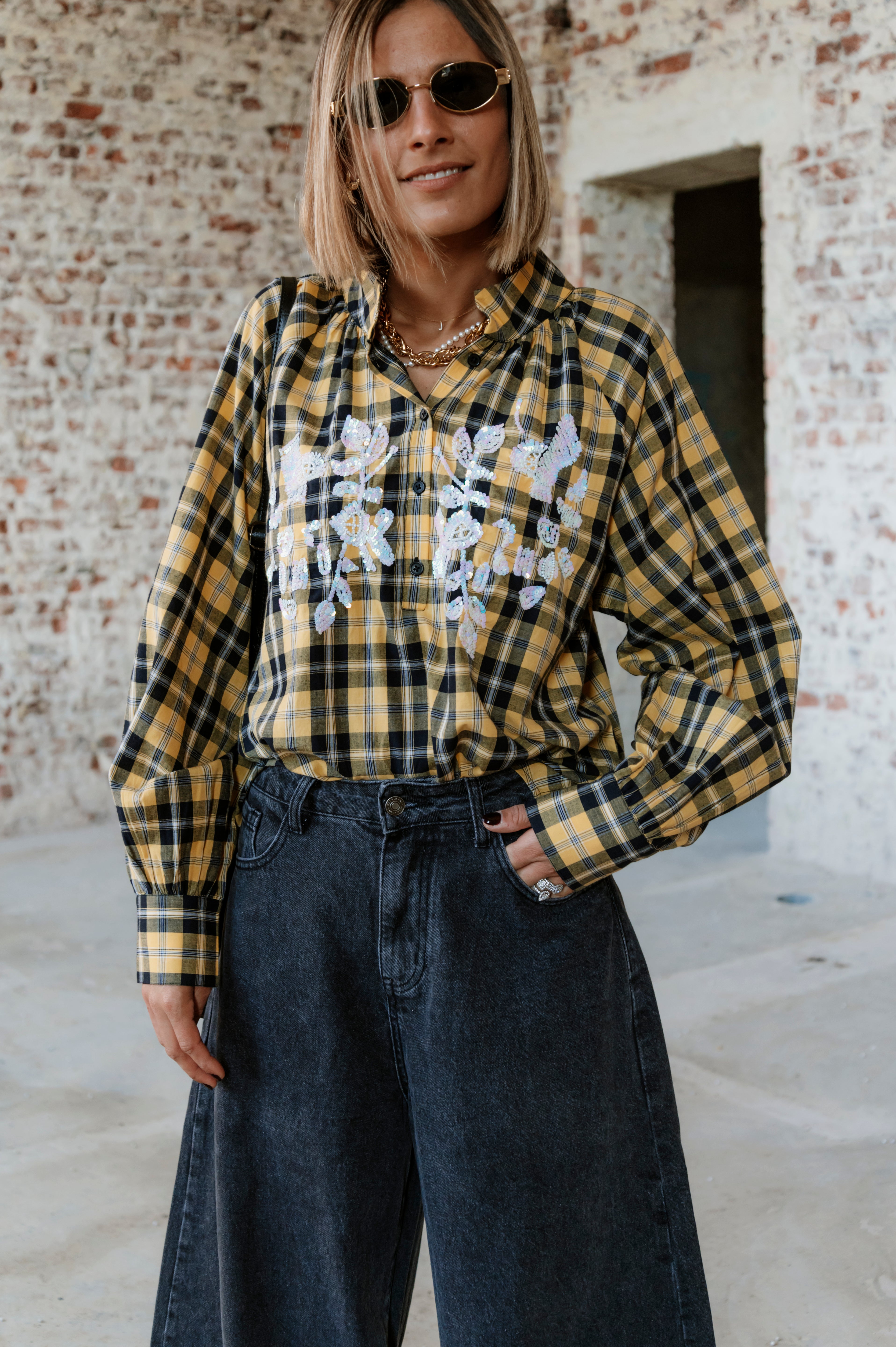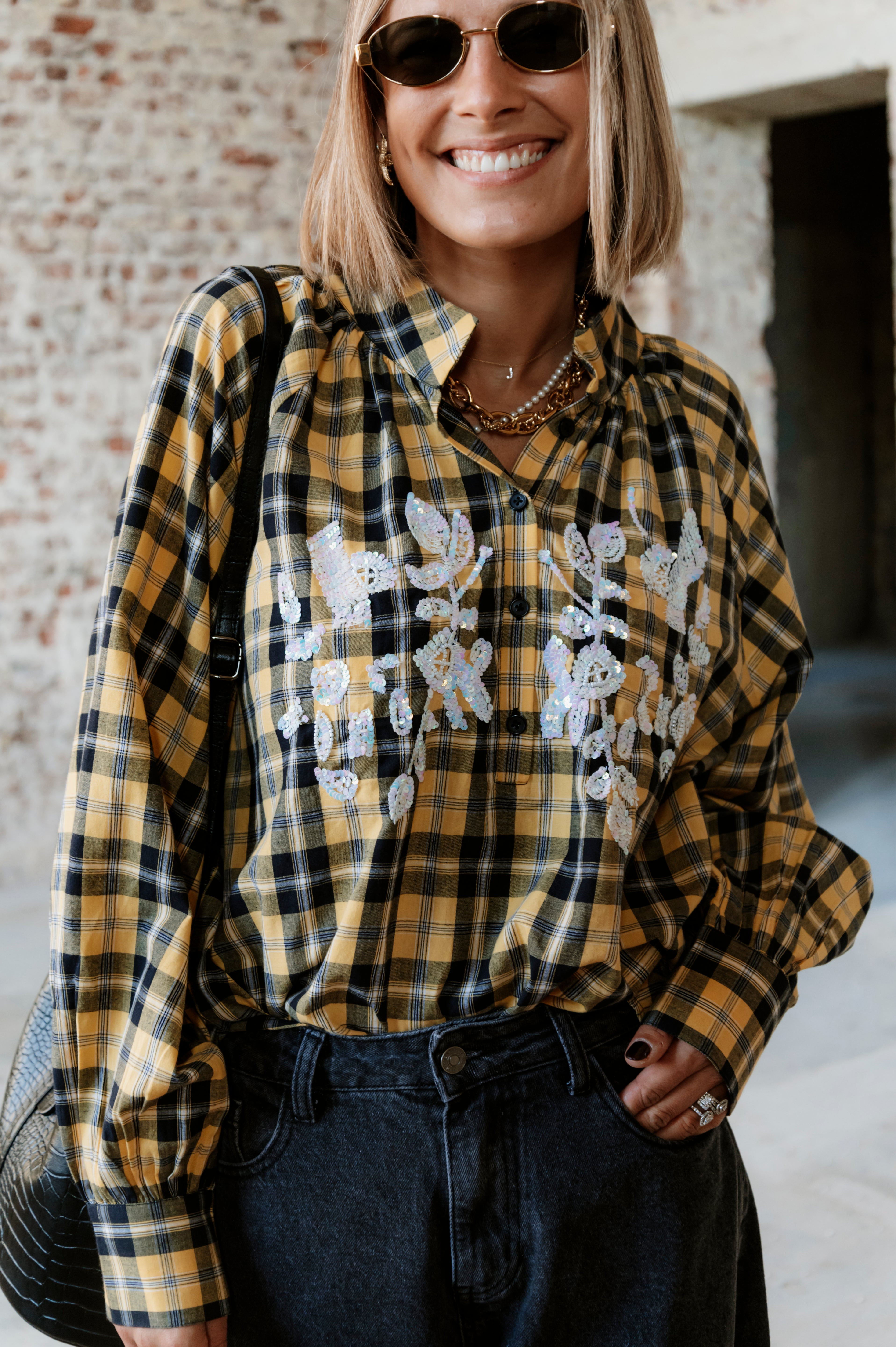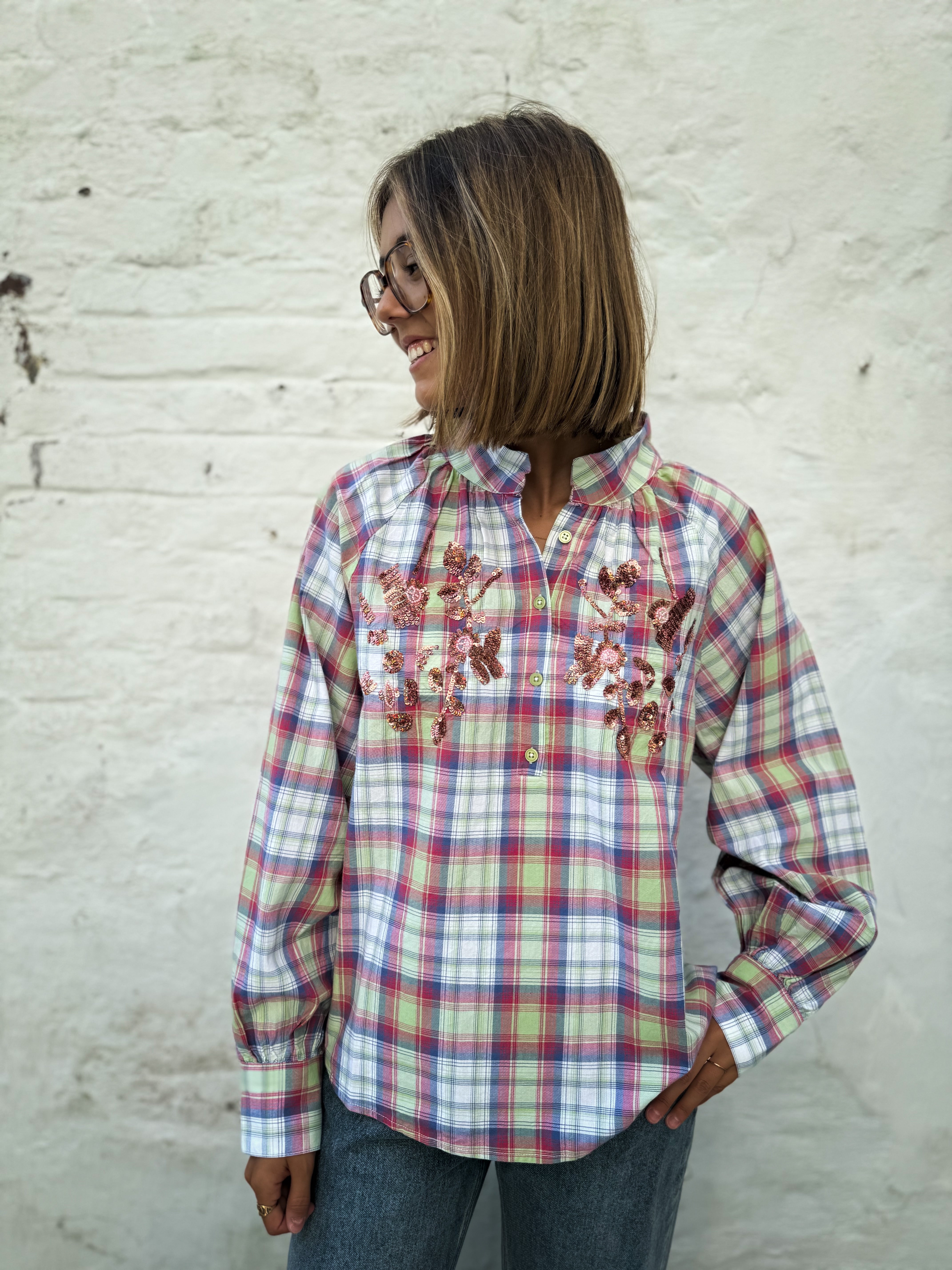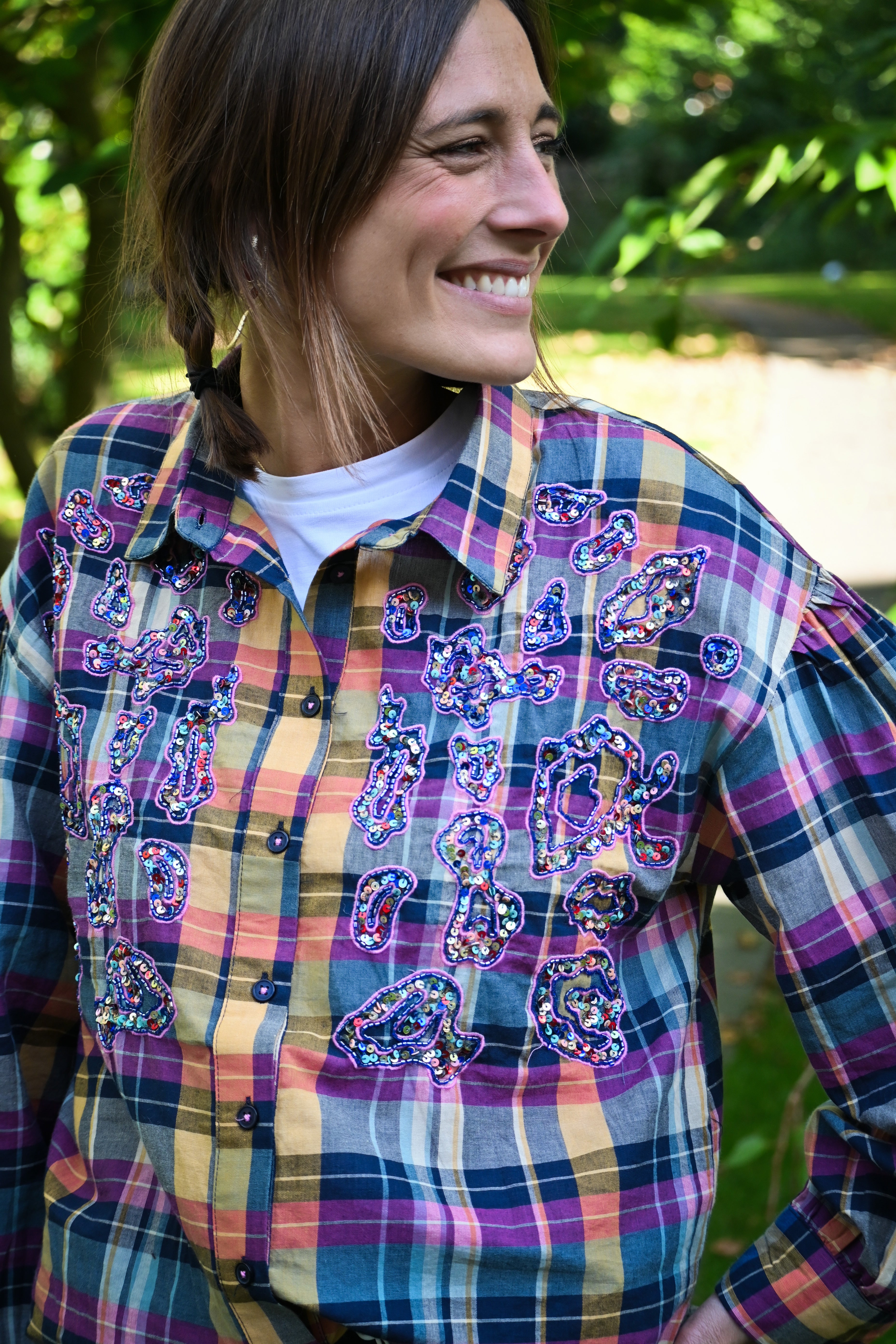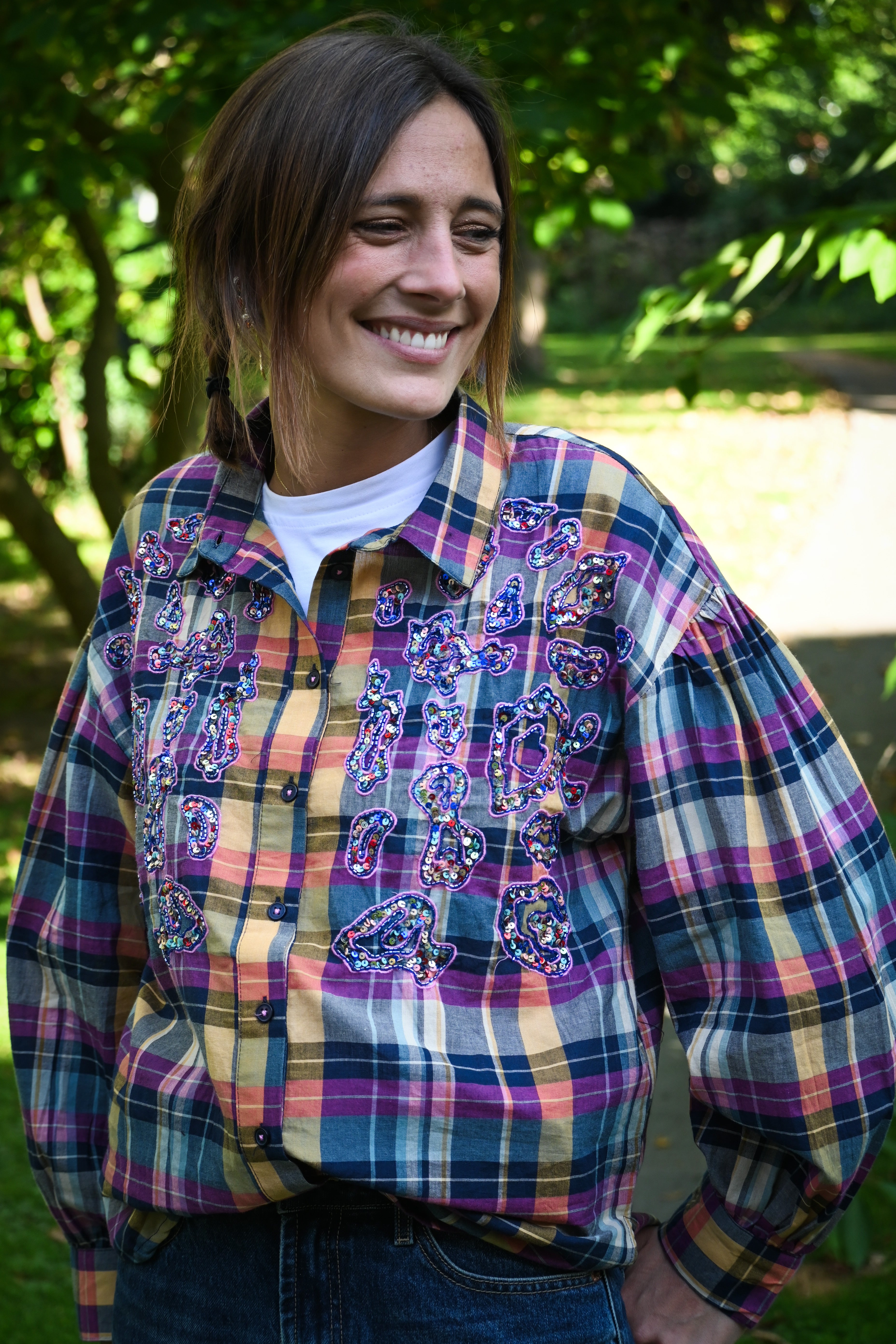 Chemise à carreaux. Manches longues et reprises aux poignets. Motifs à sequins à l'avant. Cette chemise est disponible seulement en taille unique et s'adapte de la taille S à la taille L.