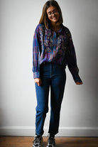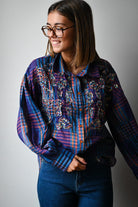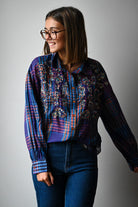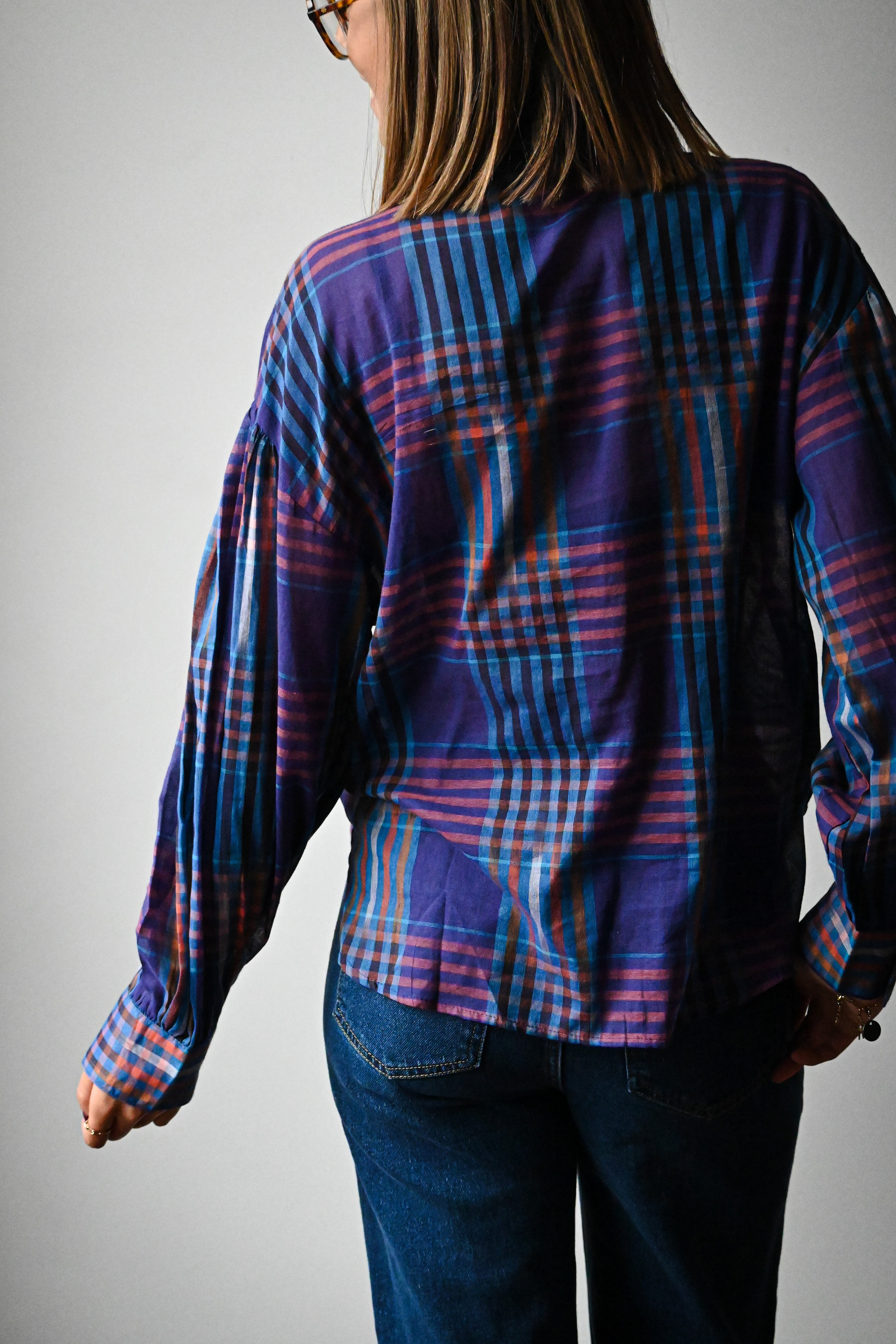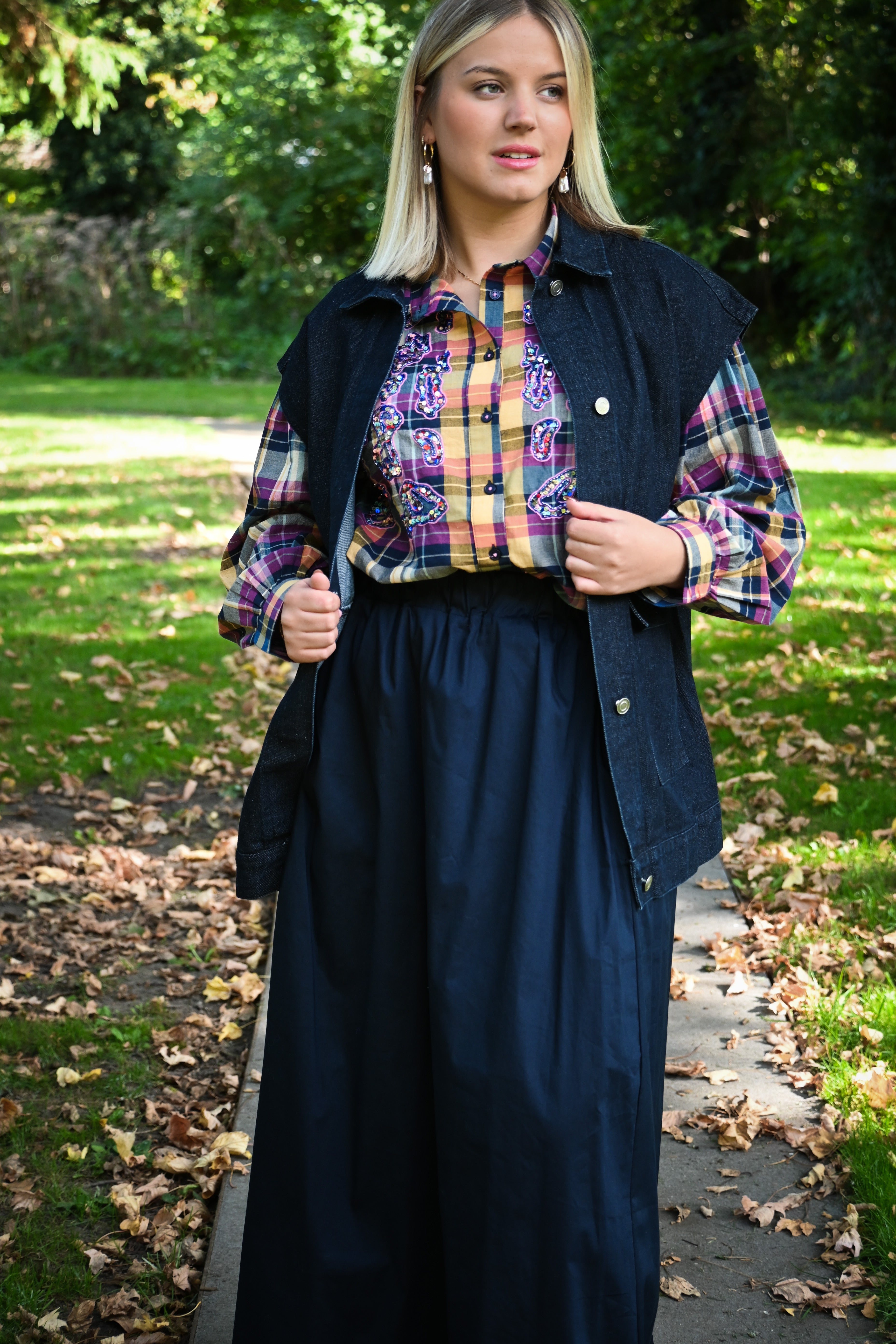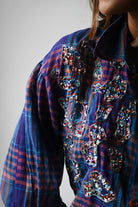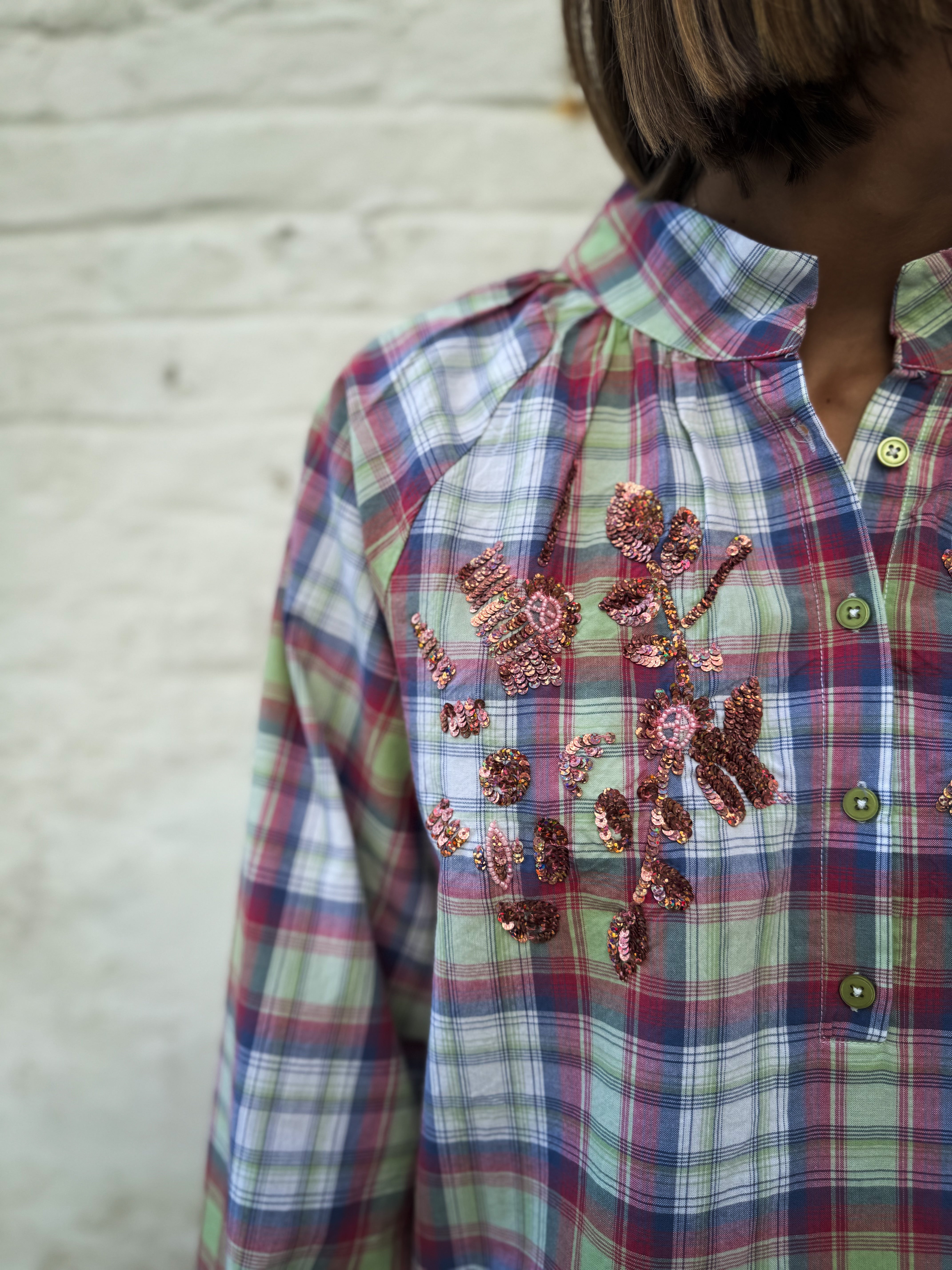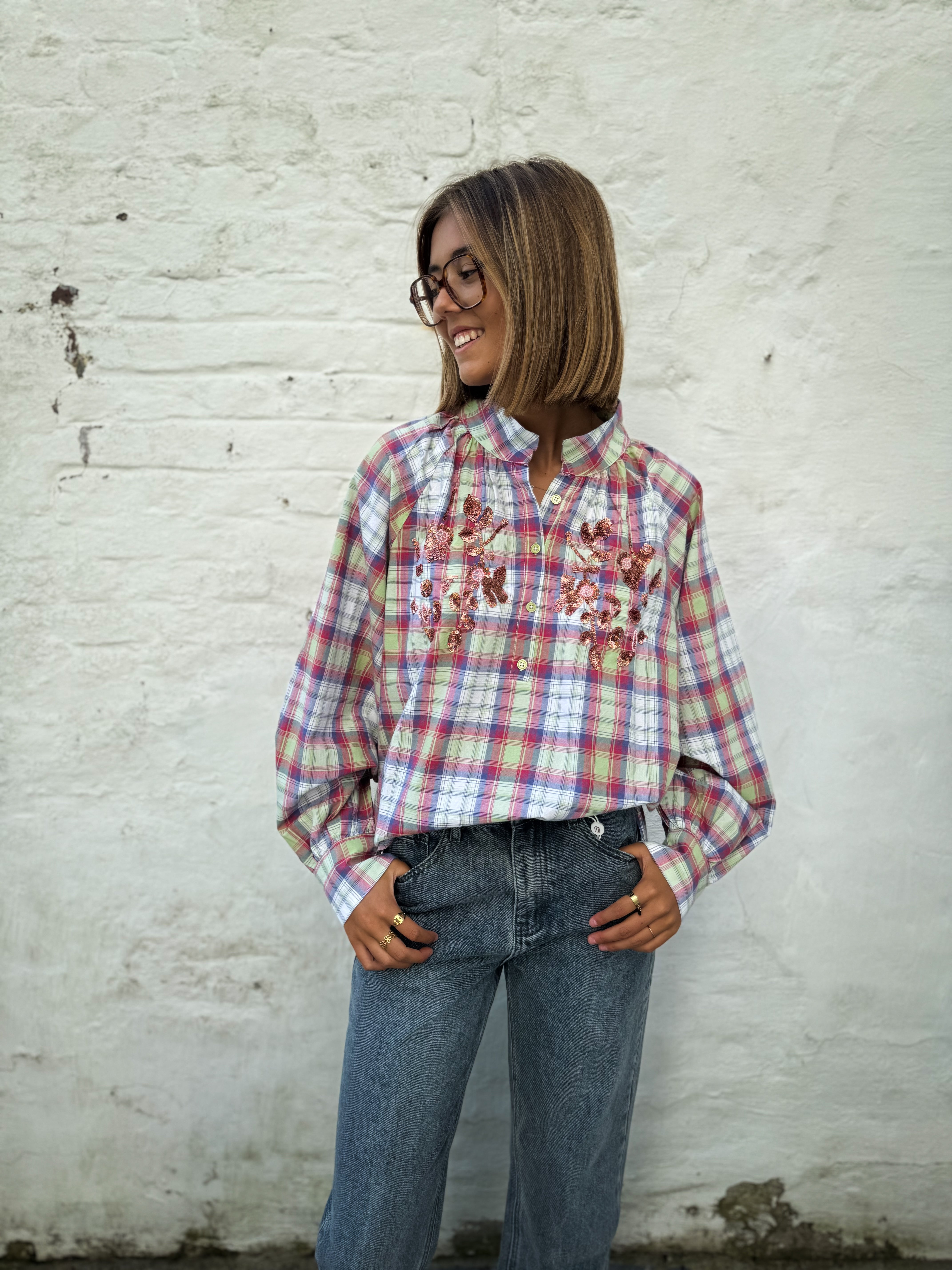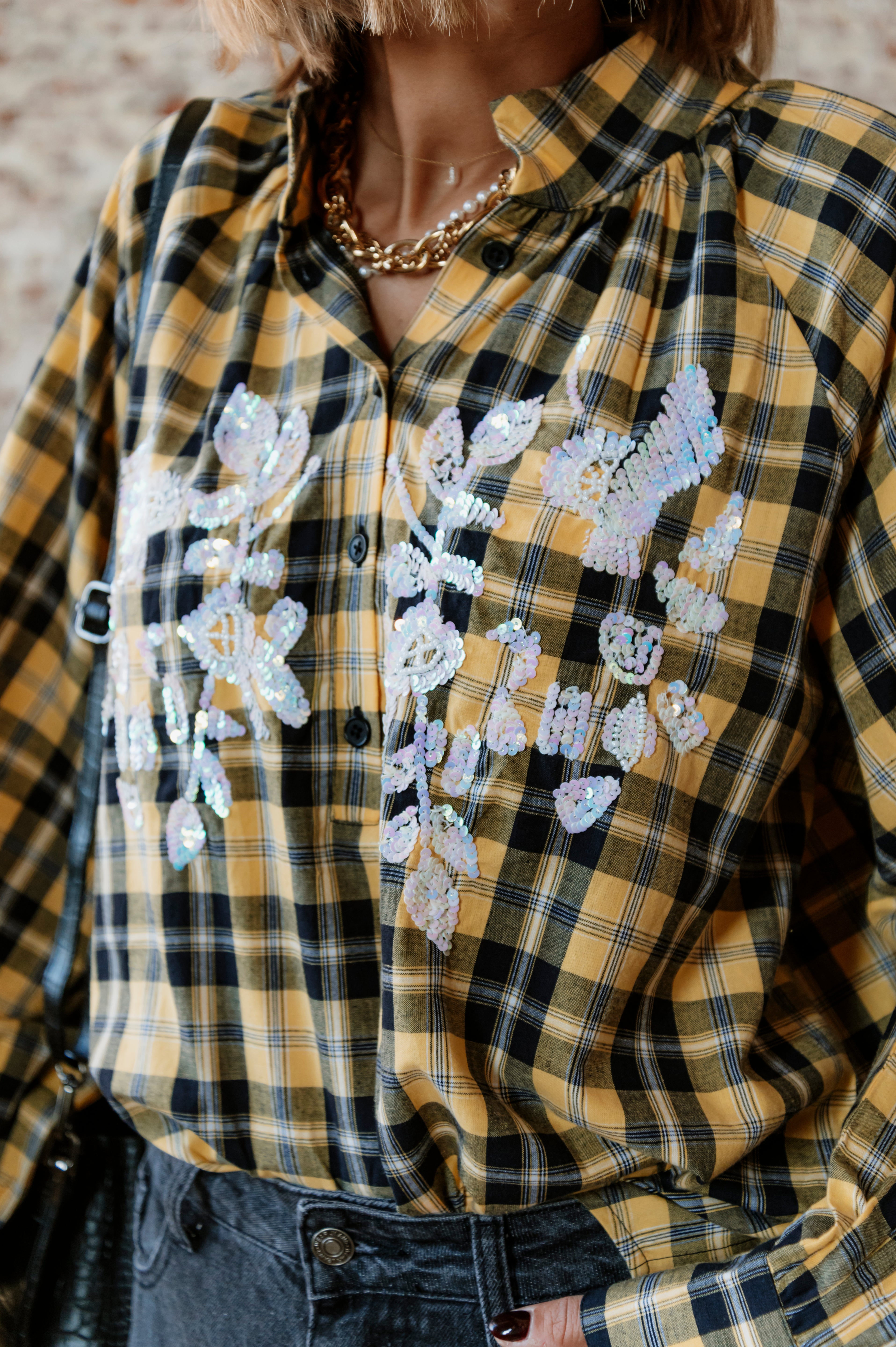 Chemise à carreaux. Manches longues et reprises aux poignets. Motifs à sequins à l'avant. Cette chemise est disponible seulement en taille unique et s'adapte de la taille S à la taille L.