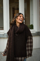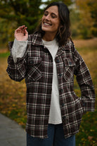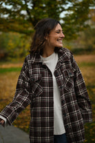Découvrez cette chemise à carreaux intemporelle aux teintes chaleureuses de chocolat et bordeaux. Dotée de boutons classiques et d'une coupe généreuse en taille unique, elle s'adapte à la plupart des silhouettes pour un confort optimal. Un basique polyvalent qui se marie facilement avec vos pièces préférées pour créer des looks variés et sophistiqués.