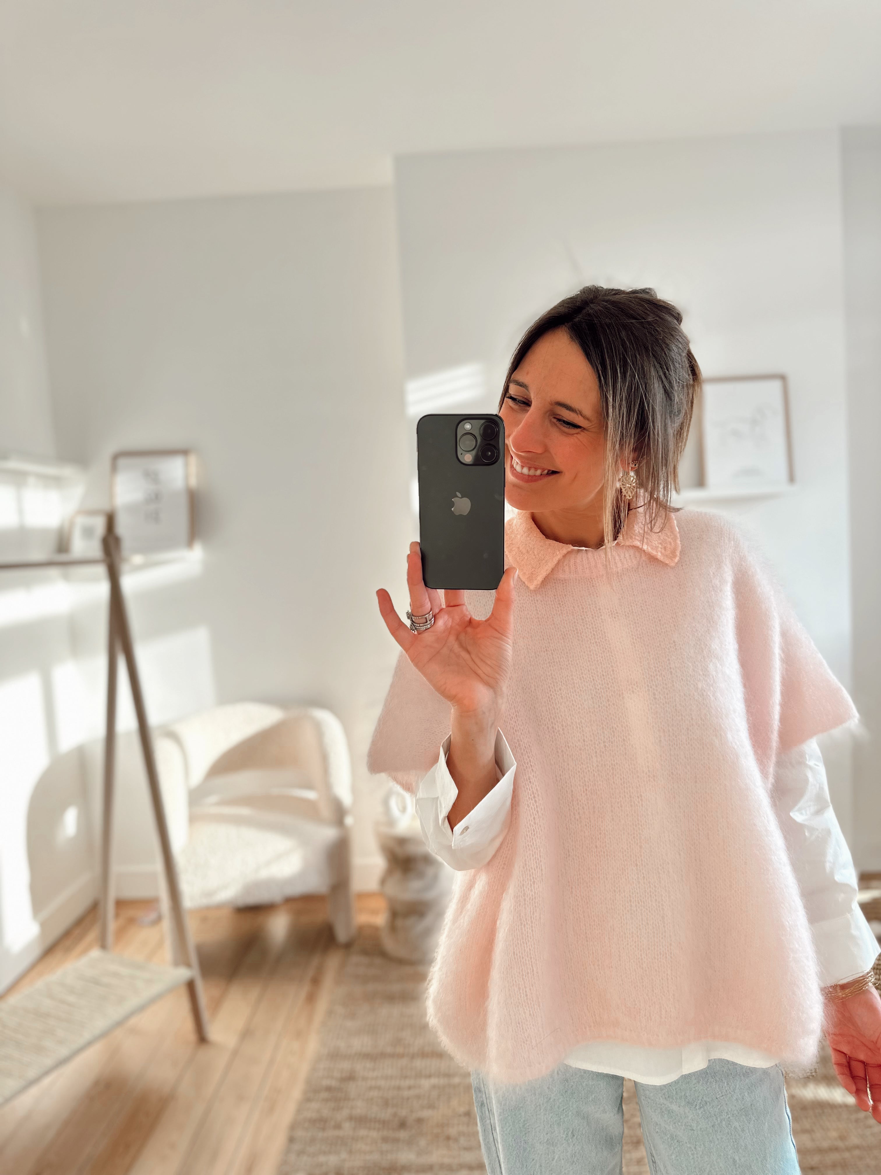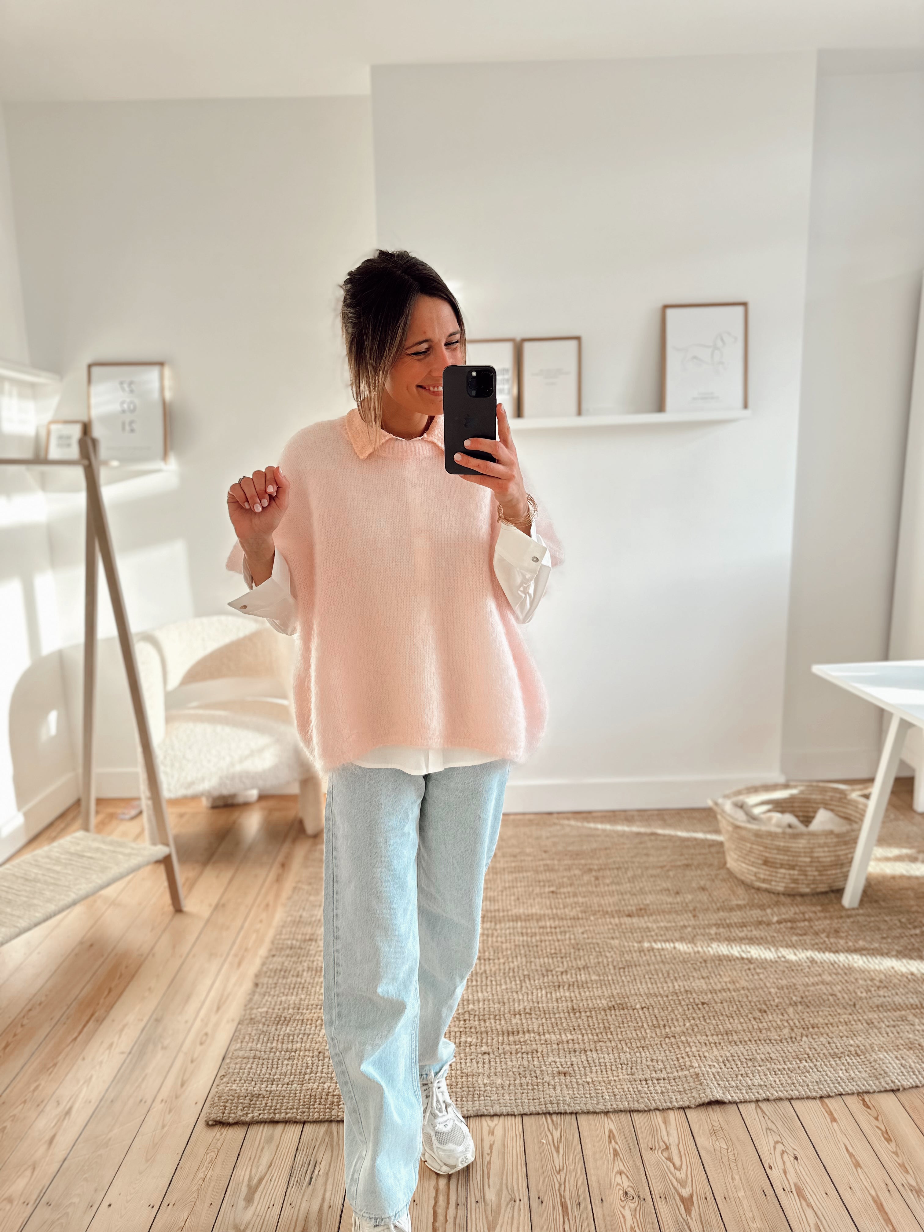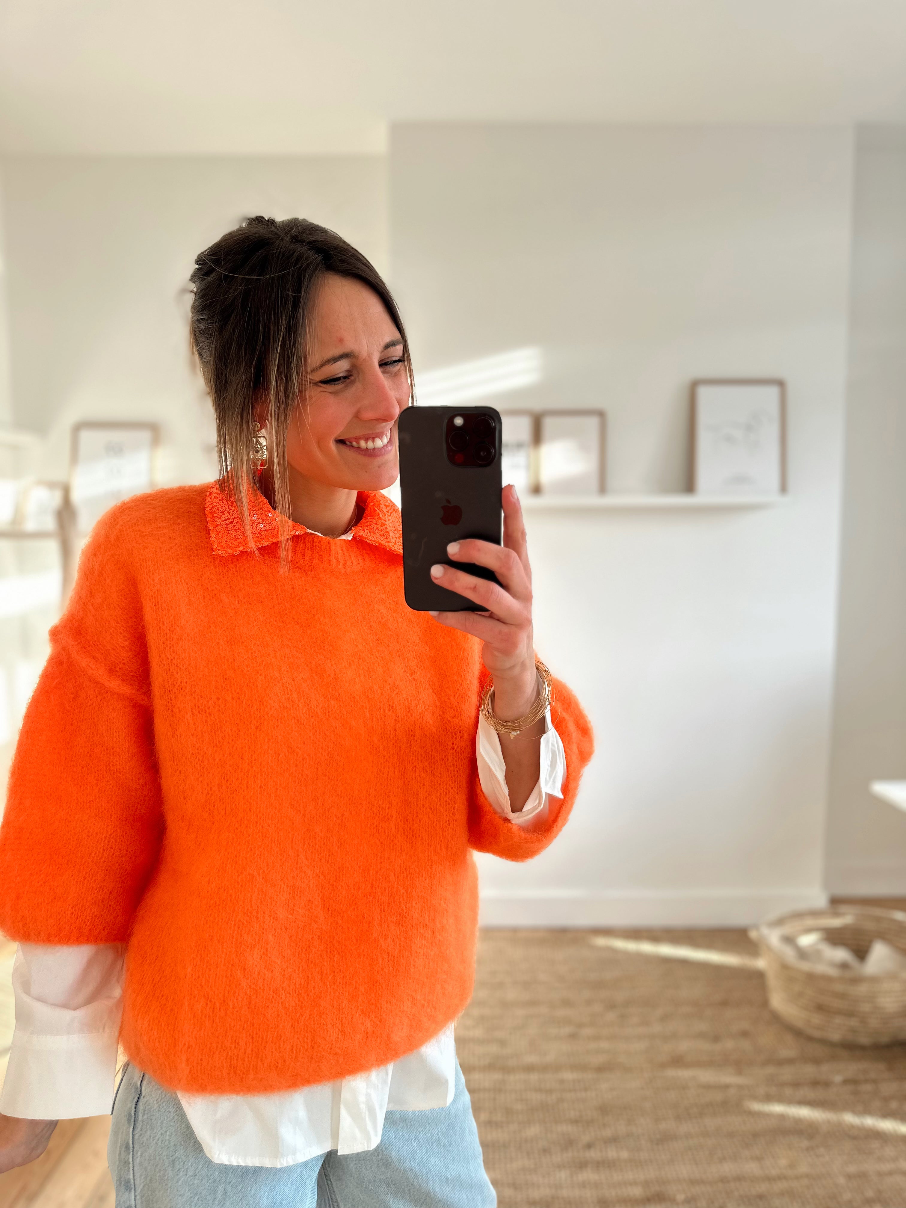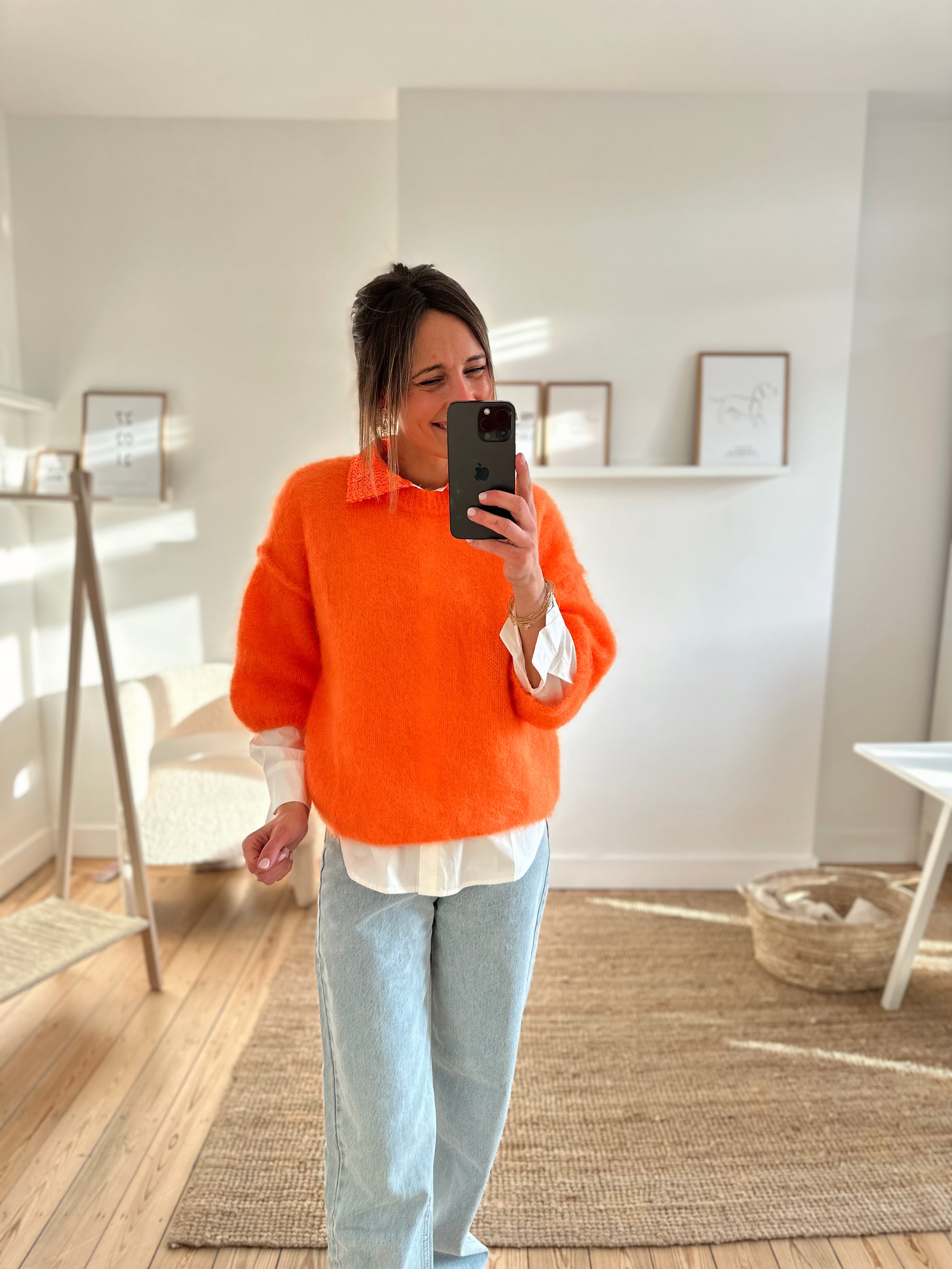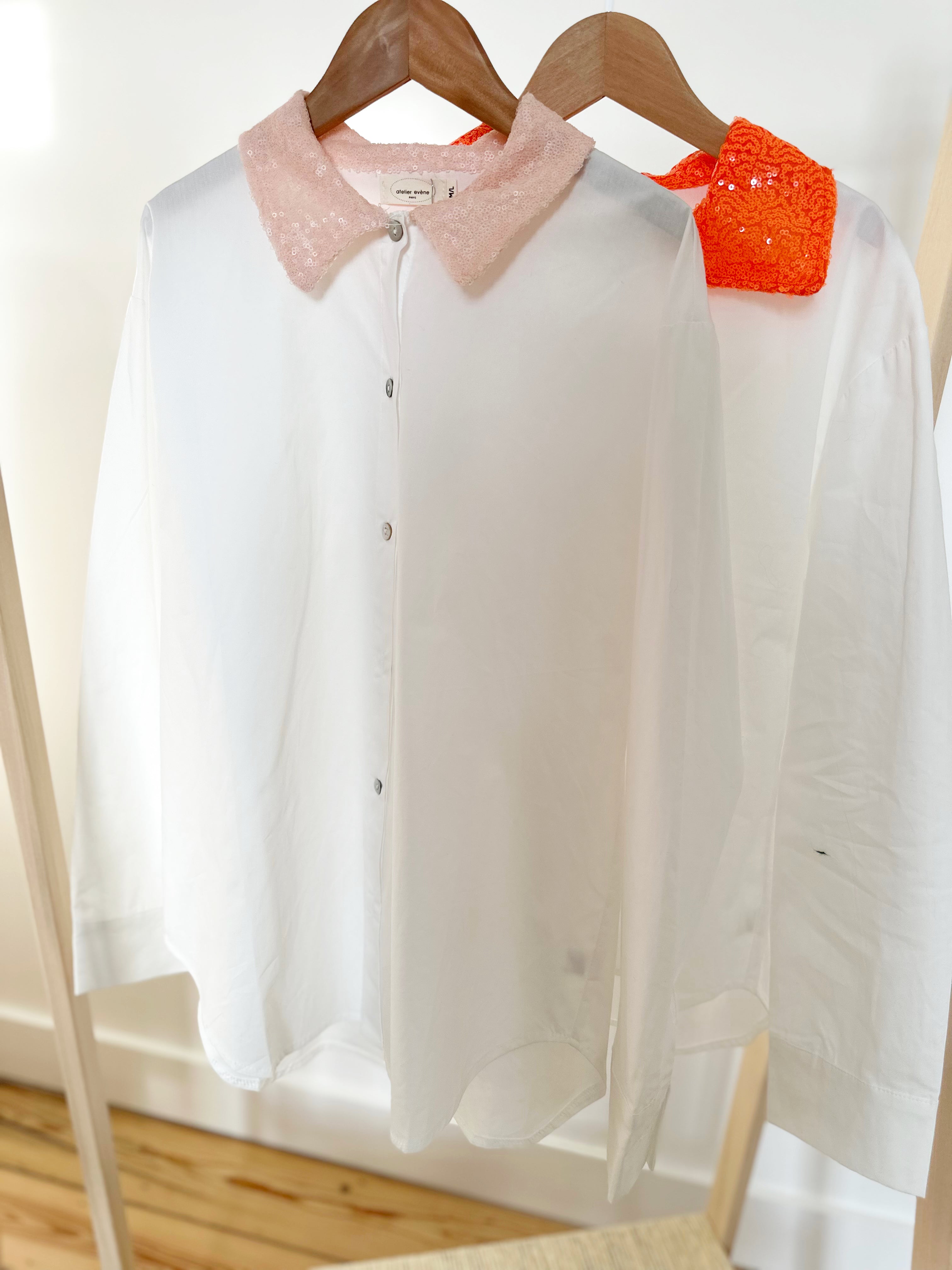 Chemise blanche, avec le col en sequins disponibles en deux couleurs : orange et rose pâle. Cette chemise est disponible en S/M ou en M/L.