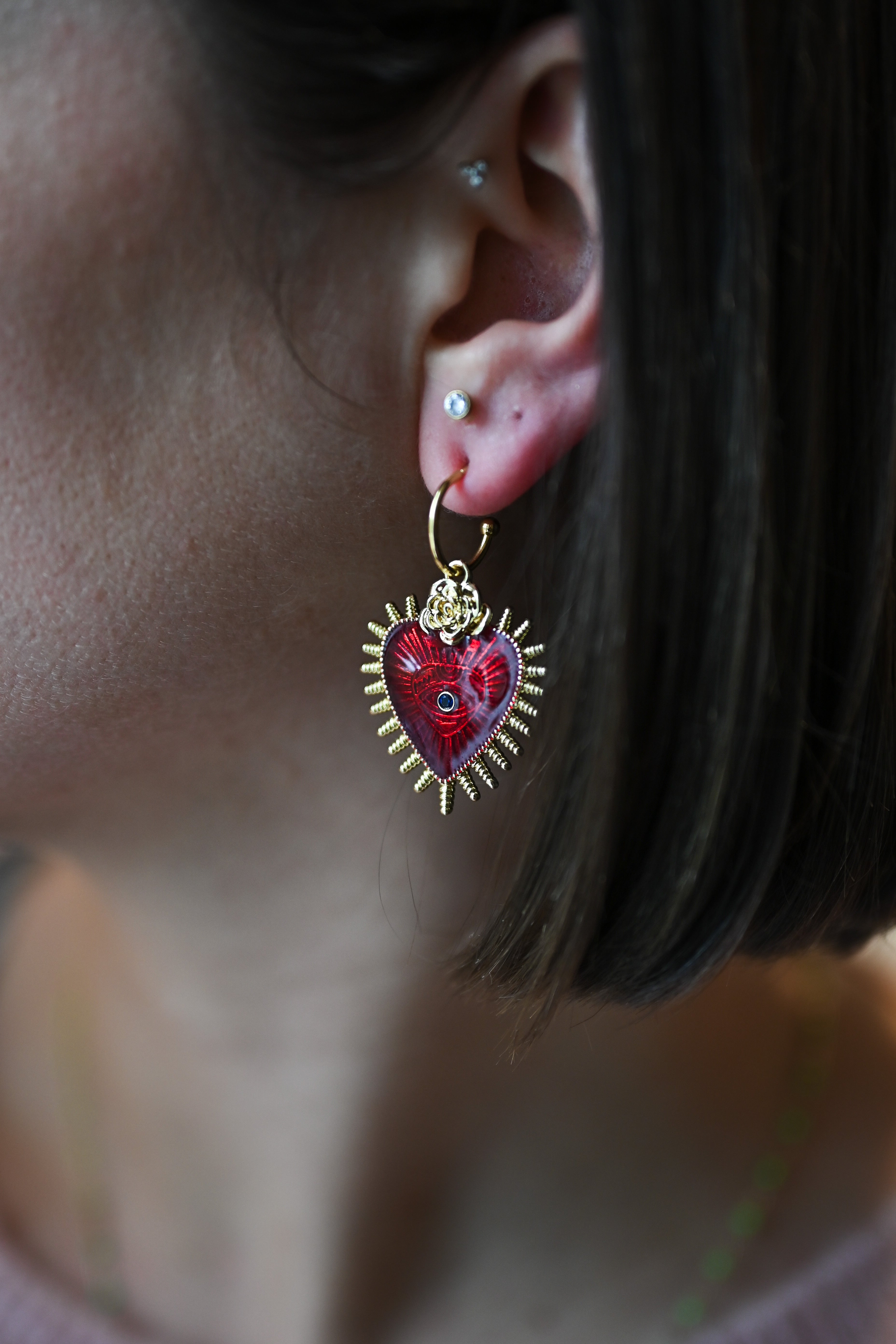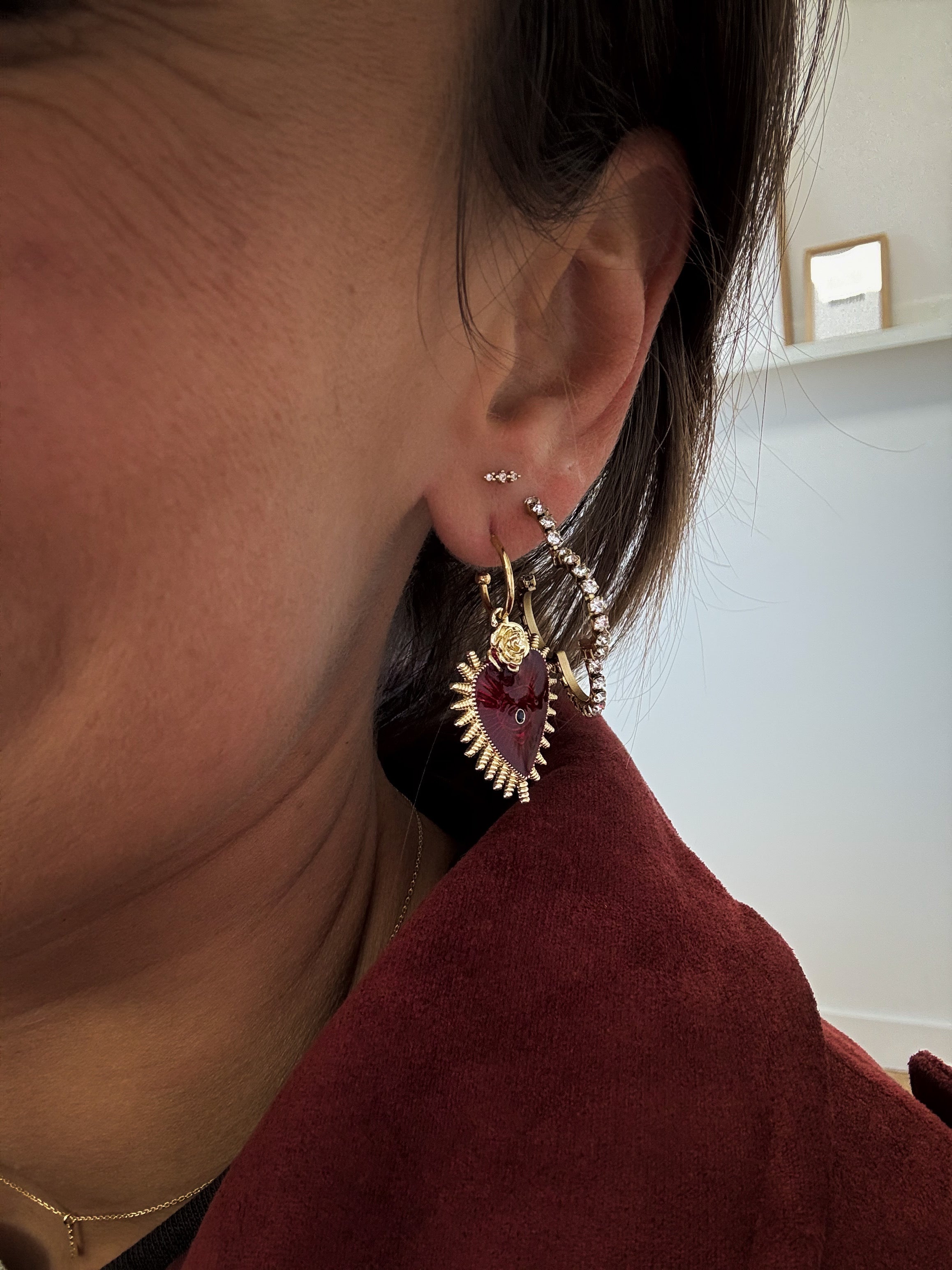 Boucle disponible à l'unité, composée d’un petit anneau agrémenté d’un pendentif en forme de cœur bordeaux et d’une fleur dorée, fabriquée en acier inoxydable.
