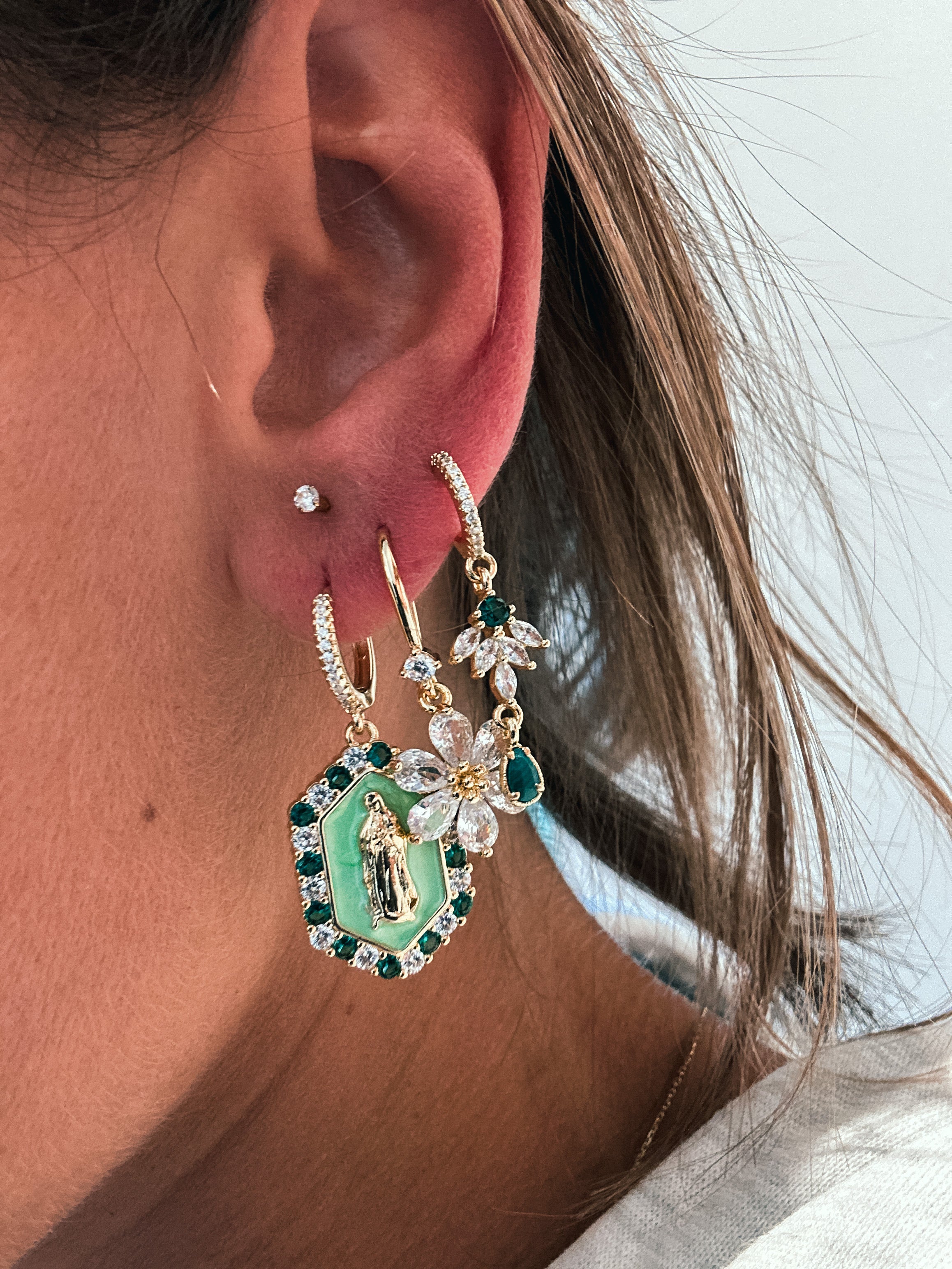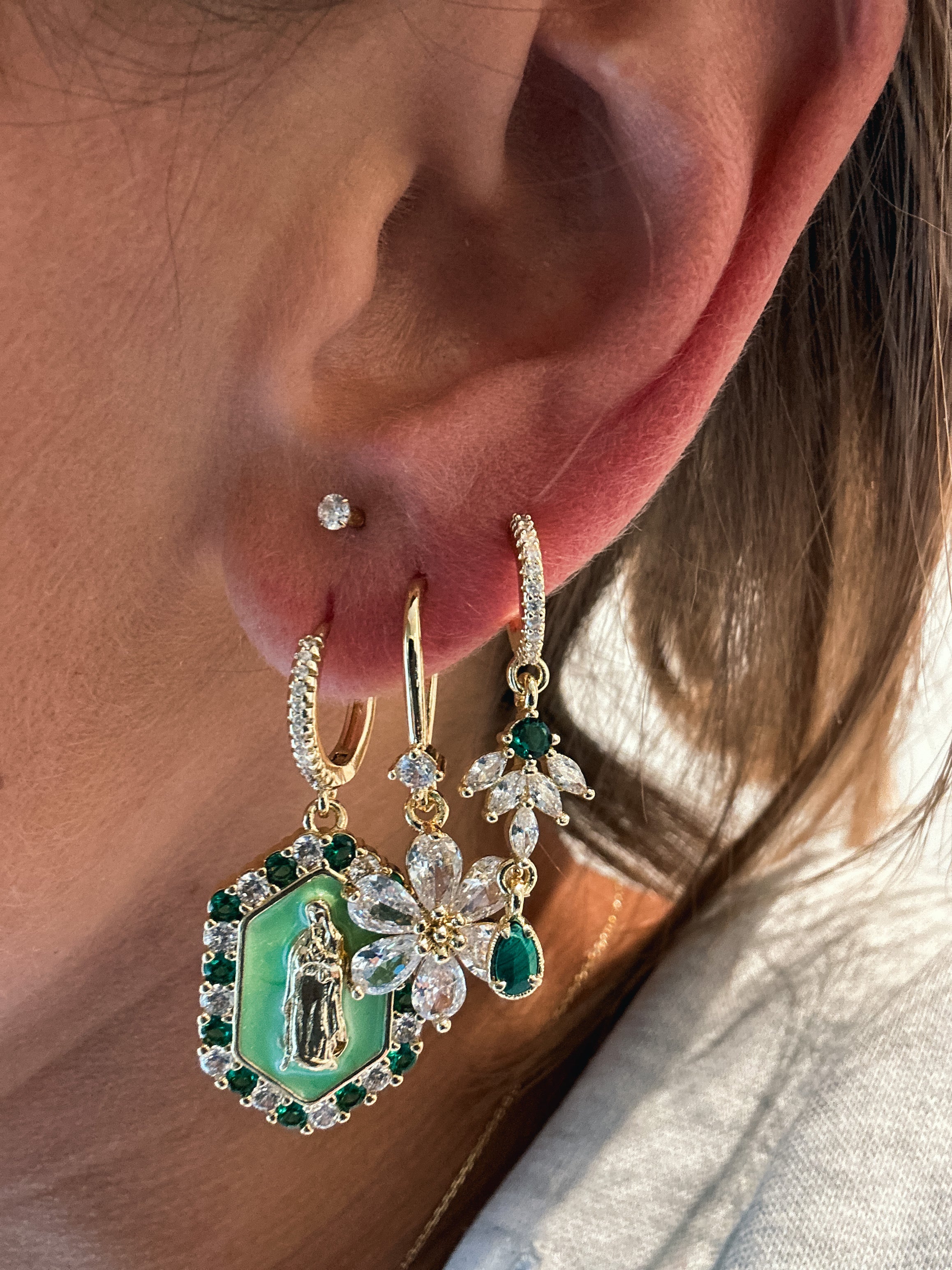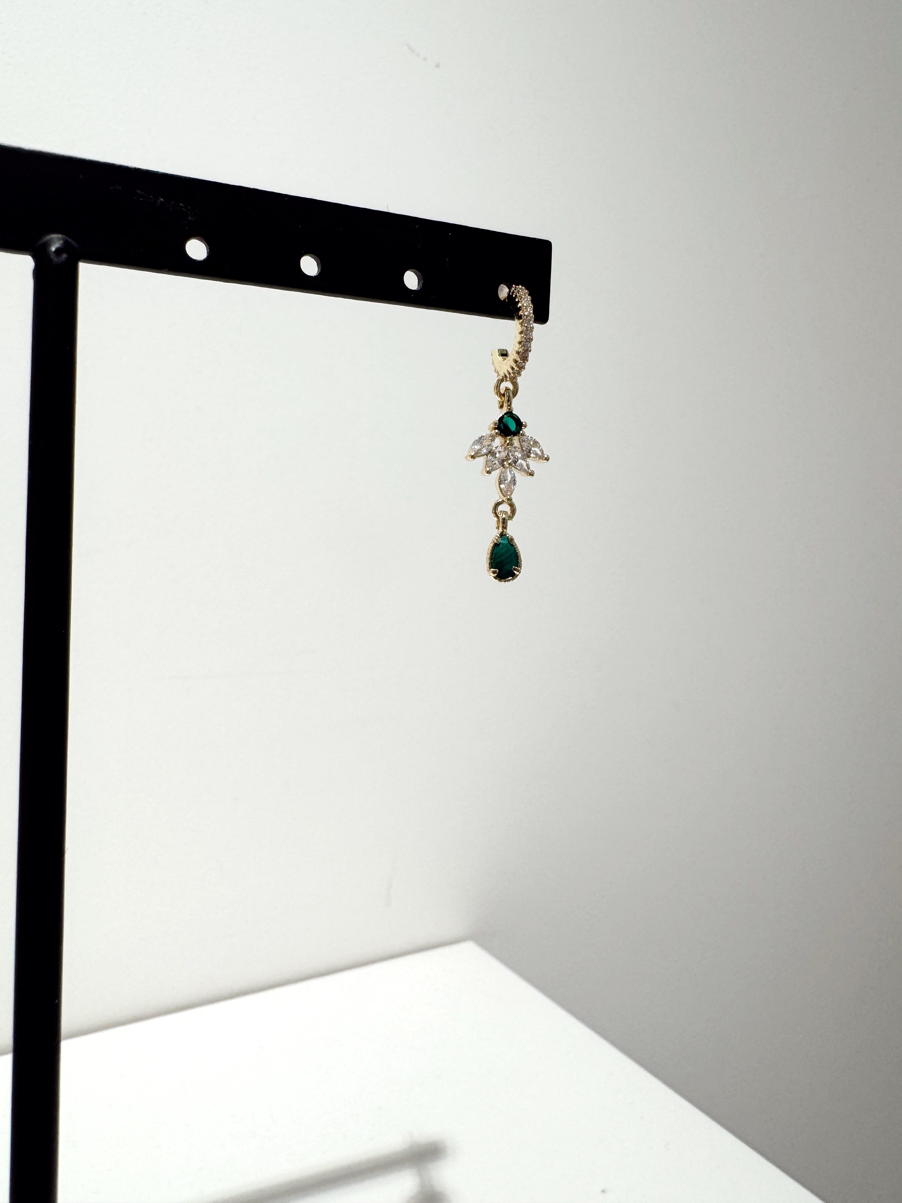 A : Ces boucles d'oreilles présentent des anneaux embellis de strass, avec une pierre pendante d’un vert éclatant qui attire le regard.