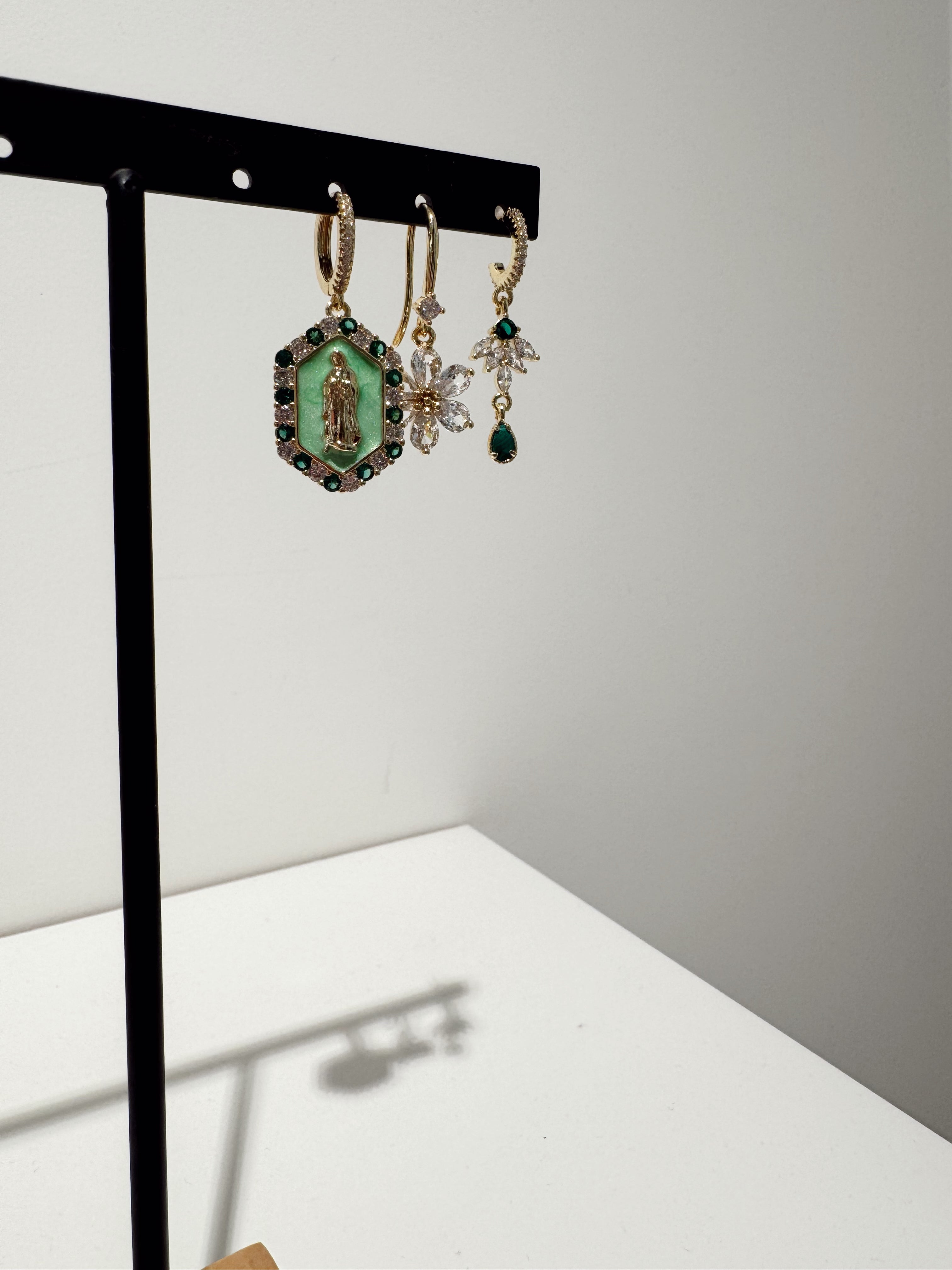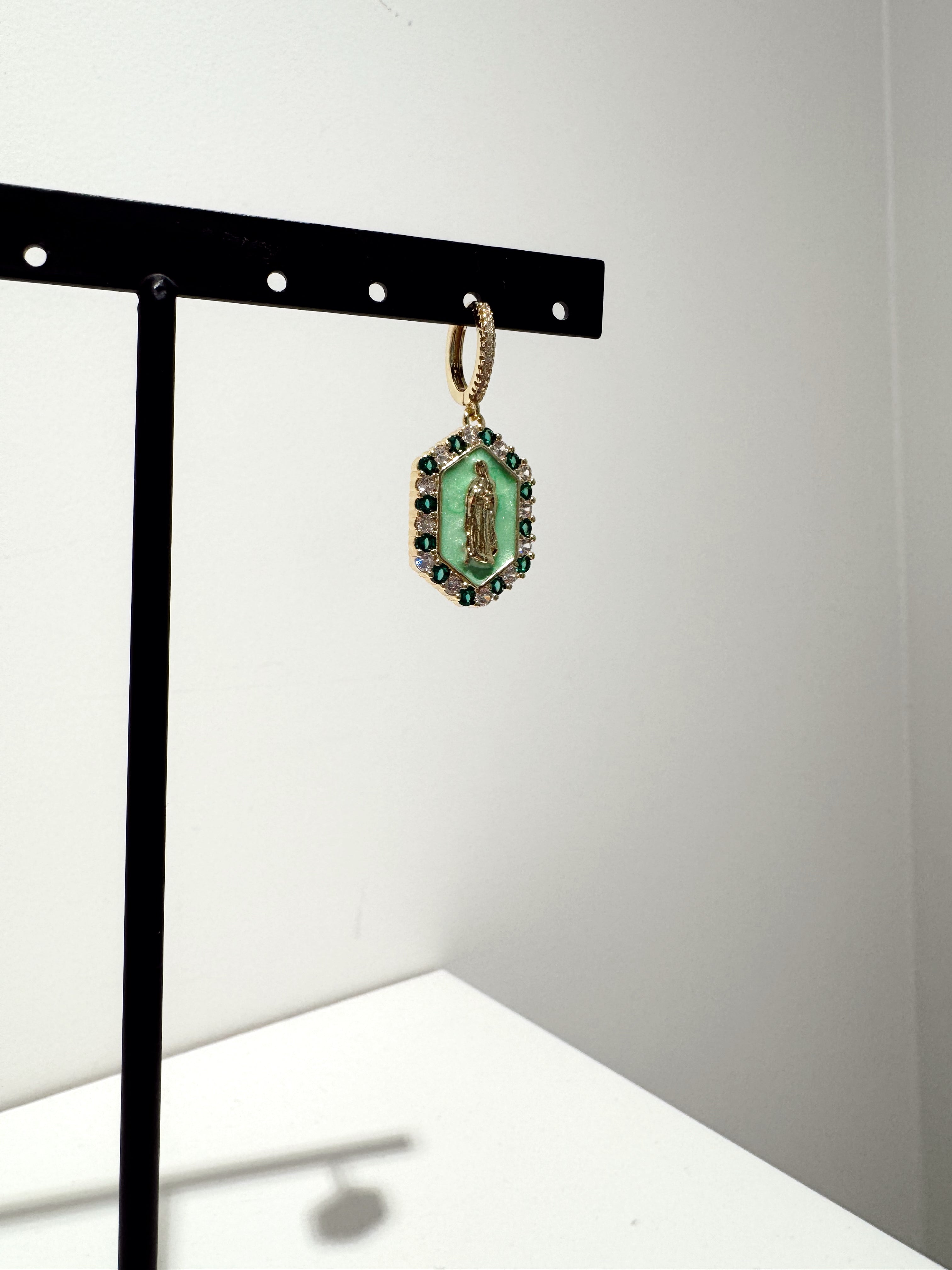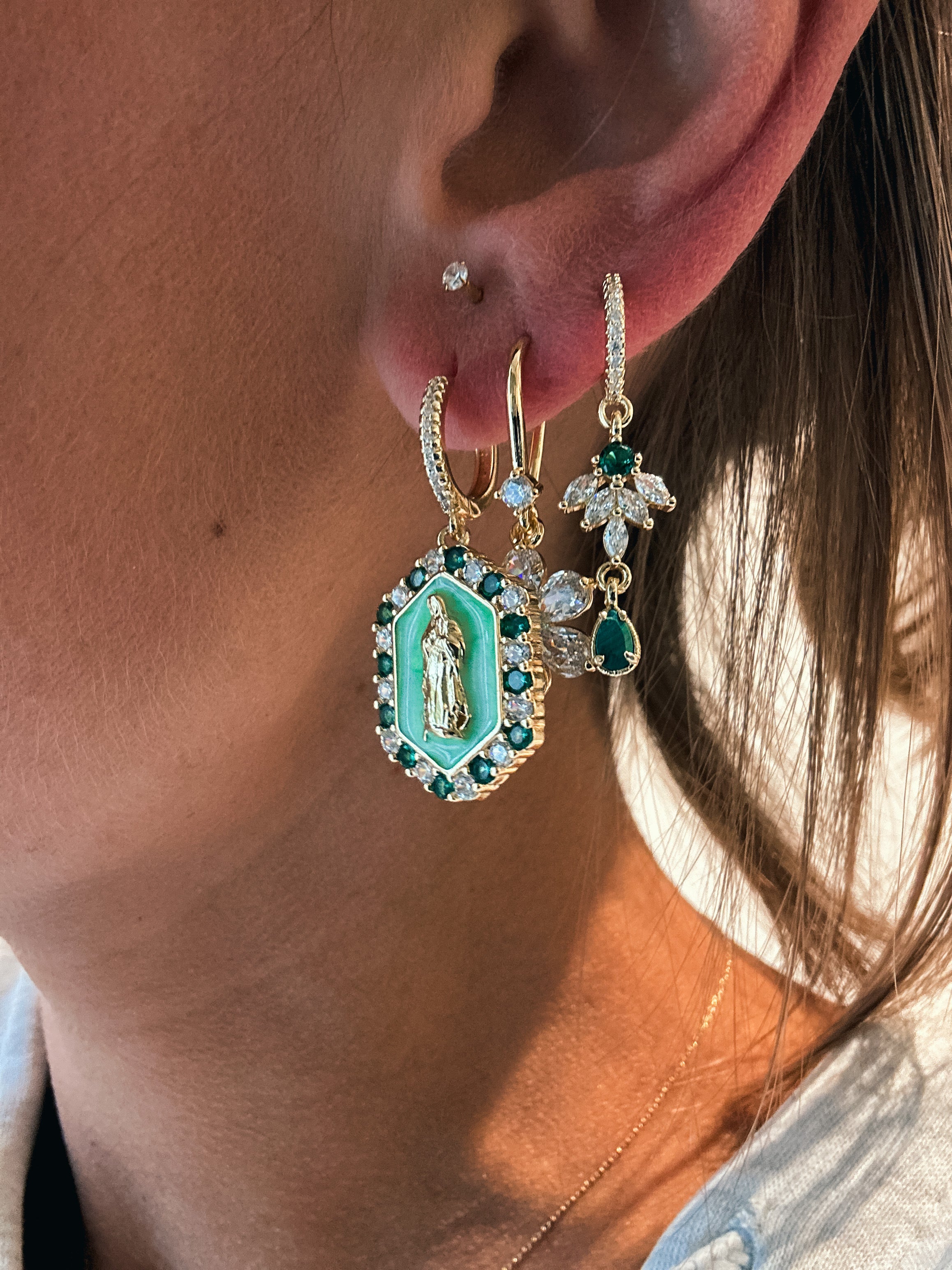 A : Ces boucles d'oreilles présentent des anneaux embellis de strass, avec une pierre pendante d’un vert éclatant qui attire le regard.