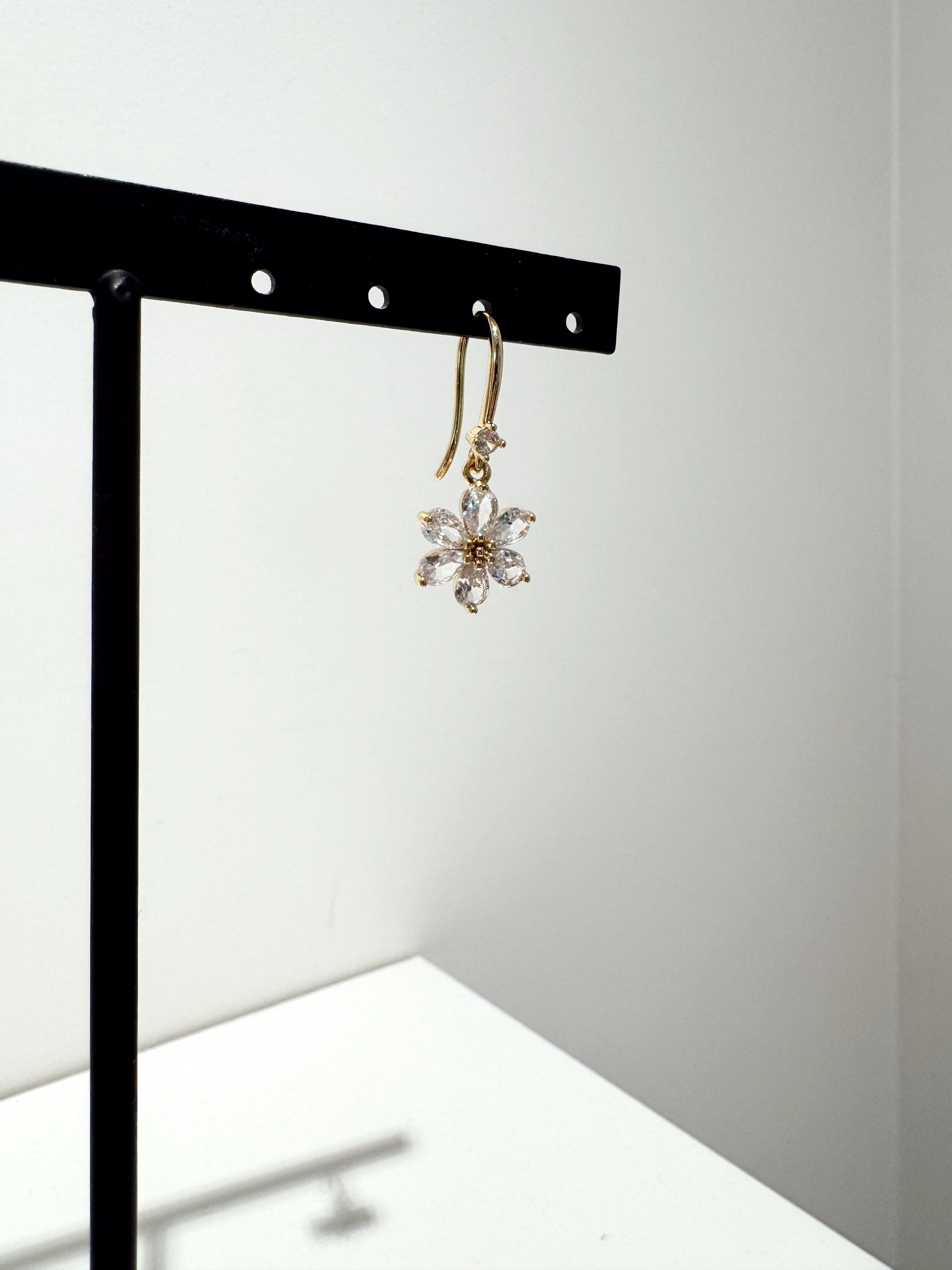B : Ces boucles d'oreilles pendantes se distinguent par leurs anneaux délicats ornés d'une élégante fleur, apportant une touche féminine et raffinée à votre style.