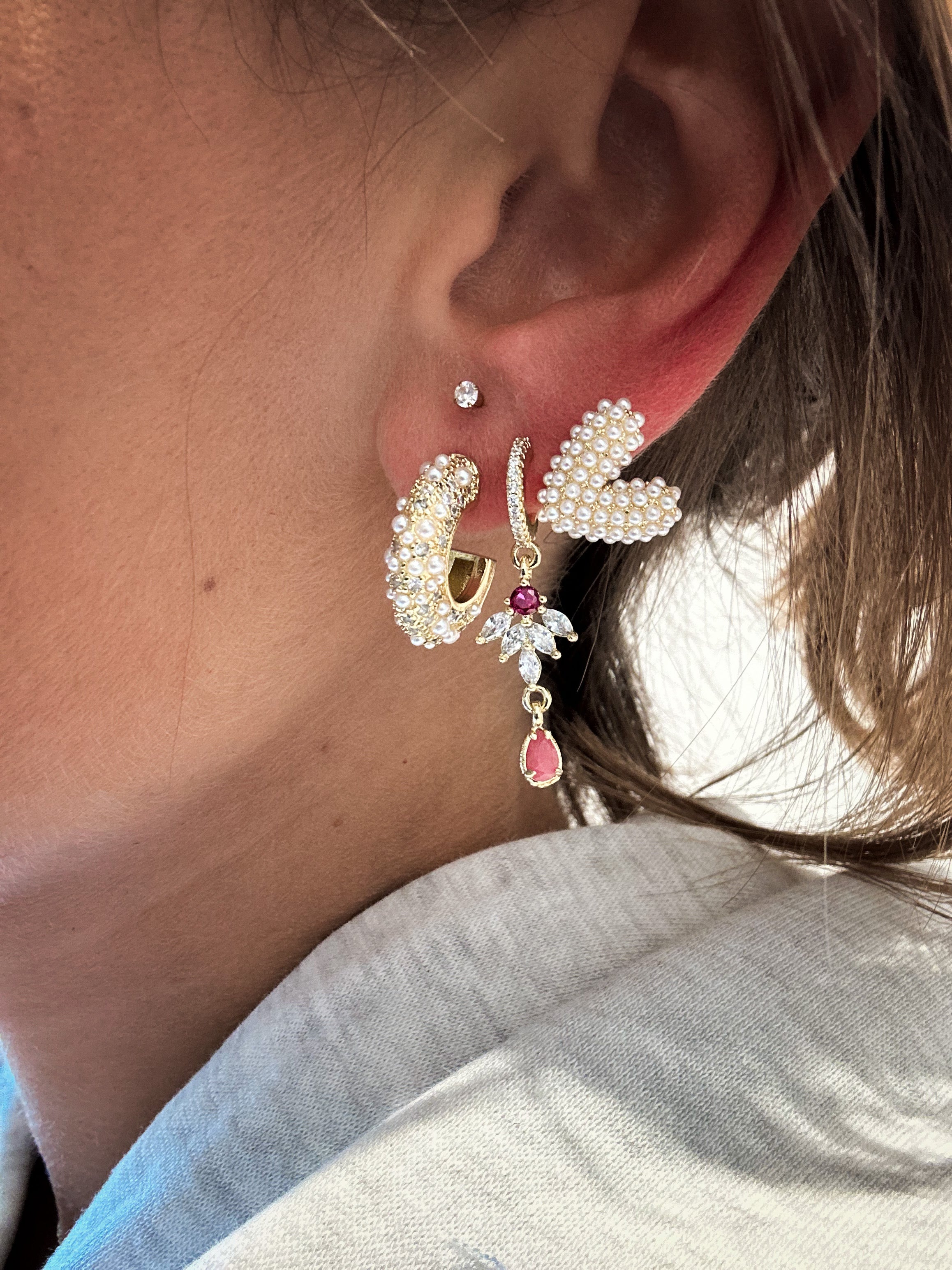 C : Puce d’oreille en forme de cœur doré, embellie de perles blanches aux reflets nacrés pour une allure délicate et raffinée.