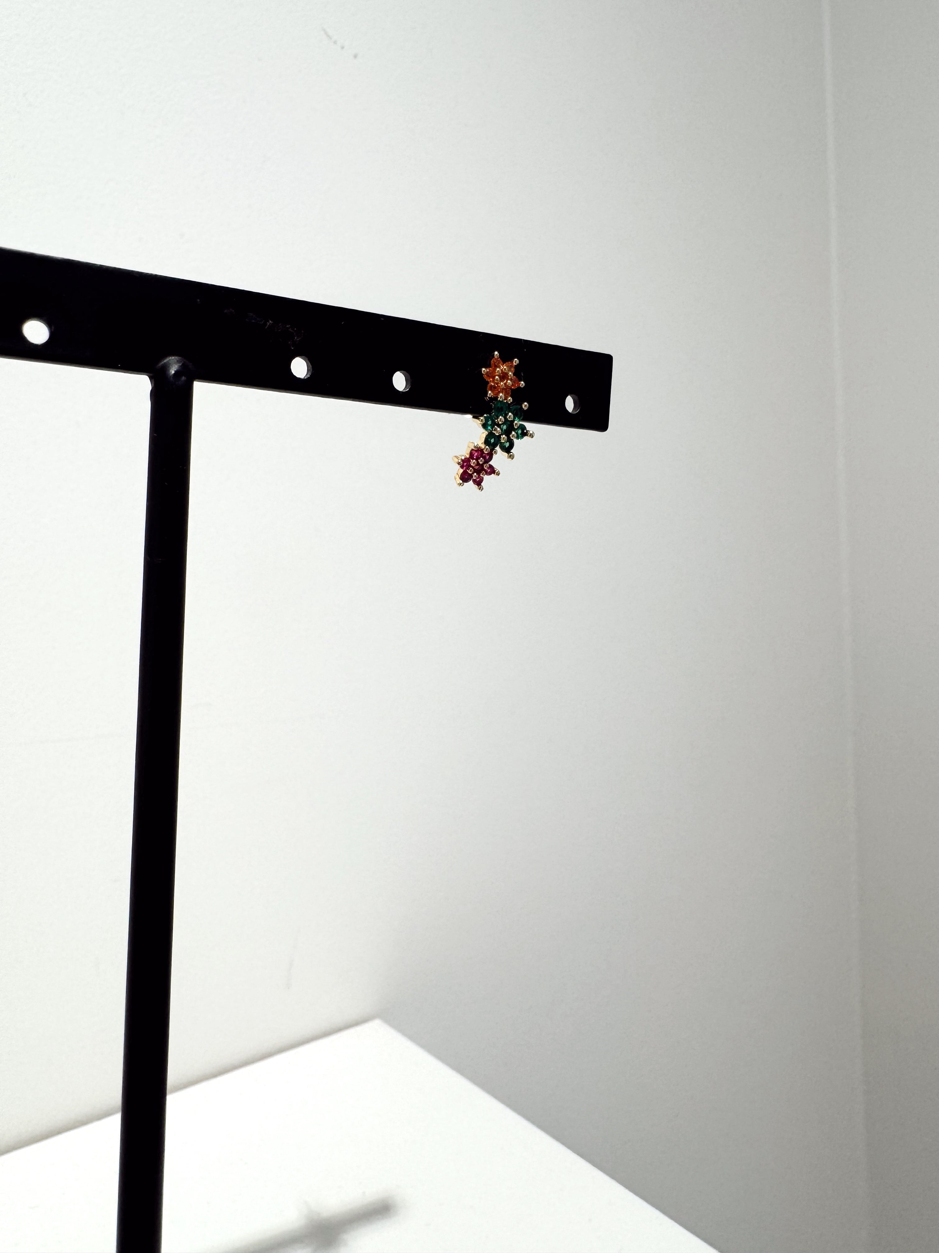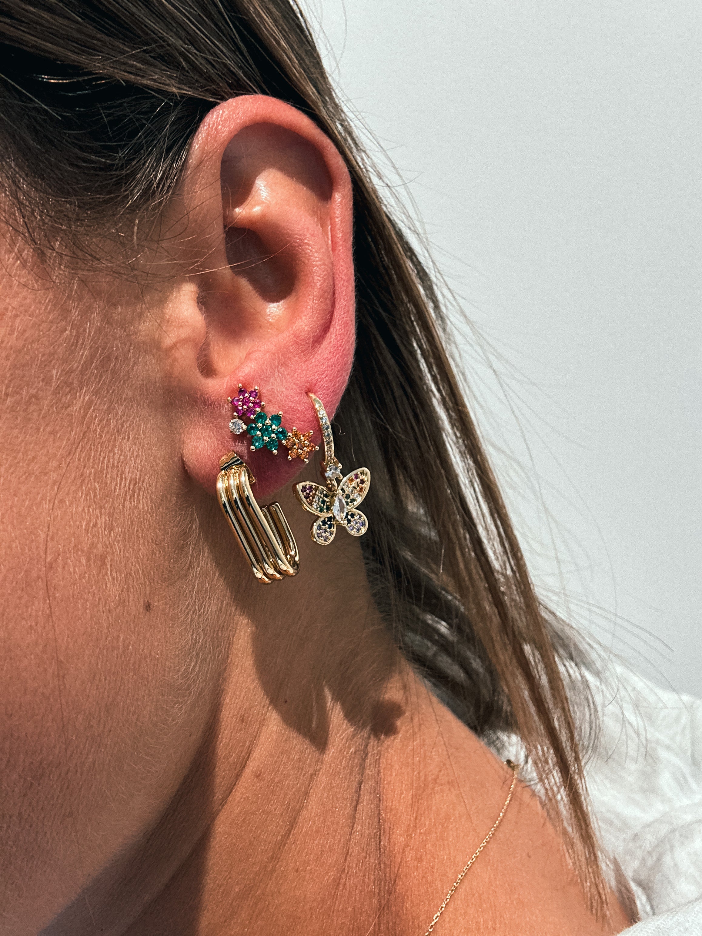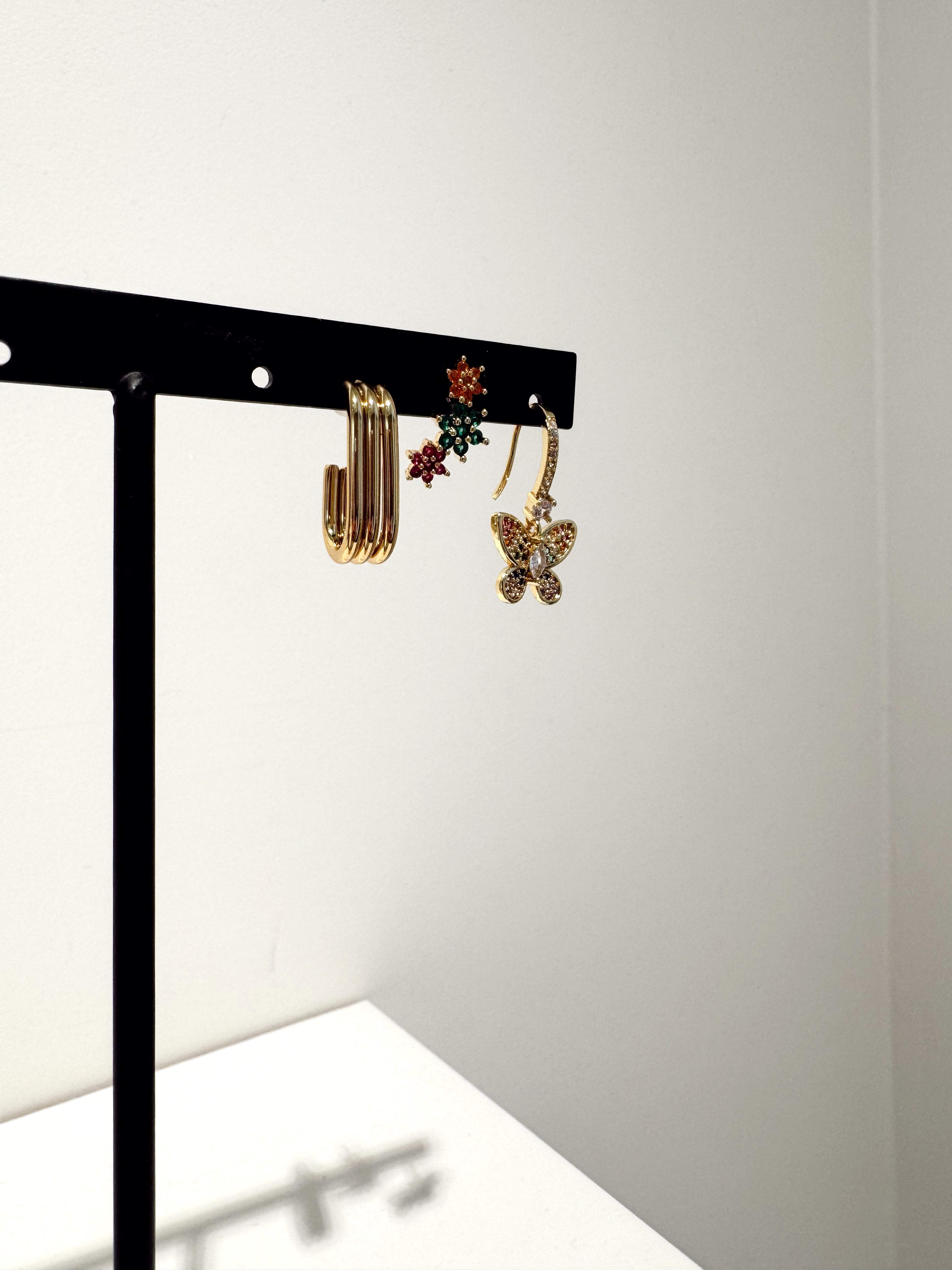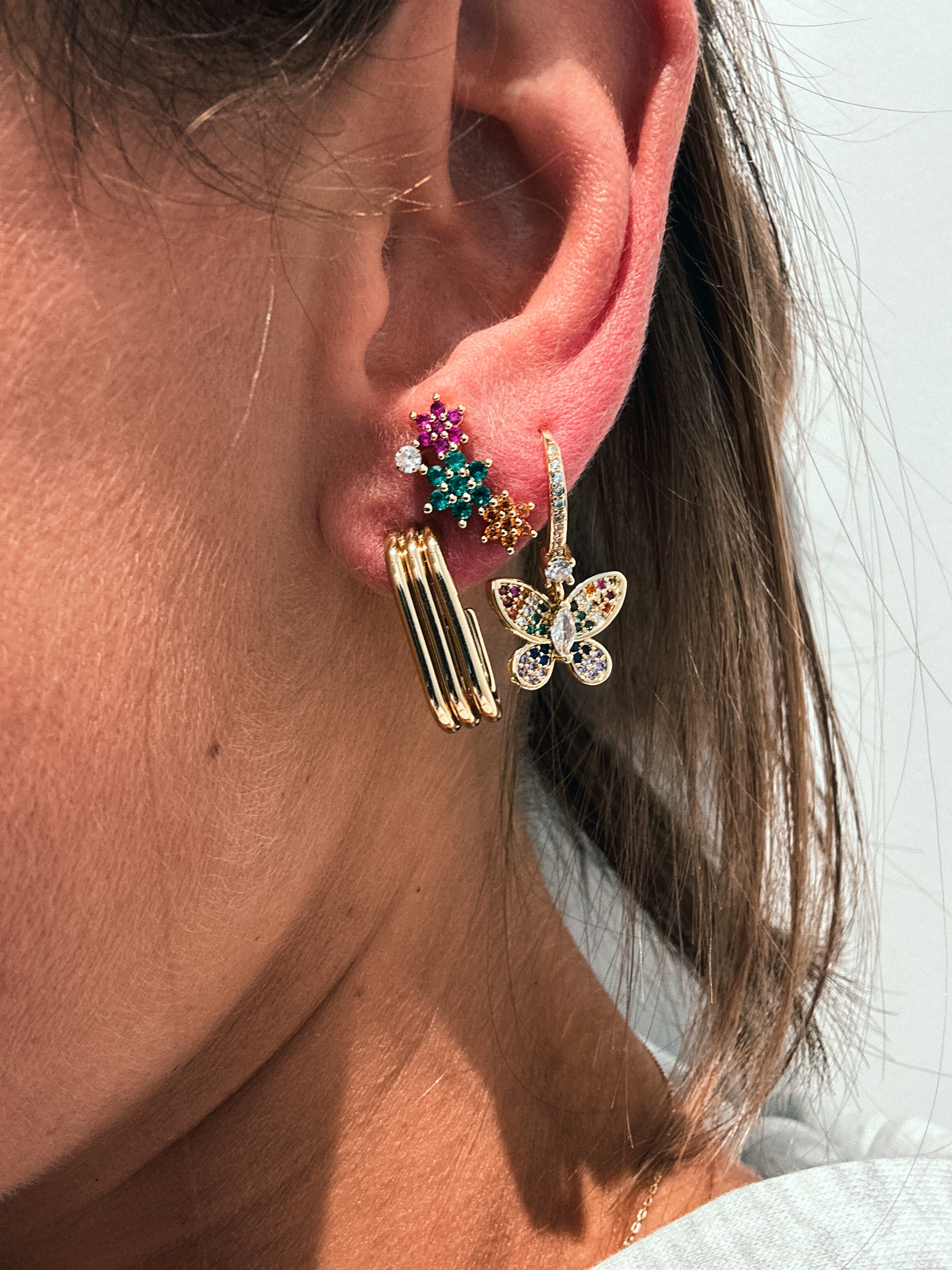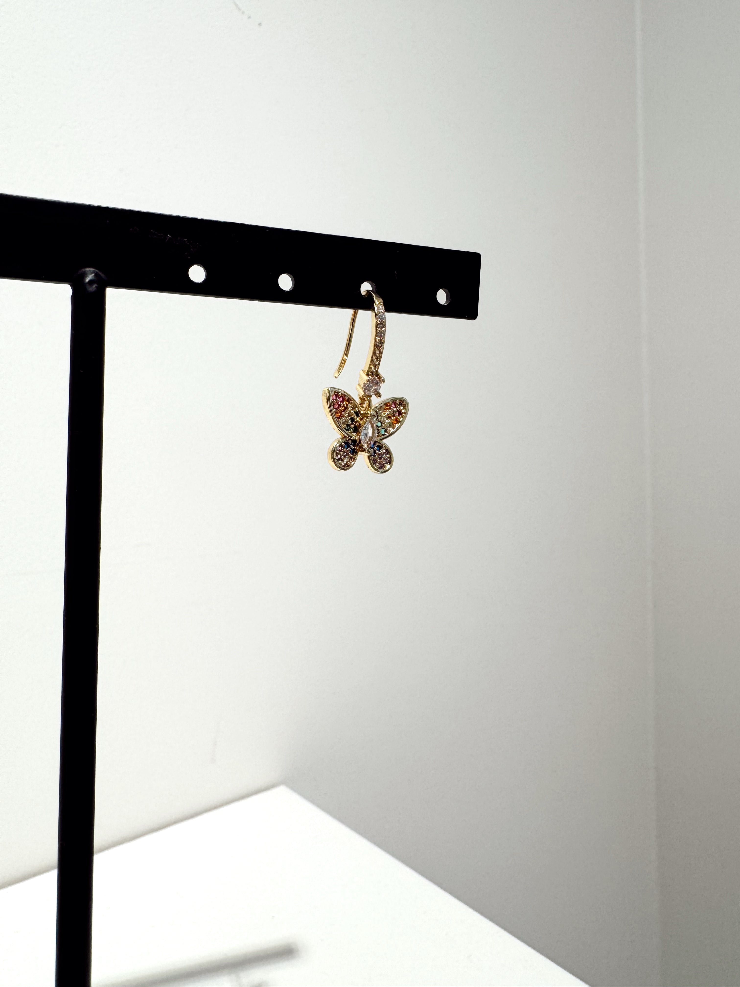 B : Boucles d’oreilles avec anneaux ornés d’un papillon doré et embellis de strass multicolores pour un éclat vibrant et raffiné.