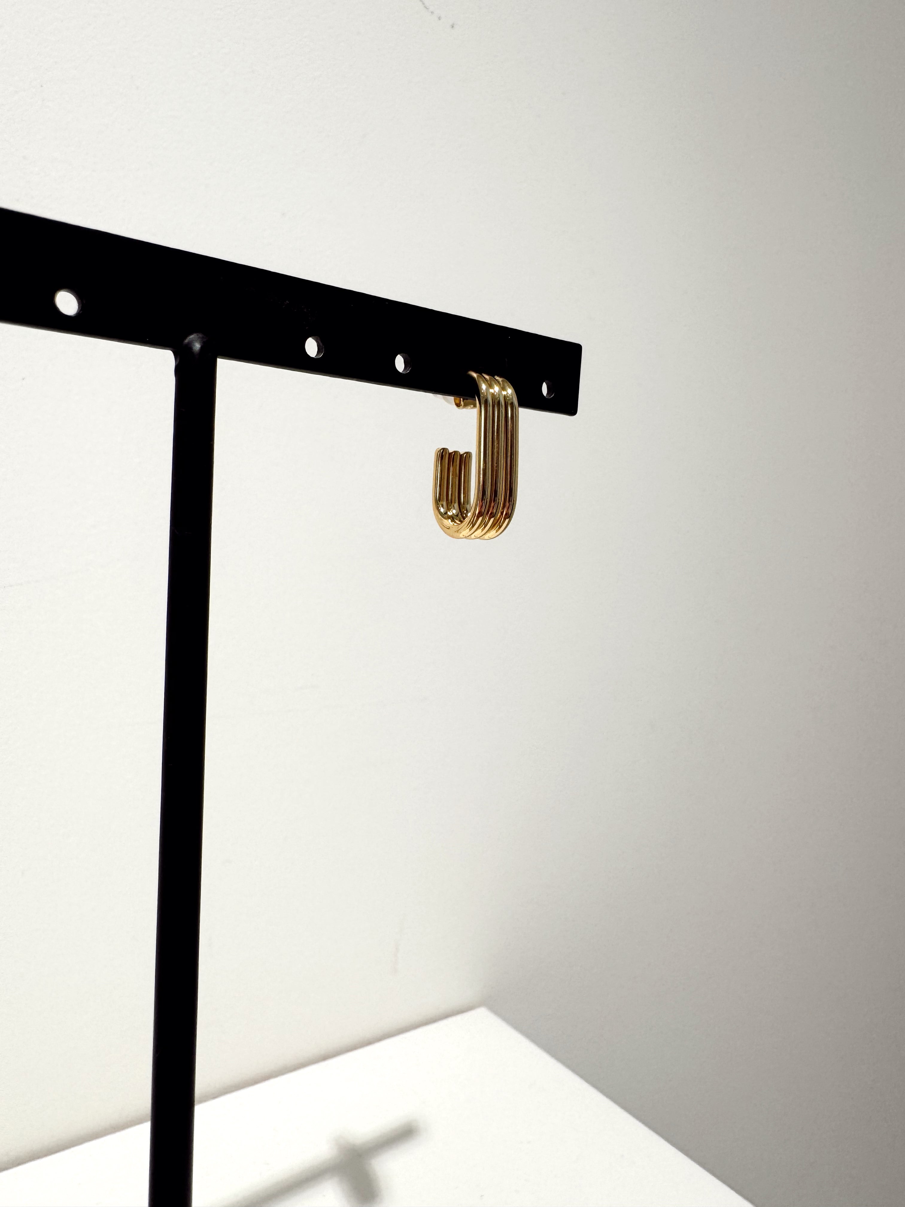 A : Boucle d’oreille puce sans anneau, conçue en forme de U et ornée de trois fines barres dorées pour une touche élégante et moderne.