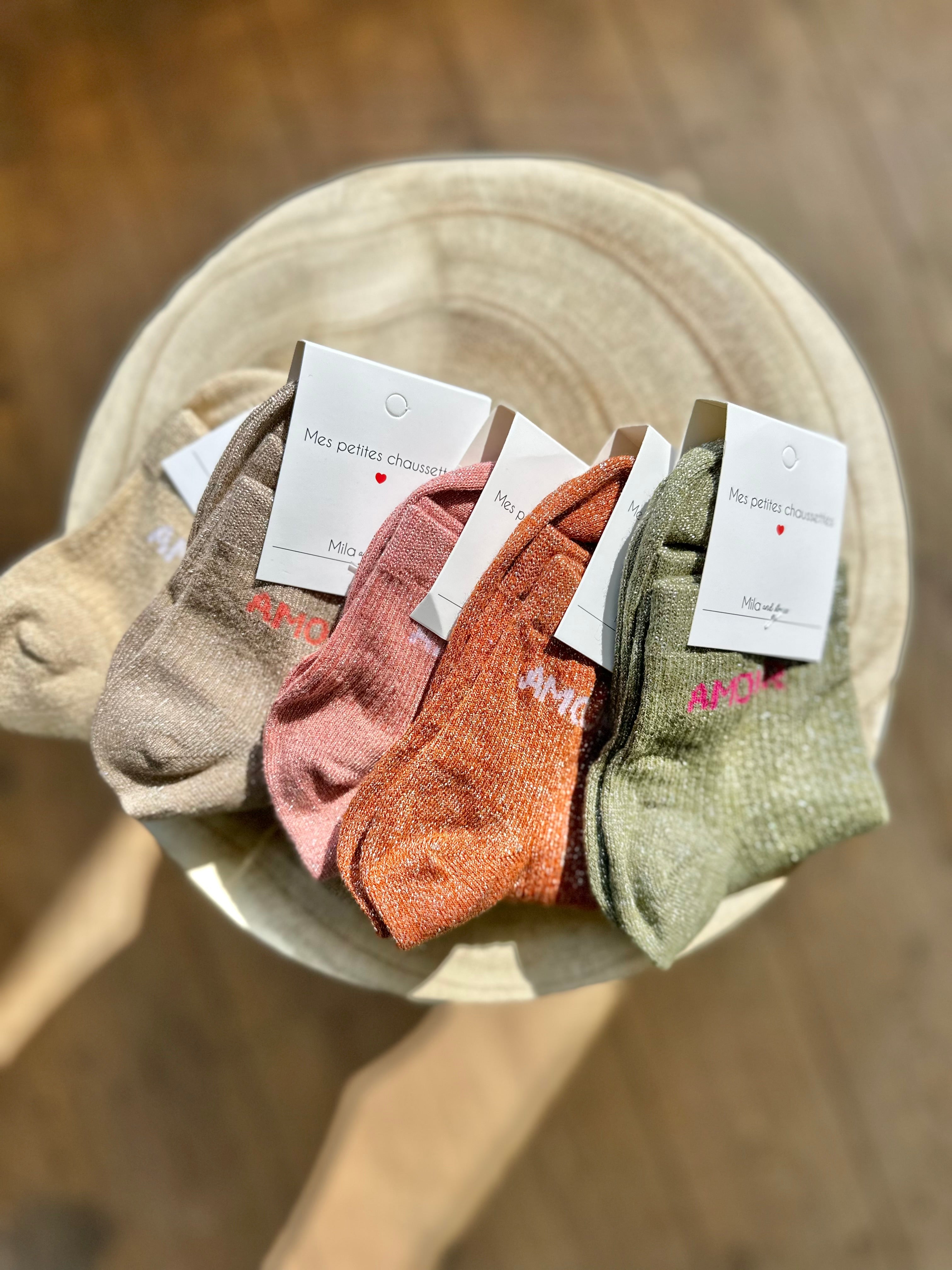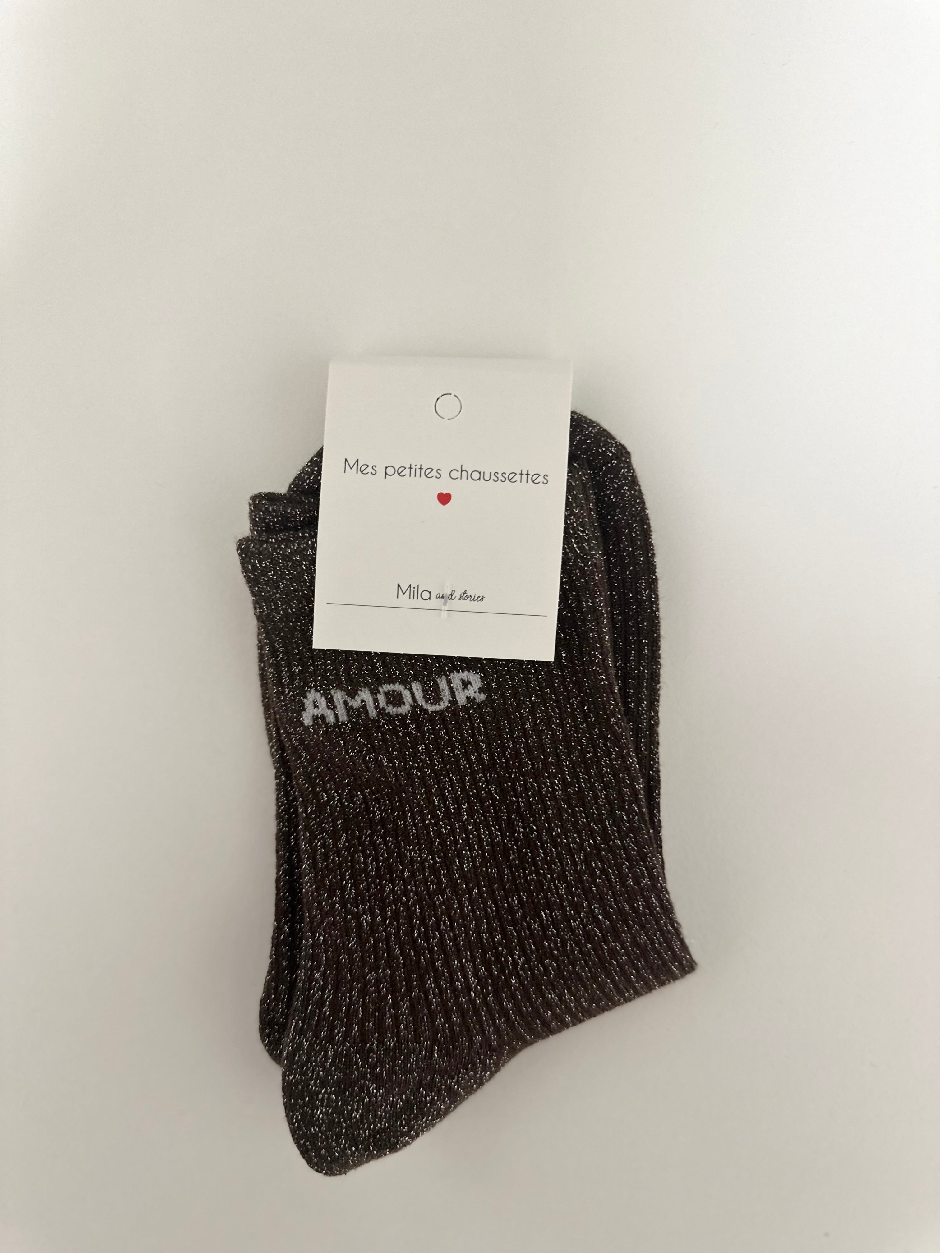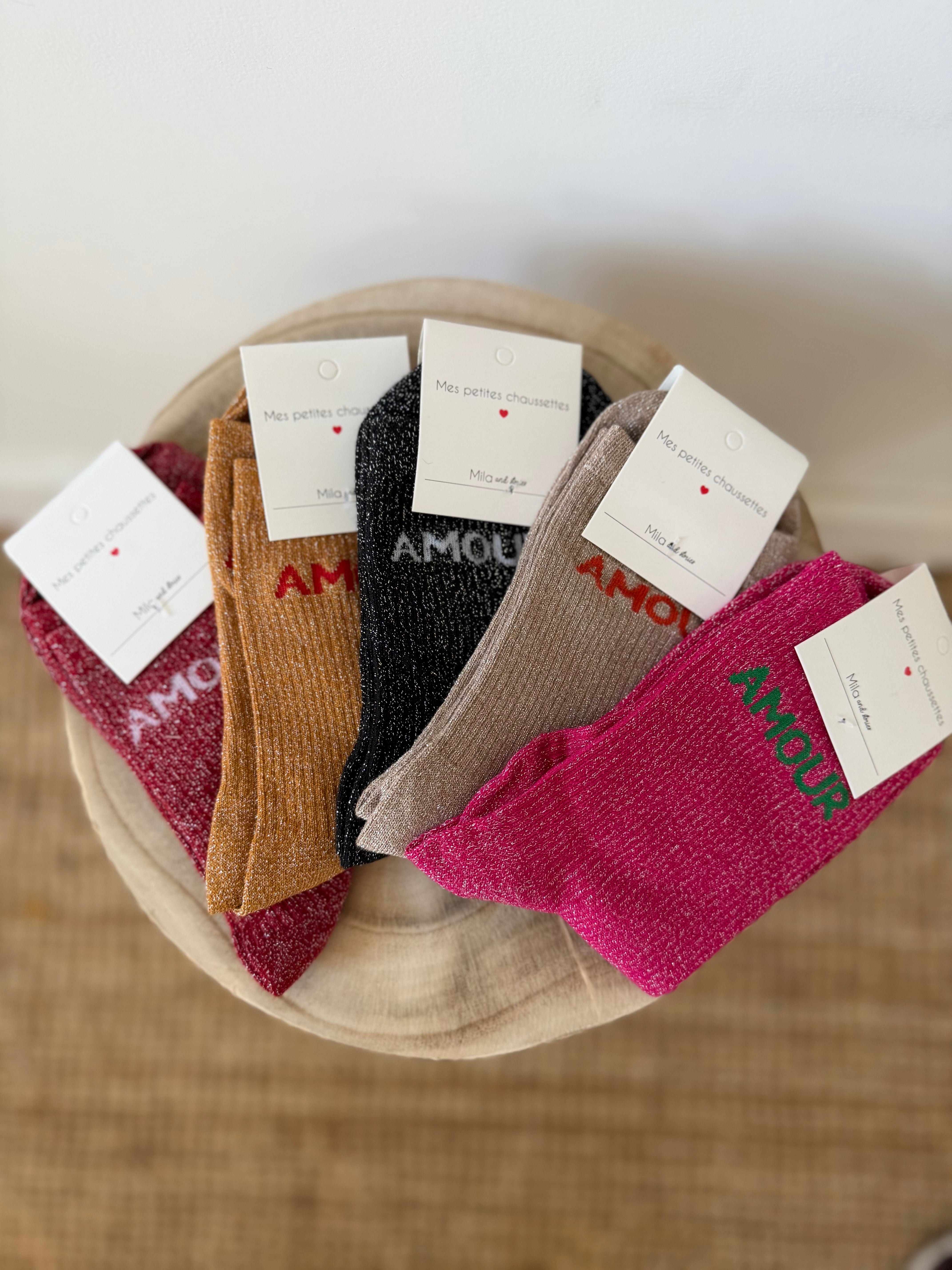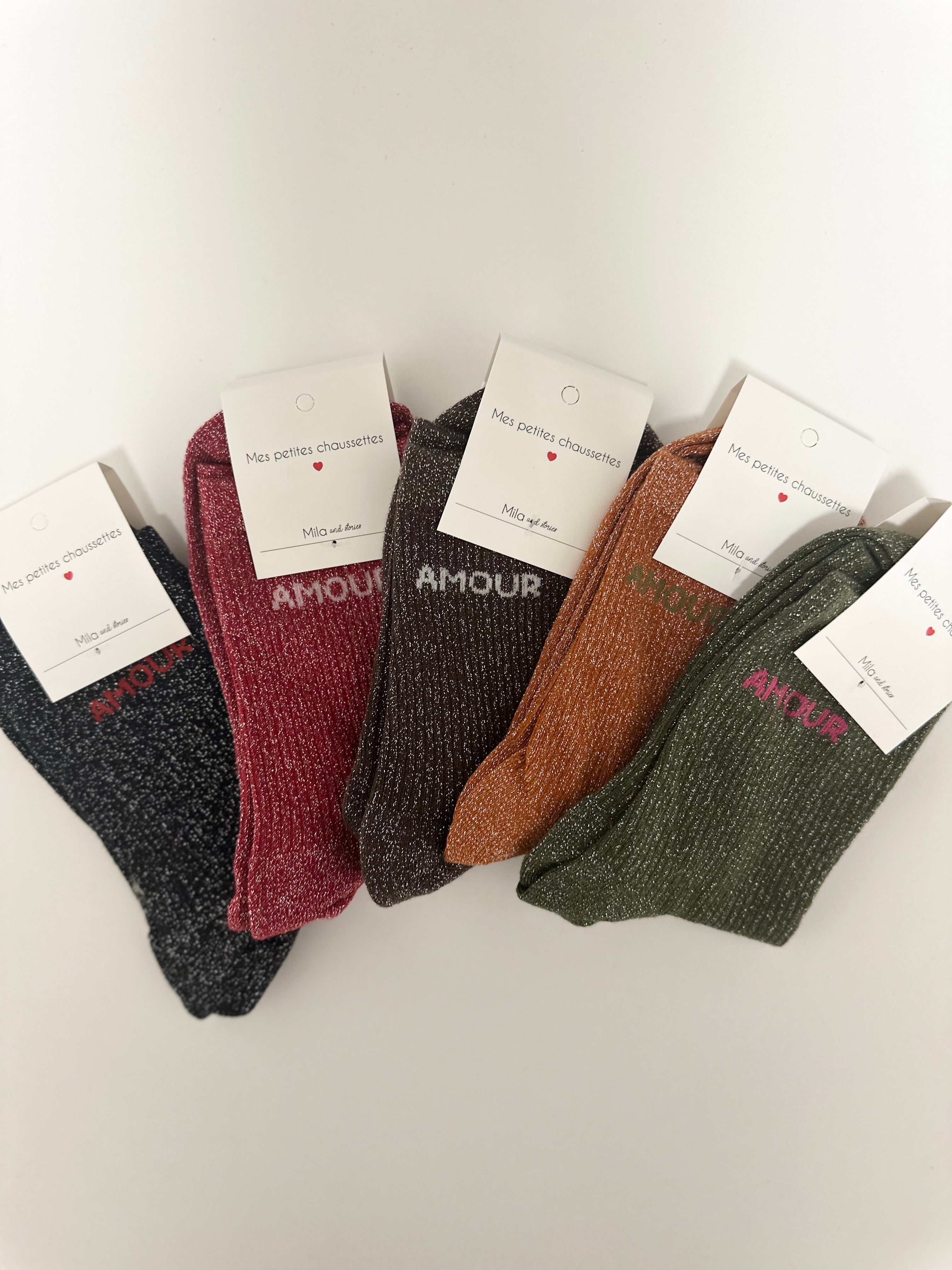 Chaussettes à paillettes disponibles en noir, bordeaux, brun, rouille et kaki avec le mot "amour".