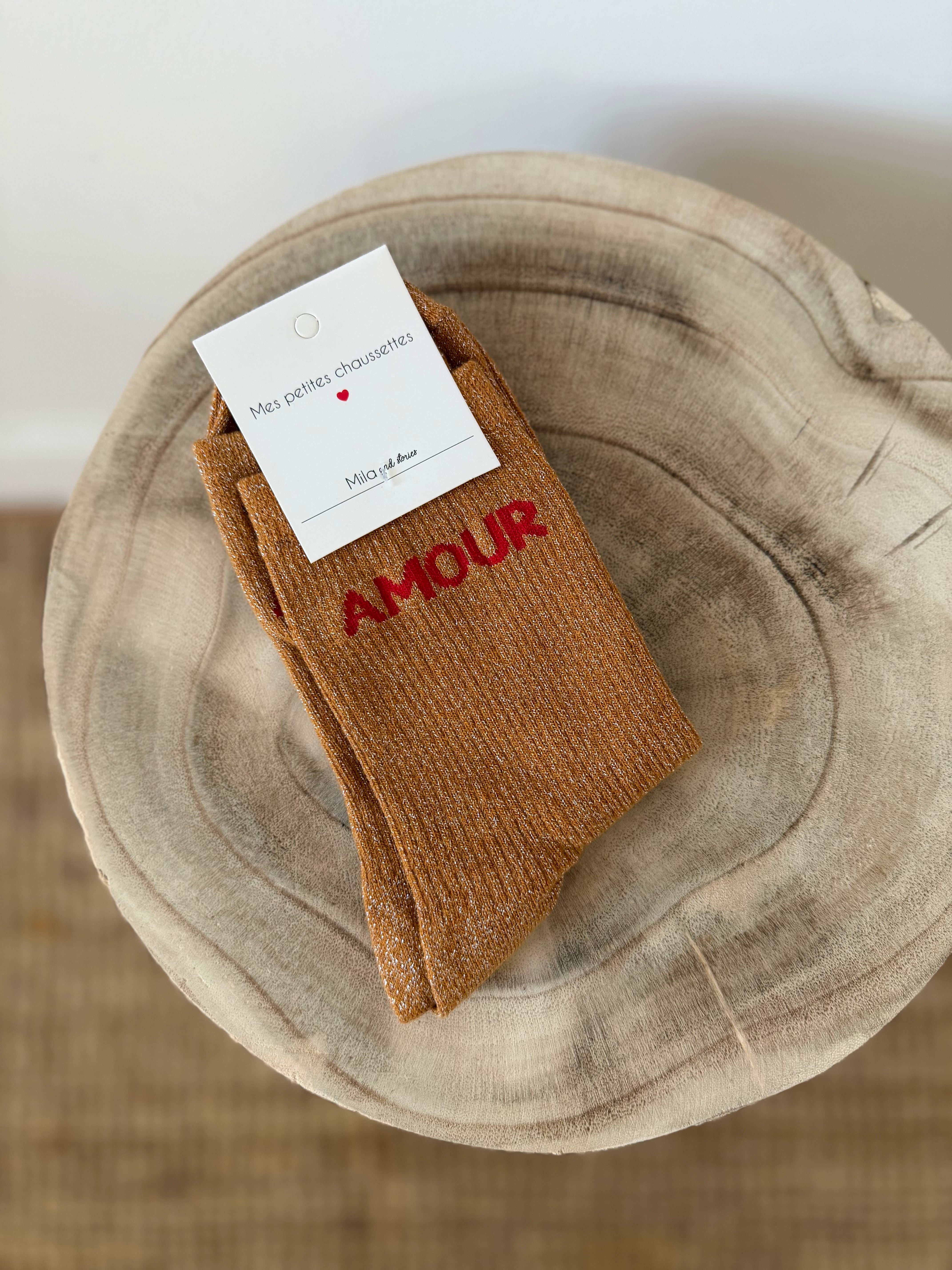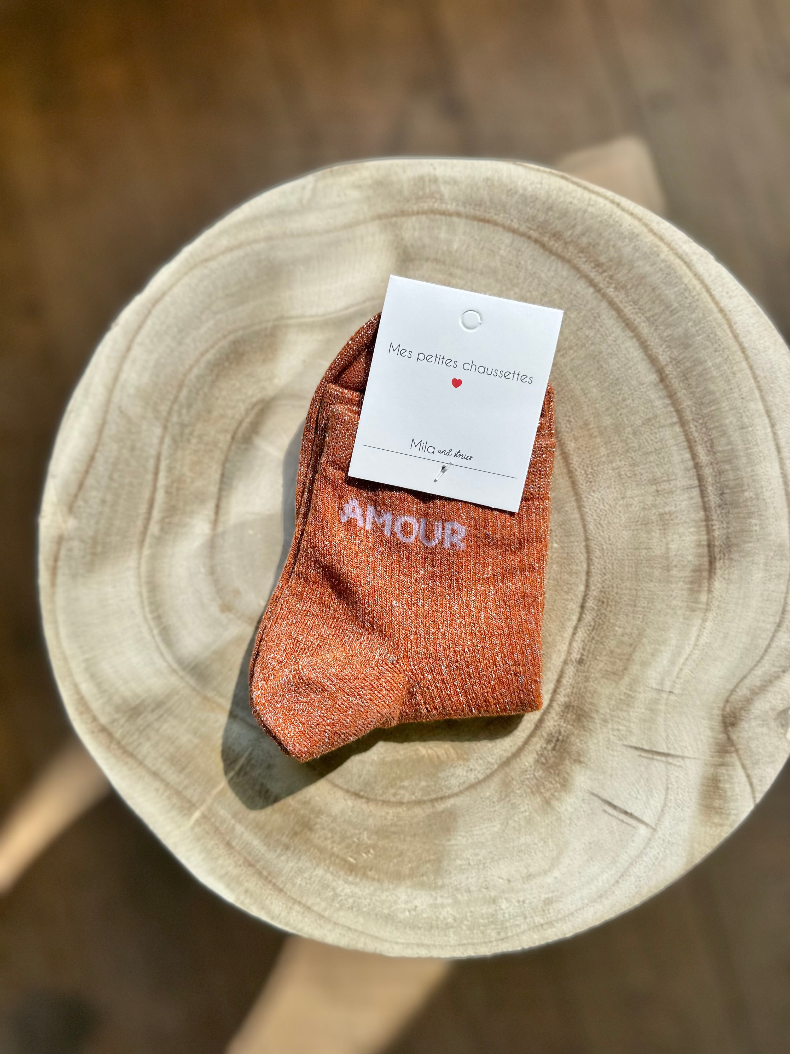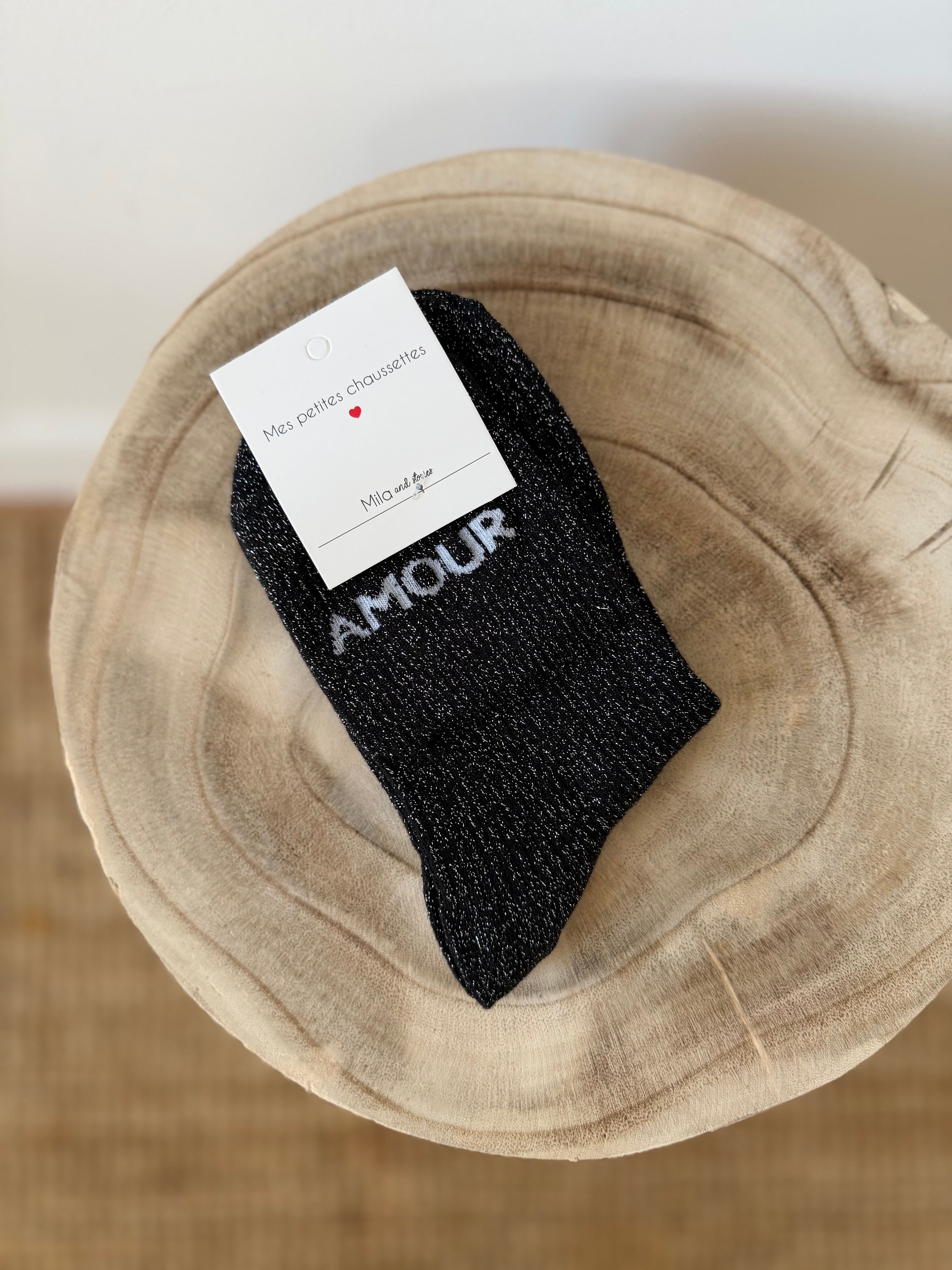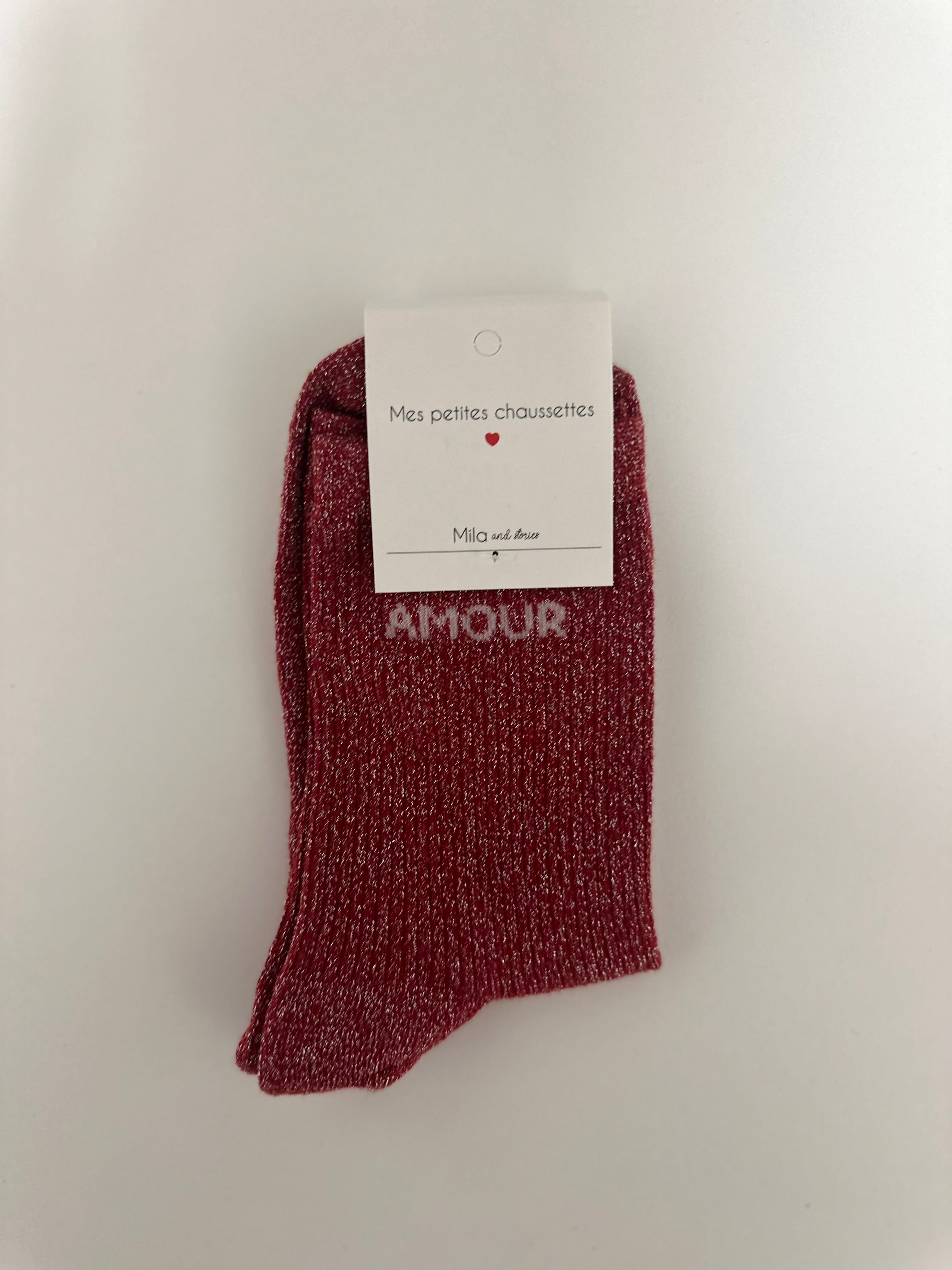 Chaussettes à paillettes disponibles en noir, bordeaux, brun, rouille et kaki avec le mot "amour".