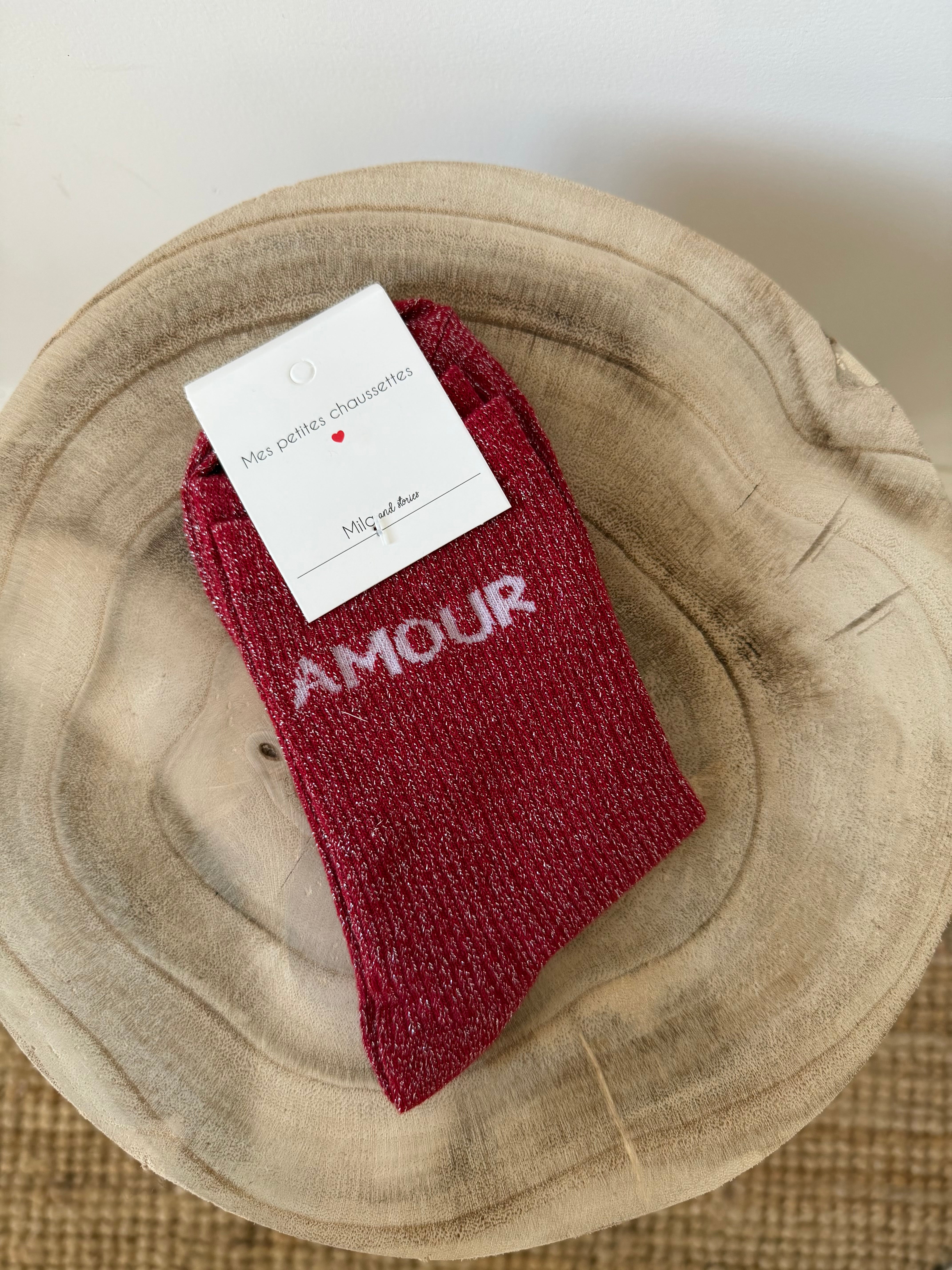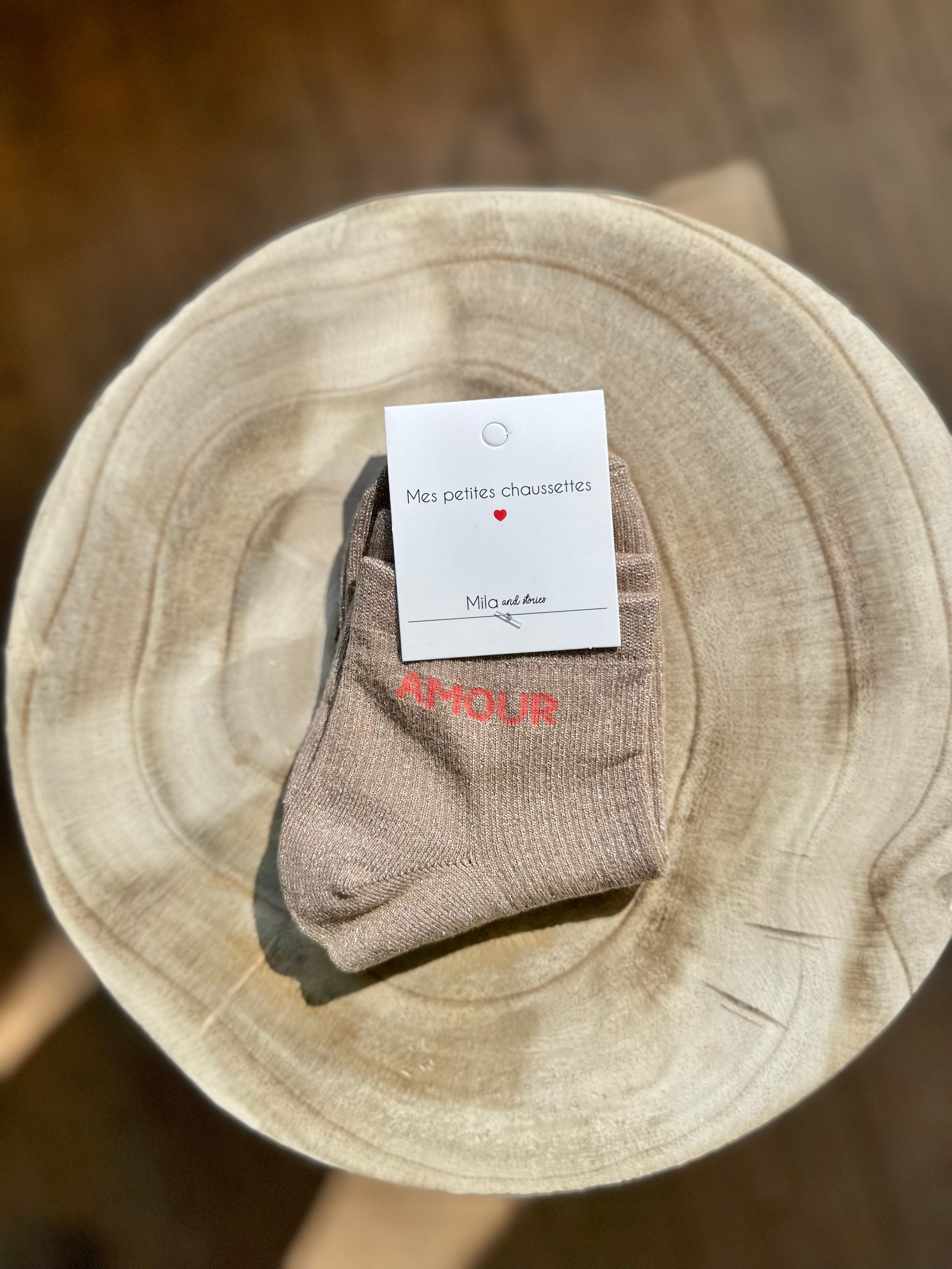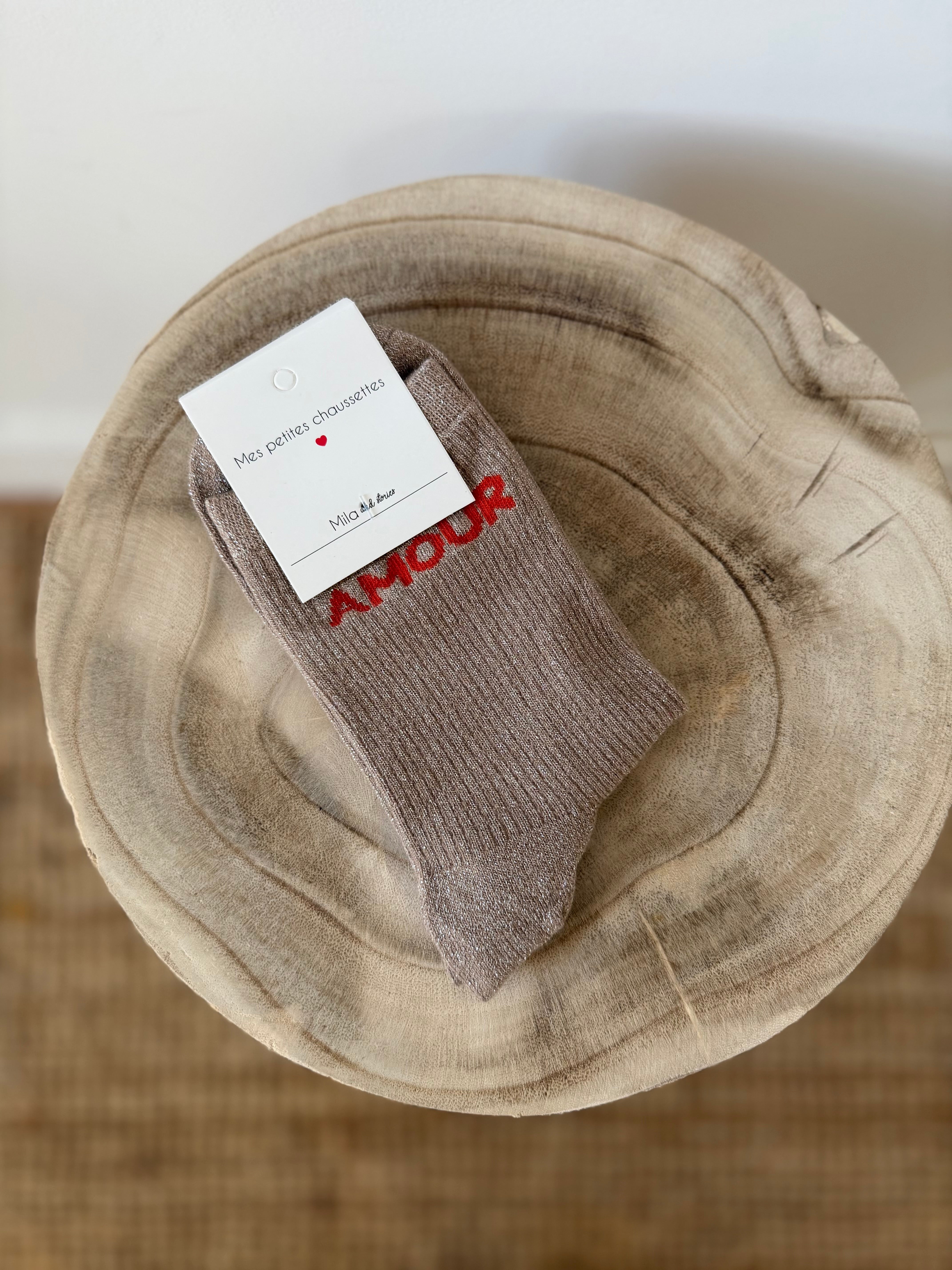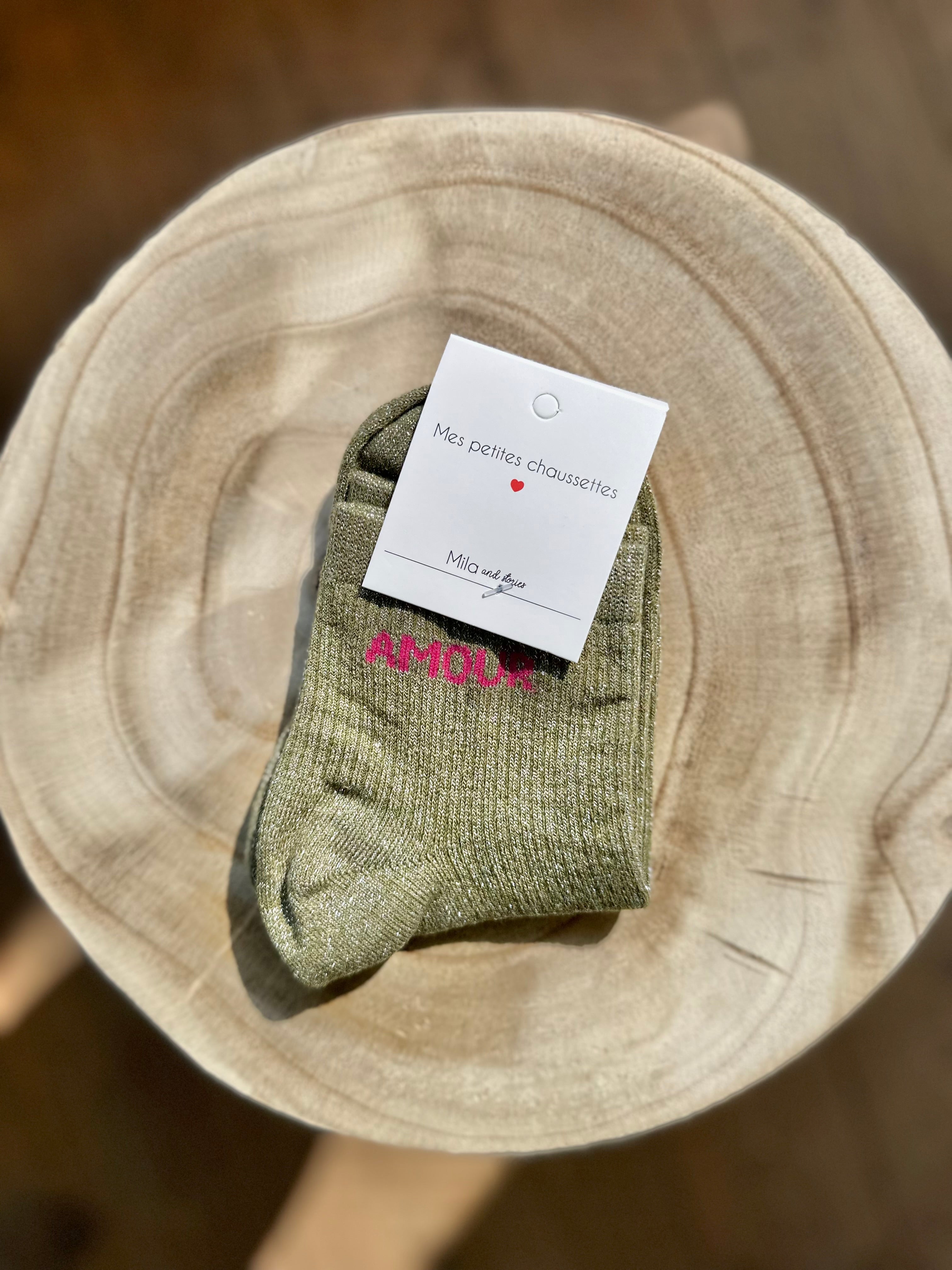 Chaussettes à paillettes disponibles en noir, bordeaux, brun, rouille et kaki avec le mot "amour".