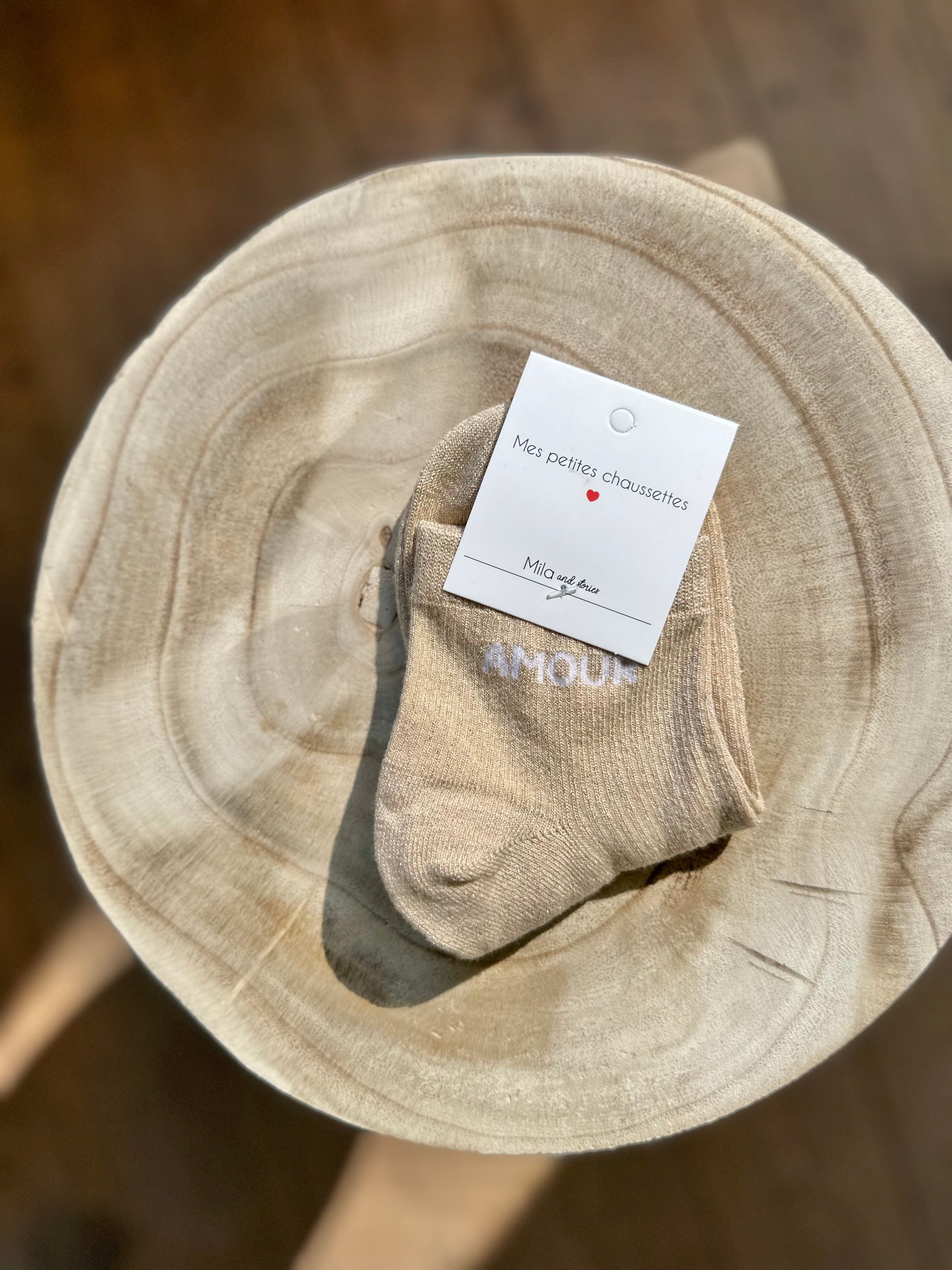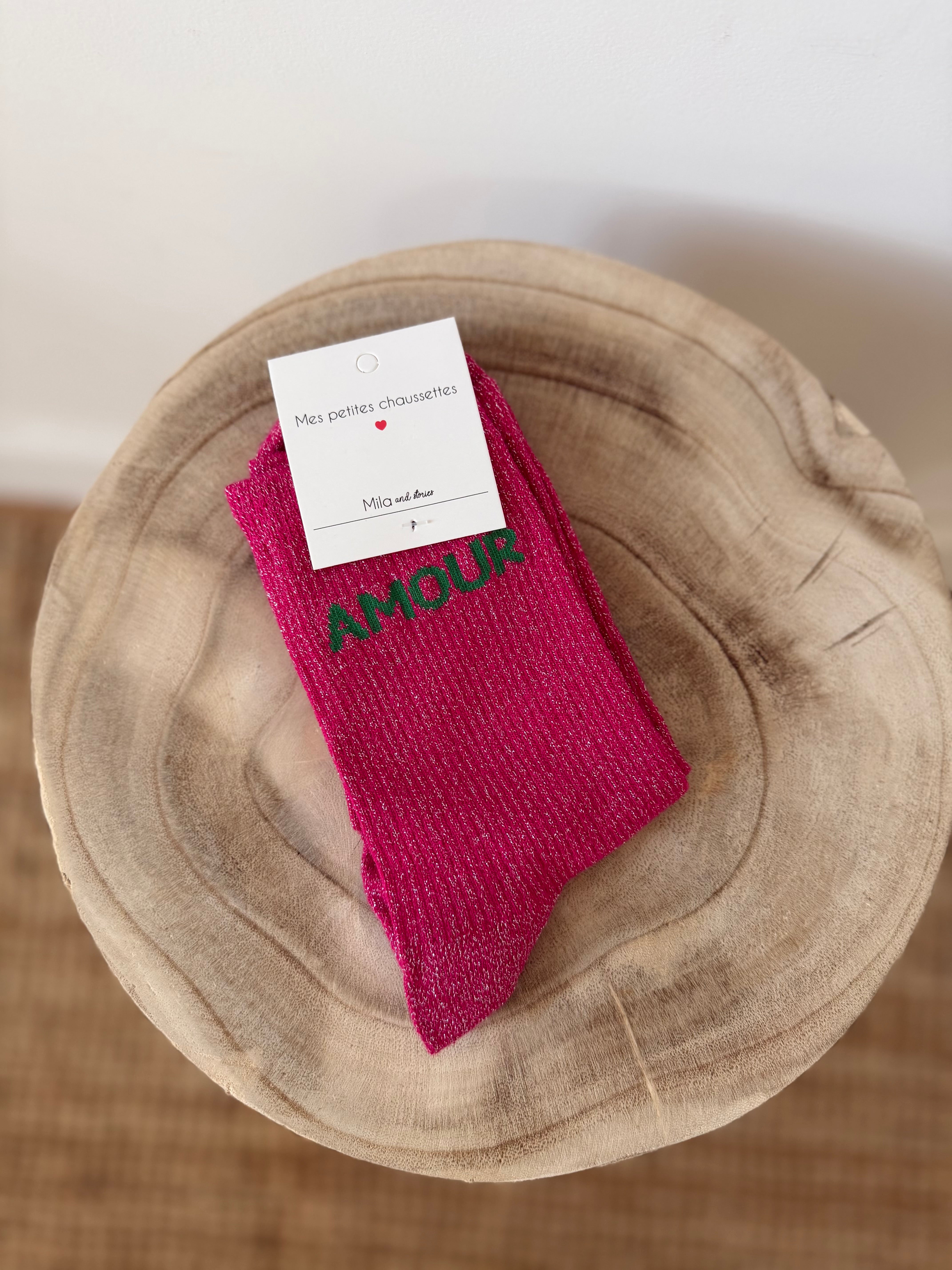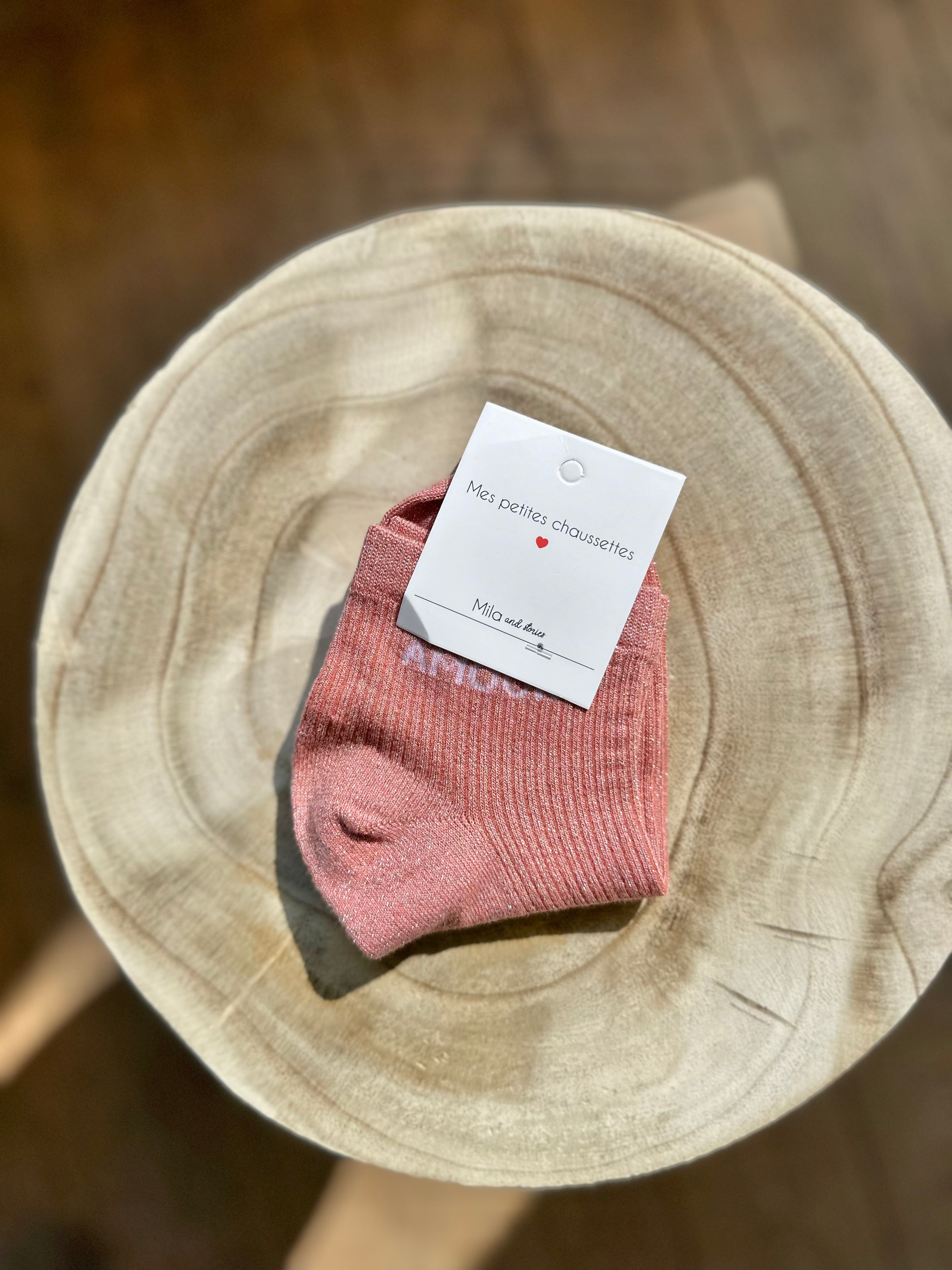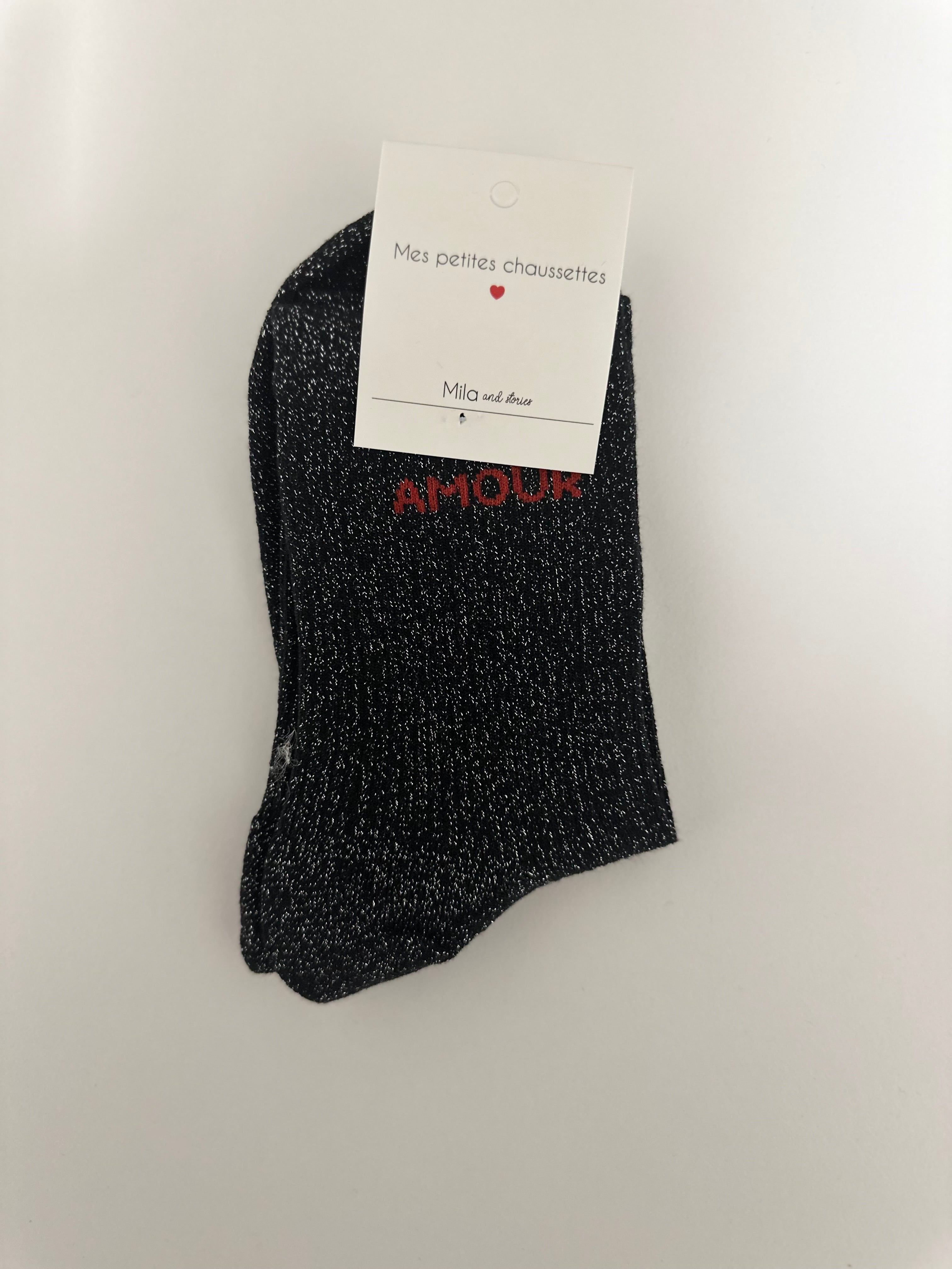 Chaussettes à paillettes disponibles en noir, bordeaux, brun, rouille et kaki avec le mot "amour".