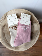 Chaussettes avec des paillettes, colorées avec l'inscription "Maitresse en or". Disponible en rose, orange, beige et rouge.