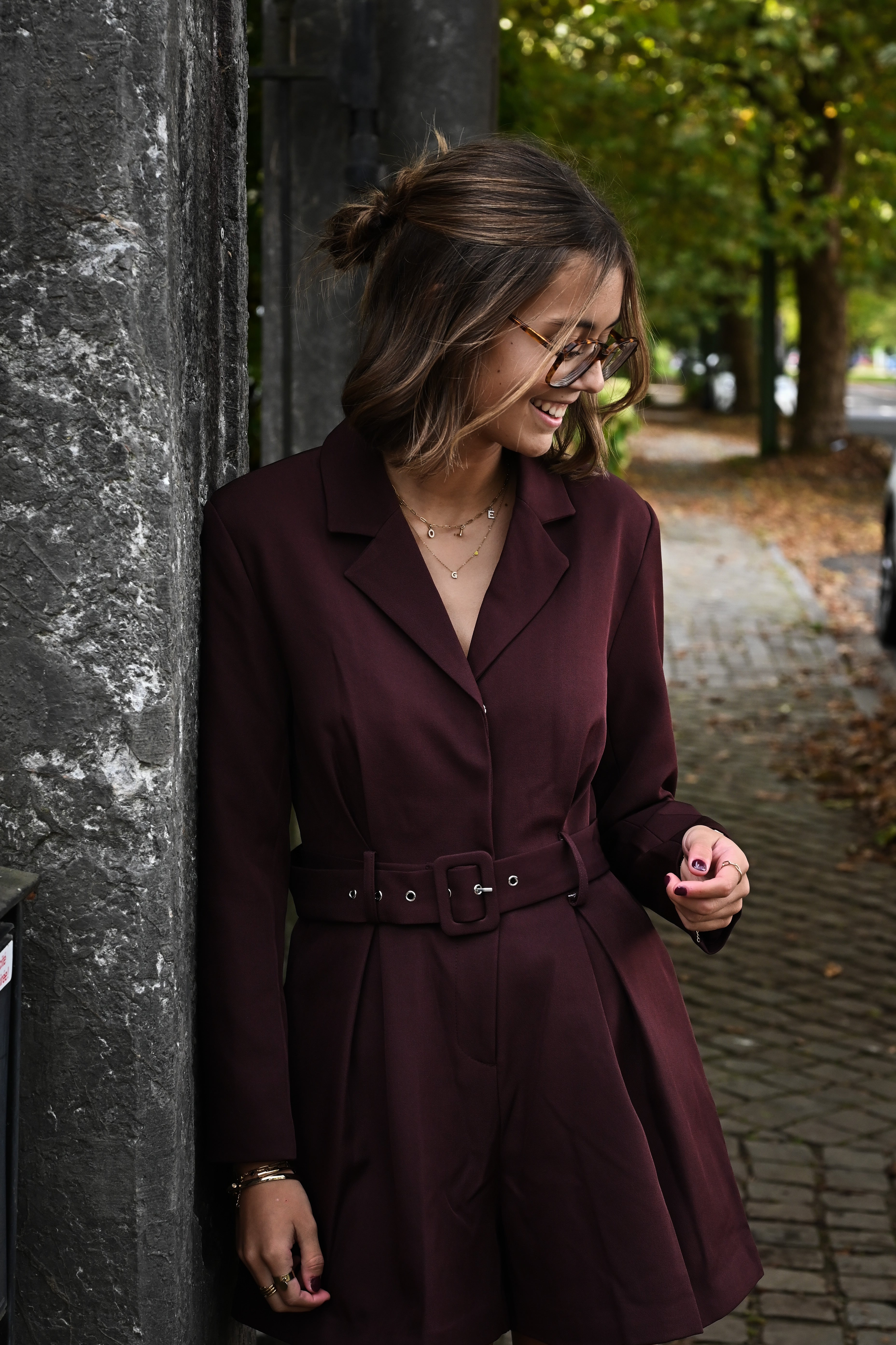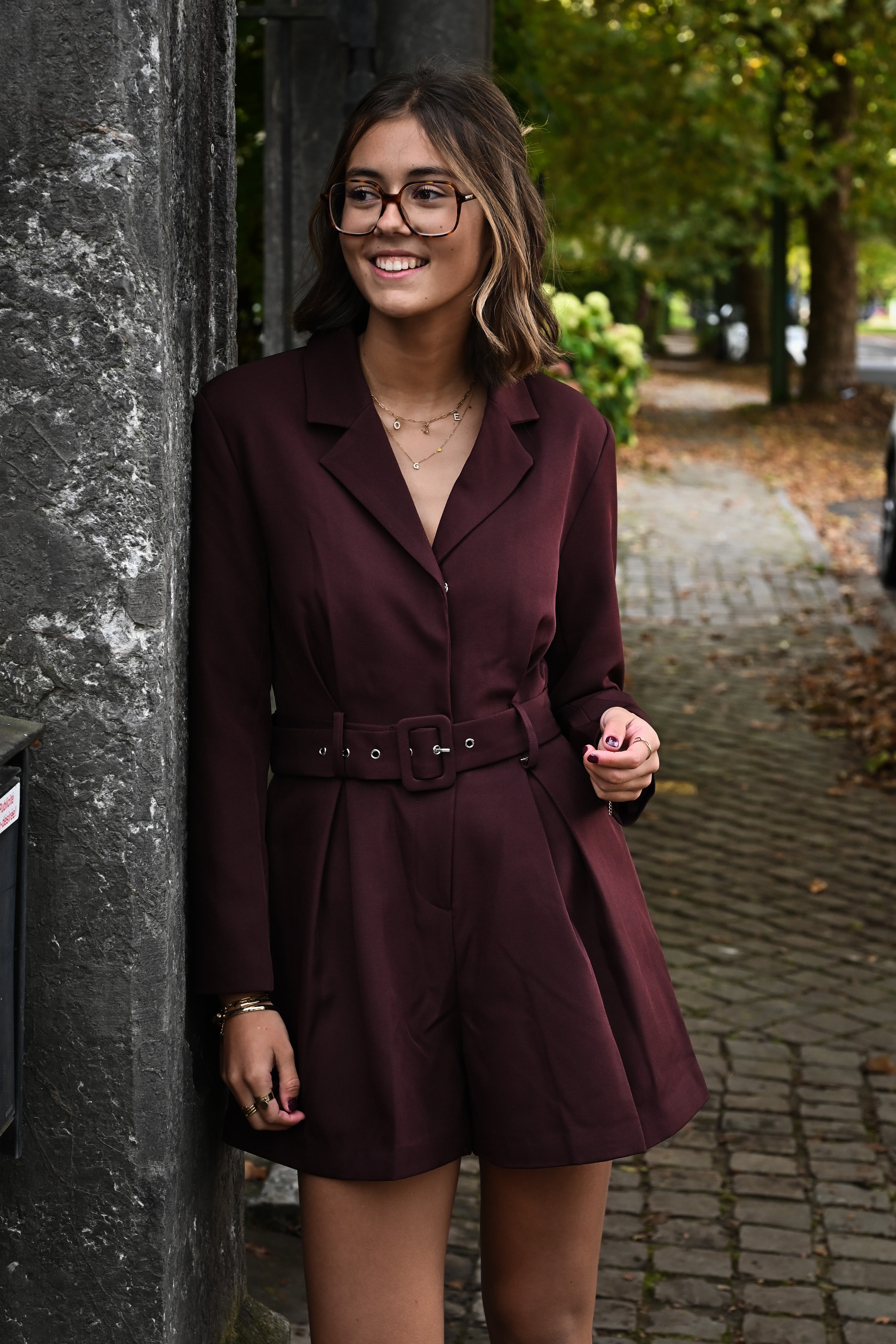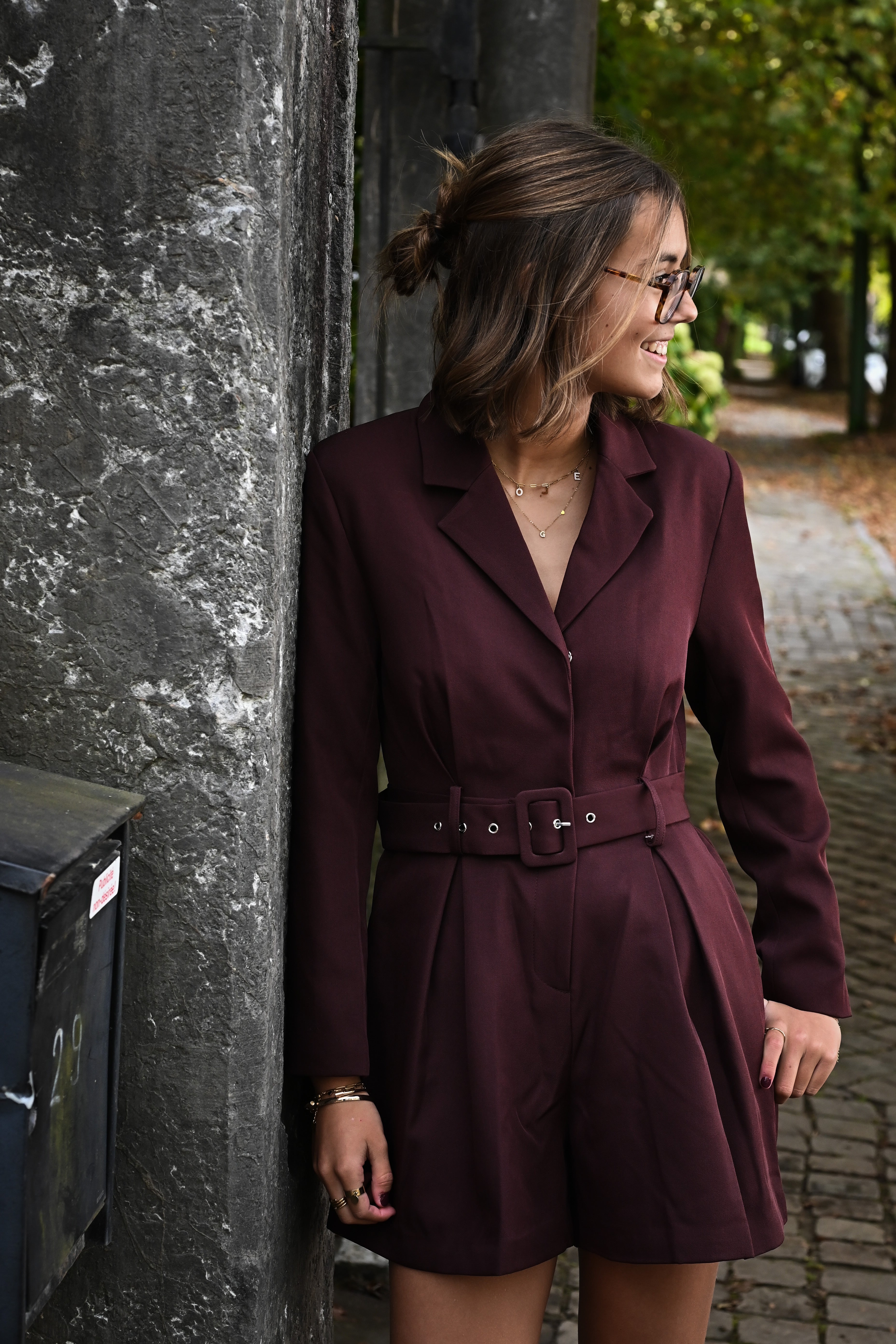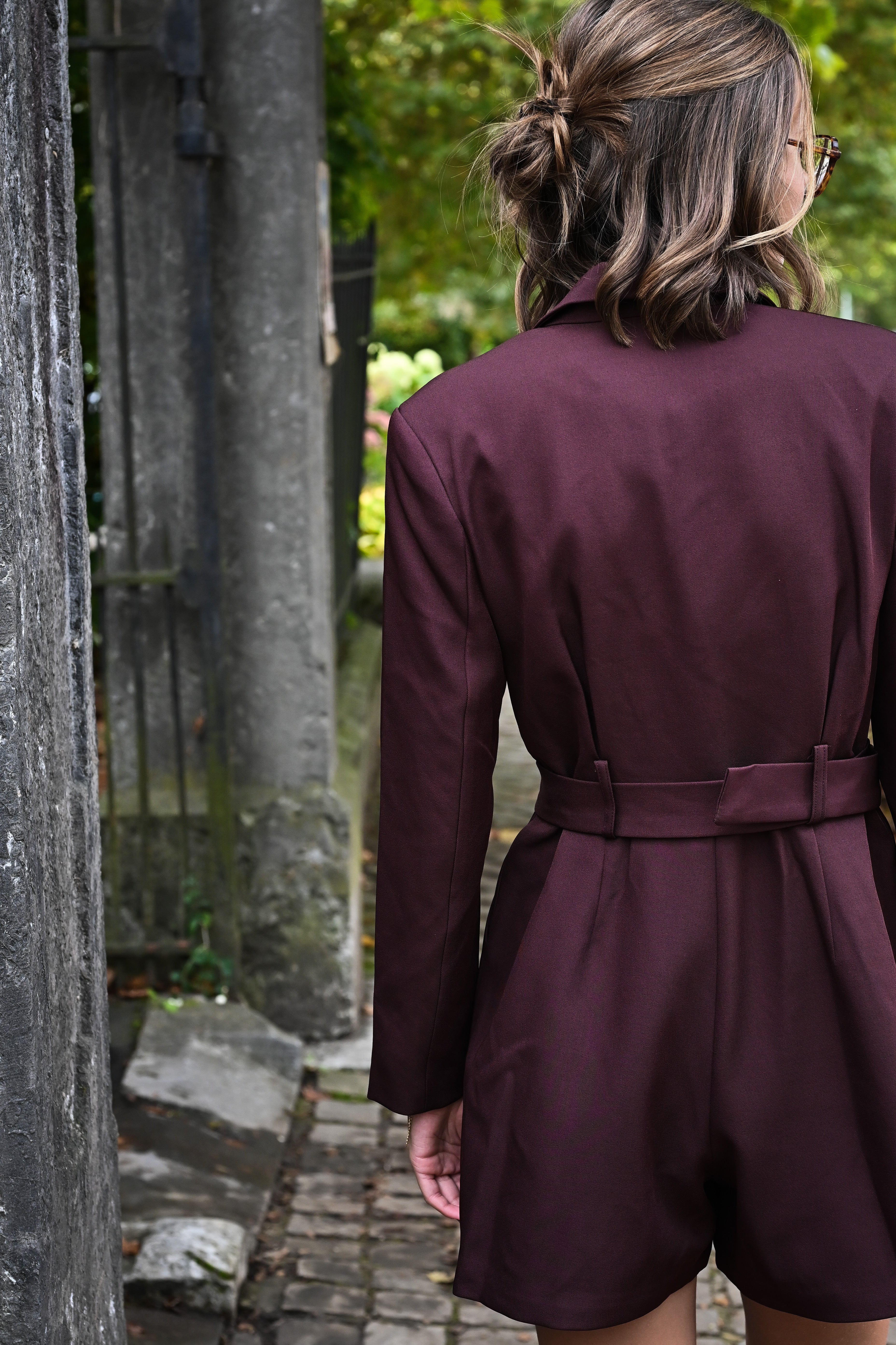 Élégante combinaison short bordeaux en matière blazer, ceinturée pour une silhouette affinée, disponible en tailles S, M et L. Un choix parfait pour allier style et confort avec assurance.