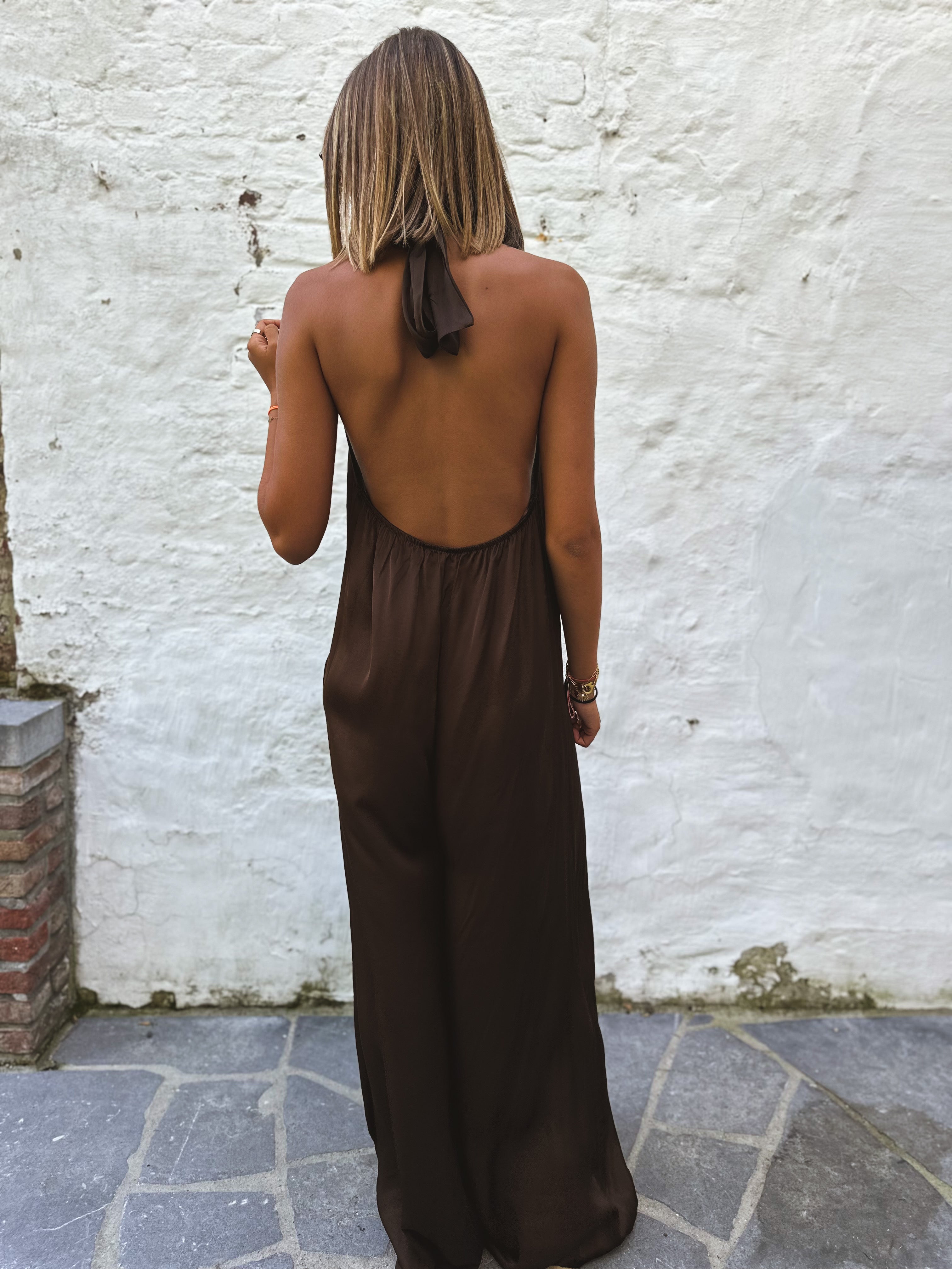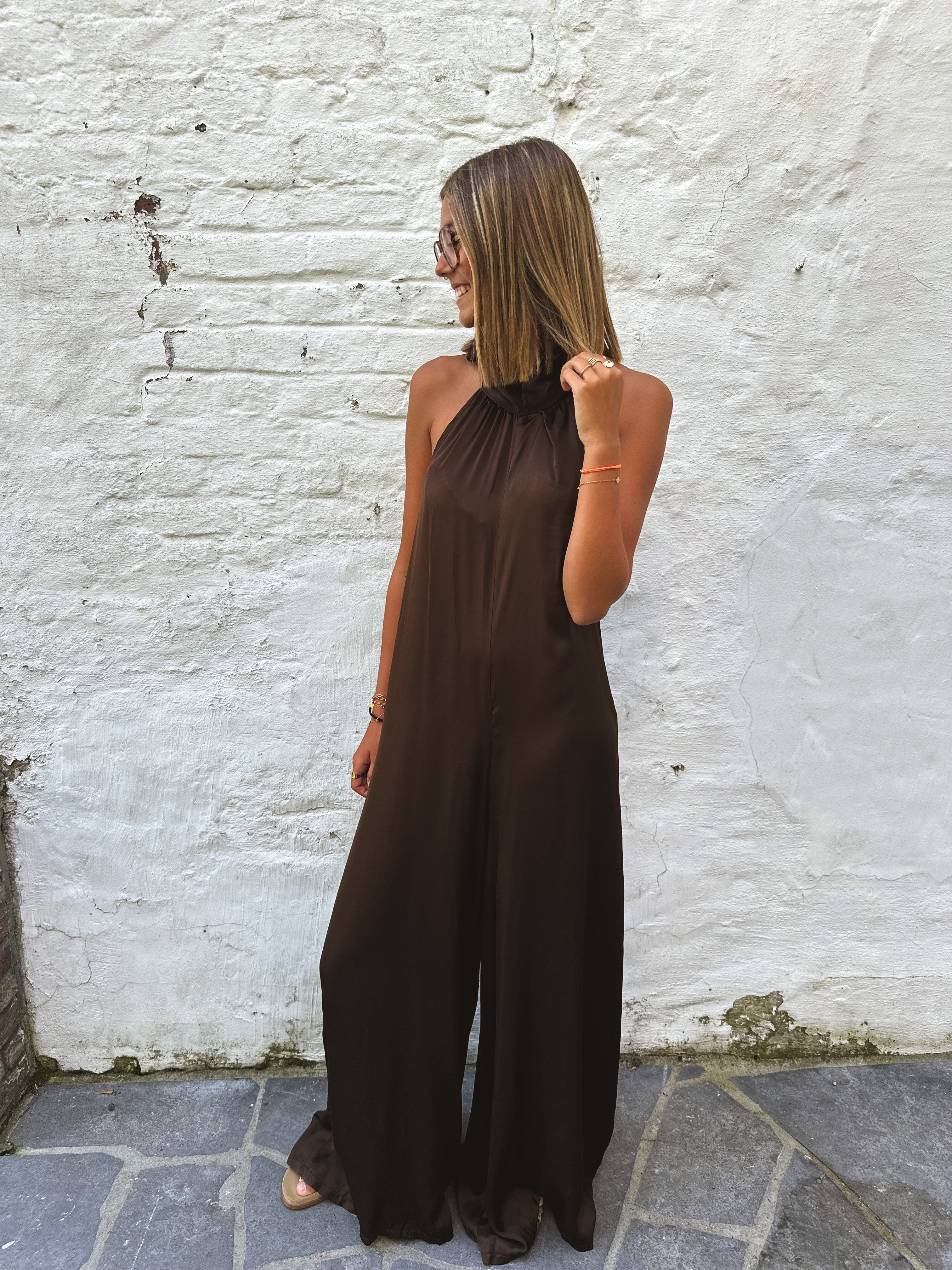 Découvrez l'élégance de la combinaison CIRCE en satin chocolat, conçue pour sublimer votre silhouette. Son dos nu révèle une touche de sensualité discrète tandis que ses jambes larges offrent un confort et une aisance de mouvement incomparables. L’attache délicate avec un nœud dans le dos apporte une finition raffinée et féminine. Parfaite pour une soirée chic, elle allie sophistication et modernité avec une fluidité exceptionnelle. Adoptez la combinaison CIRCE pour un style glamour et assuré.