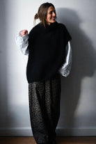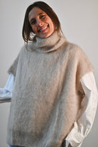 Pull en laine bordeaux, cape col roulé. Disponible seulement en taille unique, il s'adapte à toutes les tailles et morphologies. Le mannequin mesure 1m75.