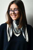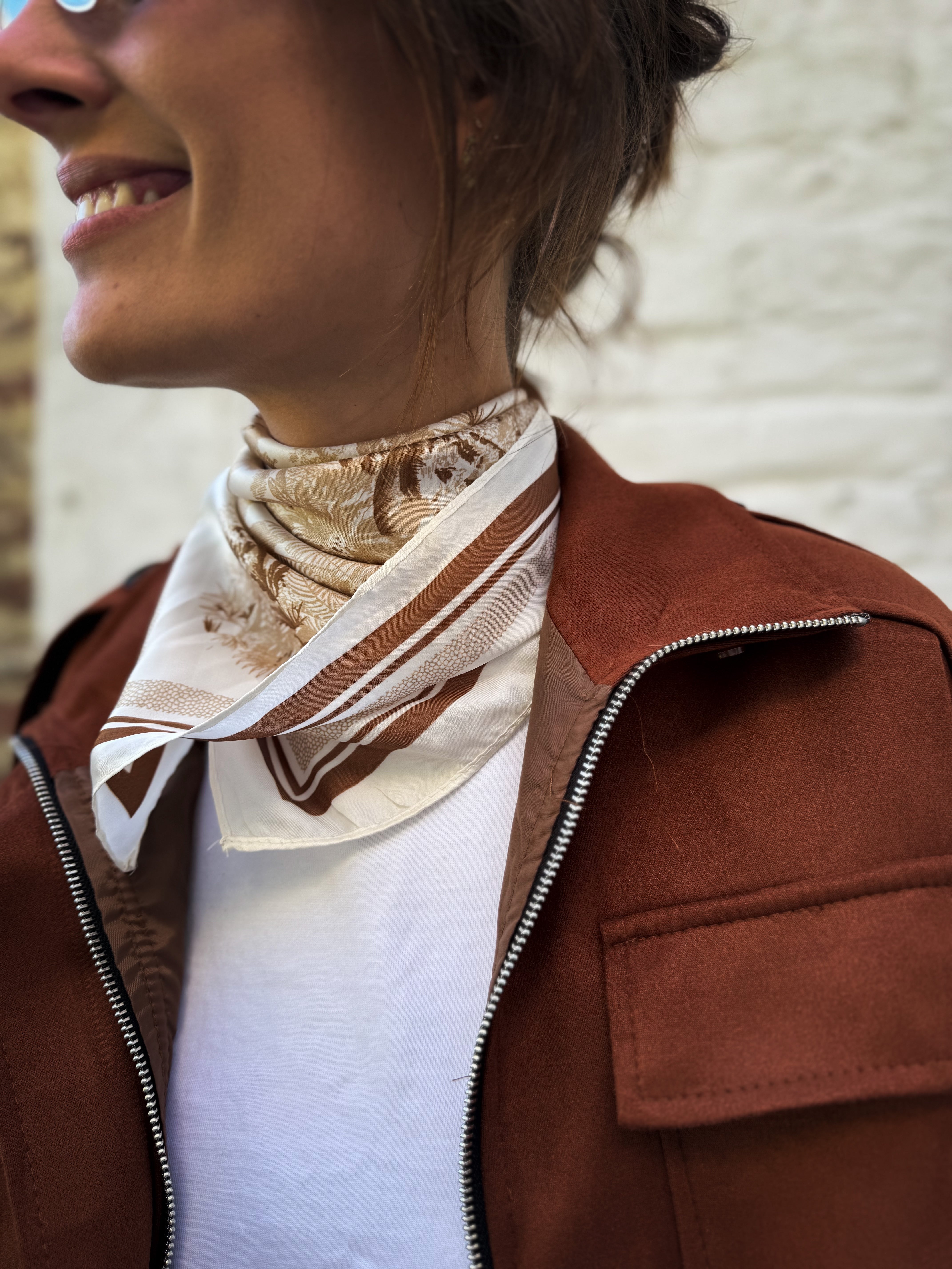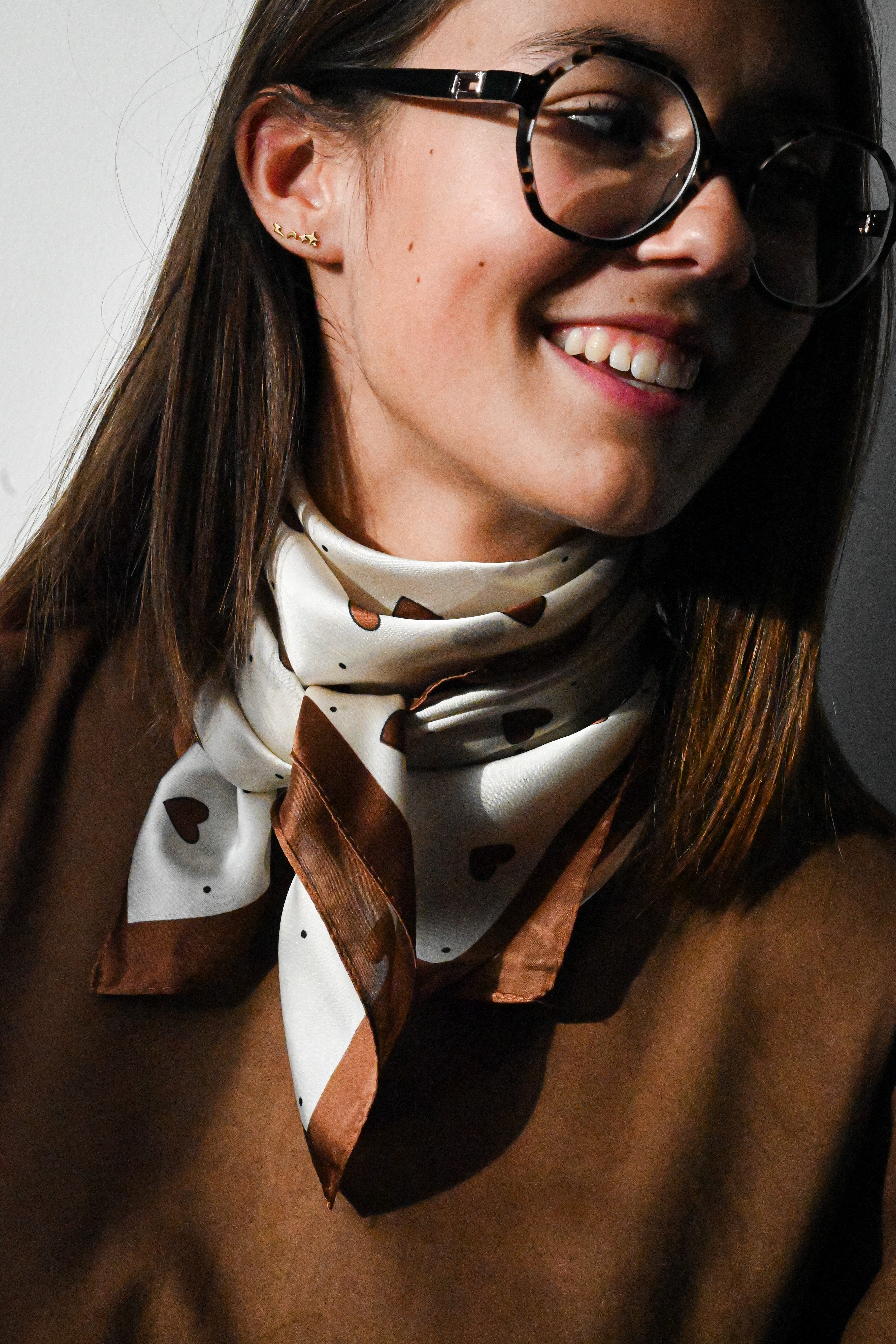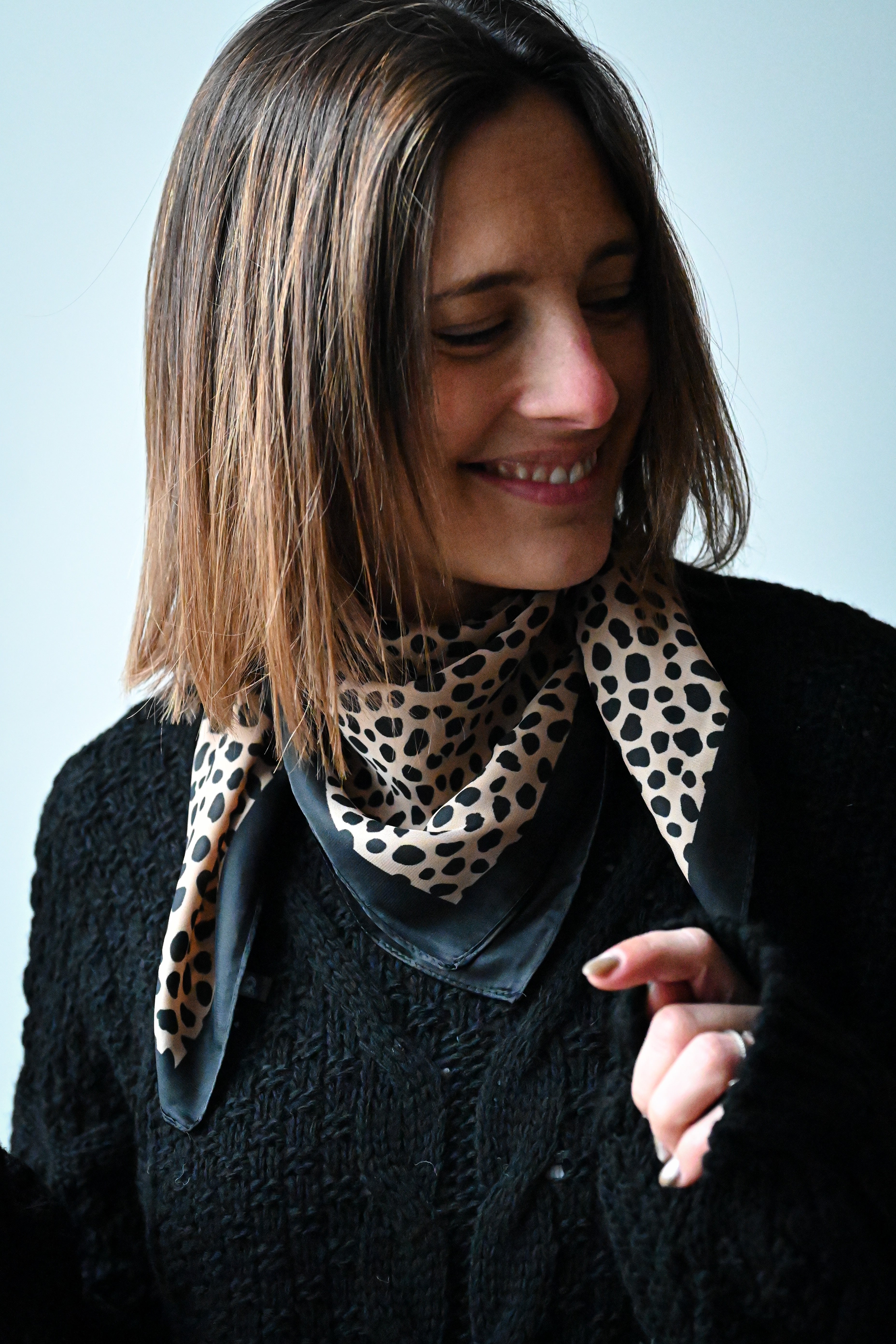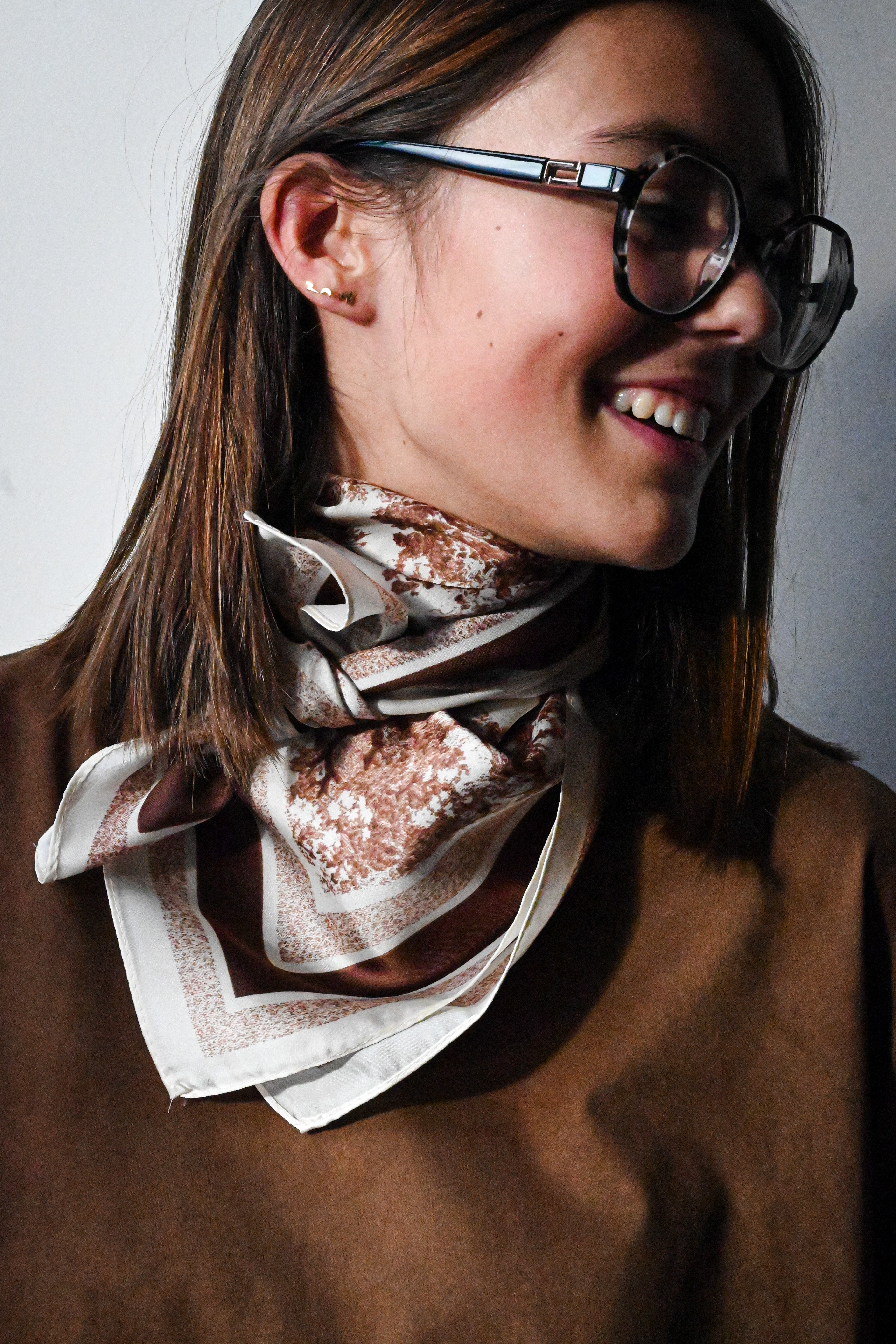Apportez une touche unique à vos tenues avec ce foulard carré en satin, polyvalent et facile à porter de différentes manières.