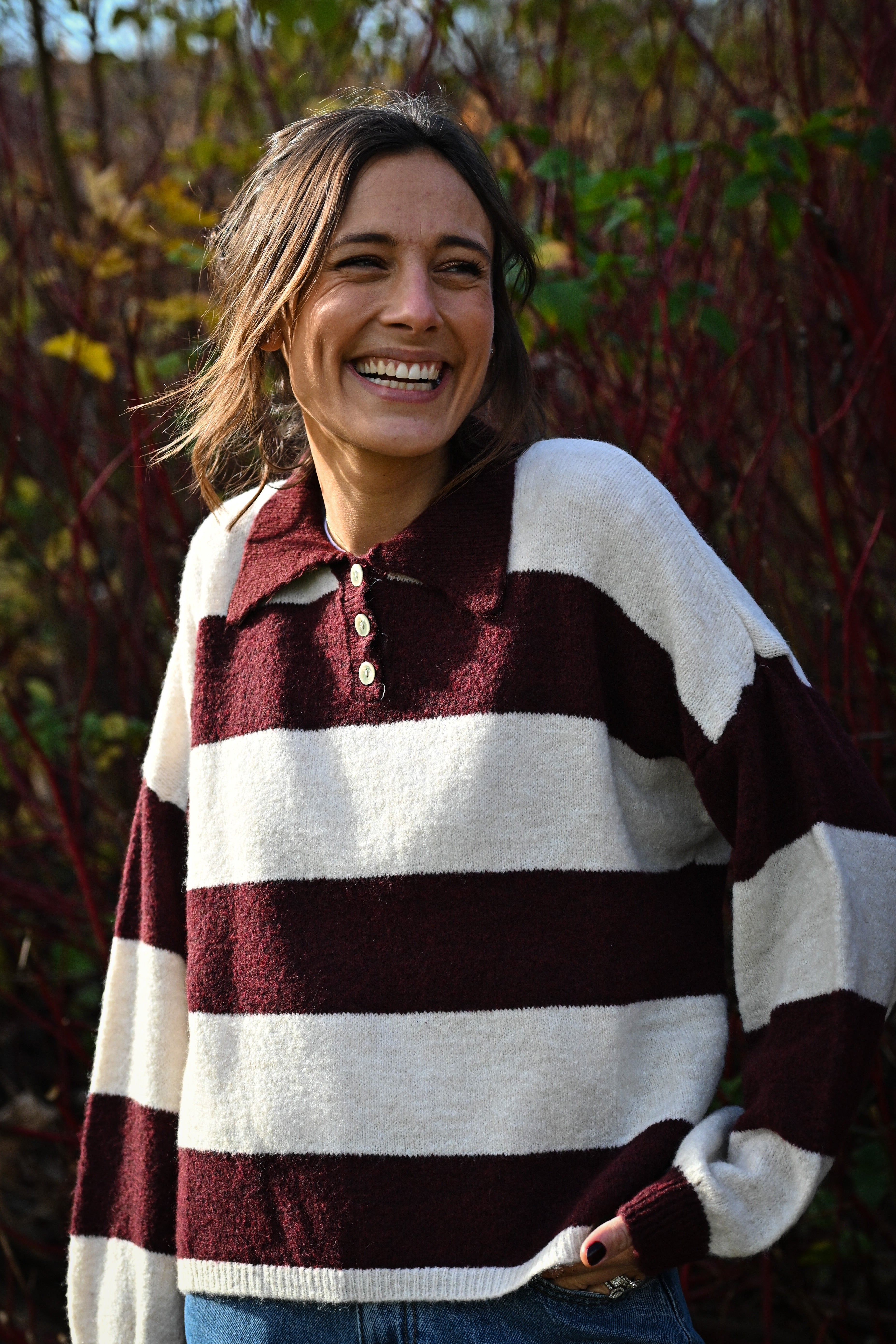 Le Pull ISABELLE est la pièce essentielle qui transforme vos tenues quotidiennes. Avec ses manches longues et ses rayures intemporelles en bordeaux et blanc cassé, il conjugue style et praticité. Le col polo orné de petits boutons ajoute une dimension classique et soignée à votre silhouette. Confortable et polyvalent, ce pull s'adapte à tous vos moments, du bureau aux loisirs. Disponible en taille unique, c'est l'allié parfait pour affronter les saisons fraîches avec assurance.