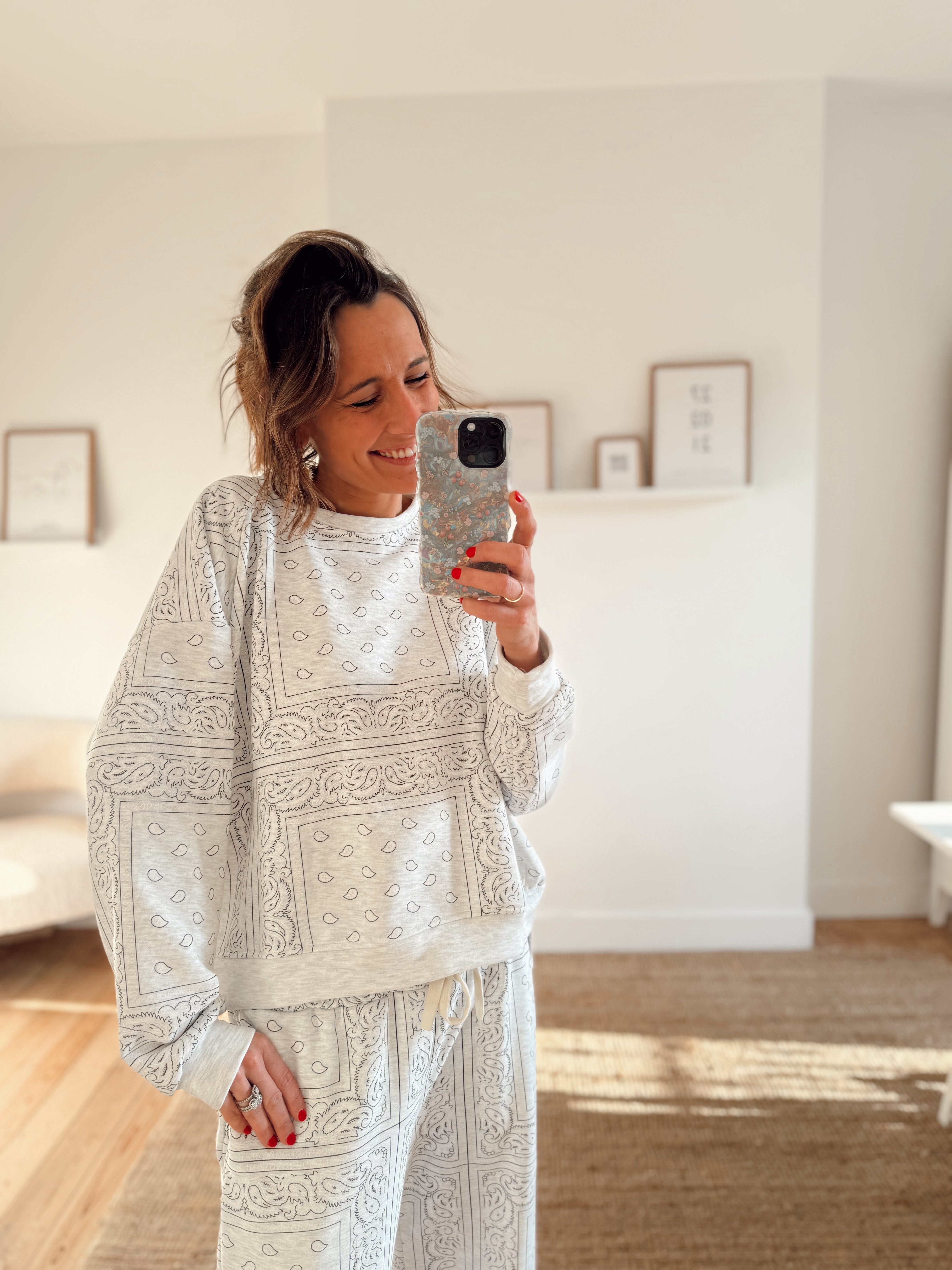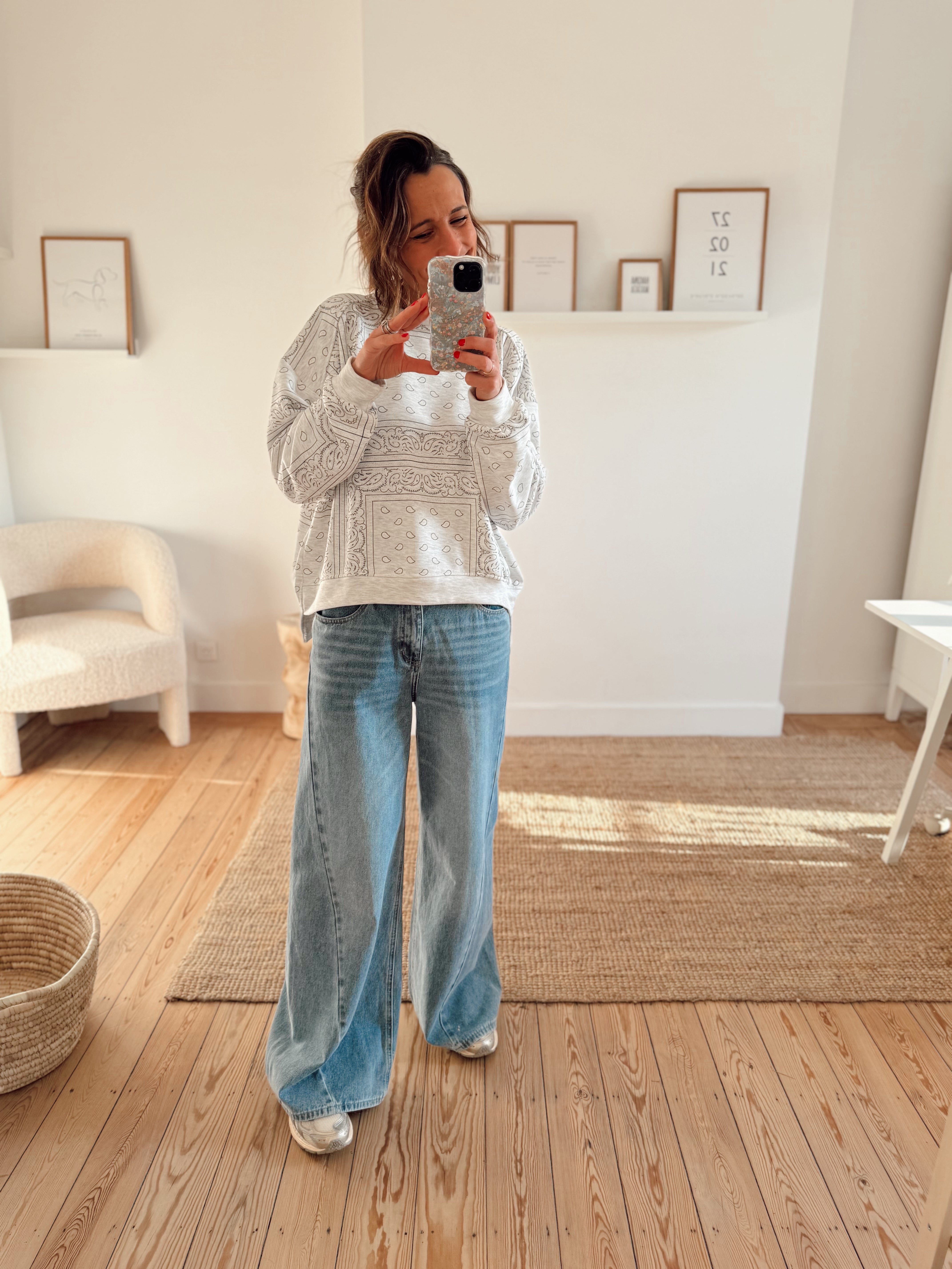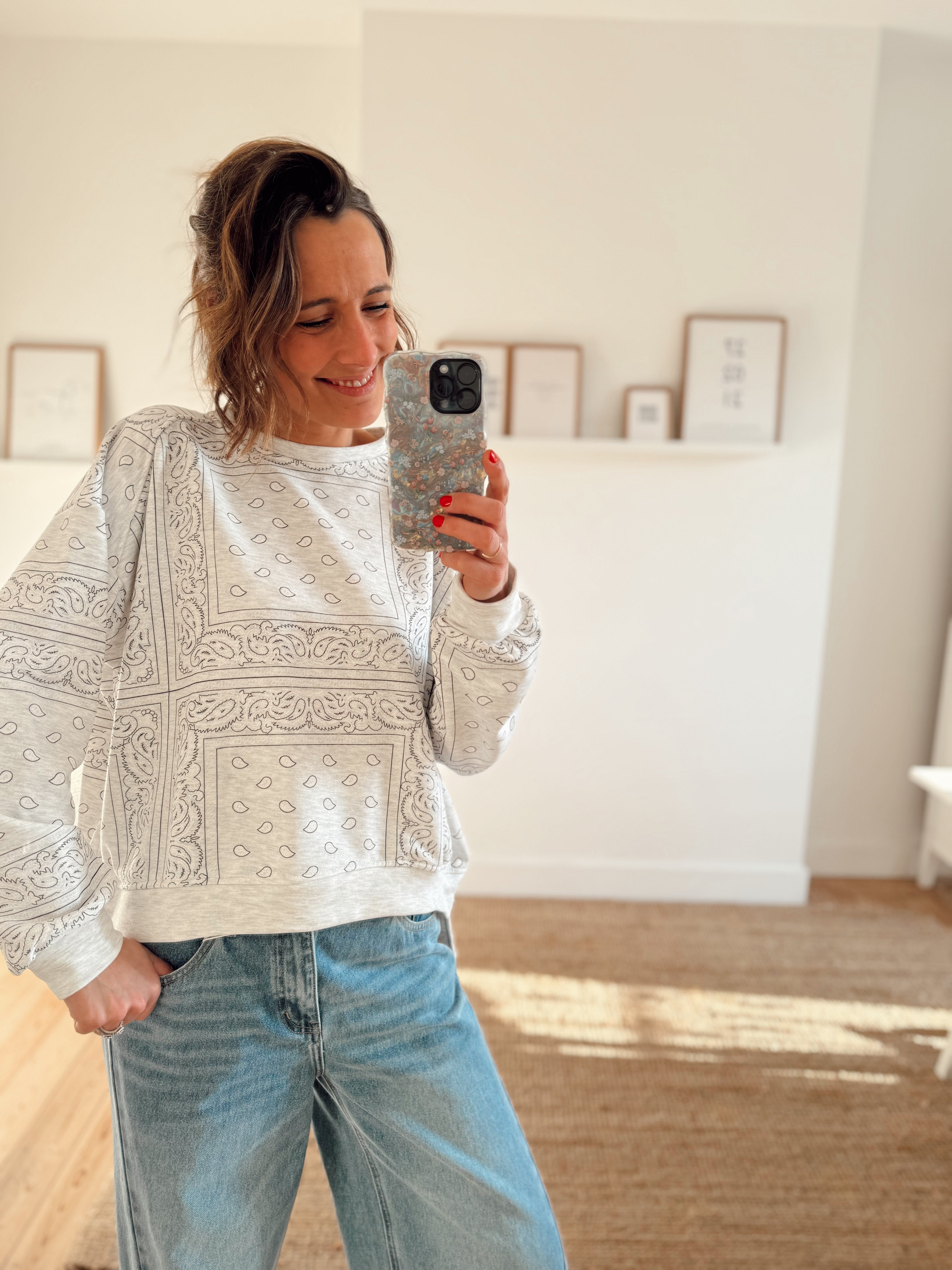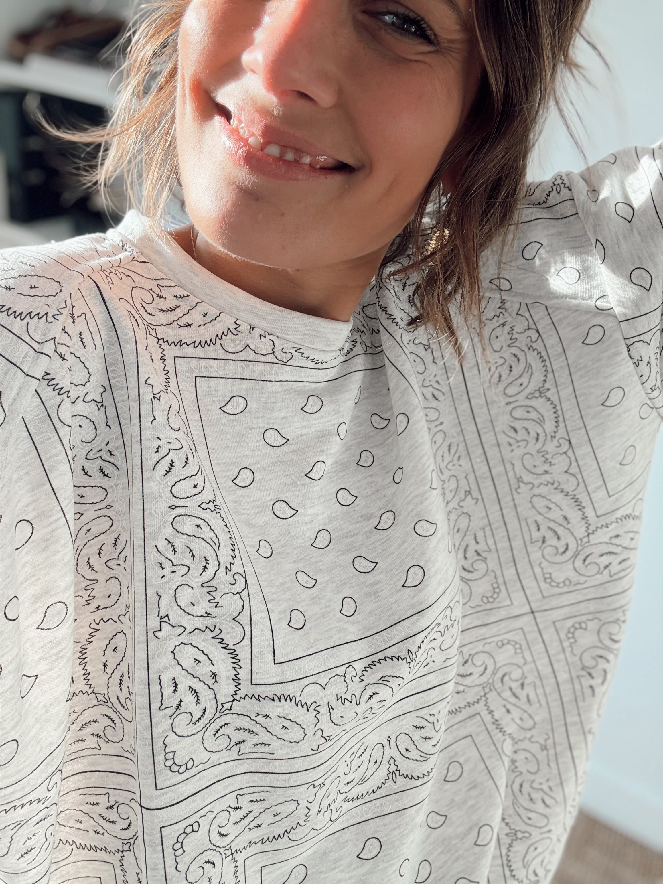 Sweat oversize col rond orné d'un motif bandana tendance. Coupe généreuse et confortable pour un style décontracté. Taille unique adaptée à tous.