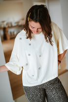 T-shirt JESS jaune orné de brillants qui capte la lumière pour un look éclatant. Coupe confortable en taille unique, parfait pour ajouter une touche de brillance à votre garde-robe quotidienne.