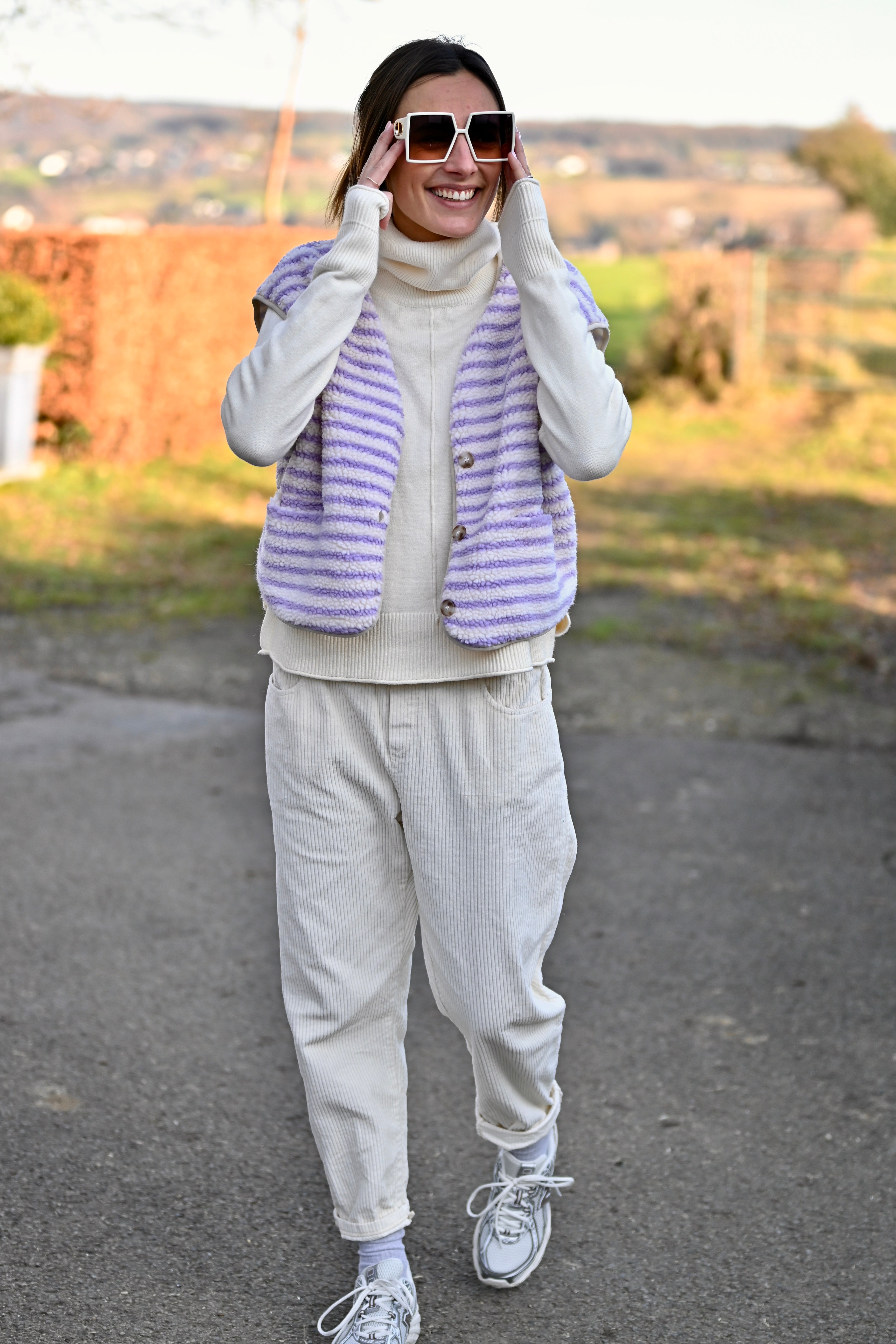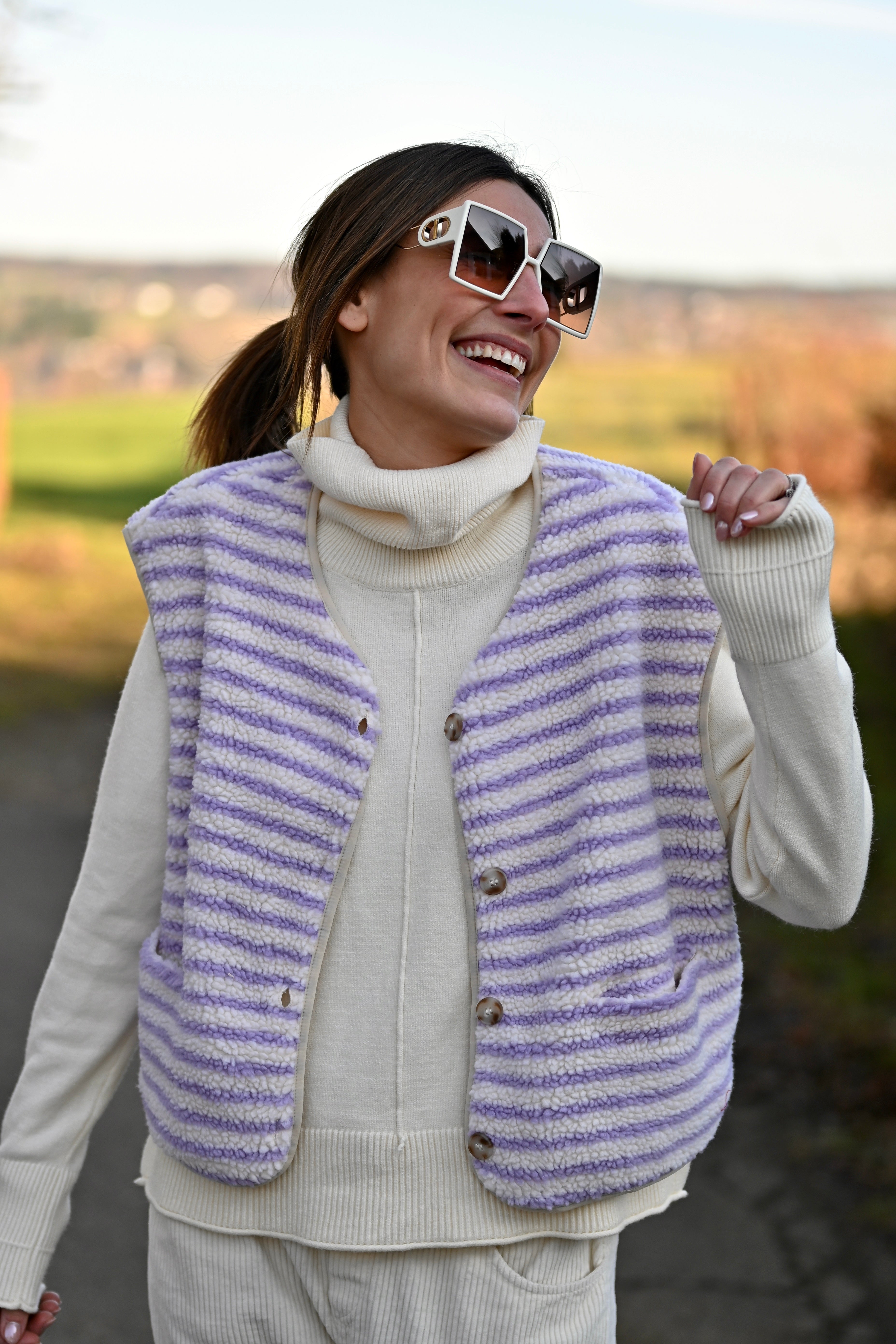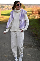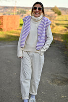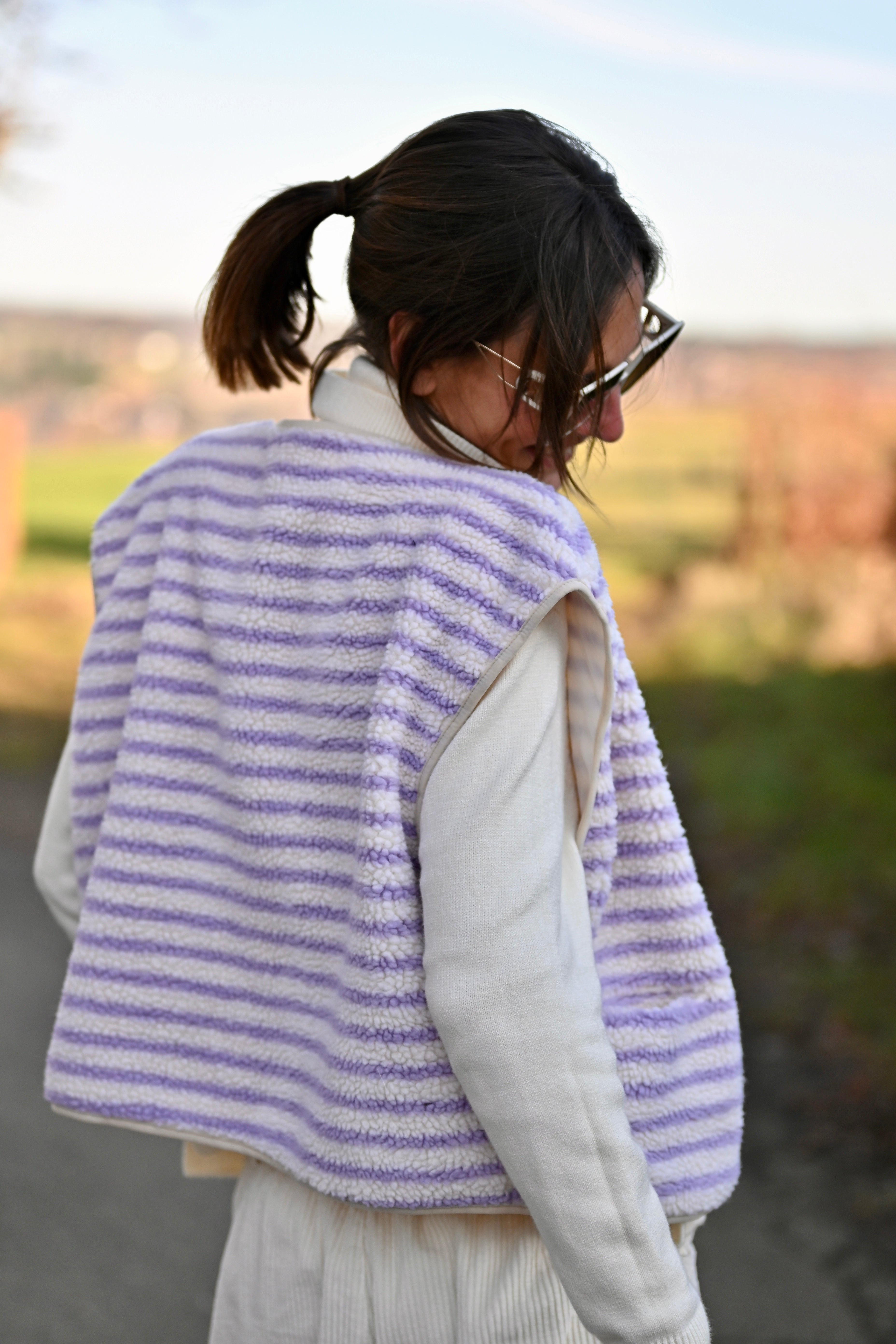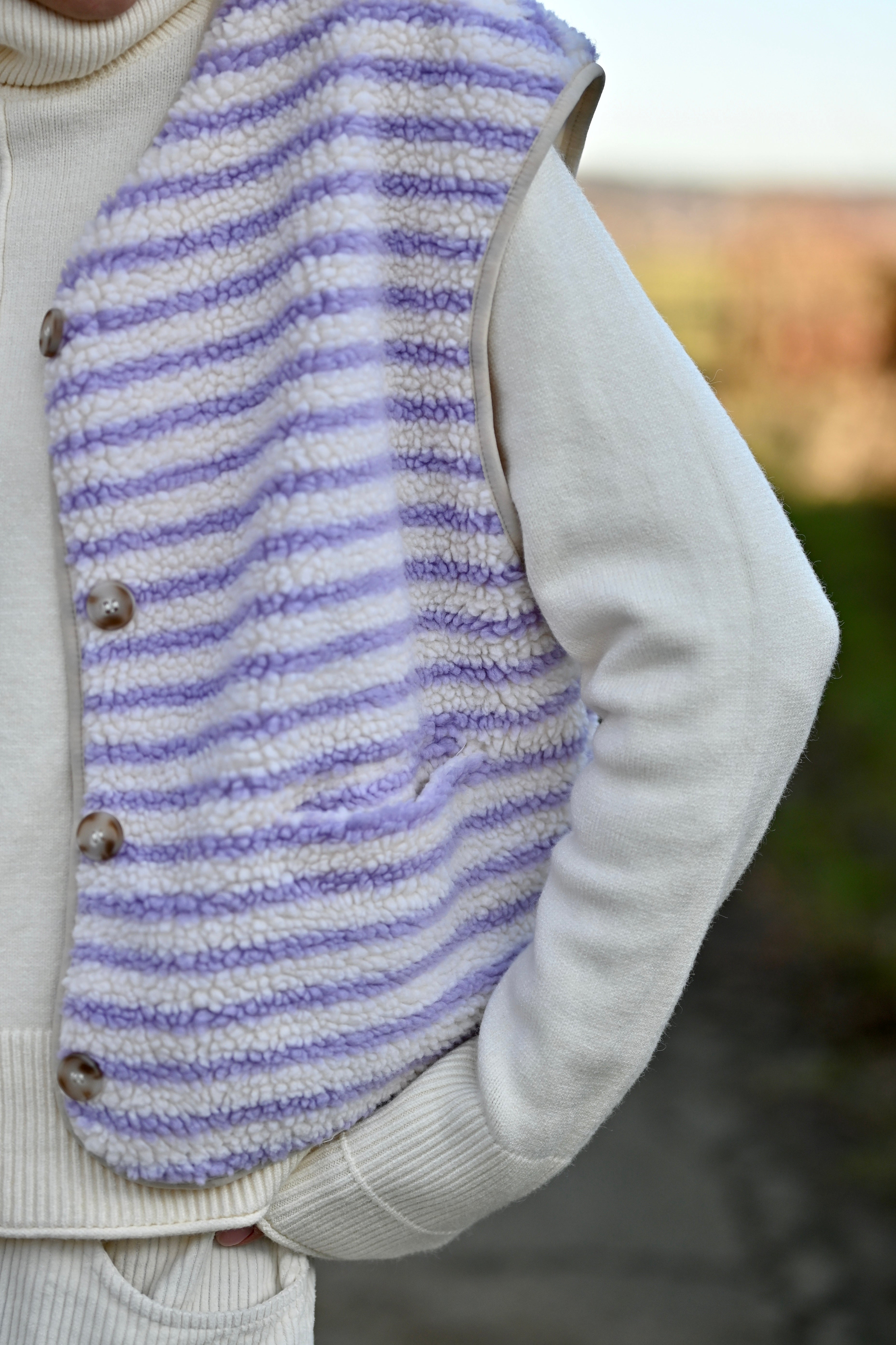 Découvrez la Veste ZAIA, son design sans manches allie élégance et confort avec sa doublure moumoute aux teintes lilas et blanc cassé. Disponible en S/M ou M/L pour un ajustement parfait.