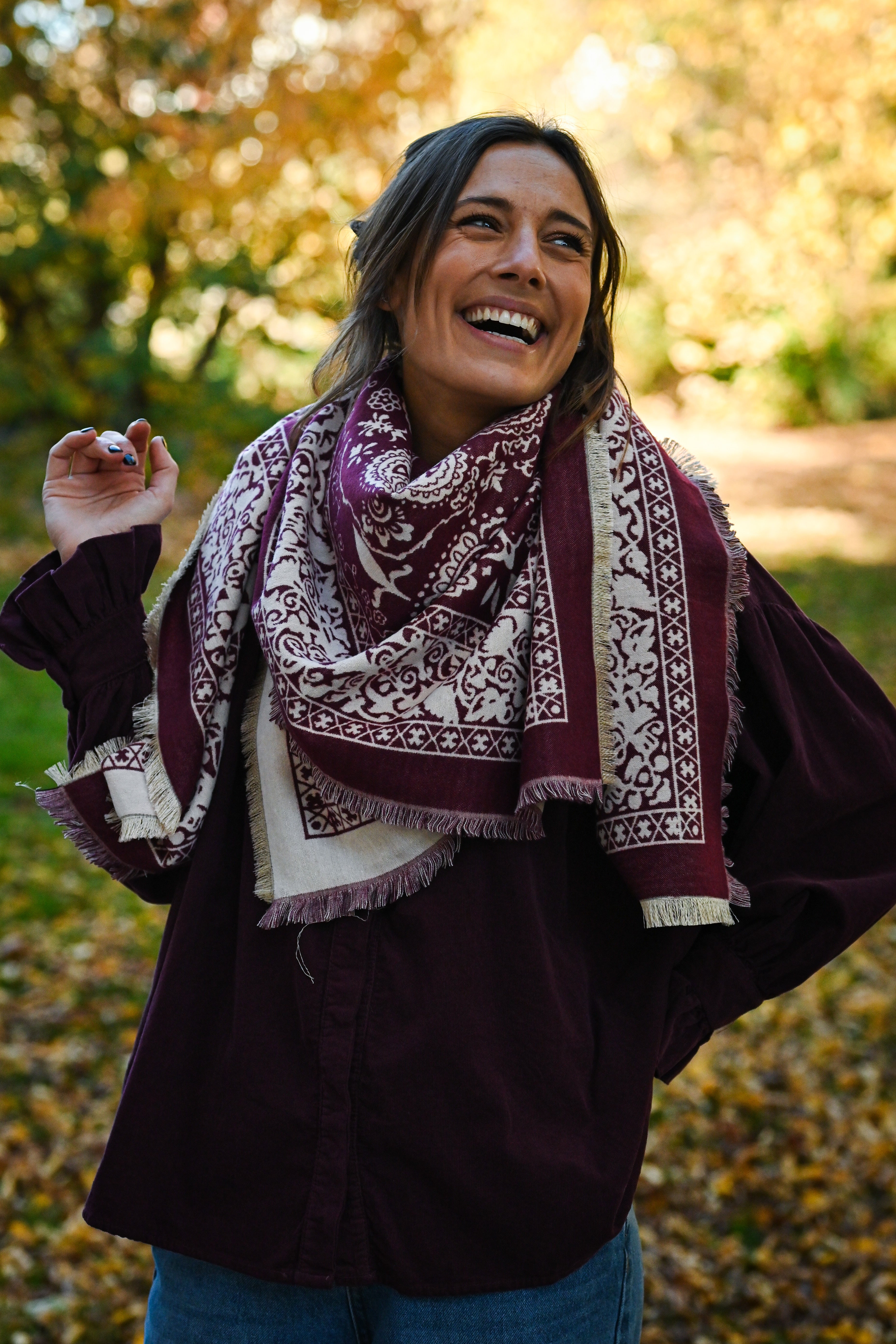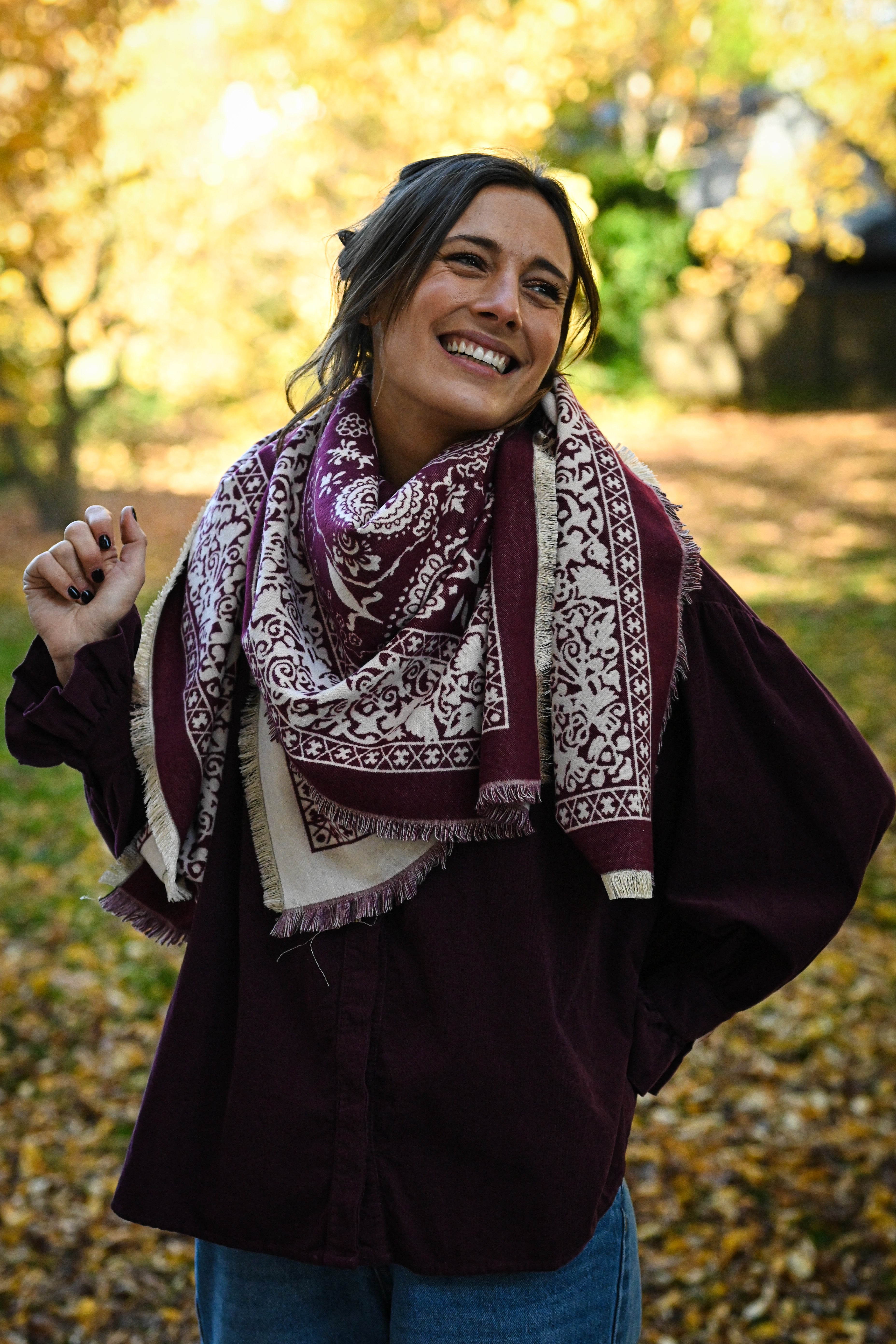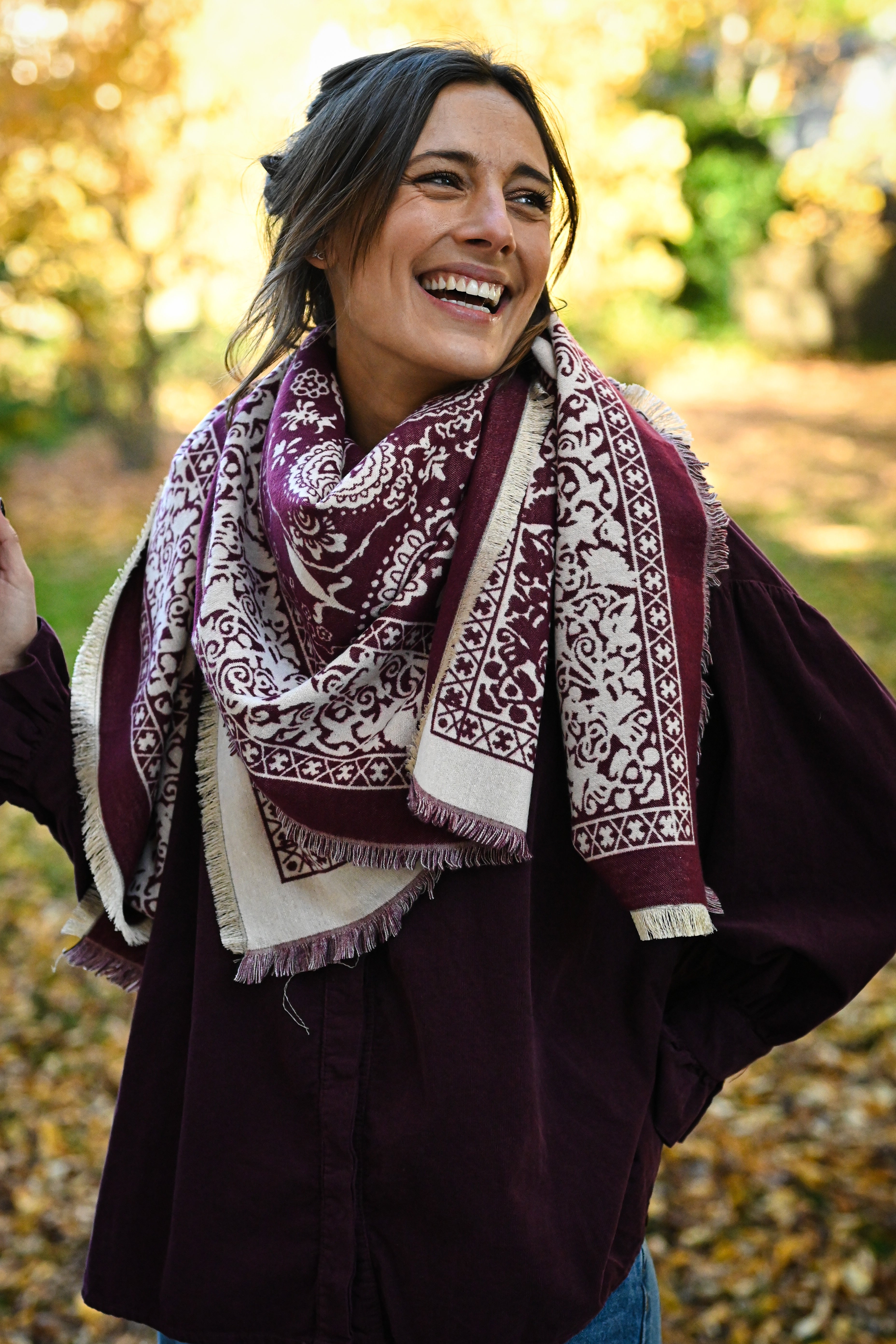 Découvrez l'Écharpe CAMILLE, une pièce incontournable qui allie élégance et confort. Son design raffiné combine des teintes bordeaux et blanc cassé dans un motif captivant, tandis que les délicates franges qui ornent les bords ajoutent une touche de sophistication. Parfaite pour sublimer vos tenues, cette écharpe devient rapidement un accessoire indispensable de votre garde-robe.