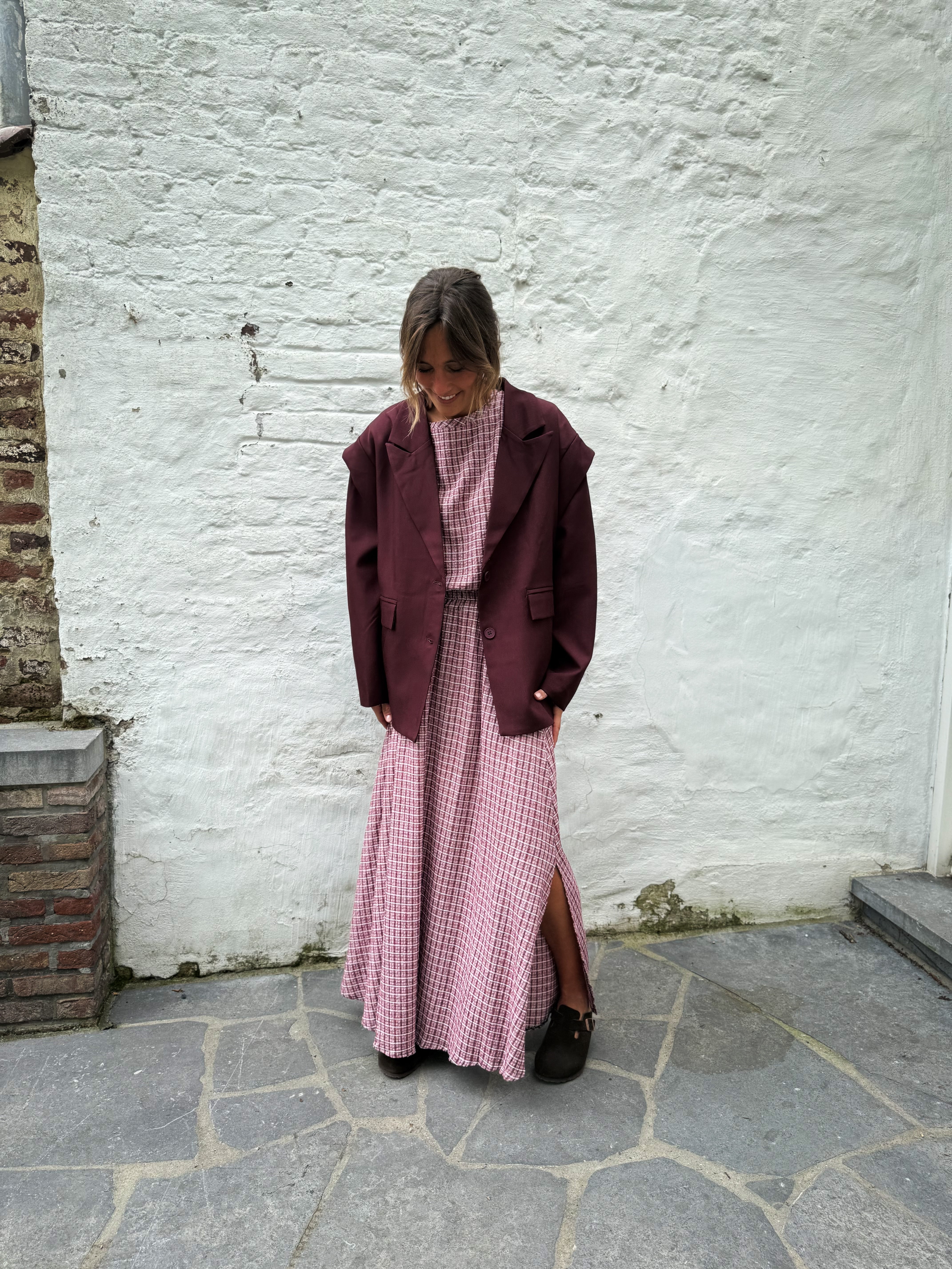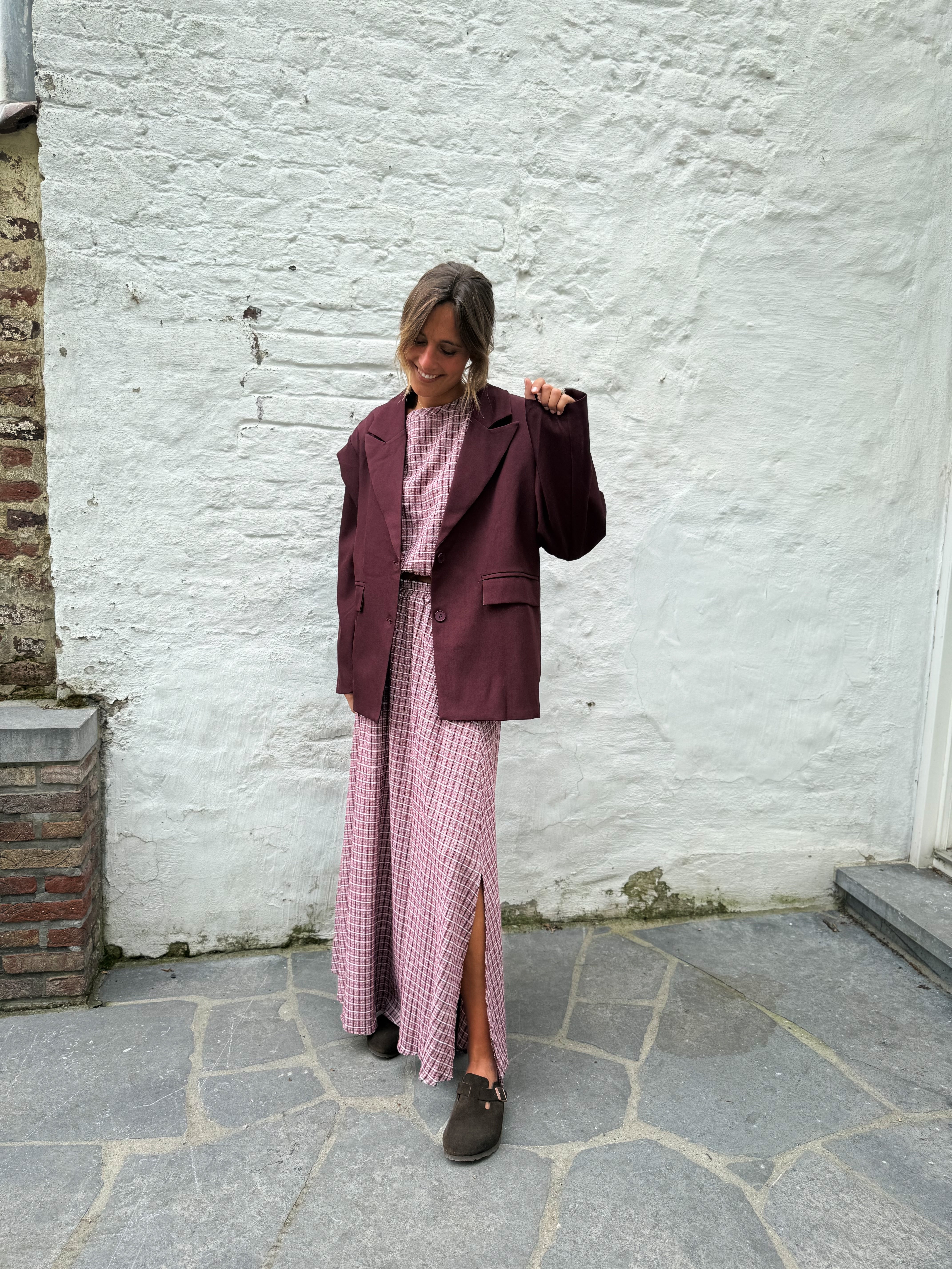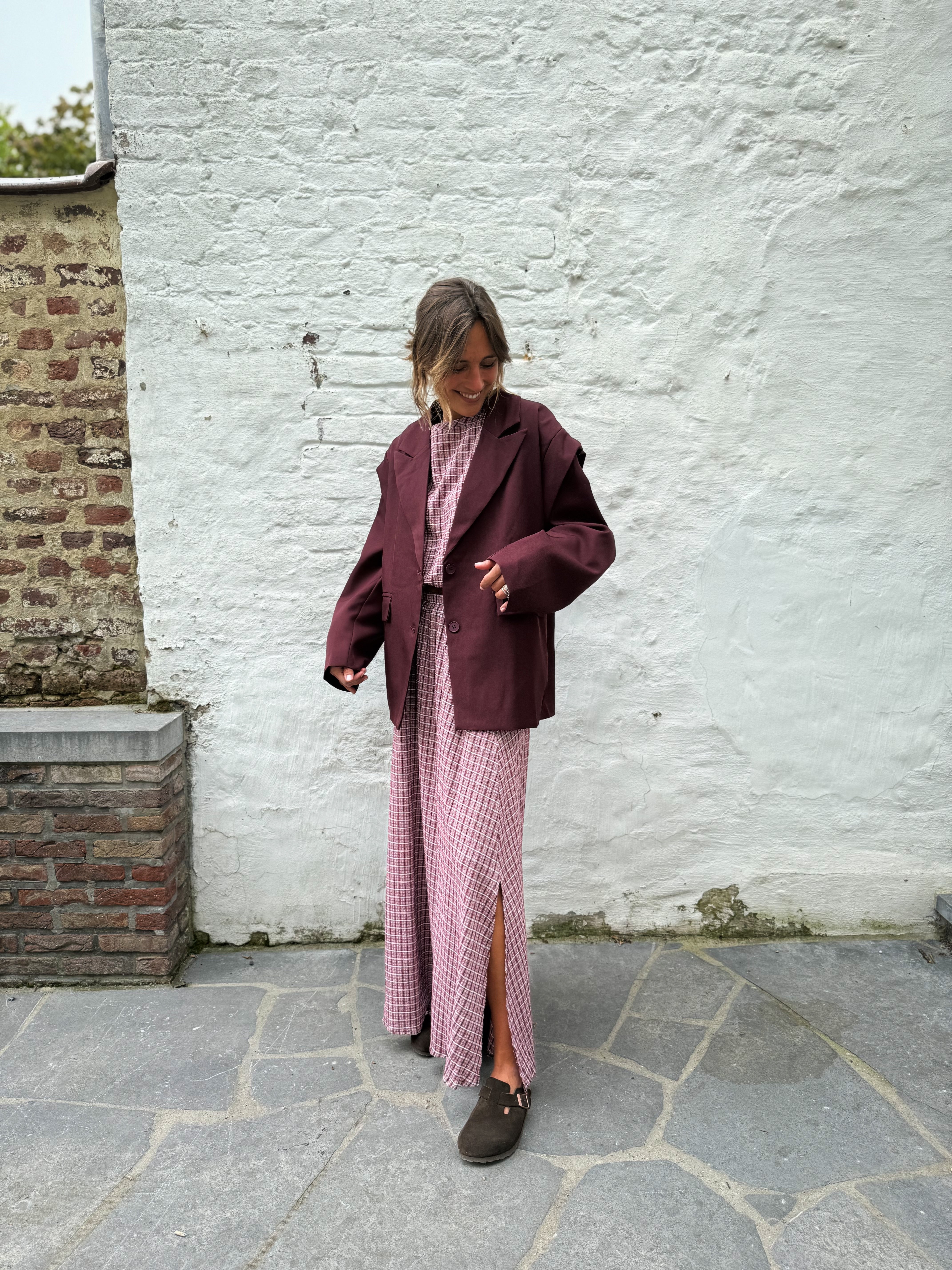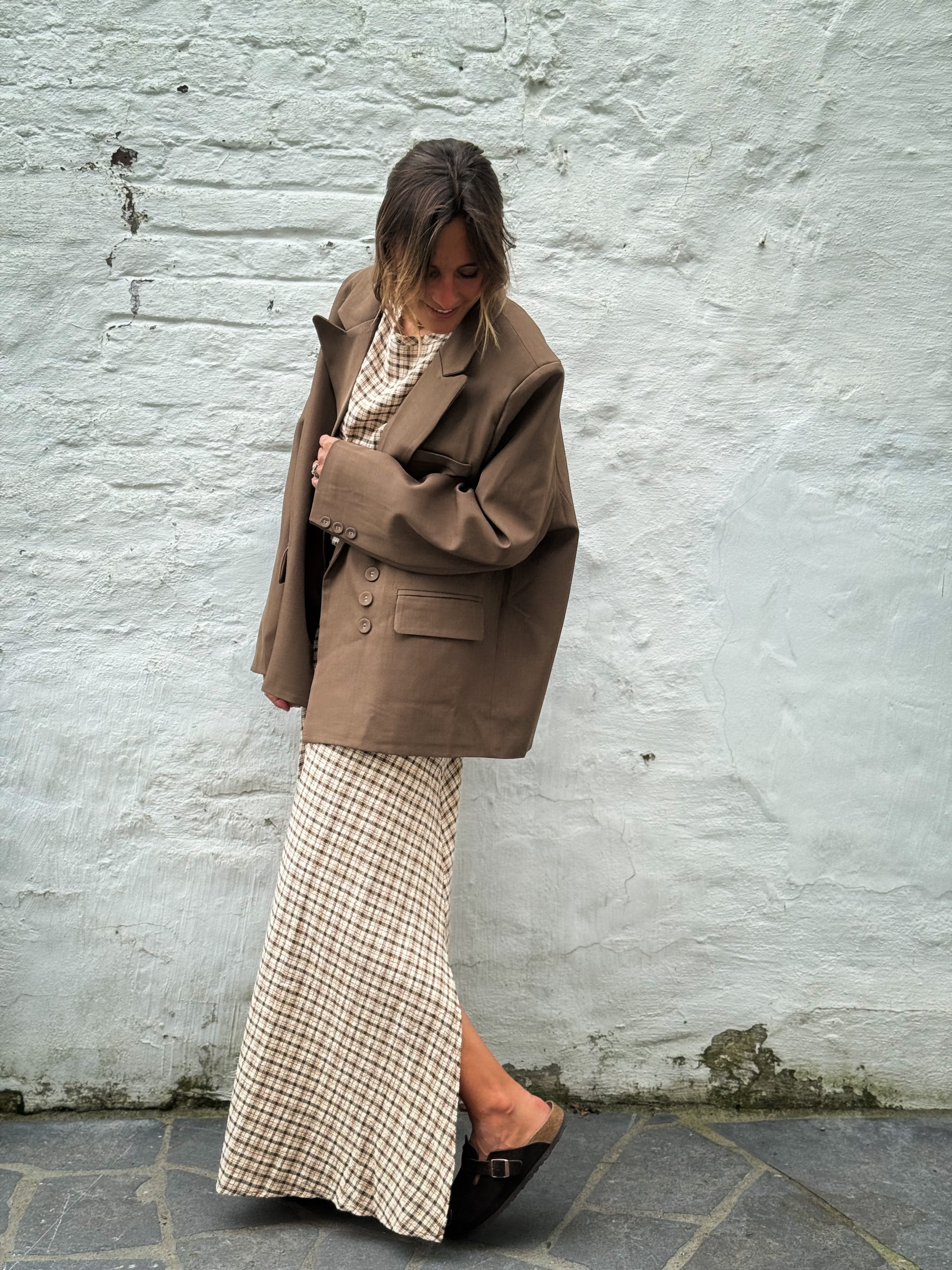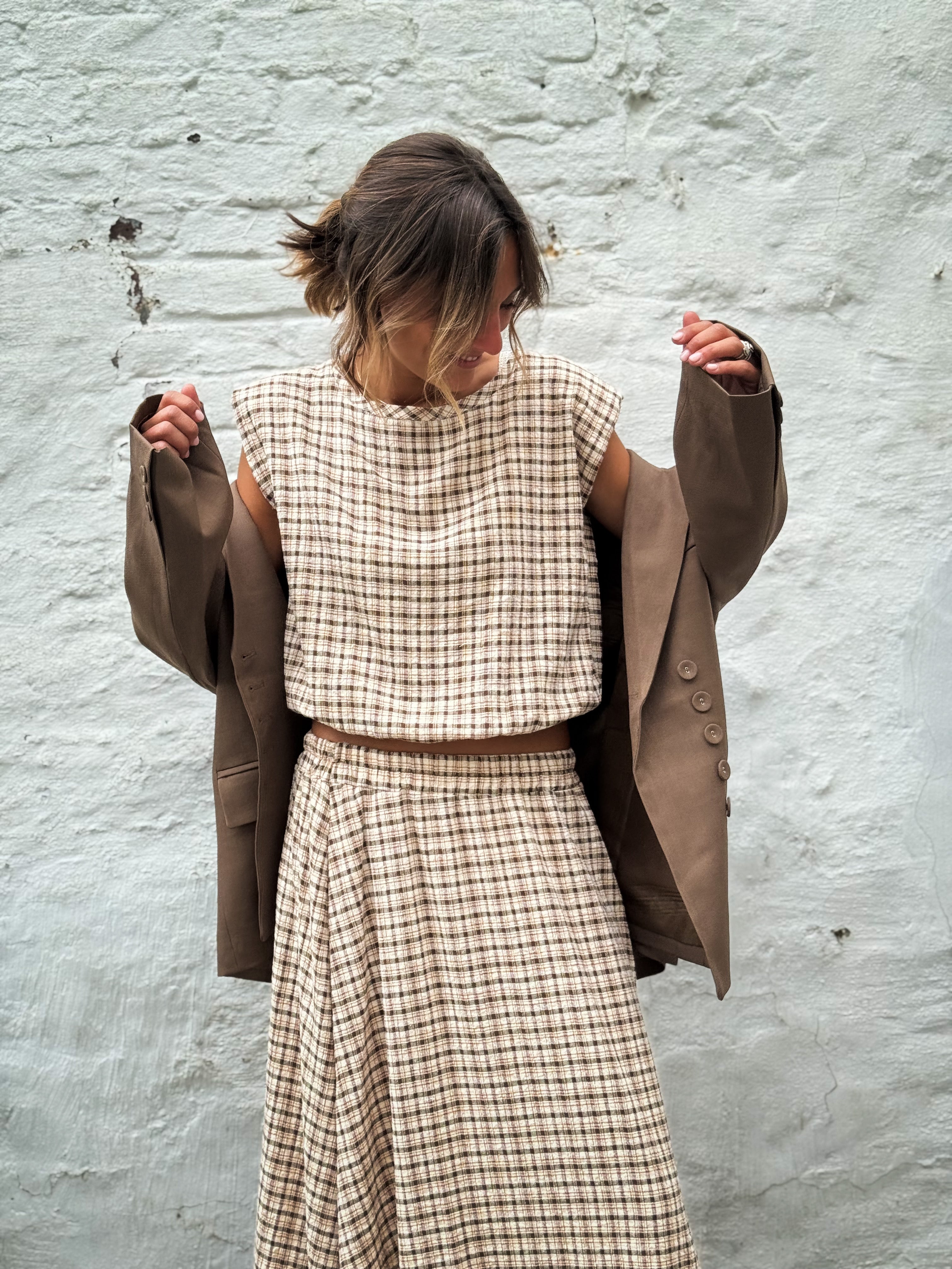Cette blouse courte, cintrée à la taille grâce à un élastique, est sans manches et dotée de petites épaulettes délicates. Elle se décline en motifs à carreaux, disponibles en prune et en beige, pour un style à la fois tendance et élégant. Elle est disponible en taille S/M et en taille M/L.