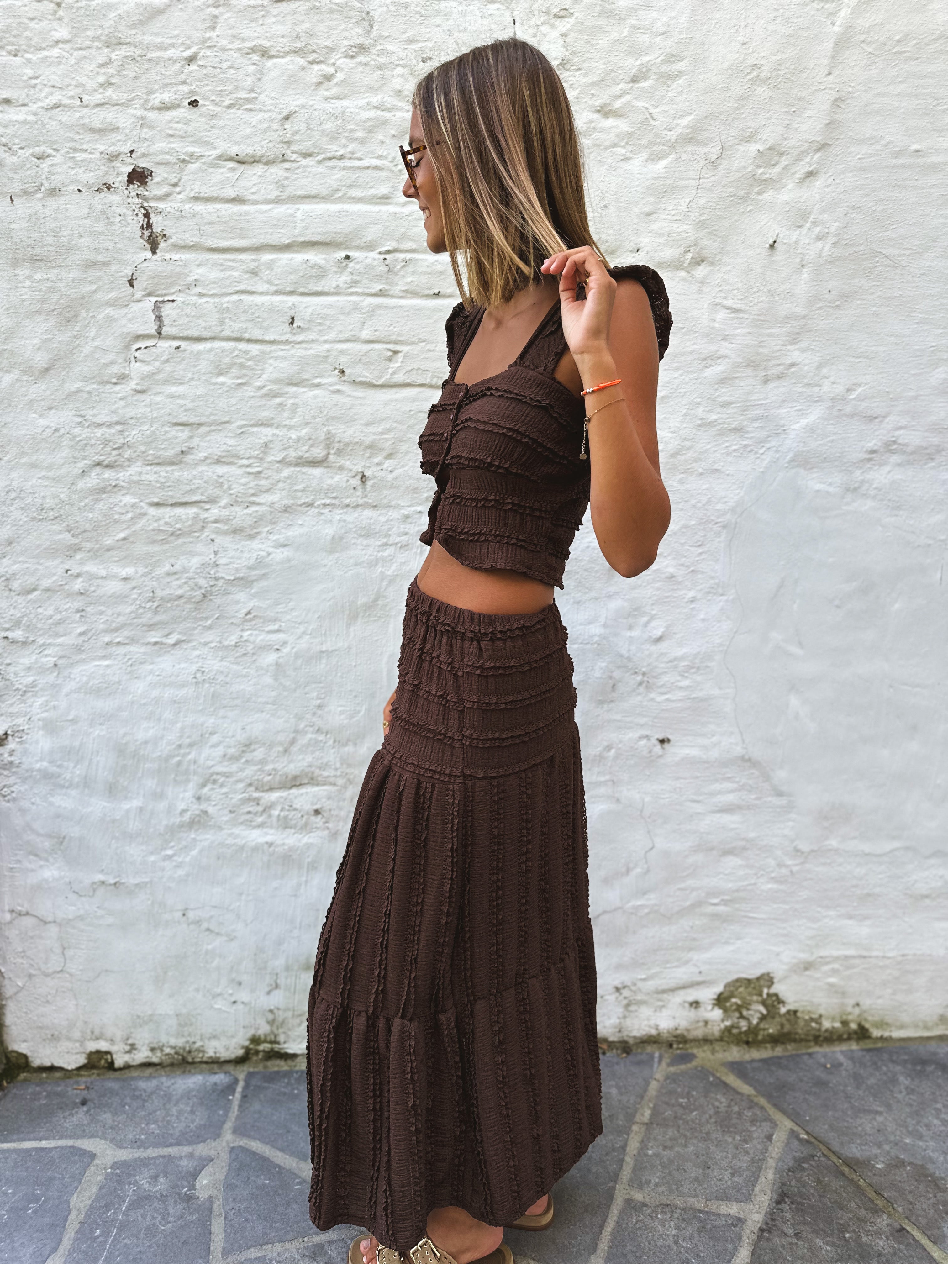 Découvrez l'ensemble Clemence, composé d'une jupe et d'un top court en dentelle délicate avec doublure en voilage. Le top se ferme élégamment grâce à des boutons et offre une coupe courte tendance. Disponible en tailles SM et ML, cet ensemble sublime votre silhouette avec raffinement.