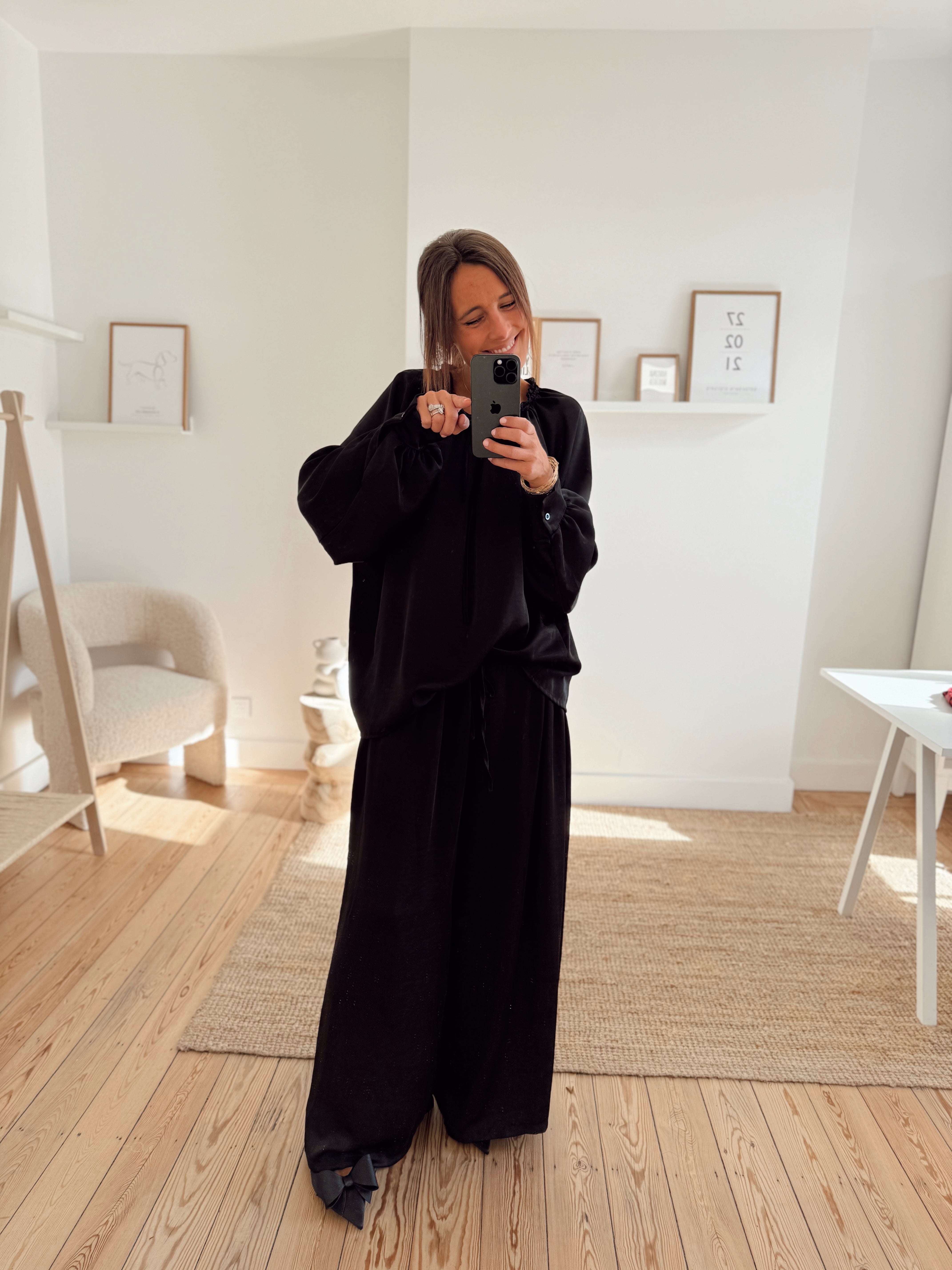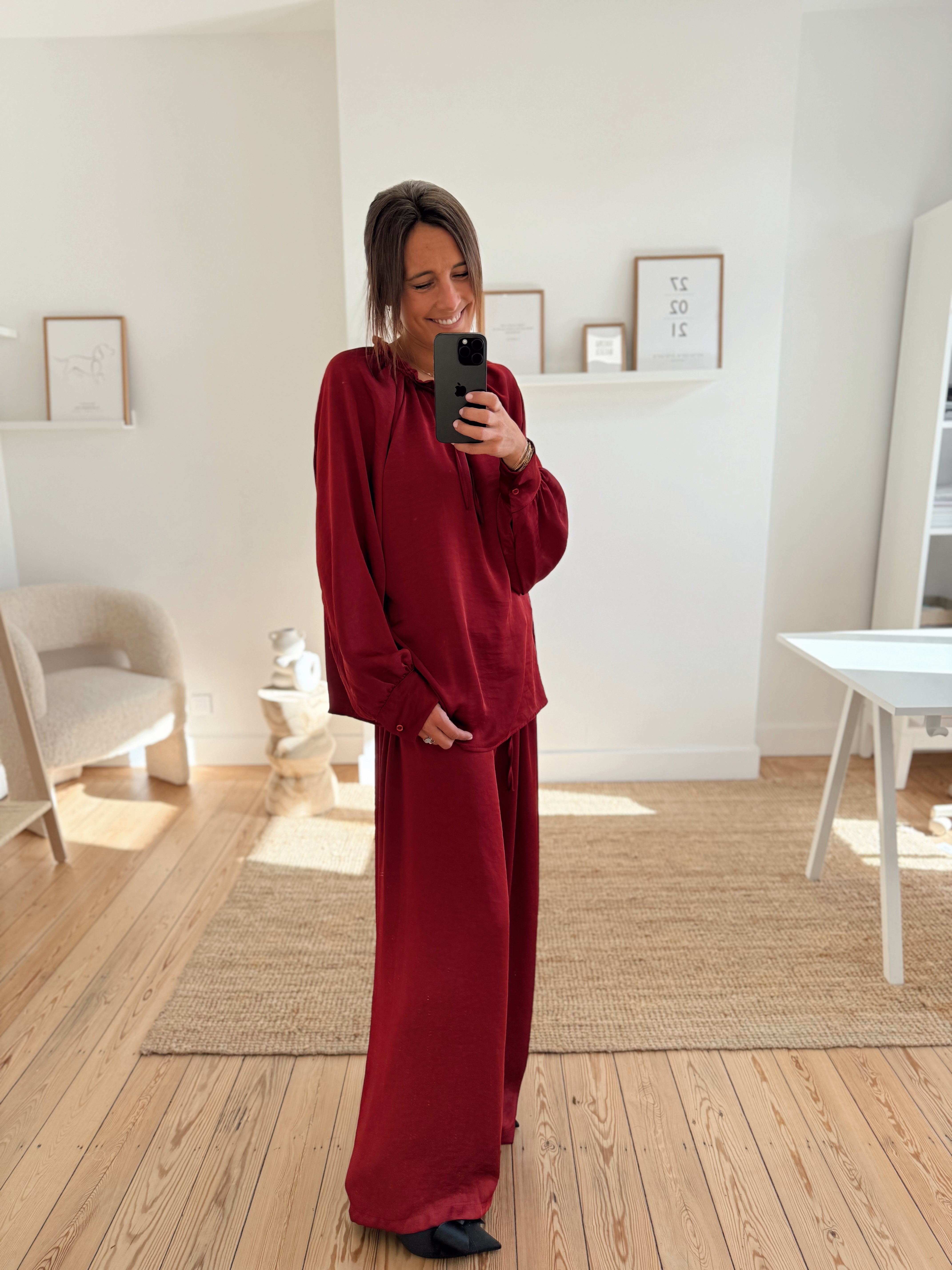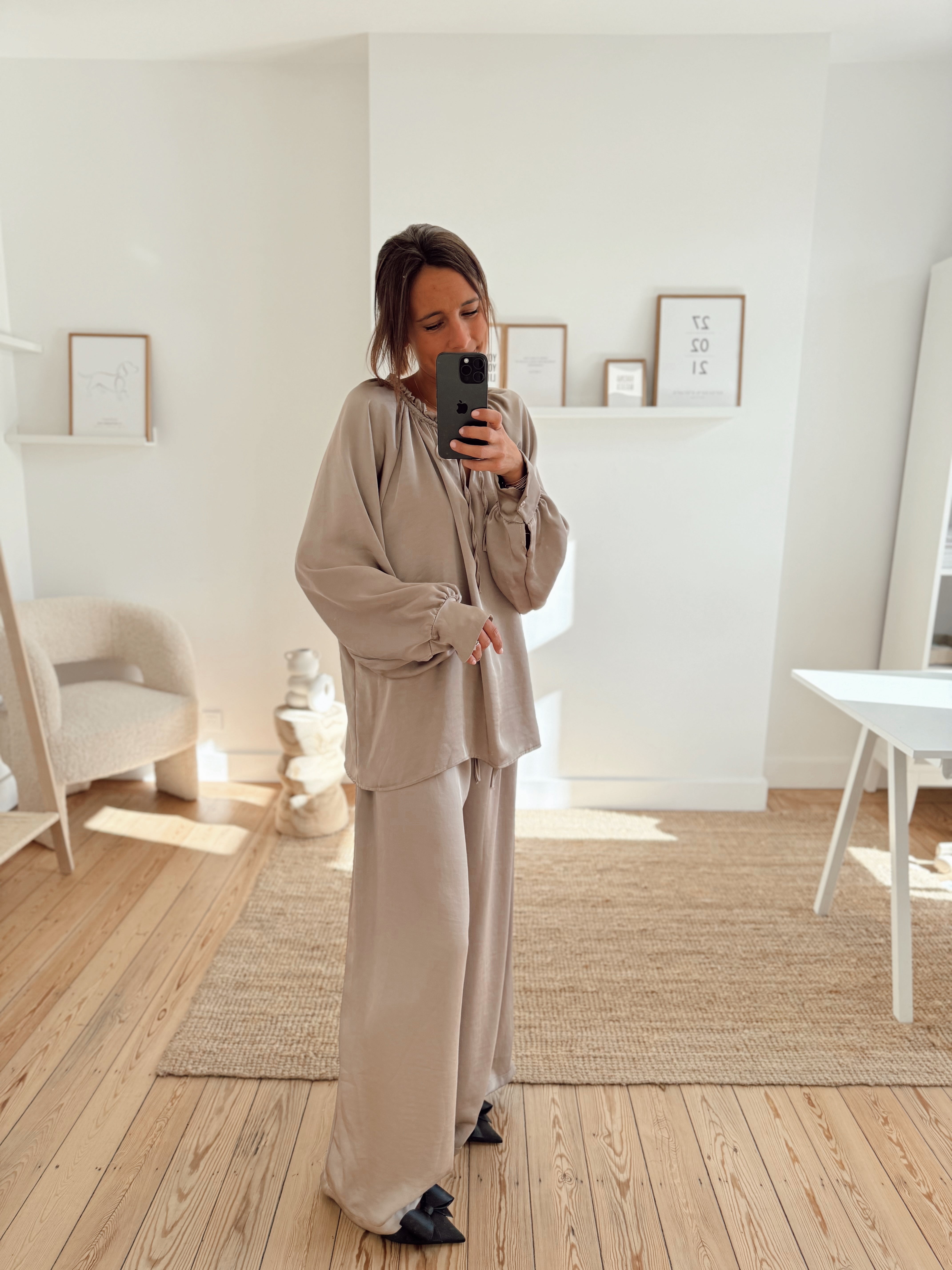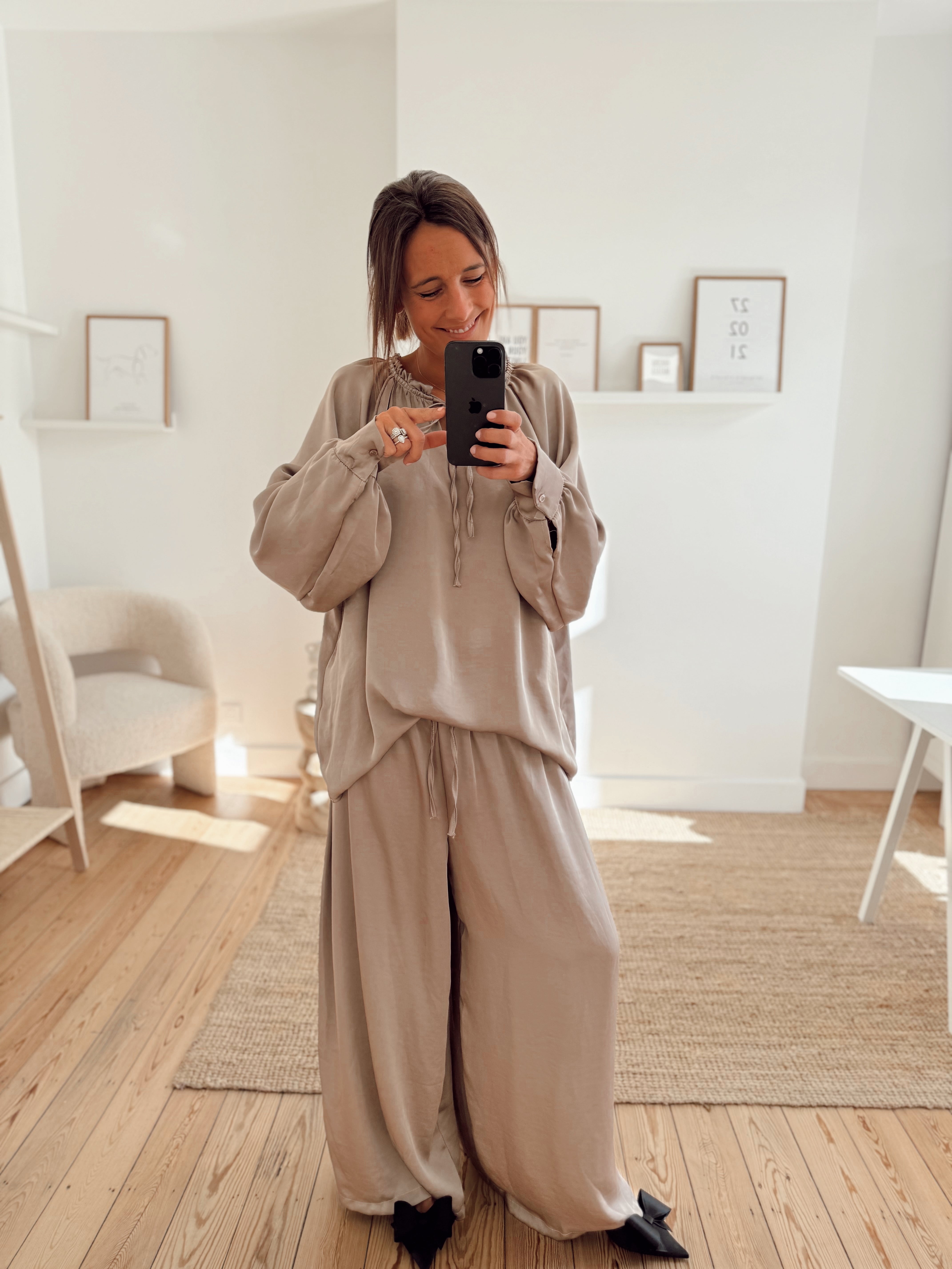Cet ensemble en satin fluide se compose d’un pantalon doté d’une taille élastique et d’une blouse sans col équipée de deux cordelettes pour ajuster le col selon vos envies. La taille unique s’adapte aisément du 34 au 46, alliant style et confort.