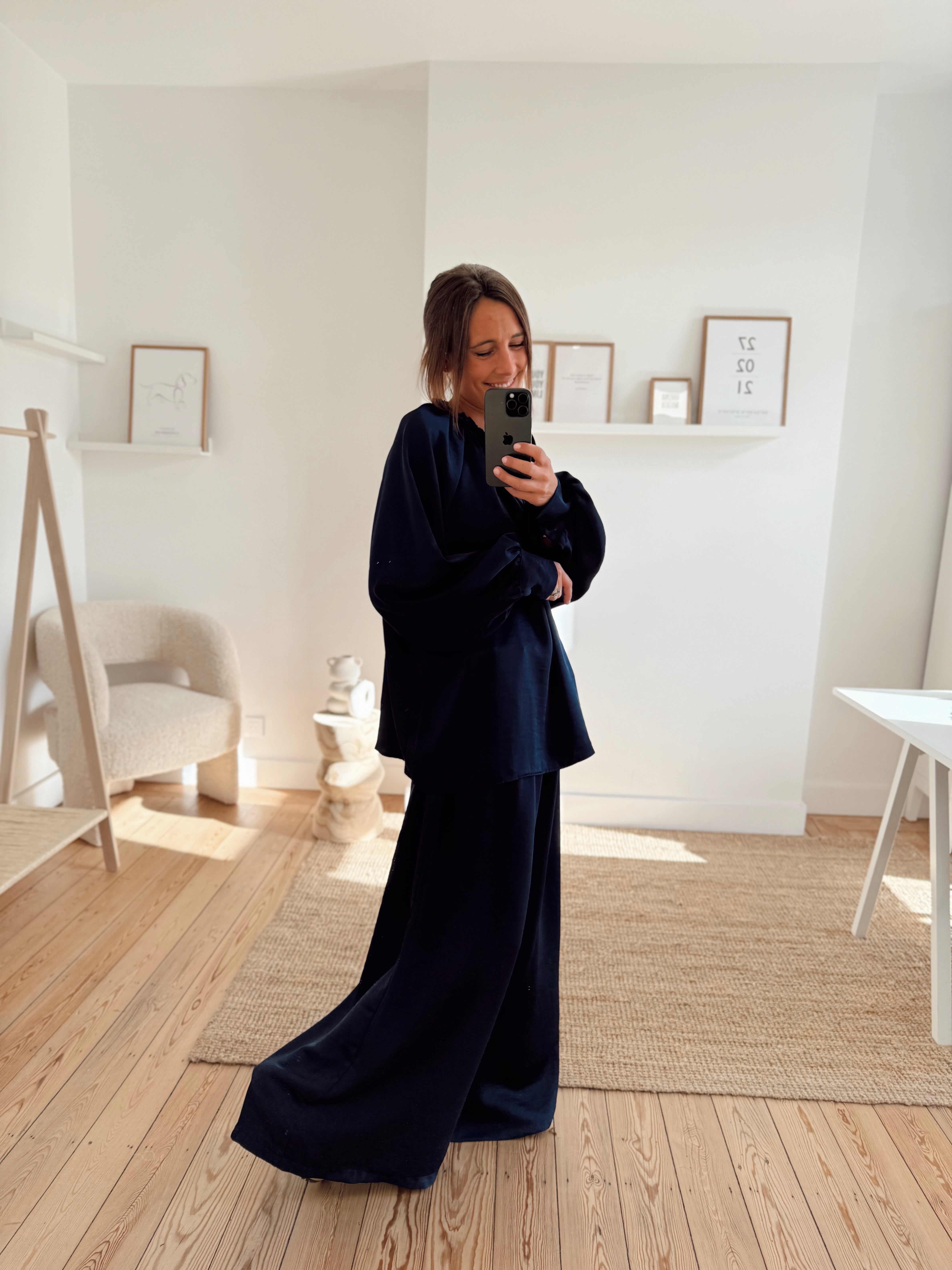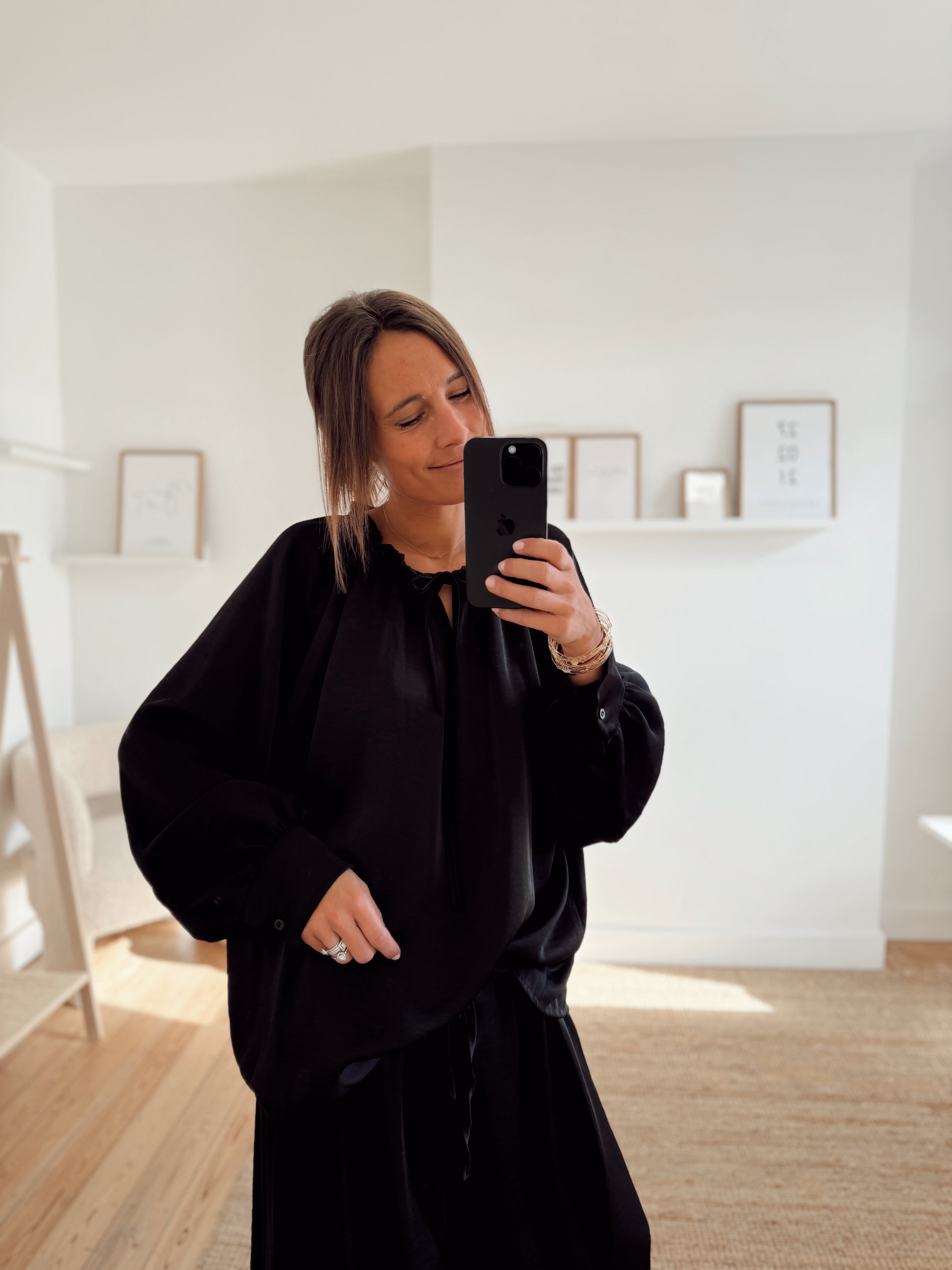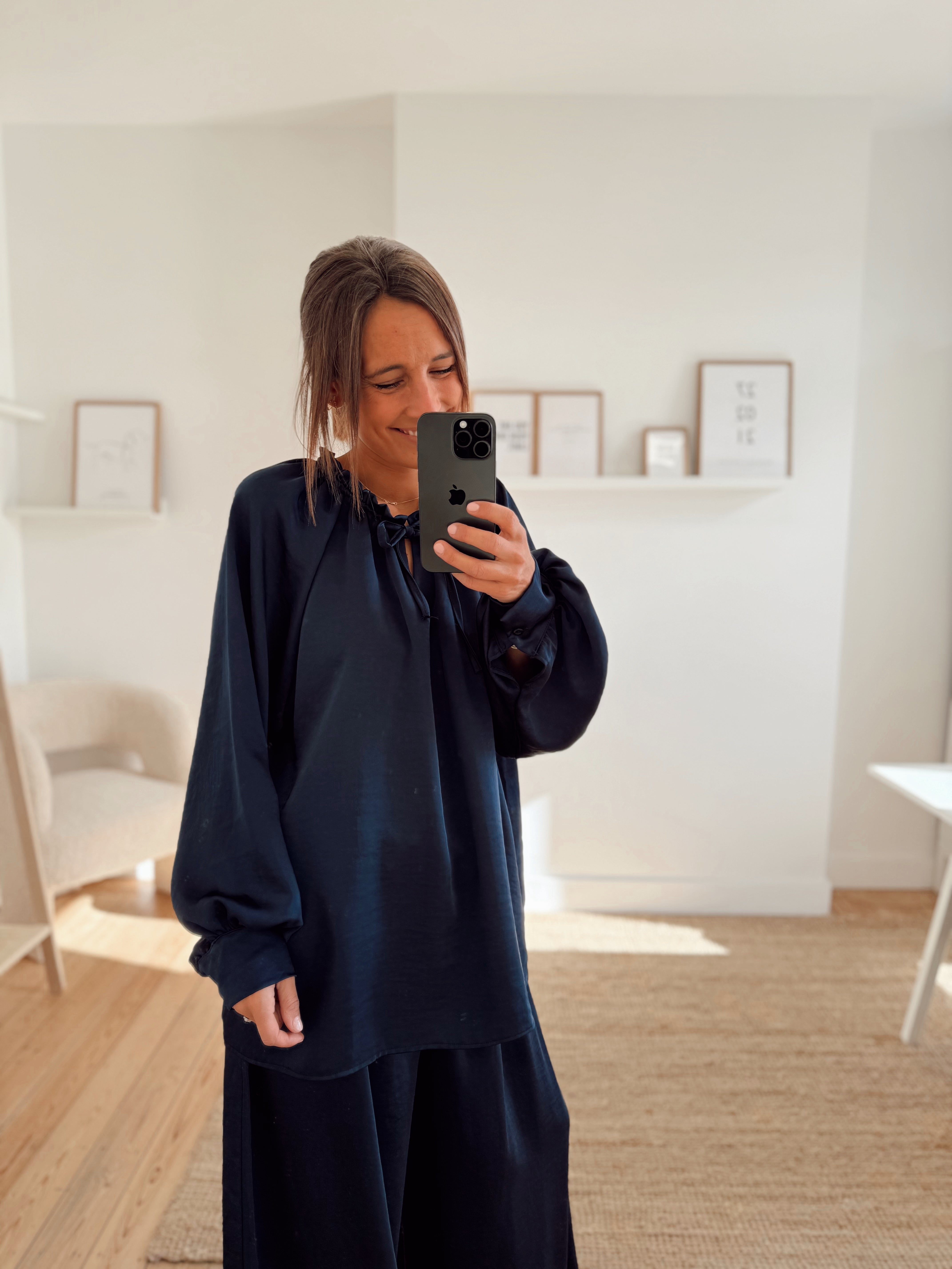 Cet ensemble en satin fluide se compose d’un pantalon doté d’une taille élastique et d’une blouse sans col équipée de deux cordelettes pour ajuster le col selon vos envies. La taille unique s’adapte aisément du 34 au 46, alliant style et confort.