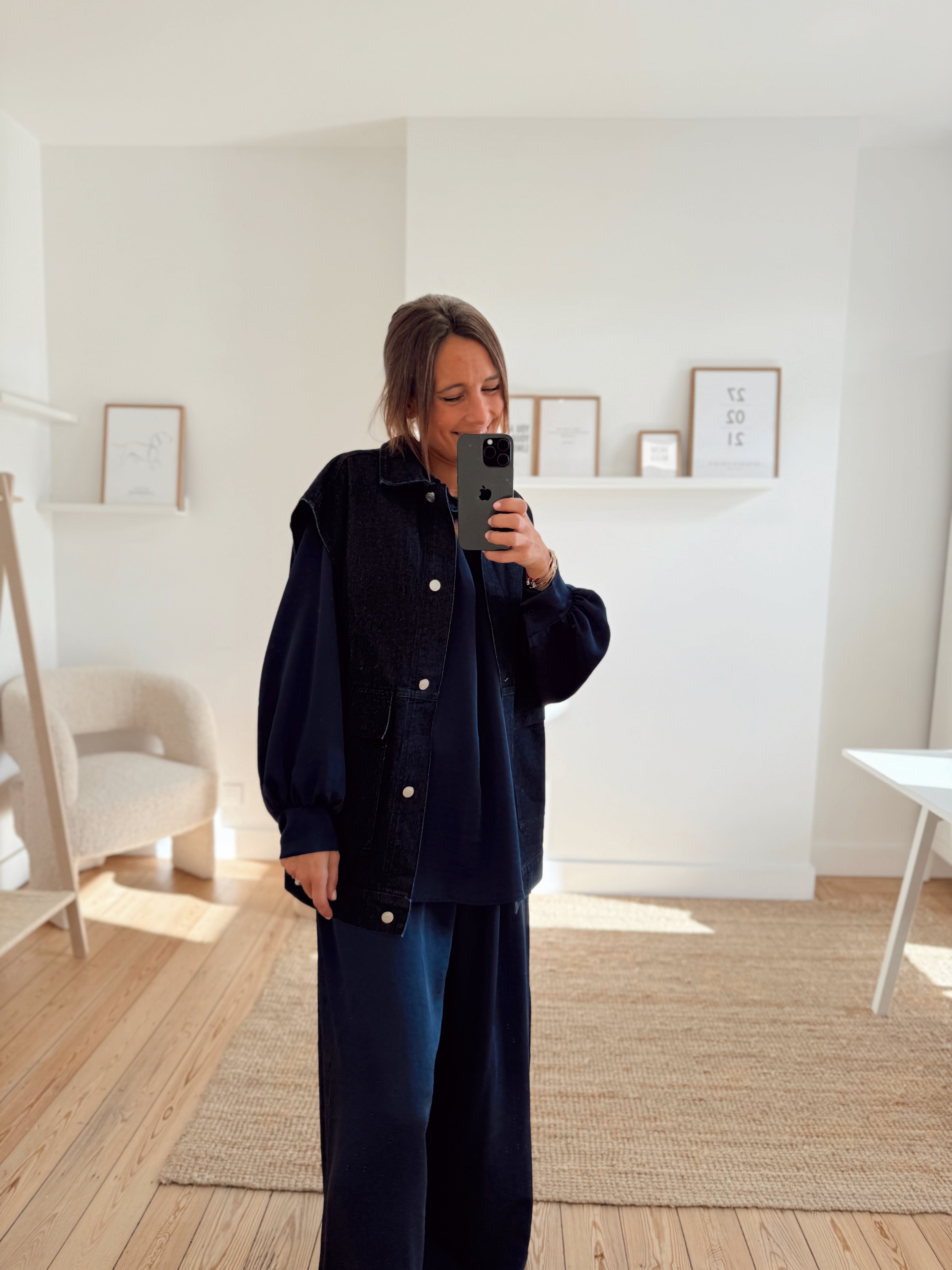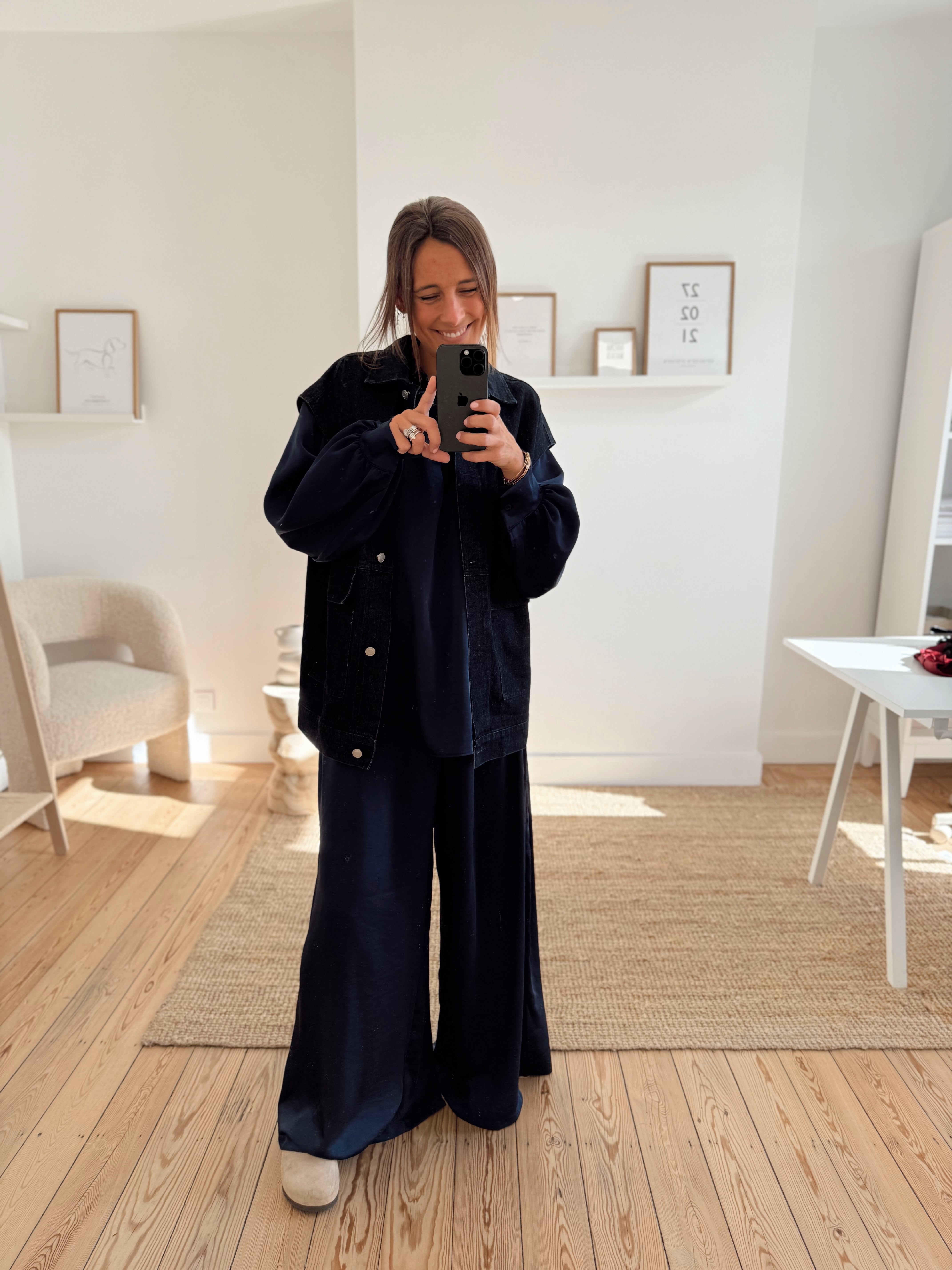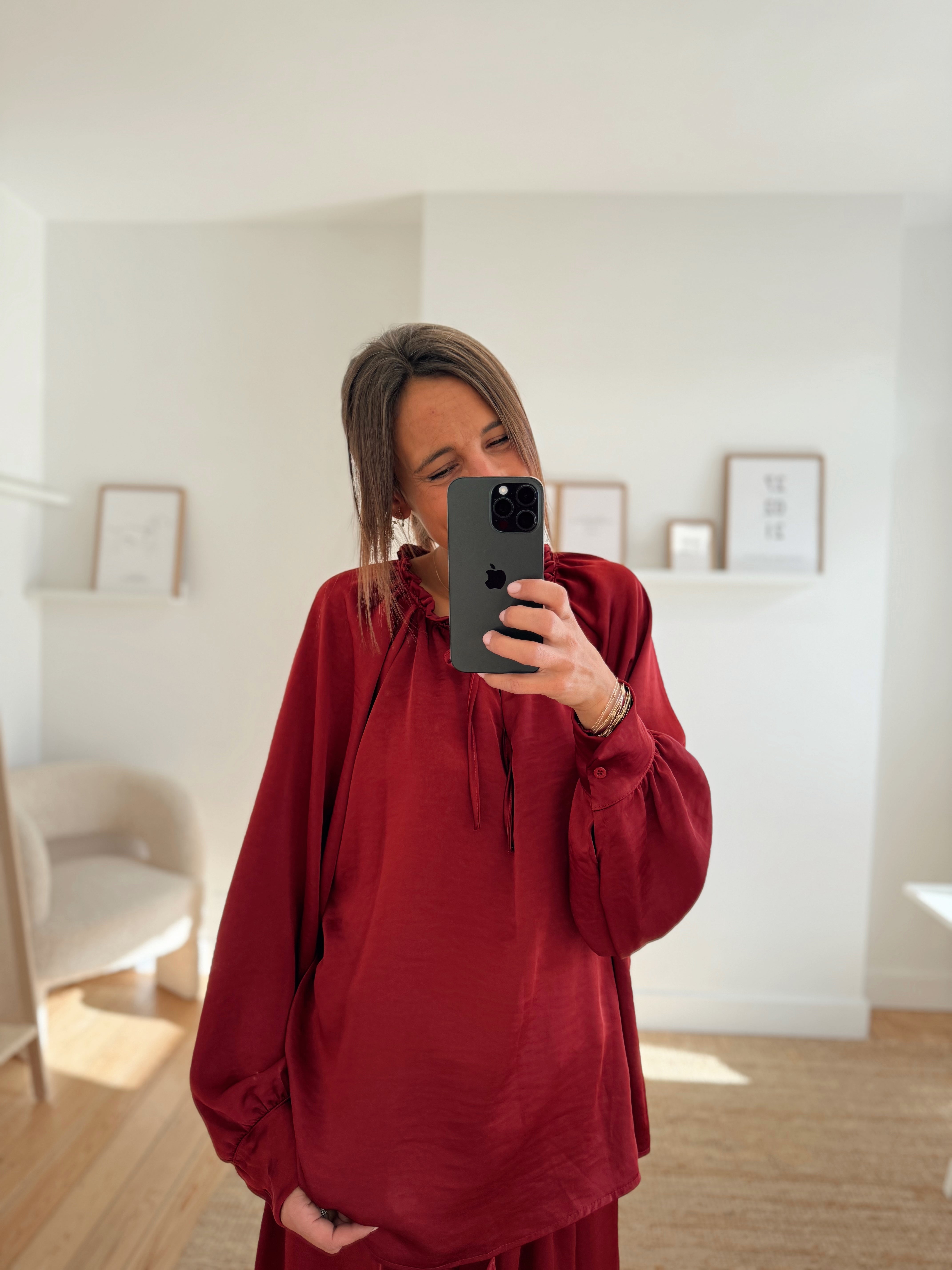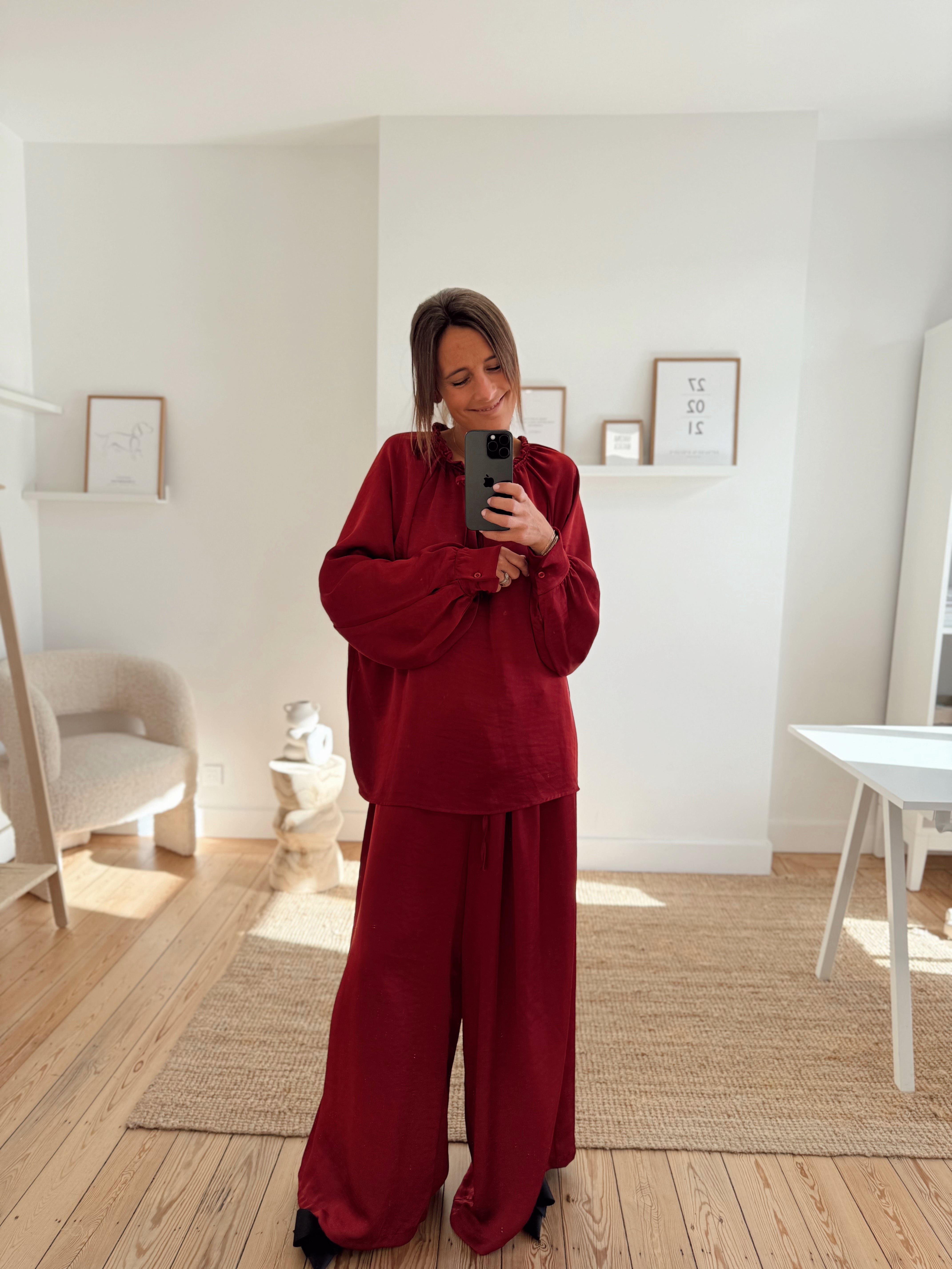 Cet ensemble en satin fluide se compose d’un pantalon doté d’une taille élastique et d’une blouse sans col équipée de deux cordelettes pour ajuster le col selon vos envies. La taille unique s’adapte aisément du 34 au 46, alliant style et confort.