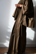 Cette tenue comprend une chemise oversize à manches trois-quarts, conçue pour allier confort et style classique. Des plis élégants ornent le dos de la chemise ainsi que le pantalon ample qui l’accompagne. Disponible en tailles T1 et T2, cet ensemble garantit une allure sophistiquée et décontractée.