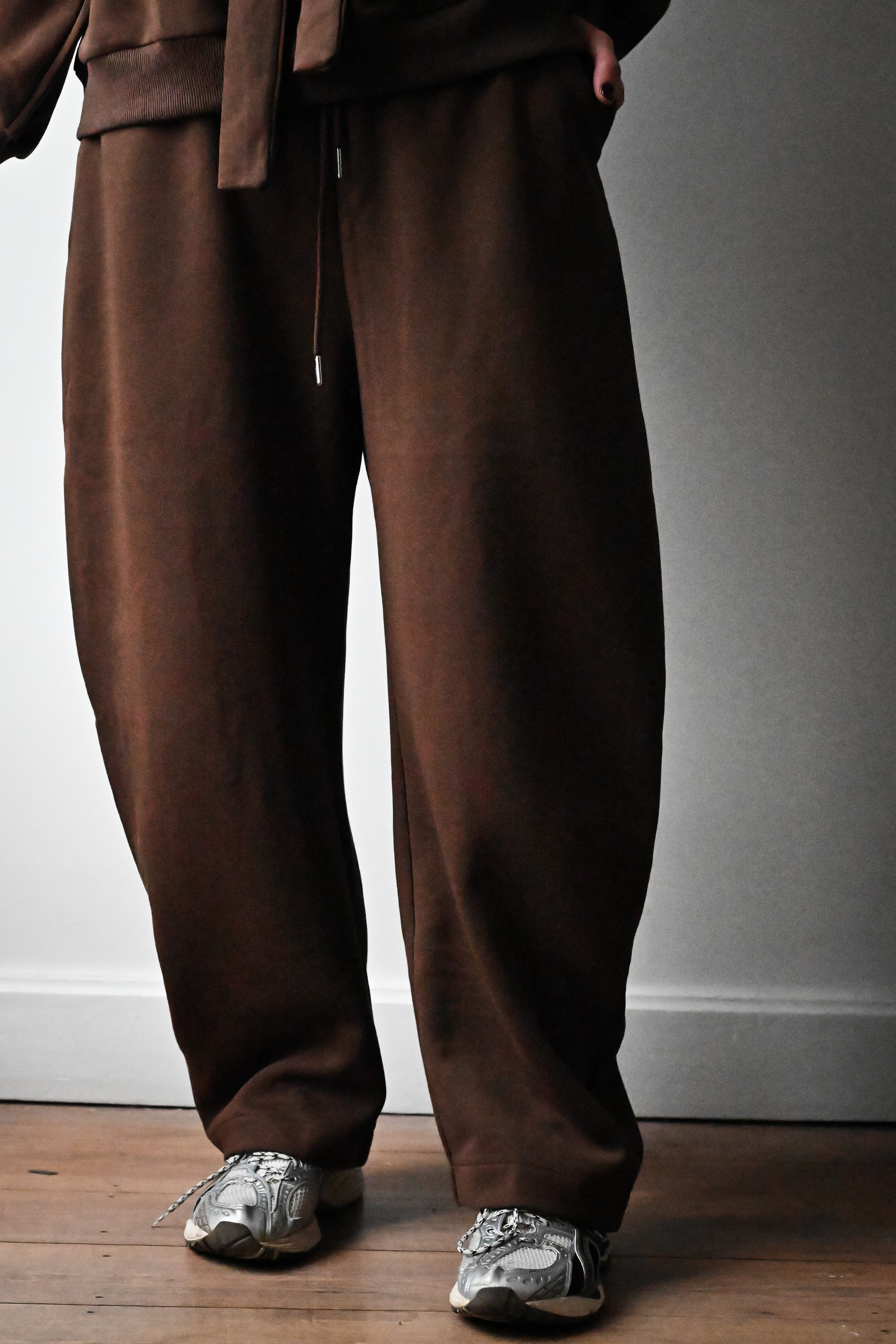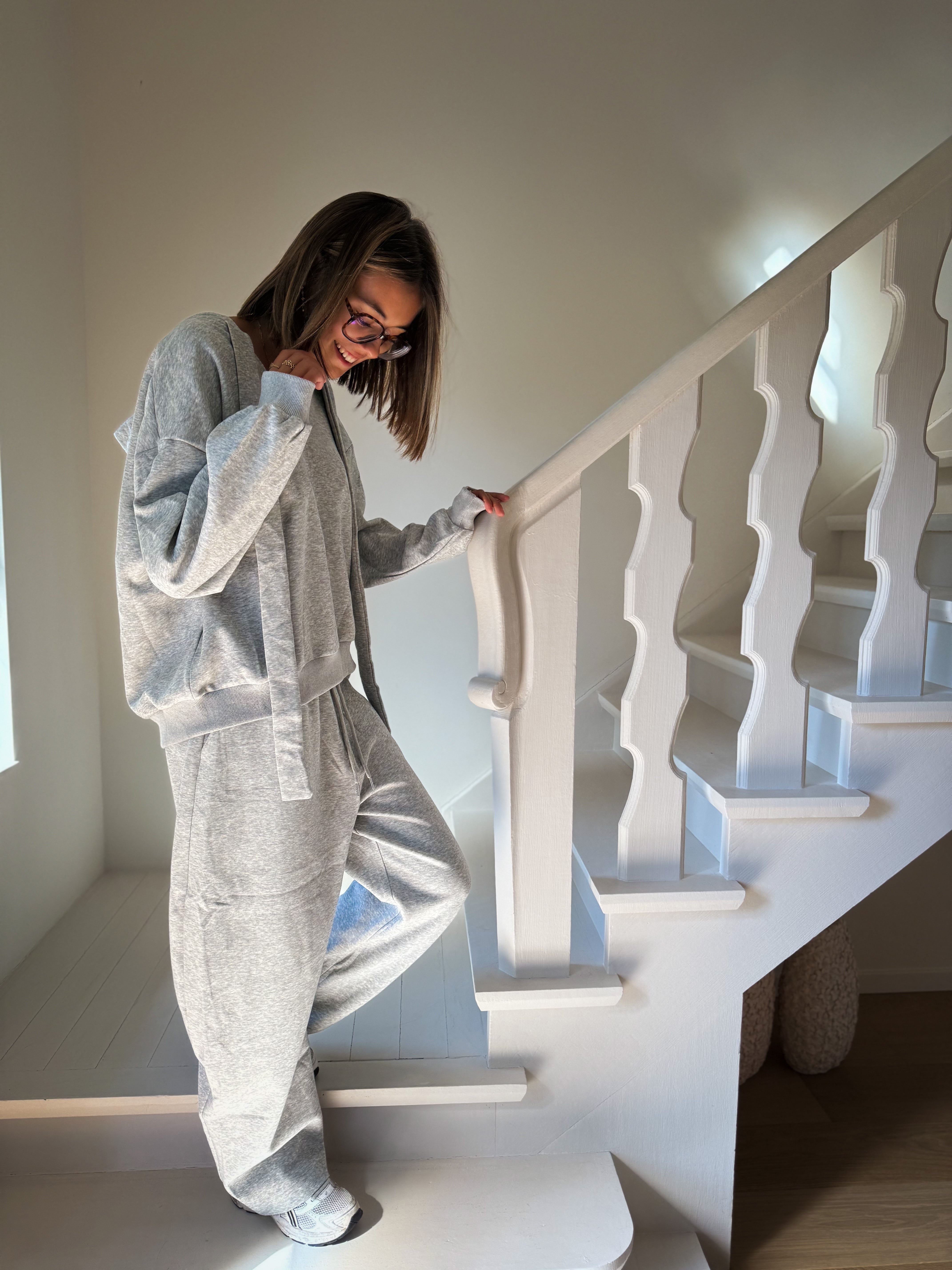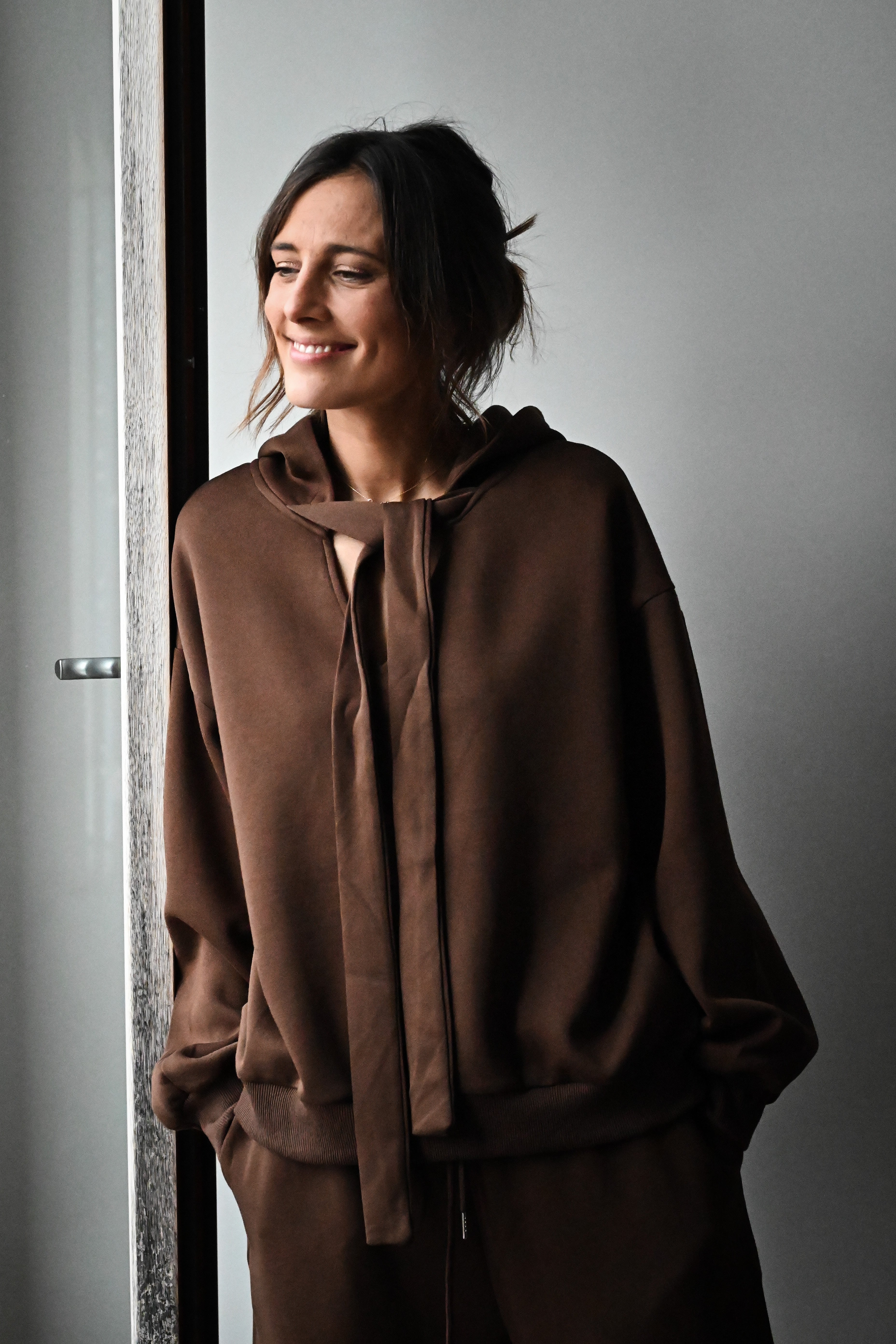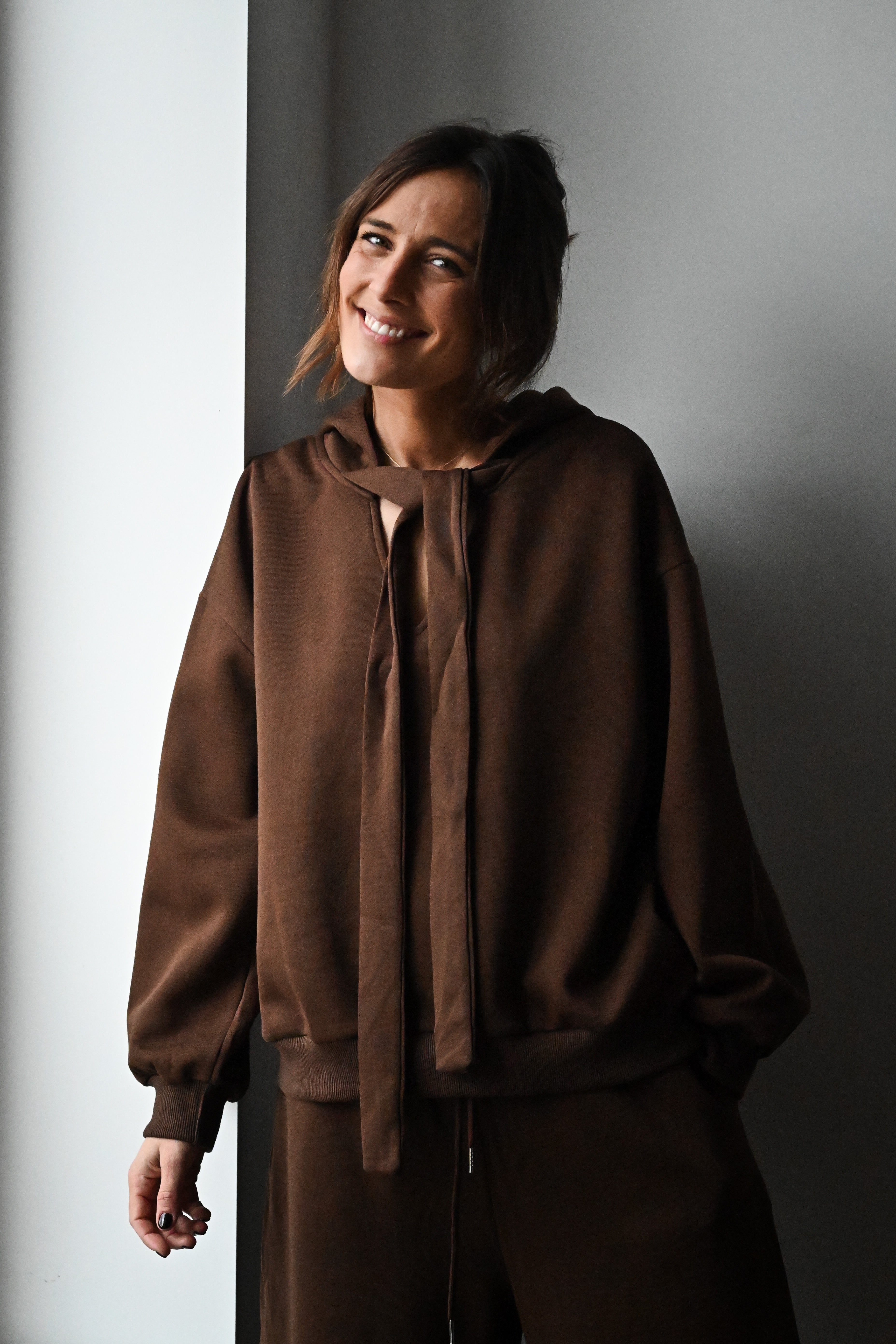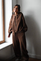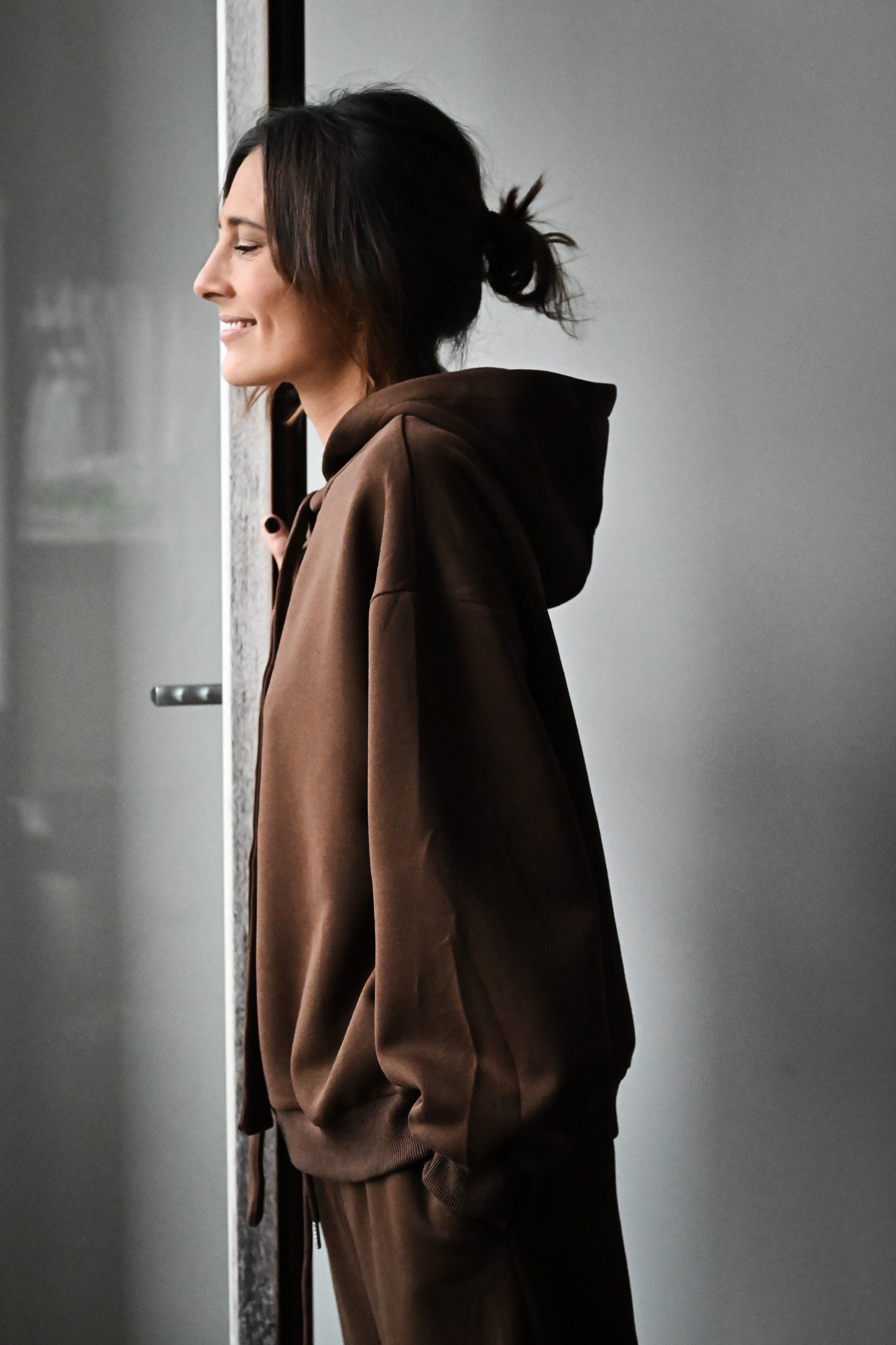 Découvrez cet ensemble en tissu sweat confortable. Le pantalon à coupe barrel se ajuste parfaitement grâce à son cordon de serrage et son élastique à la taille. Le sweat-shirt arbore un col en V, une capuche pratique et deux longs cordons en tissu sweat. Disponible en tailles SM et ML, il allie style et confort pour votre quotidien.