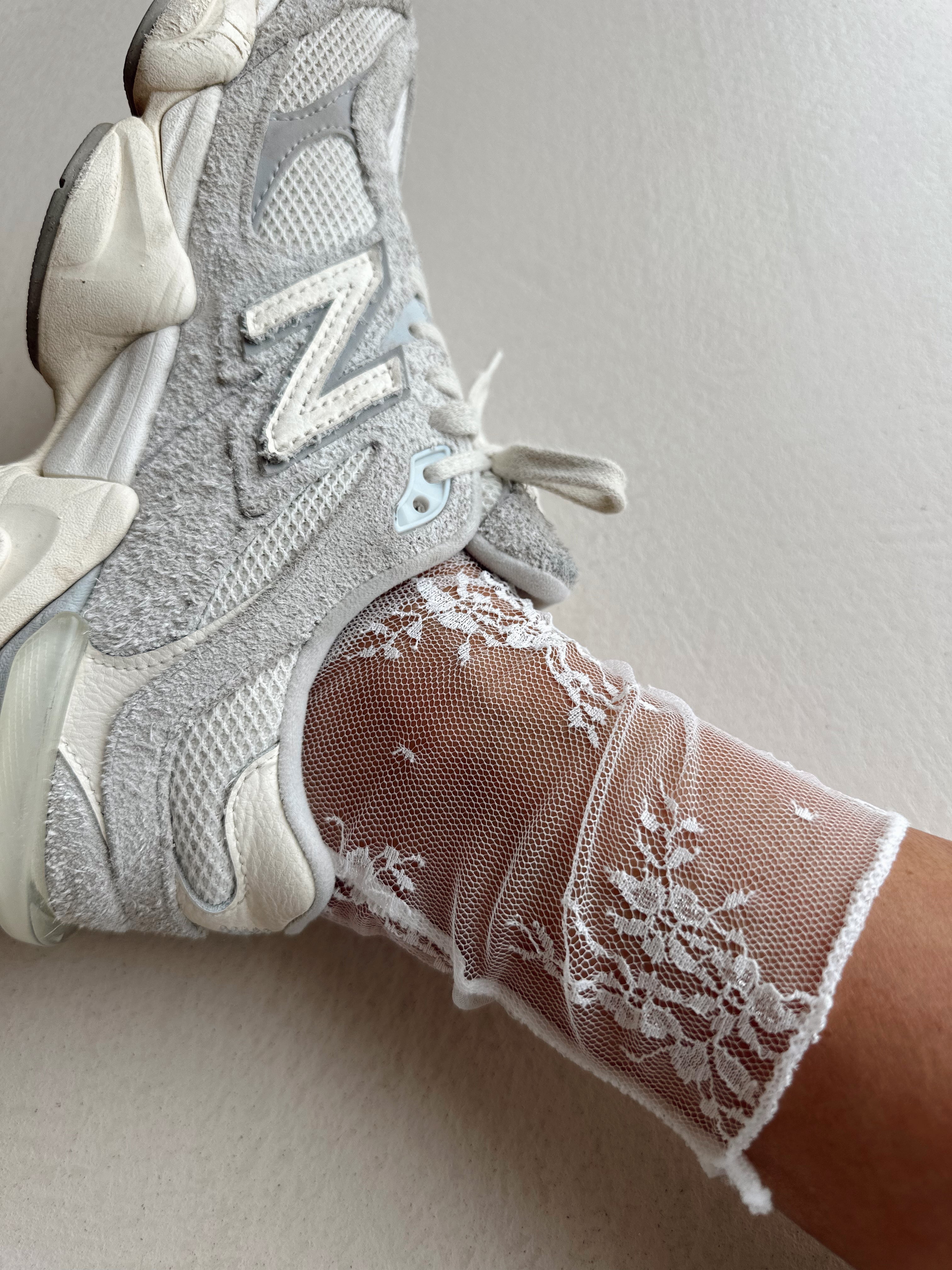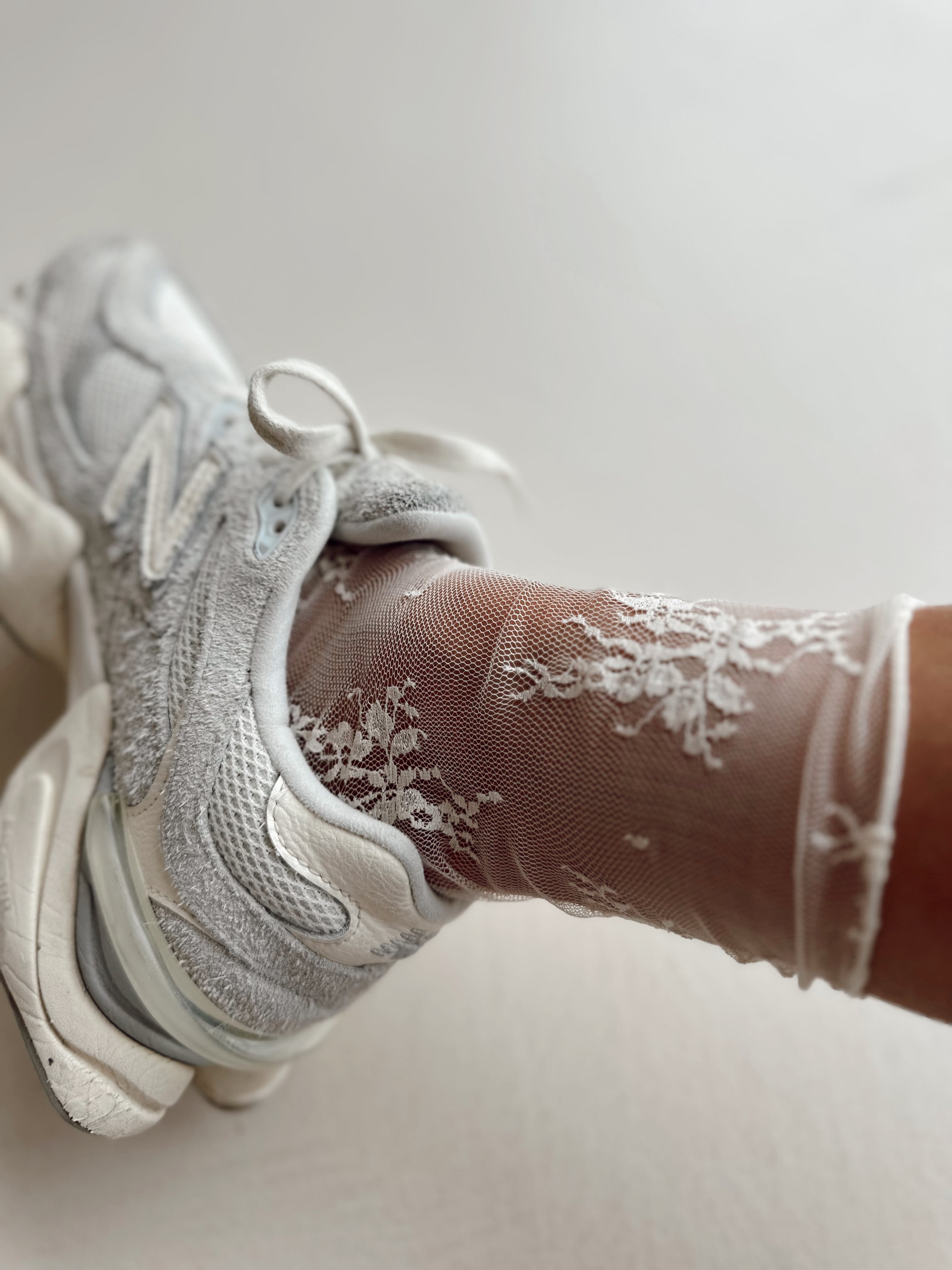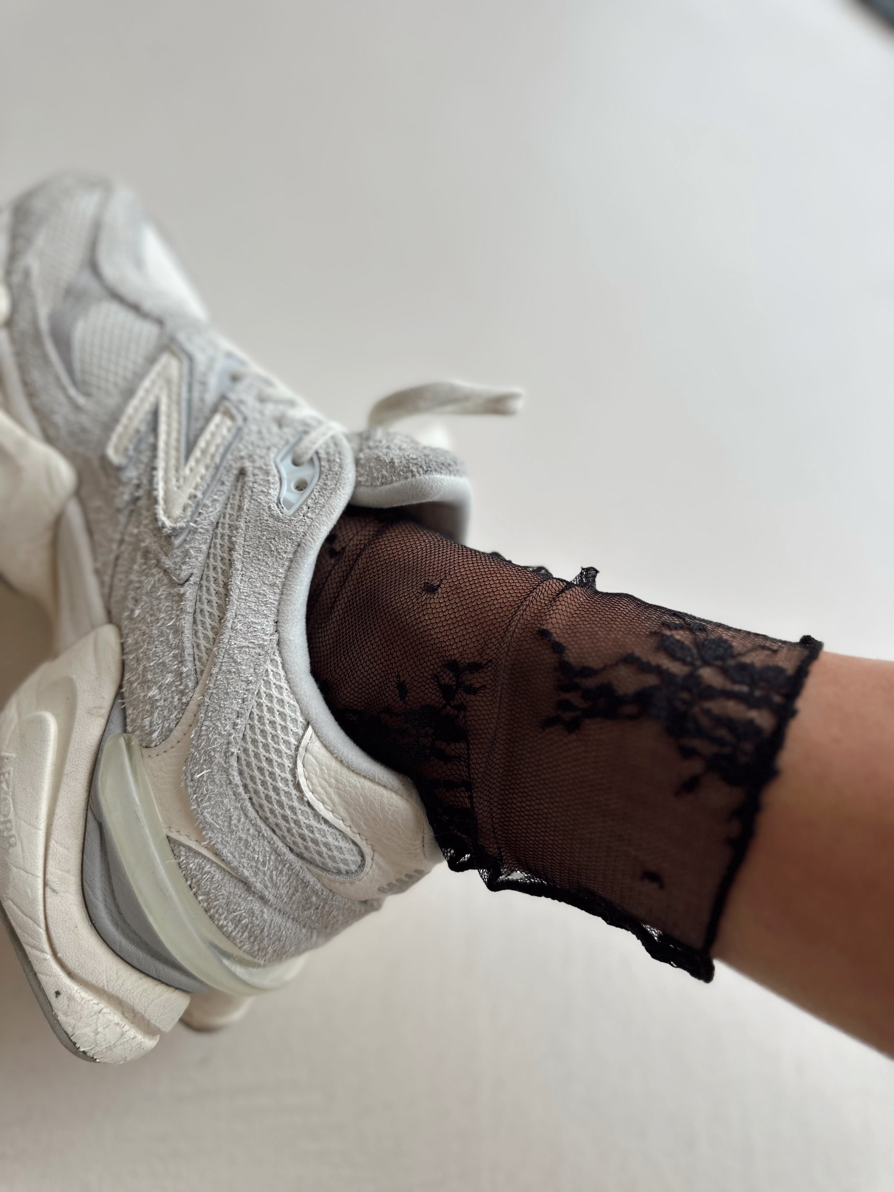 Chaussettes en dentelle, disponible en noir, beige et blanc. Elles sont disponibles en taille unique.