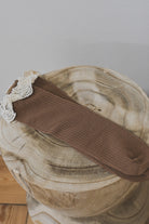 Ces chaussettes hautes pour enfants, ornées de délicate dentelle, se déclinent en plusieurs teintes élégantes : camel, beige clair, gris et beige foncé, pour un style aussi charmant que confortable.