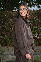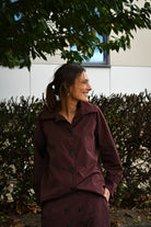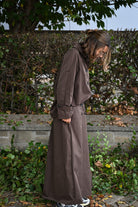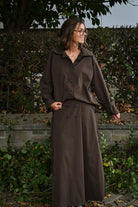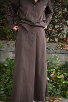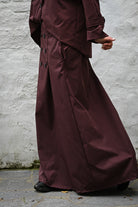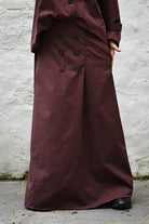 Cet ensemble bordeaux ou chocolat comprend une longue jupe avec une taille élastiquée et une chemise courte semblable à une veste et jupe imperméables, proposée en taille unique.