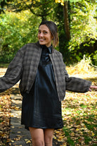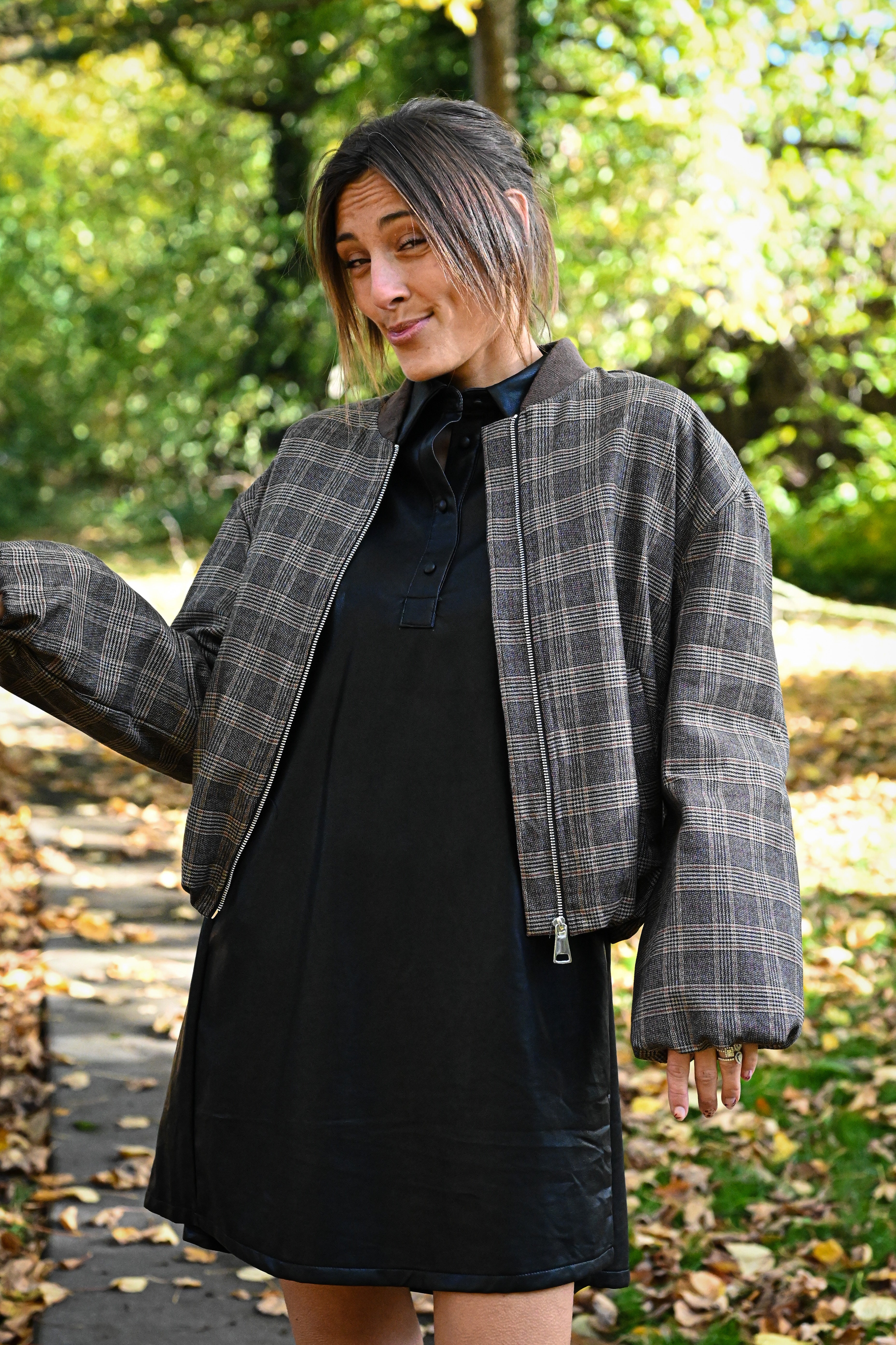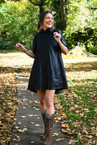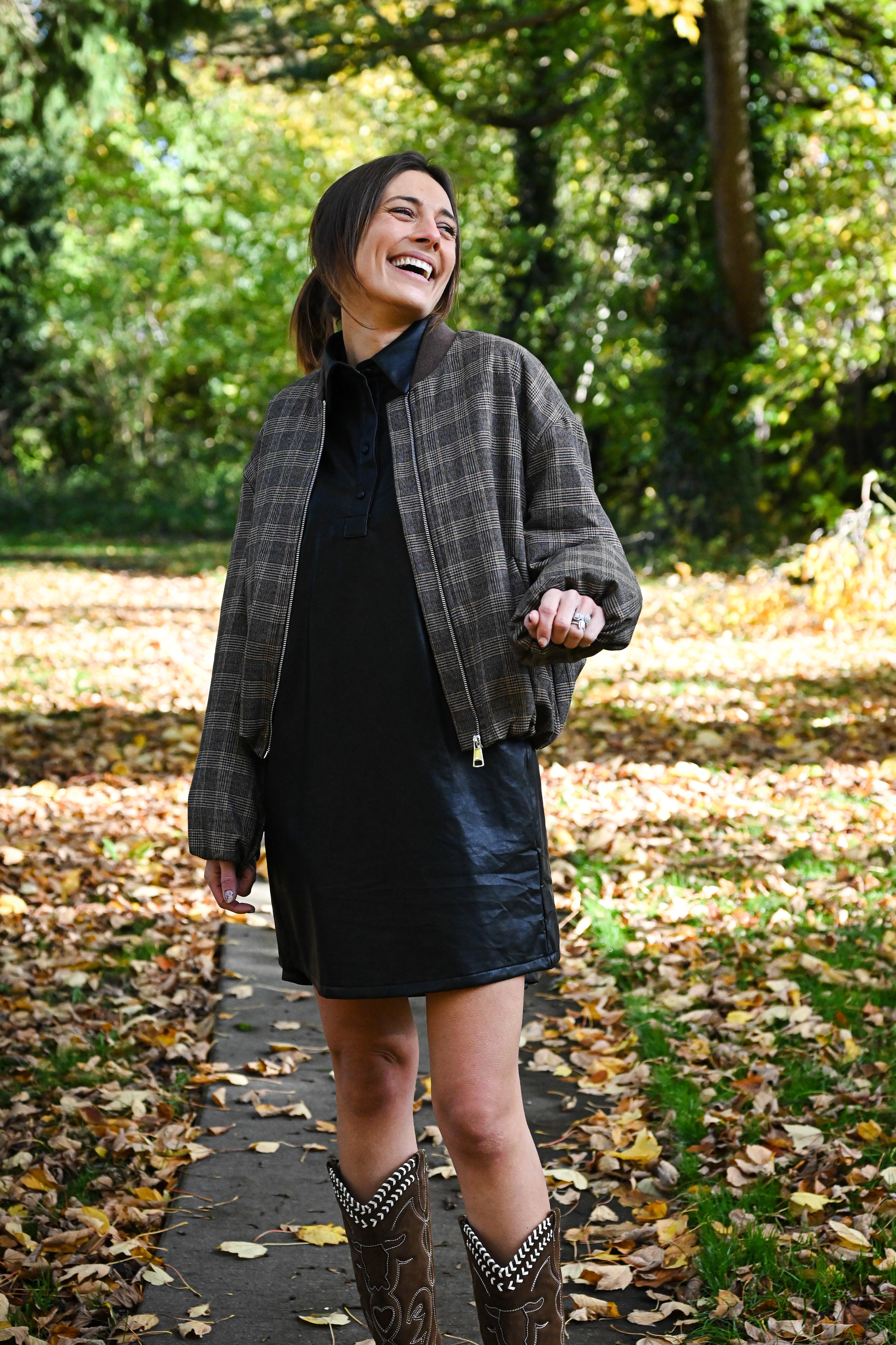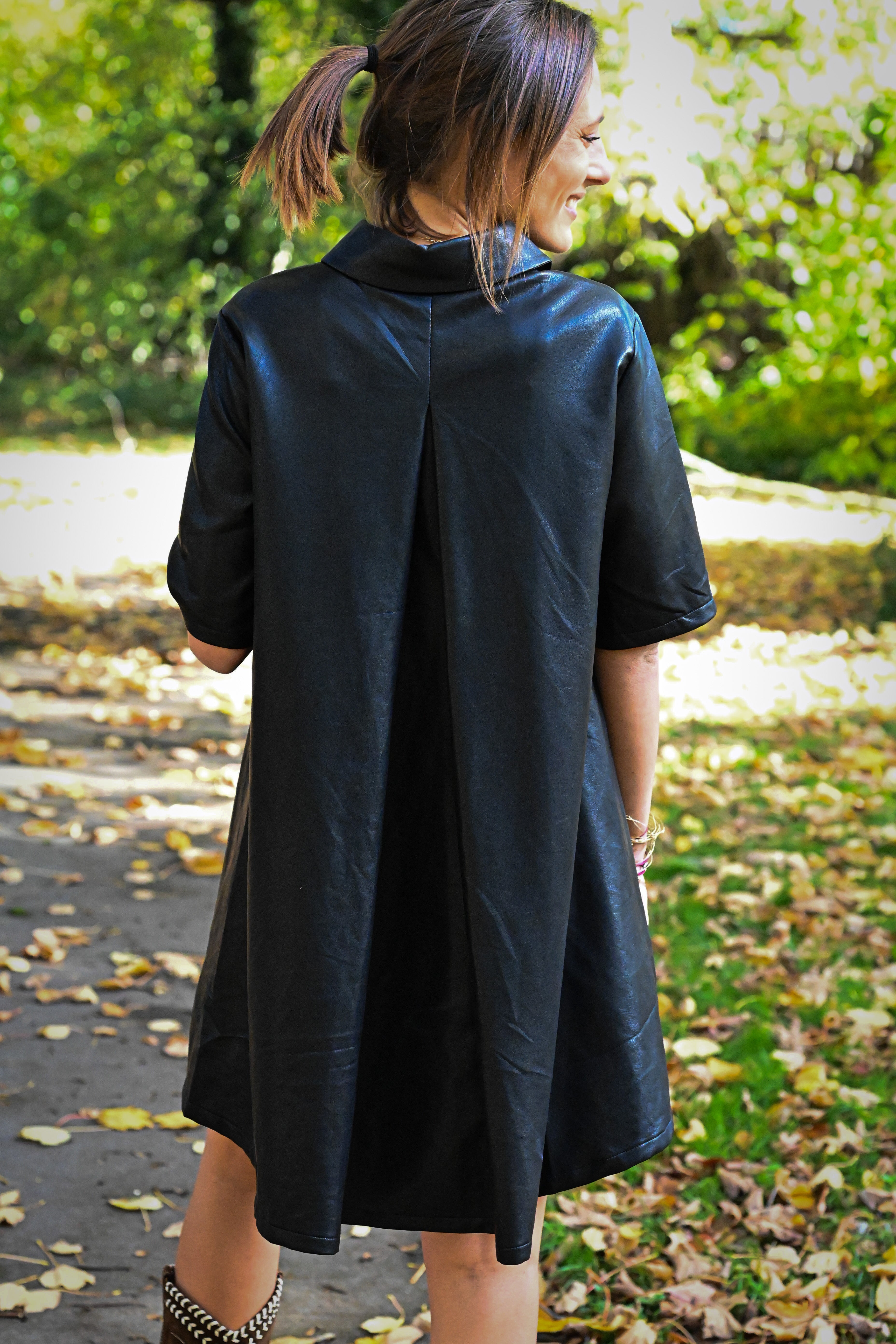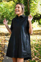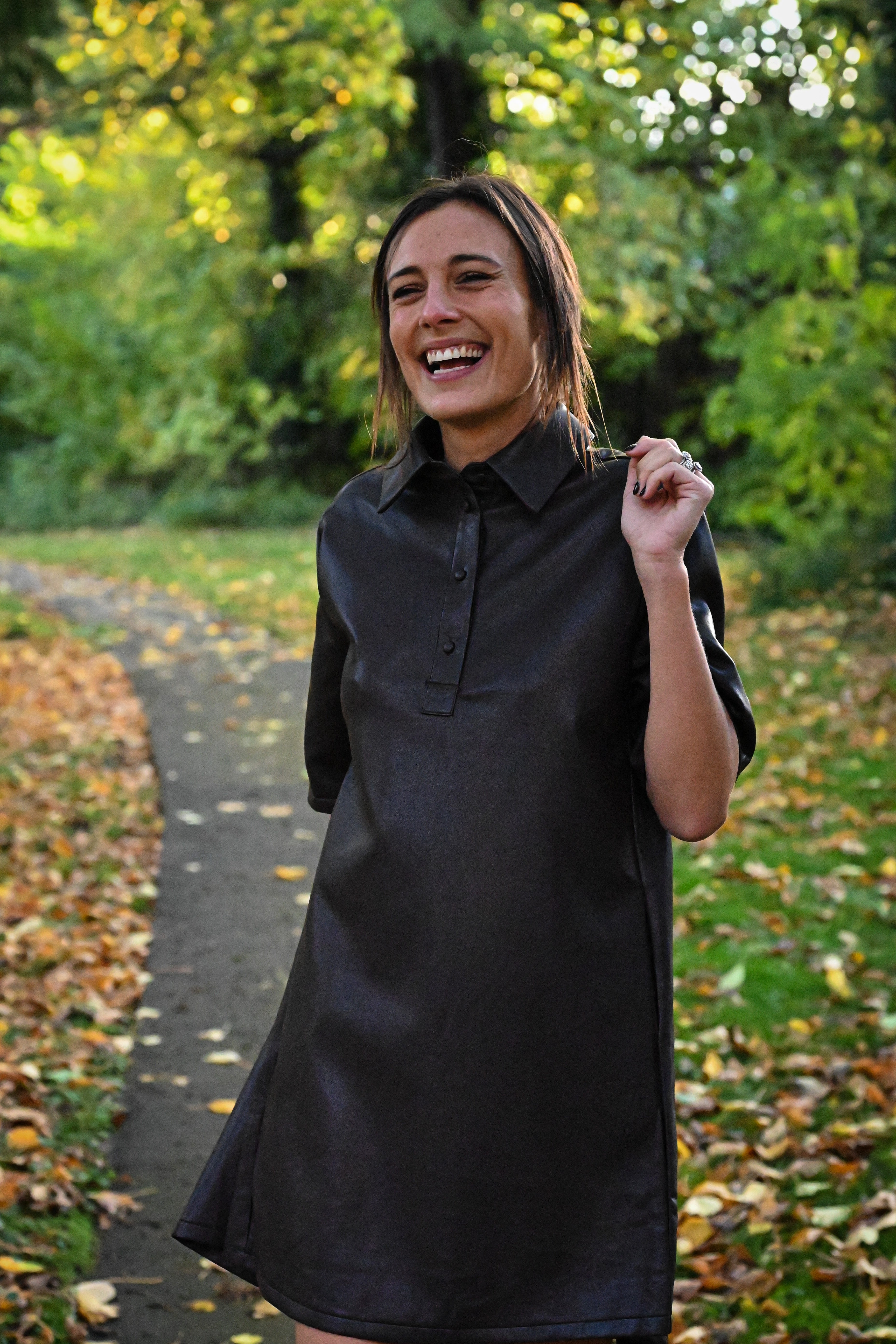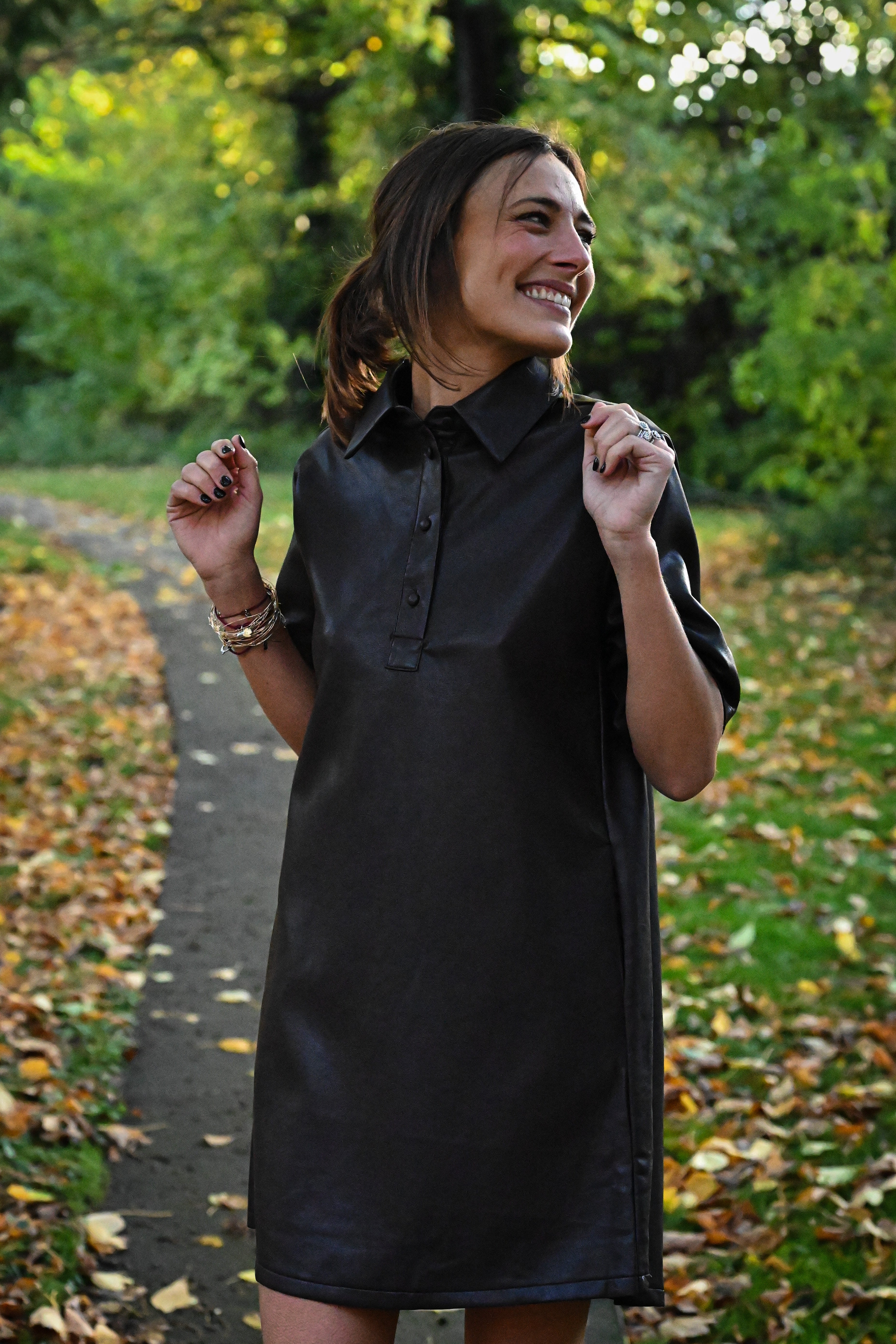 Cette robe courte en simili cuir chocolat séduit par ses manches courtes et sa coupe évasée trapèze. Pratique, elle possède des poches et un col polo élégant. Disponible en tailles S/M et M/L, elle allie style et confort avec finesse.