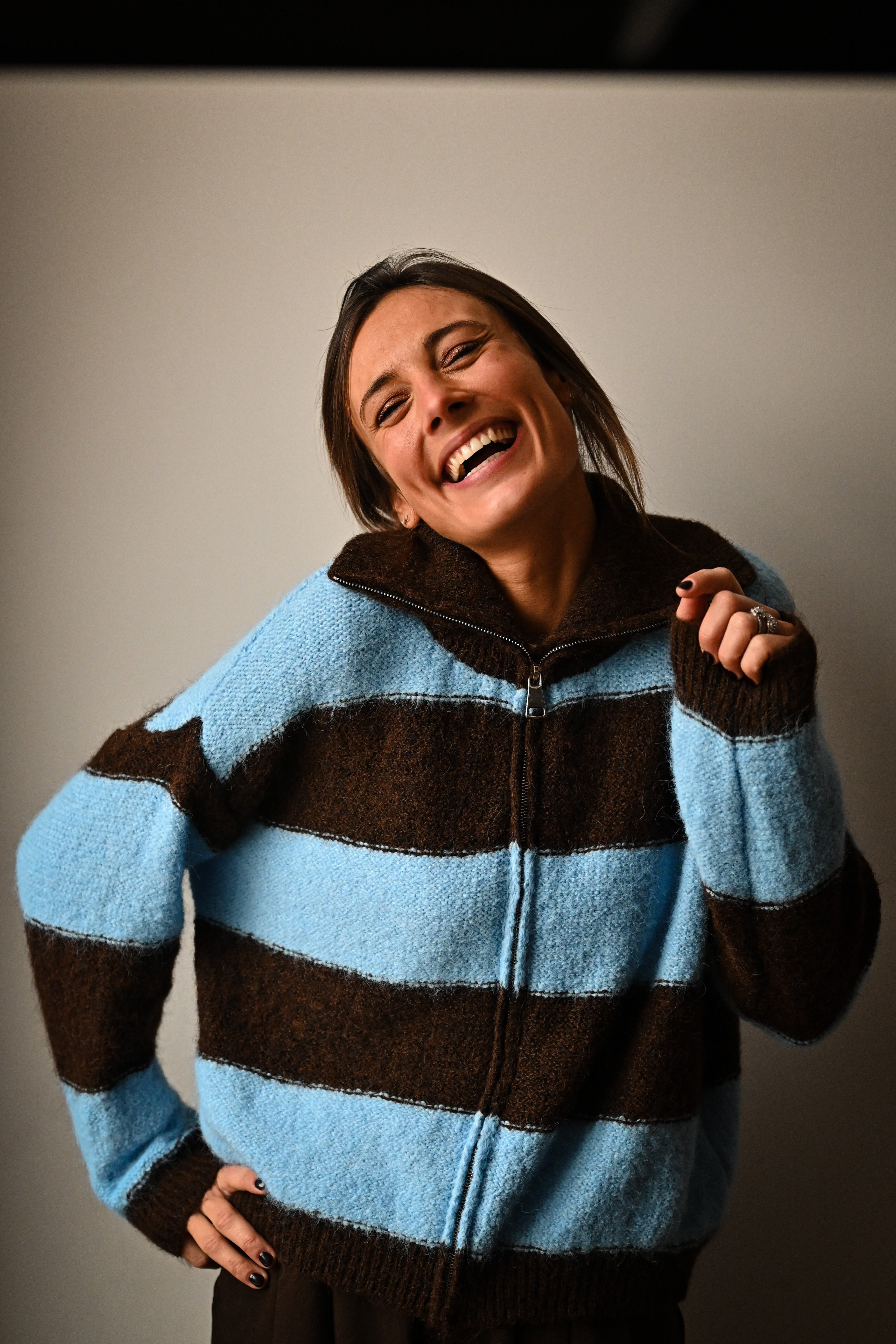 Composition : 59% polyester recyclé, 21% nylon, 11% polyester. 8% laine et 1% spandex.