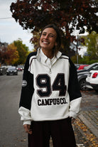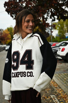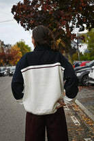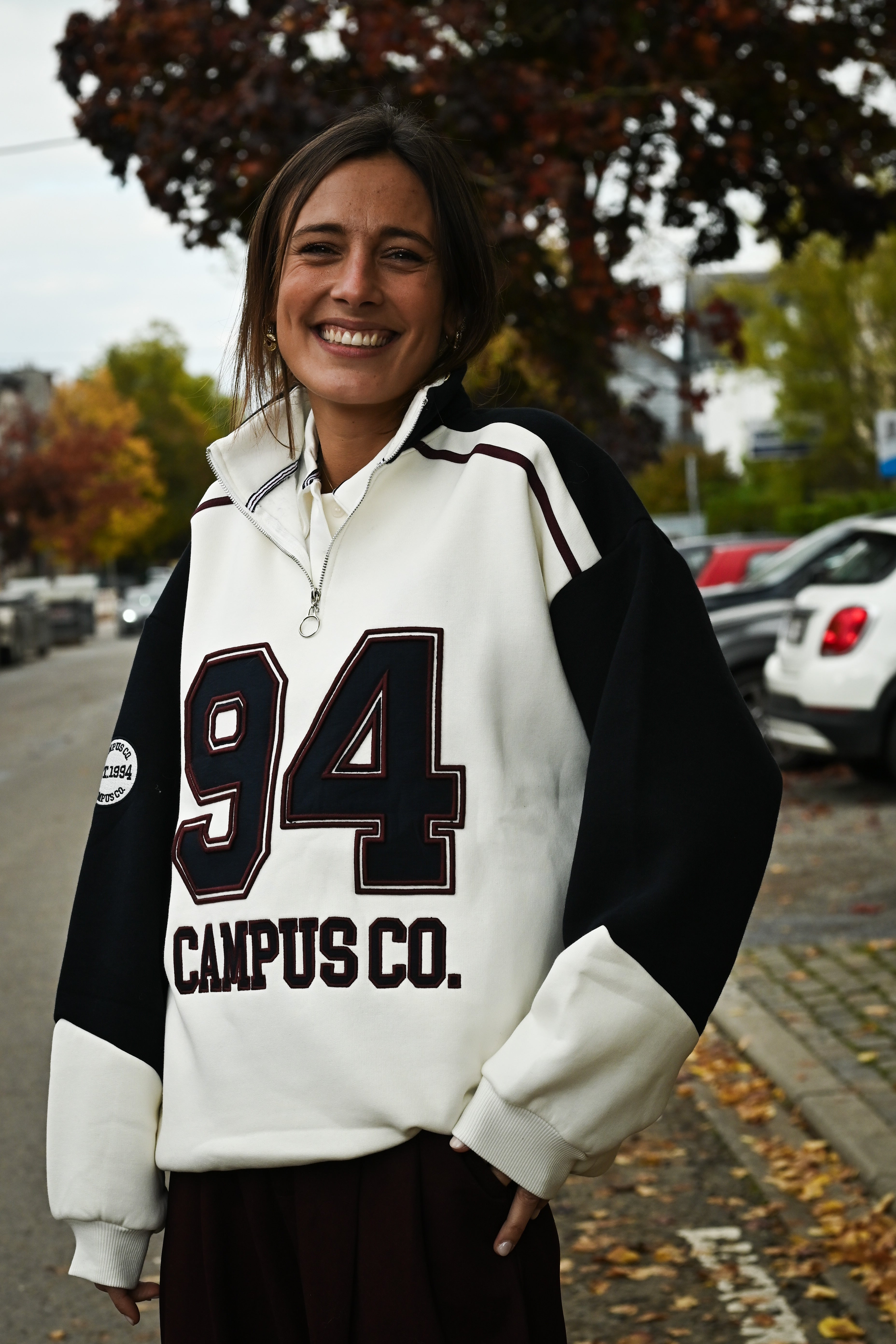 Ce sweat blanc arbore un texte en bleu marine et bordeaux. Sa matière épaisse et ultra douce garantit un confort optimal. Il se décline en tailles S, M et L et est équipé d'une fermeture éclair pratique.