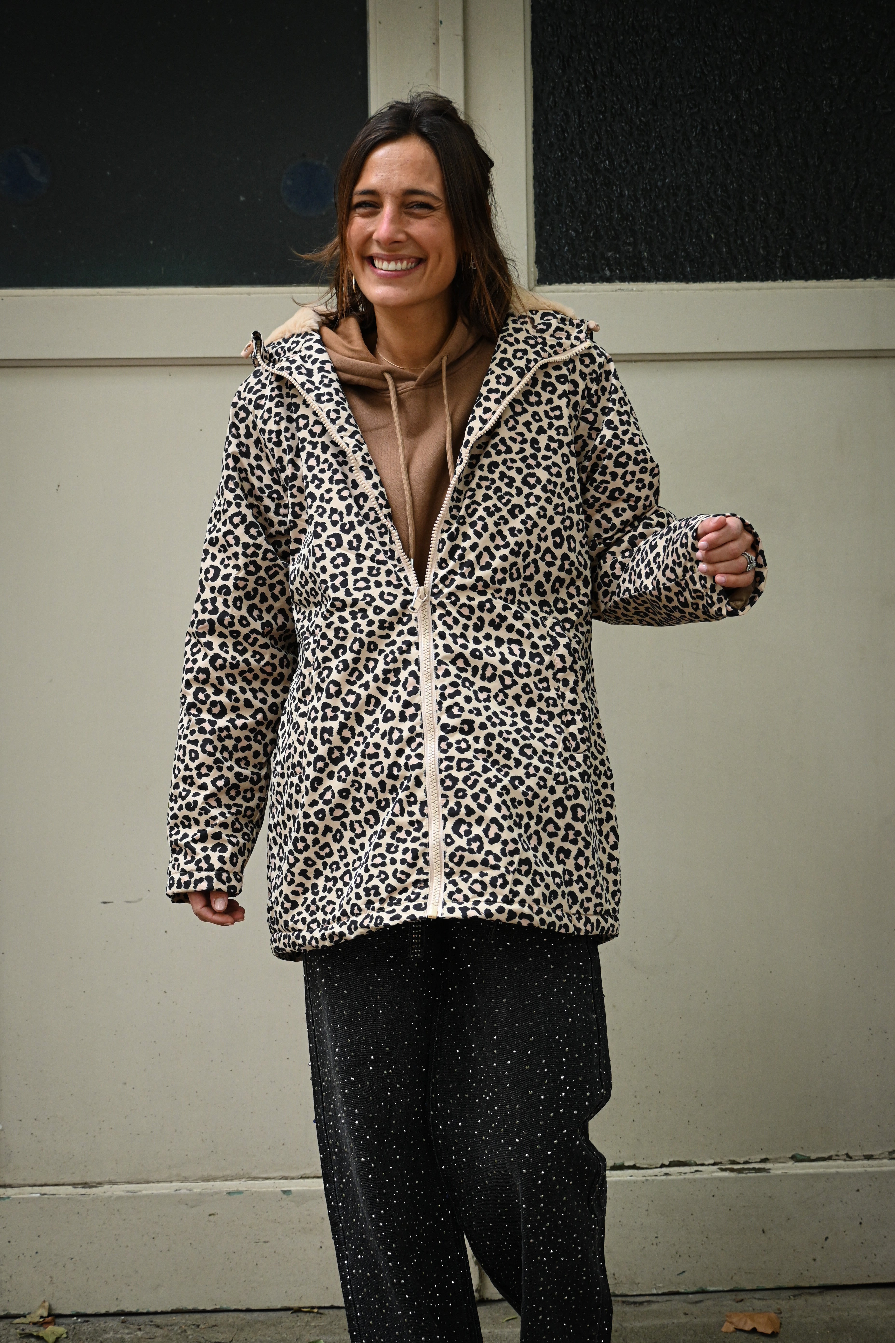 Cette veste plutôt longue imperméable, dotée d’une capuche et d’une doublure chaude, arbore un motif léopard tendance. Elle est idéale pour accompagner les adultes de la taille S à la taille L avec style et confort.